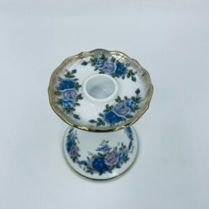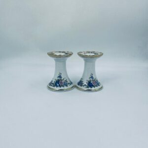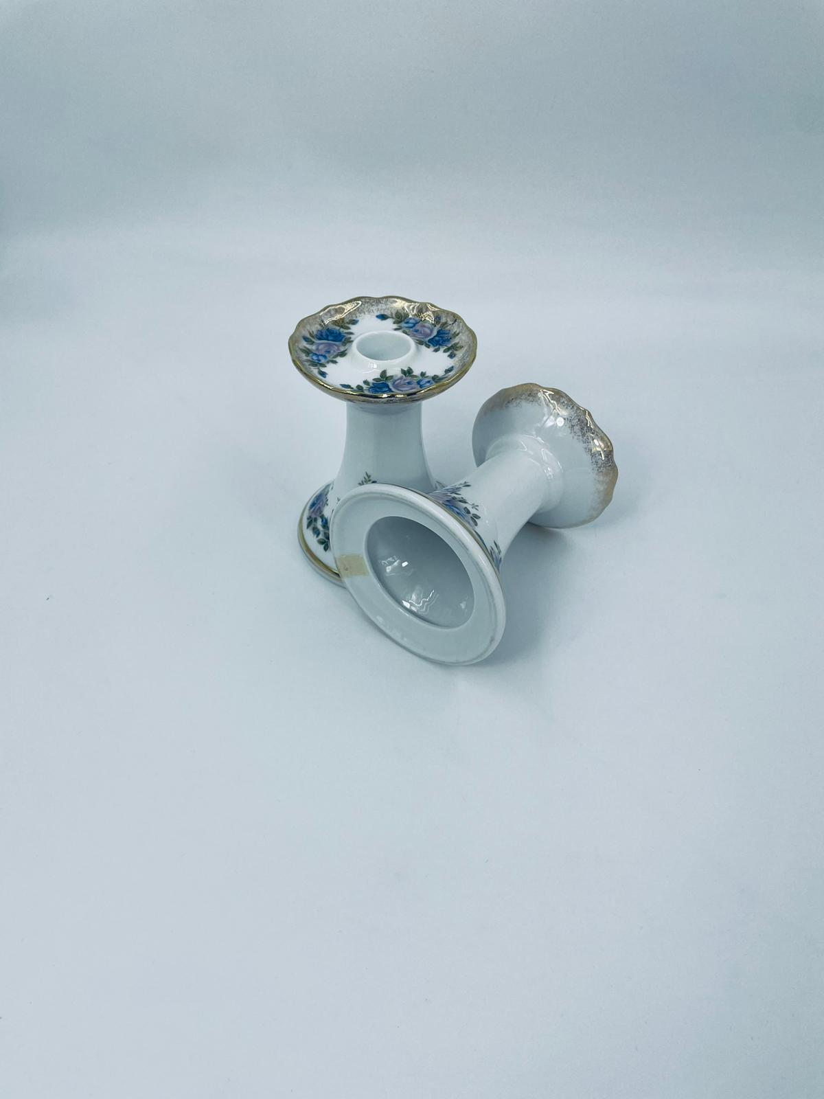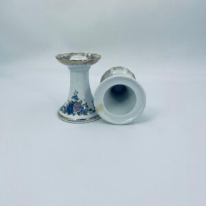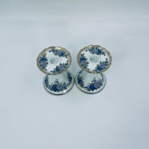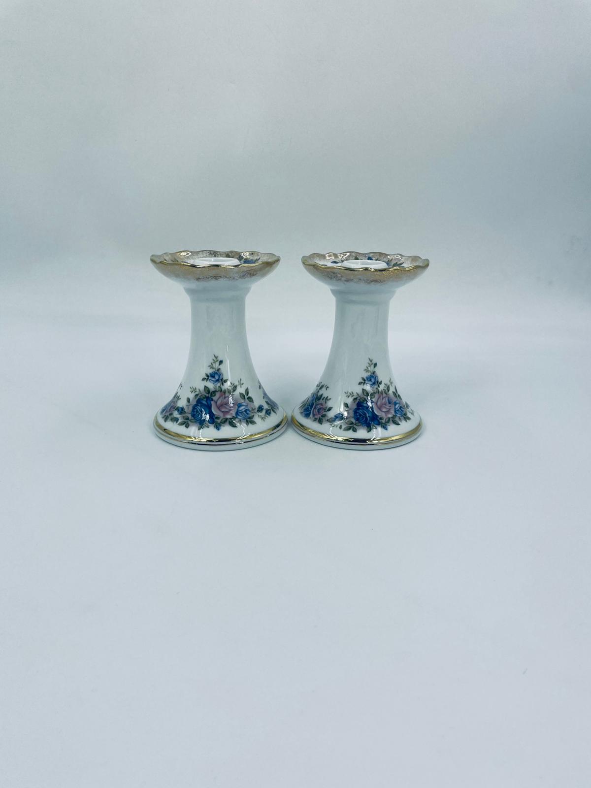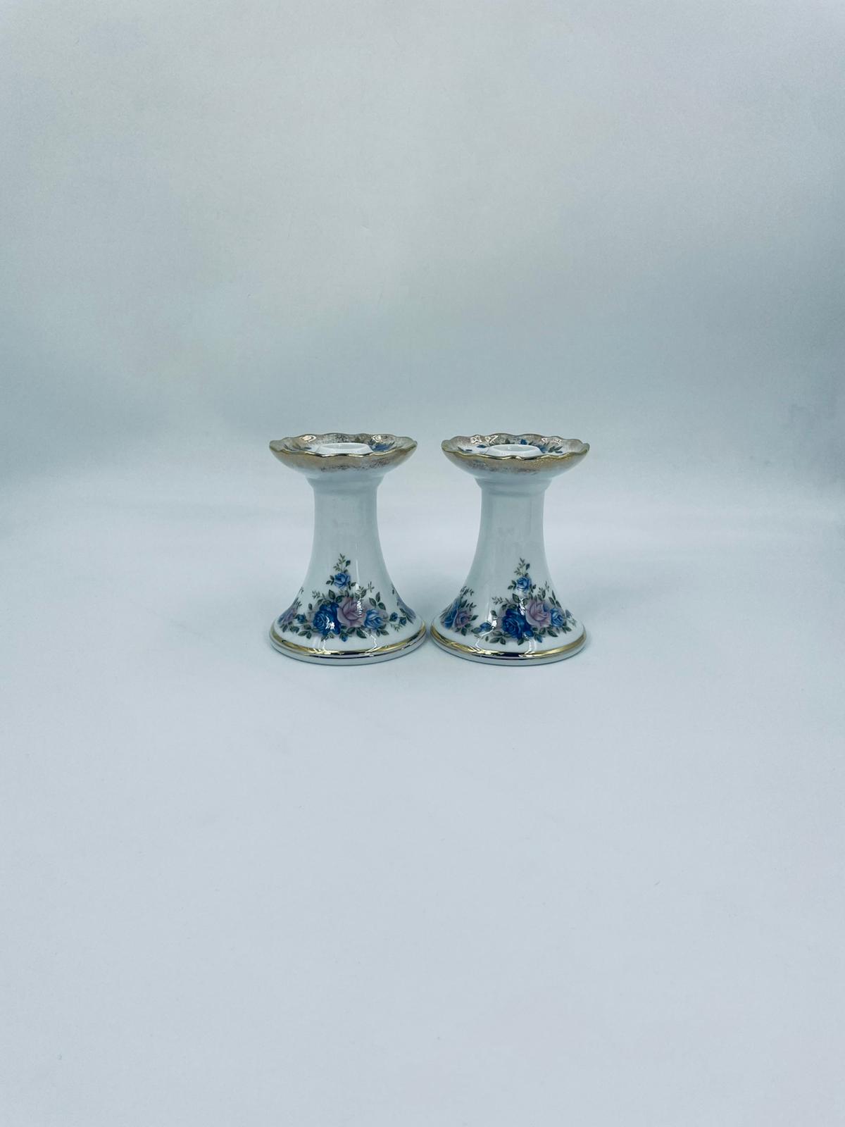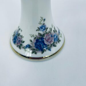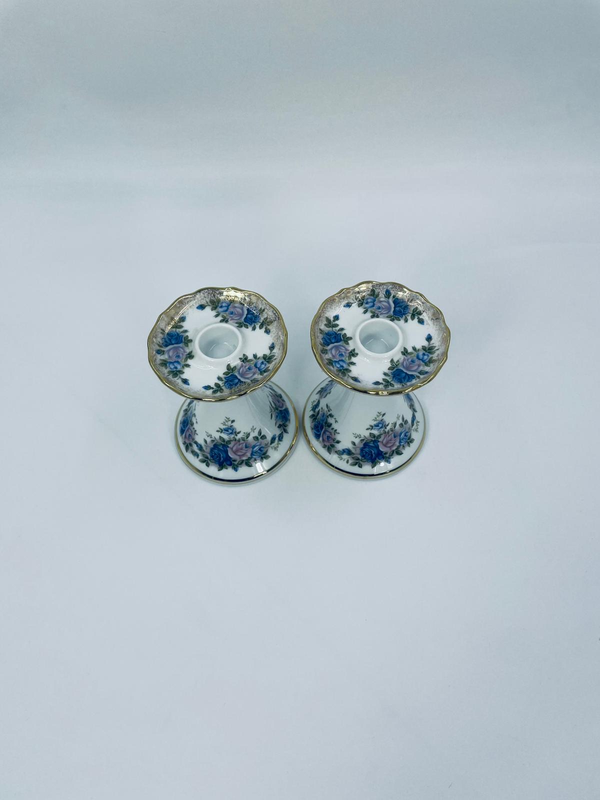Zestaw świeczników wytwórni Royal Albert, wykonane z wysokiej jakości białej porcelany. Charakteryzują się pięknym, ozdobnym wzorem niebieskich i różowych kwiatów, ze złotymi akcentami na krawędziach podstawy i w górnej części.