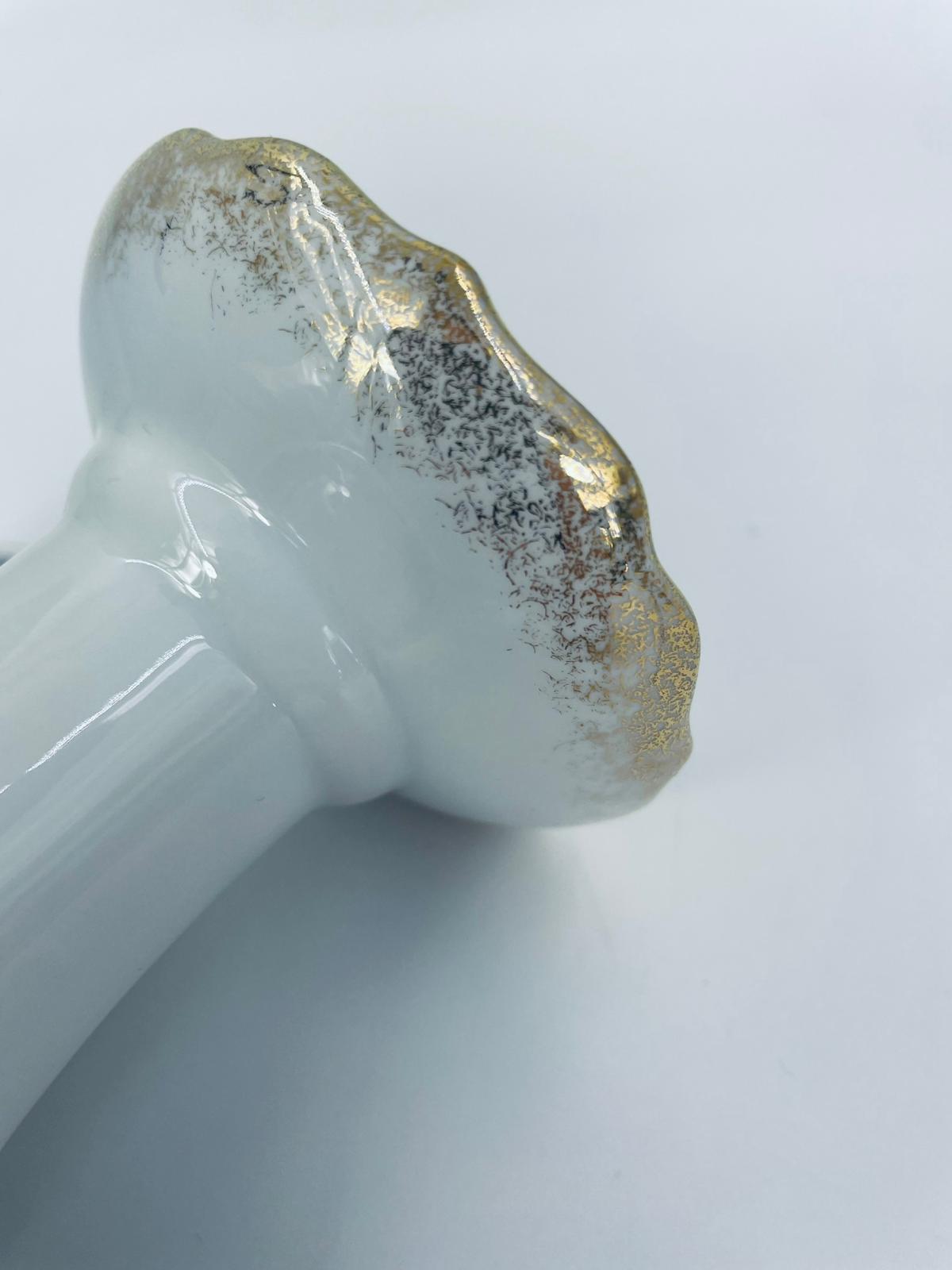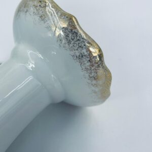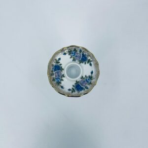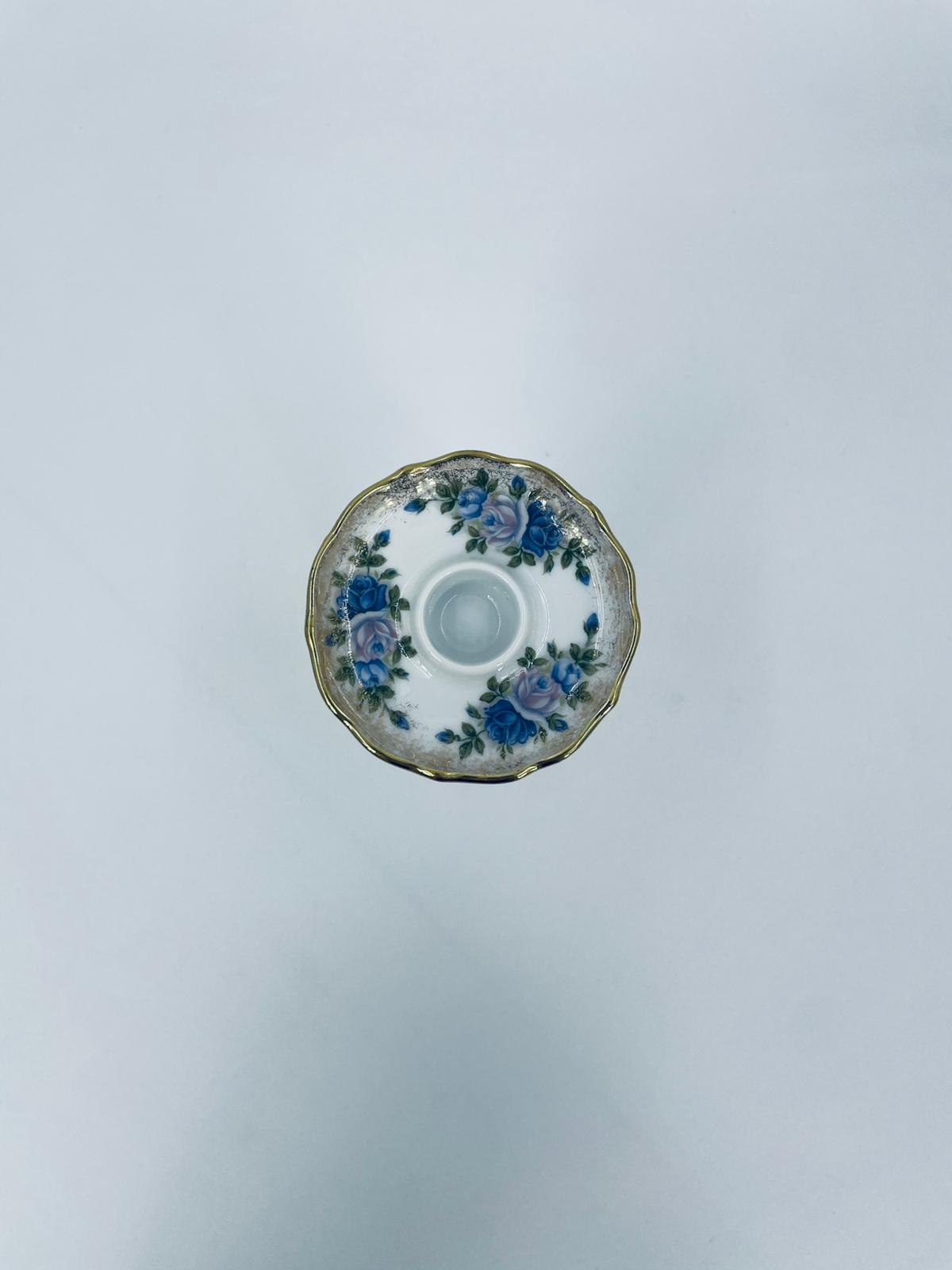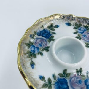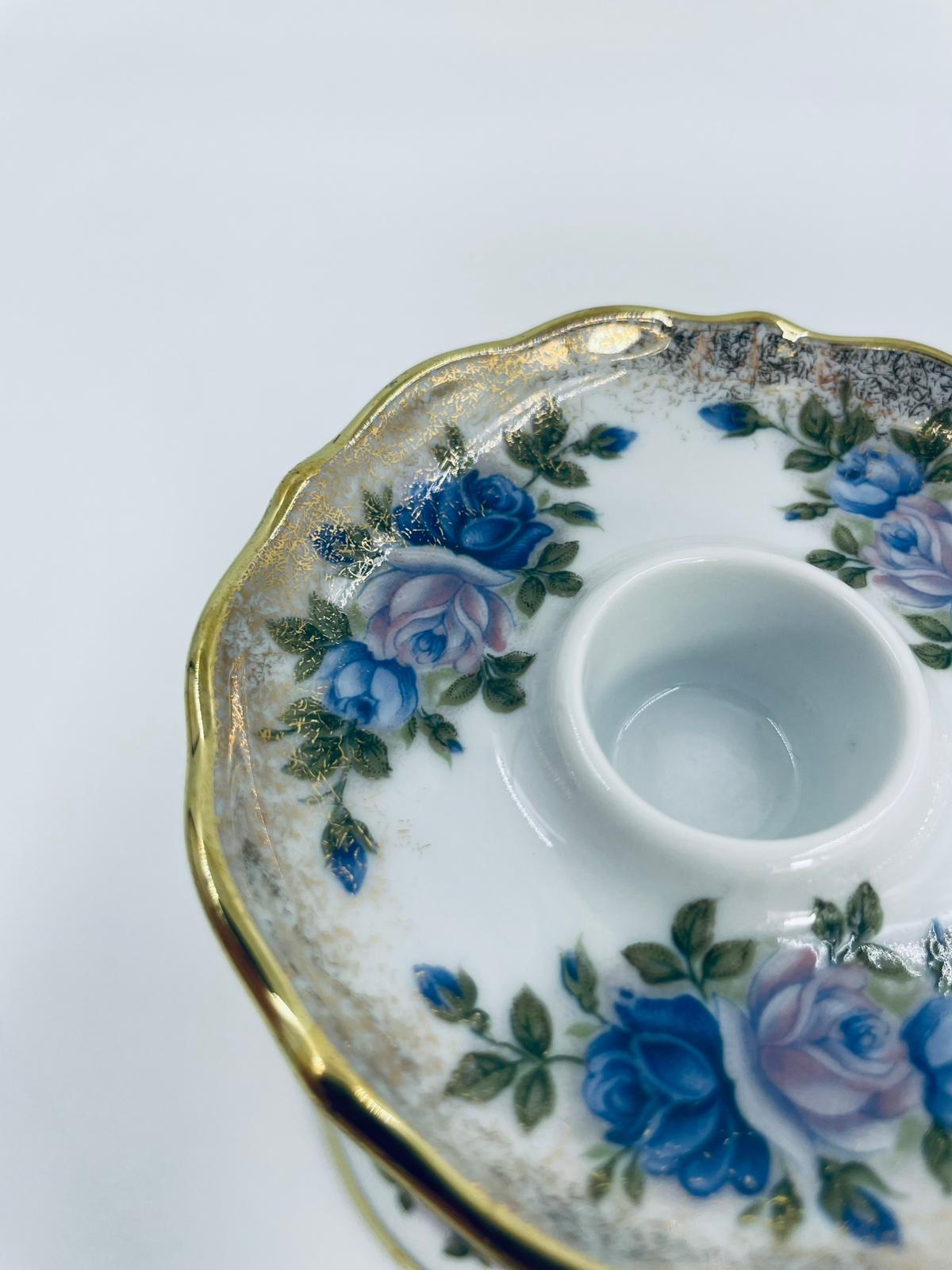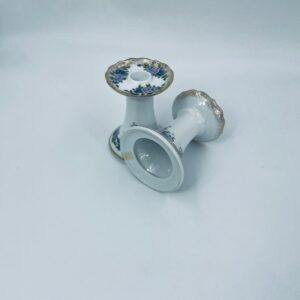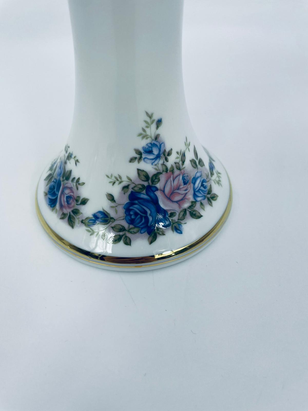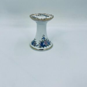 Zestaw świeczników wytwórni Royal Albert, wykonane z wysokiej jakości białej porcelany. Charakteryzują się pięknym, ozdobnym wzorem niebieskich i różowych kwiatów, ze złotymi akcentami na krawędziach podstawy i w górnej części.