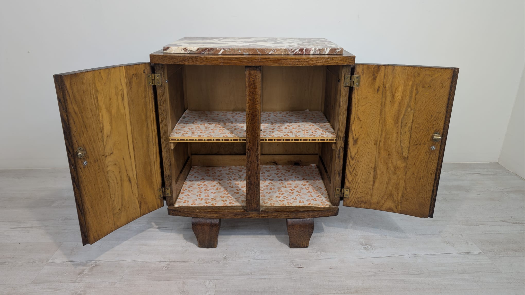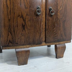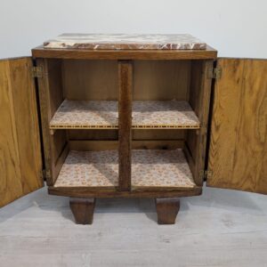 Stylowy, marmurowy i dębowy kredens, szafka w stylu art deco. Solidna konstrukcja z drewna dębowego oraz piękny, marmurowy blat nadają temu meblowi elegancki i ponadczasowy wygląd. Idealnie sprawdzi się jako dodatek do nowoczesnego lub klasycznego wnętrza.