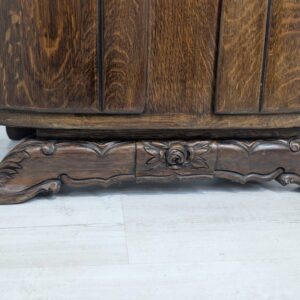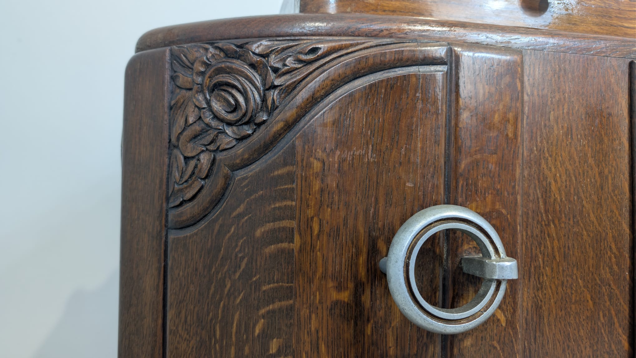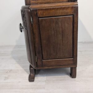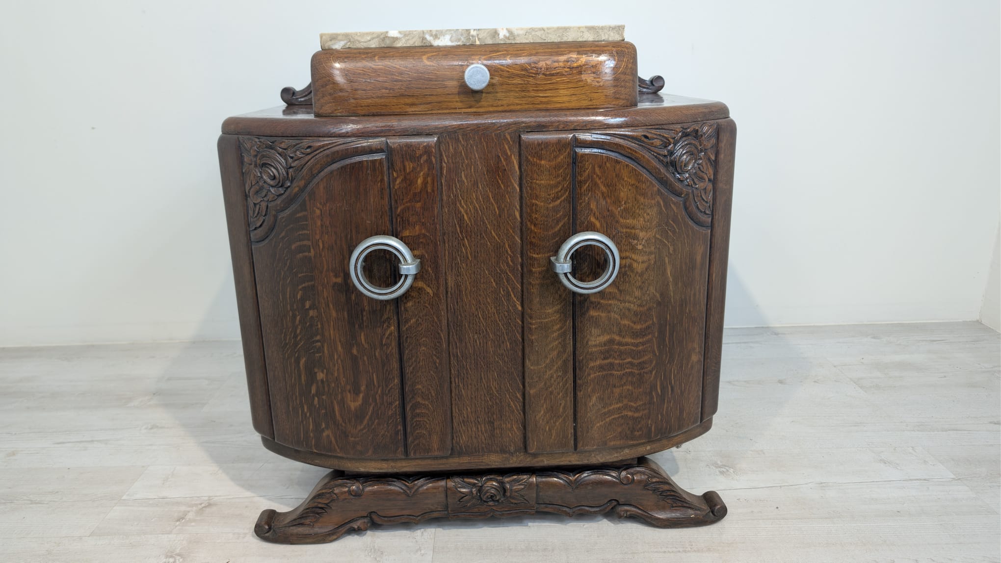 Stylowy, marmurowy i dębowy kredens, szafka w stylu art deco. Solidna konstrukcja z drewna dębowego oraz piękny, marmurowy blat nadają temu meblowi elegancki i ponadczasowy wygląd. Idealnie sprawdzi się jako dodatek do nowoczesnego lub klasycznego wnętrza.