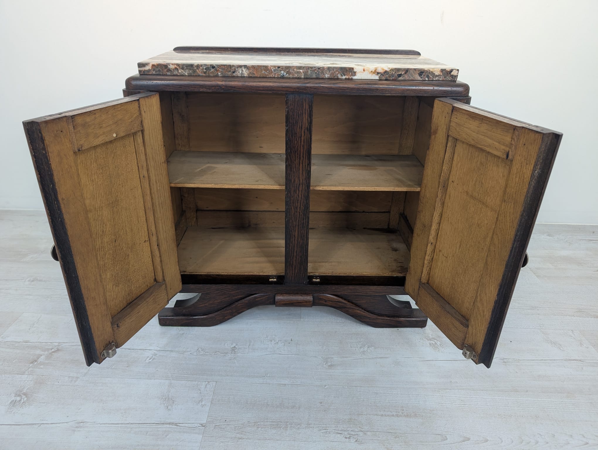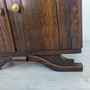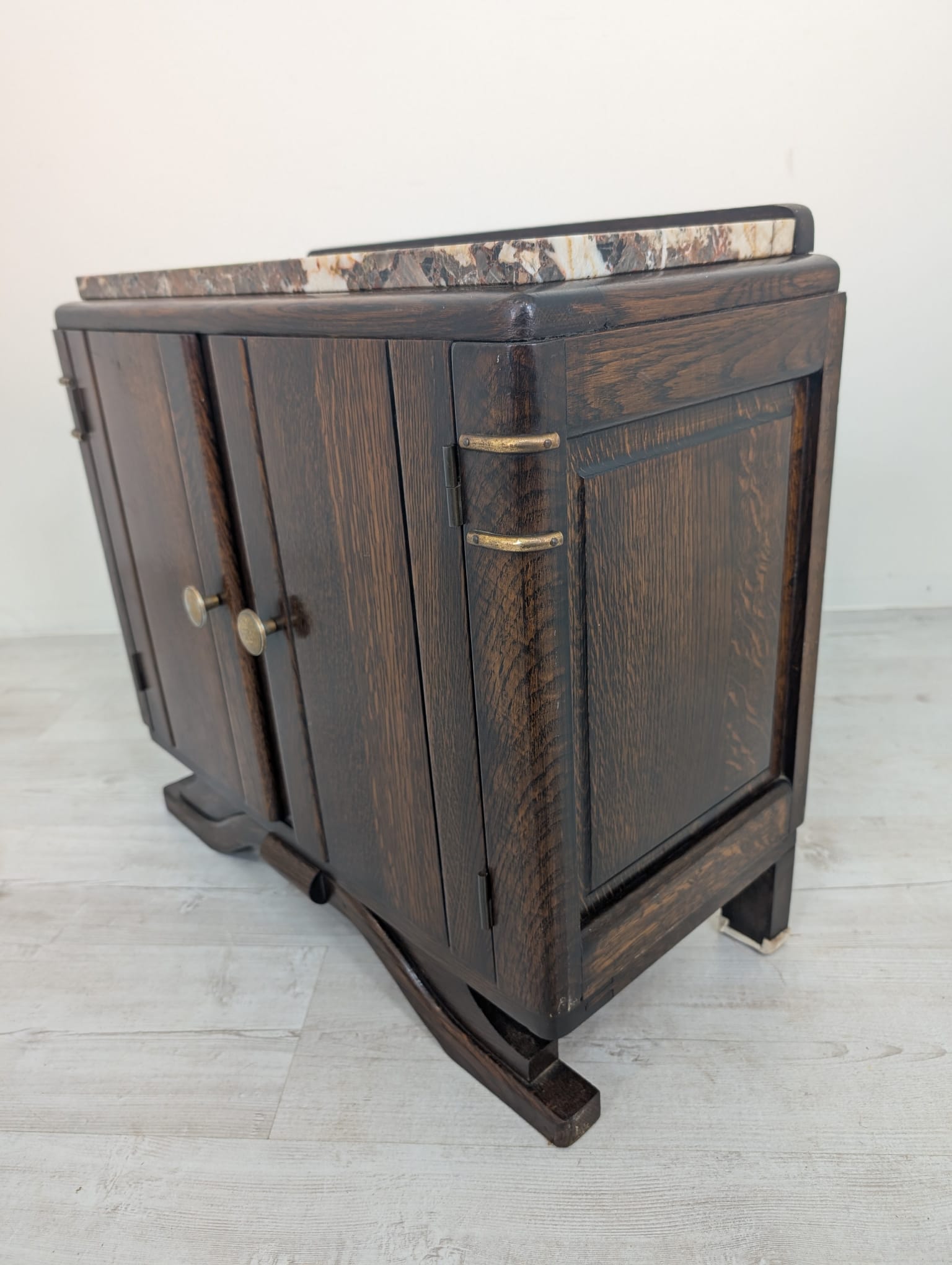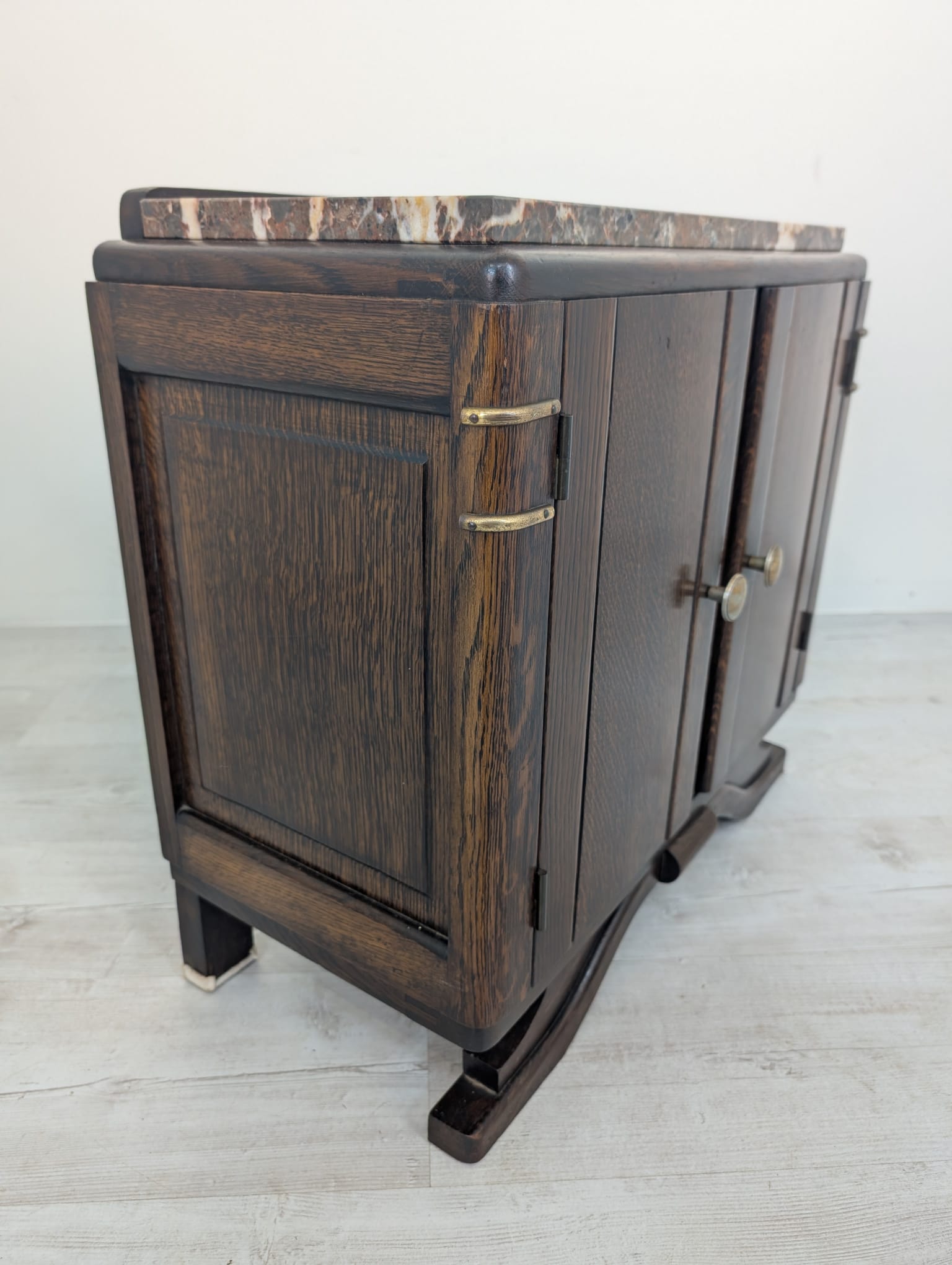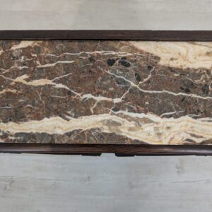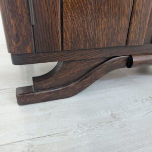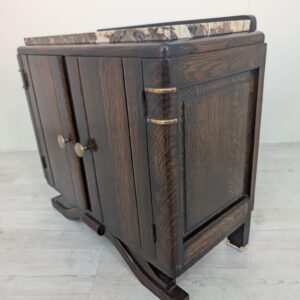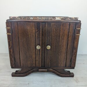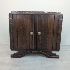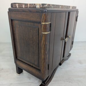 Stylowy, marmurowy i dębowy kredens, szafka w stylu art deco. Solidna konstrukcja z drewna dębowego oraz piękny, marmurowy blat nadają temu meblowi elegancki i ponadczasowy wygląd. Idealnie sprawdzi się jako dodatek do nowoczesnego lub klasycznego wnętrza.