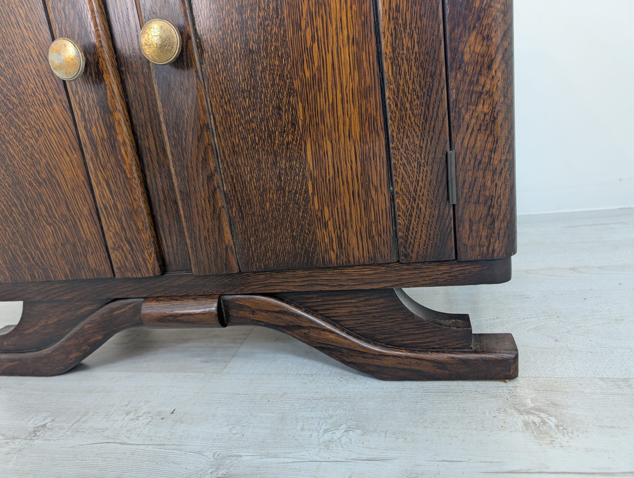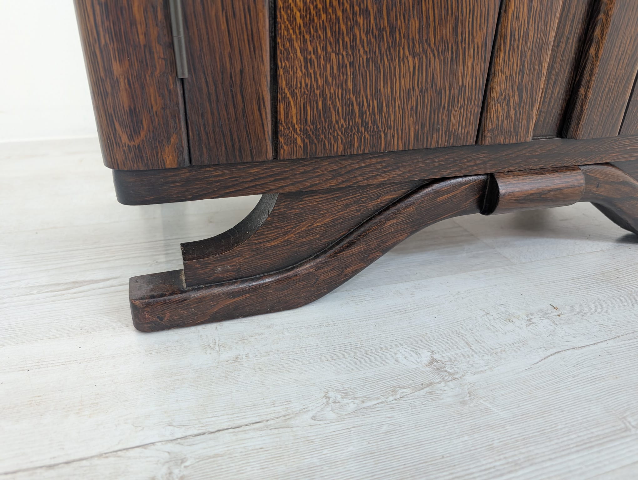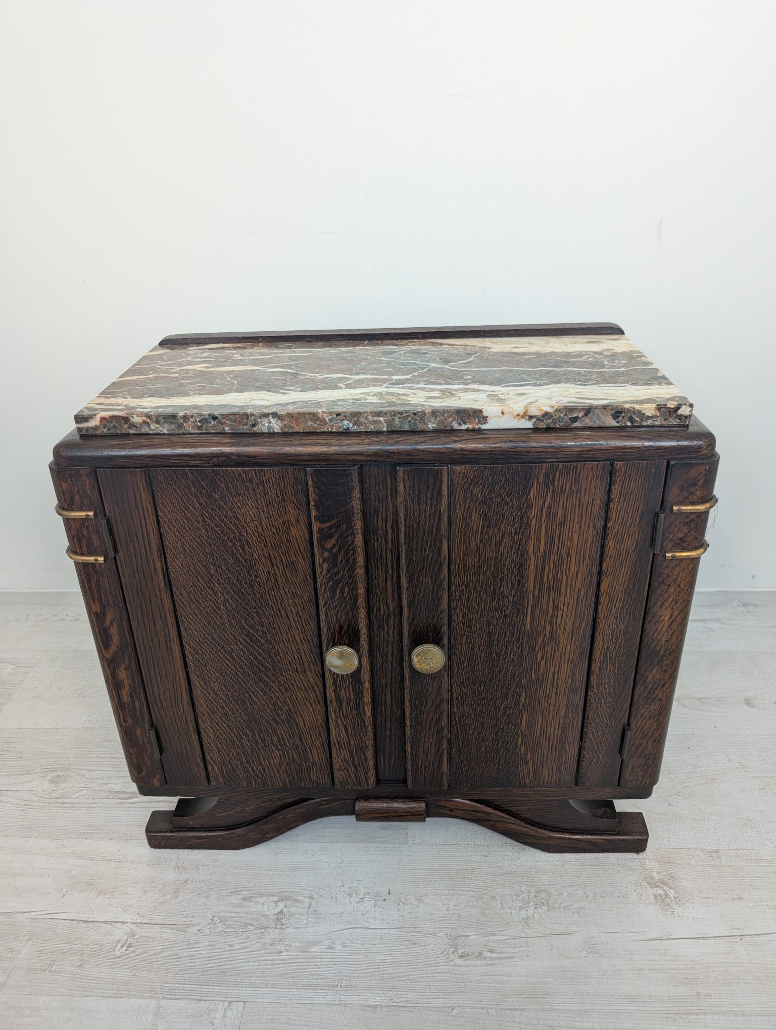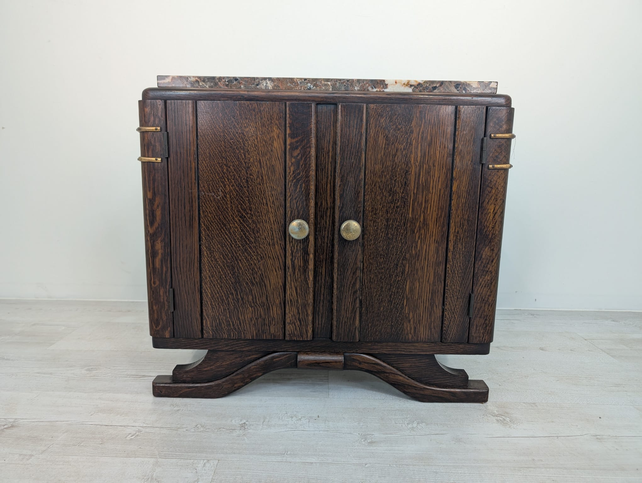 Stylowy, marmurowy i dębowy kredens, szafka w stylu art deco. Solidna konstrukcja z drewna dębowego oraz piękny, marmurowy blat nadają temu meblowi elegancki i ponadczasowy wygląd. Idealnie sprawdzi się jako dodatek do nowoczesnego lub klasycznego wnętrza.