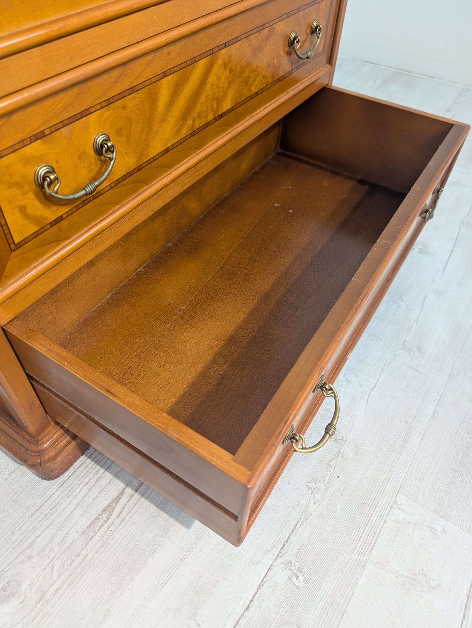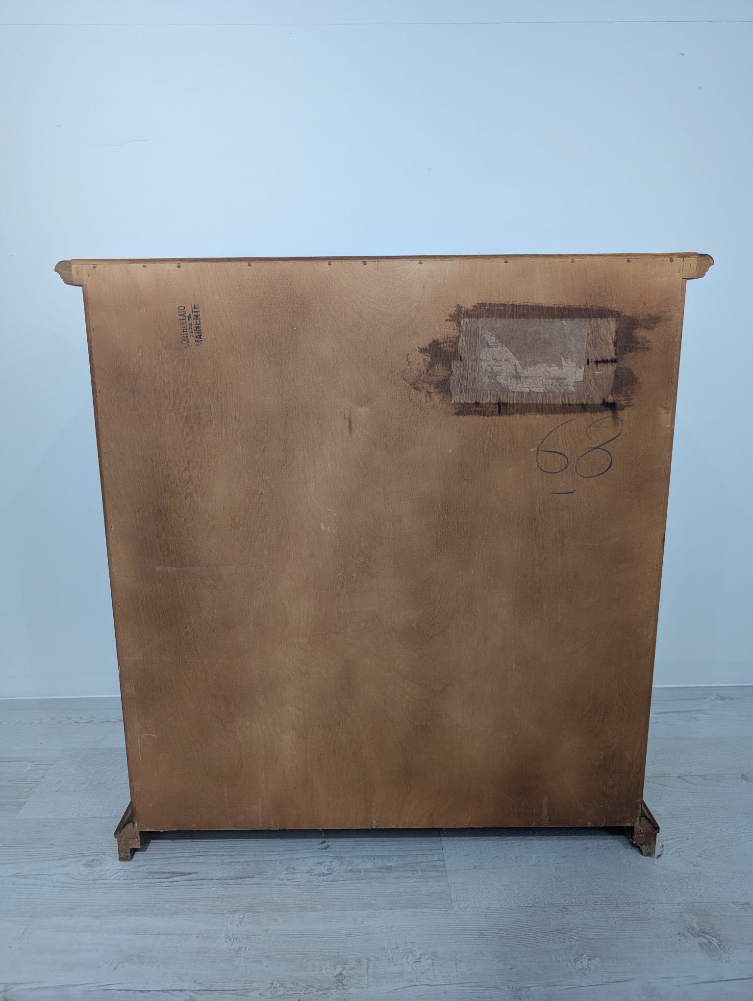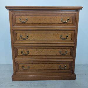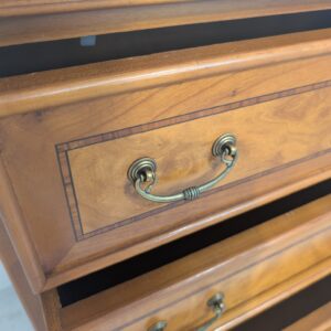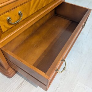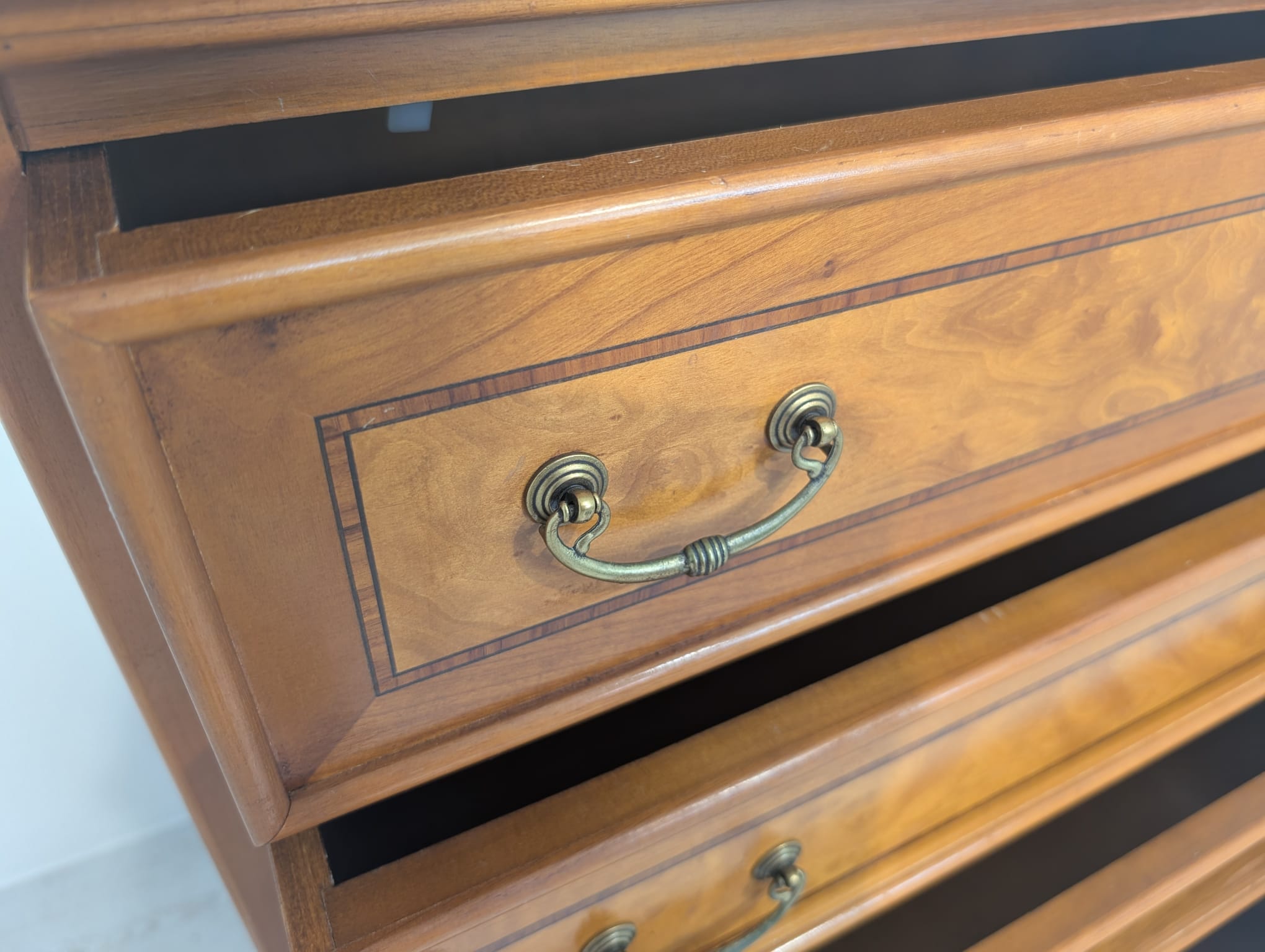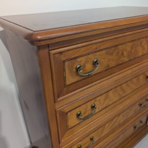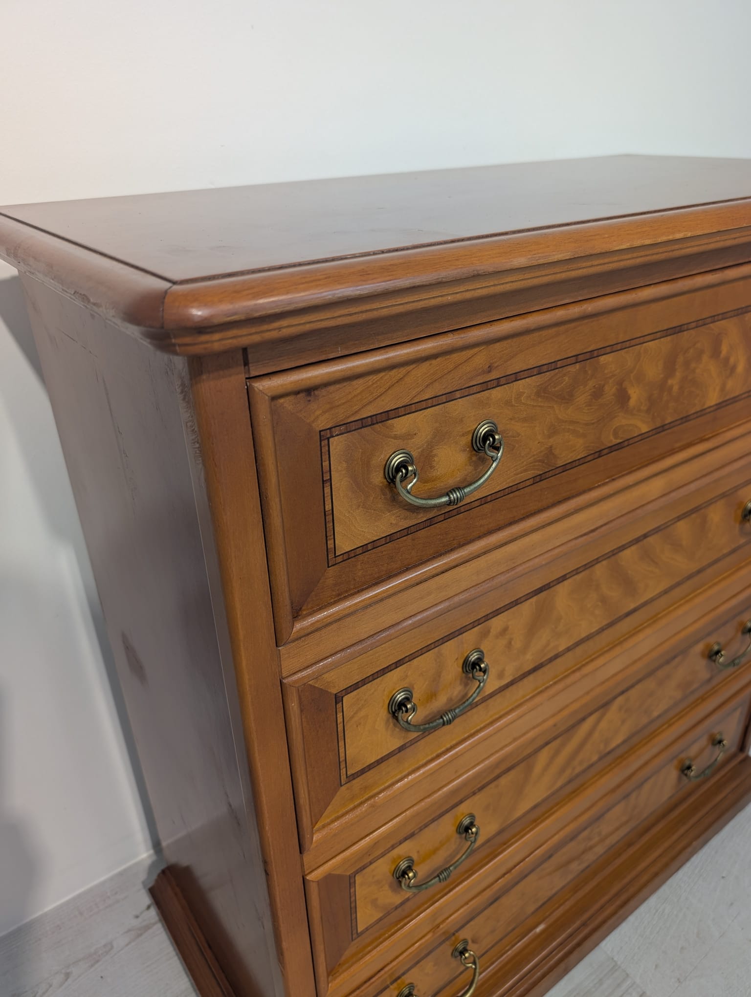 Stylowa, włoska komoda z szufladami z intarsjowanymi szufladami. Mebel wykonany z wysokiej jakości drewna bukowego pokrytego fornirem.