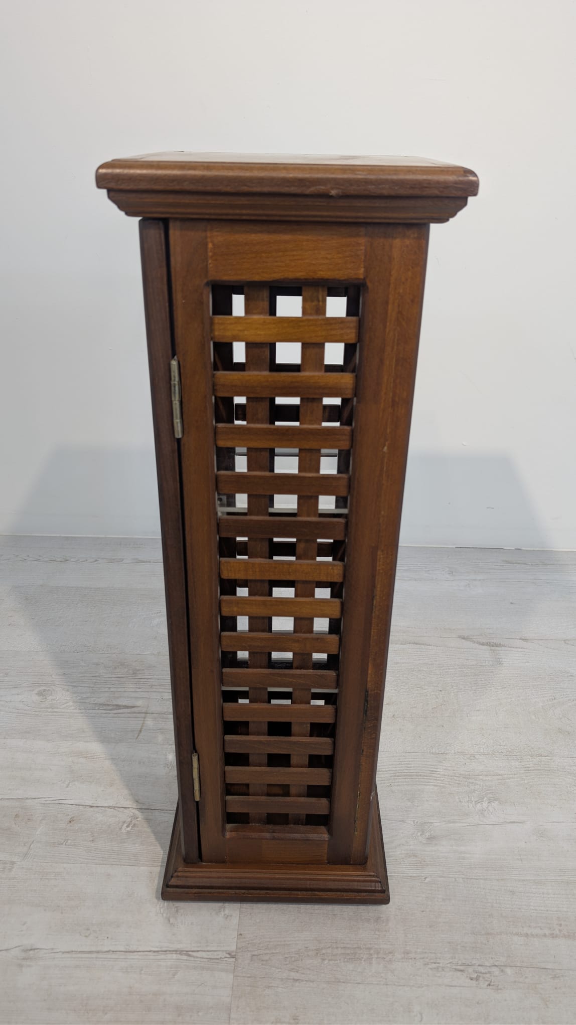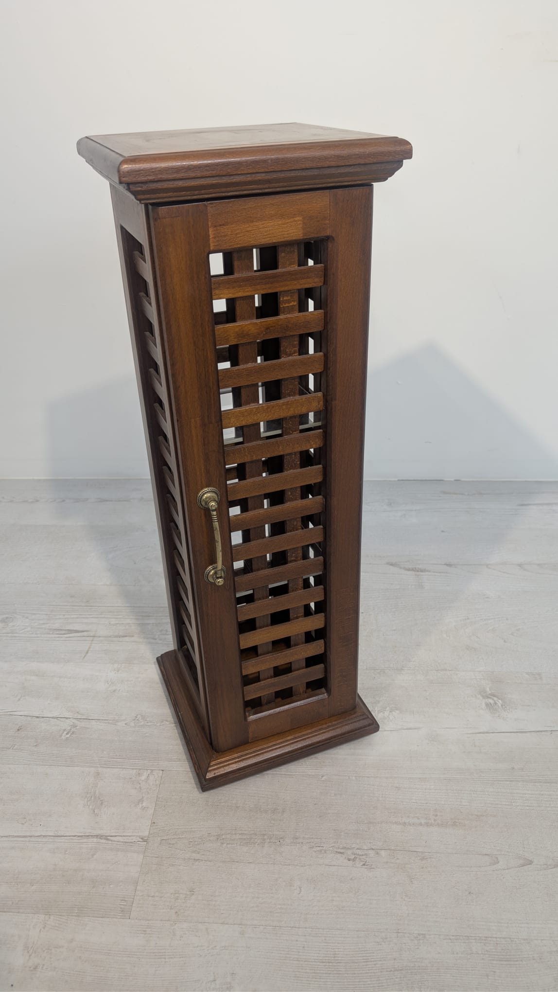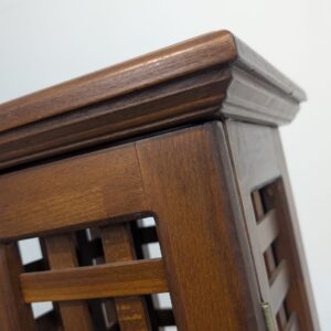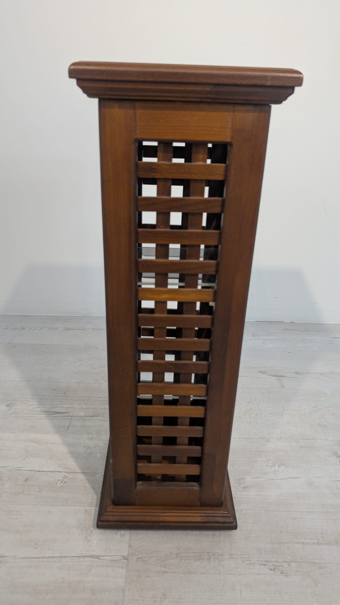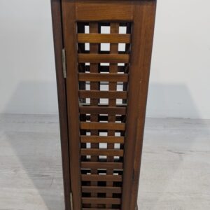 Stylowy, drewniany postument z półkami. Wykonany z drewna palisandrowego, posiada ażurową konstrukcję pozwalającą na przechowywanie. Mebel w dobrym stanie, może stanowić ciekawą dekorację lub praktyczne rozwiązanie do przechowywania.