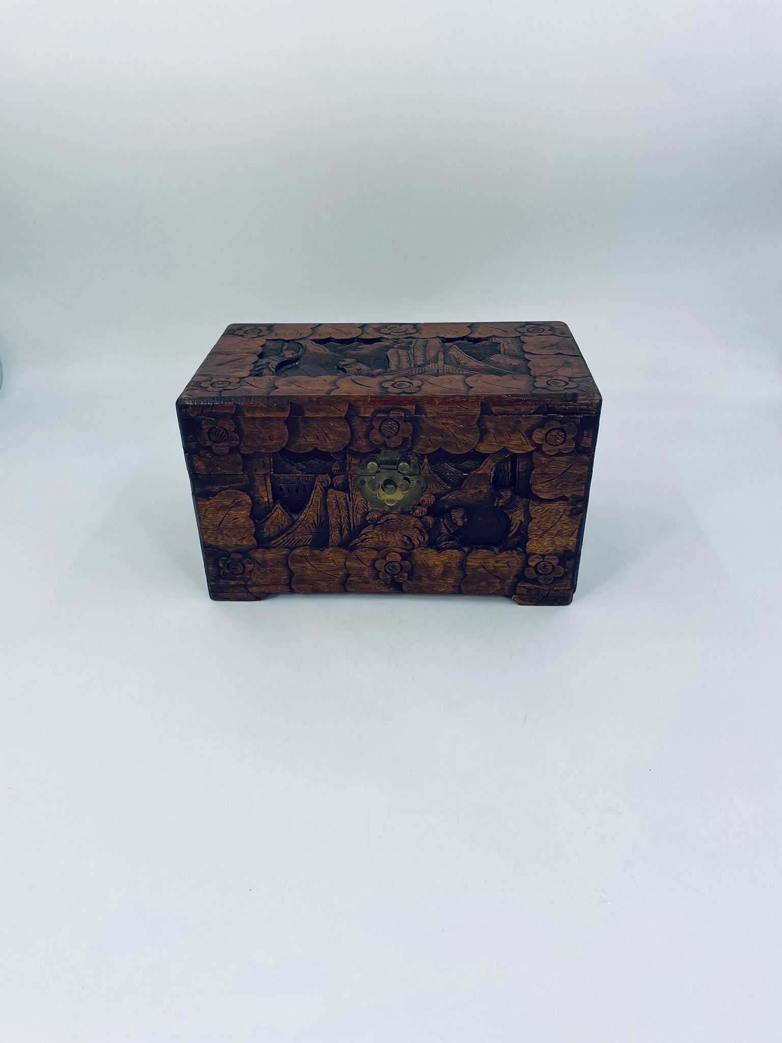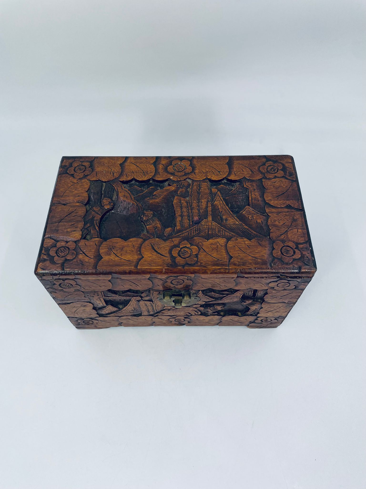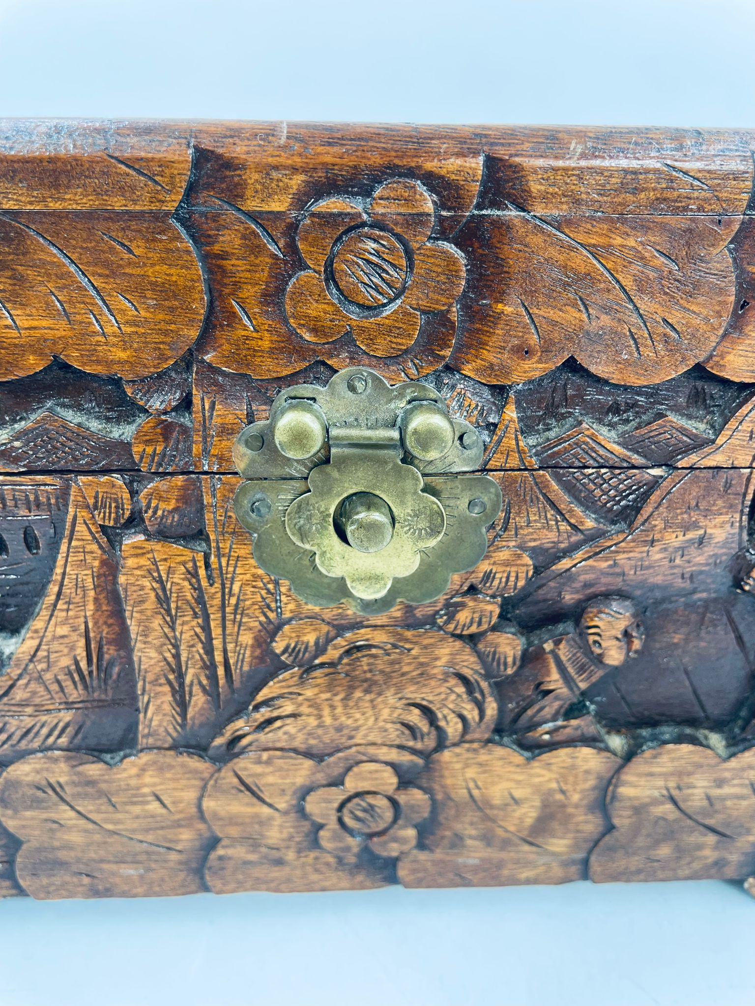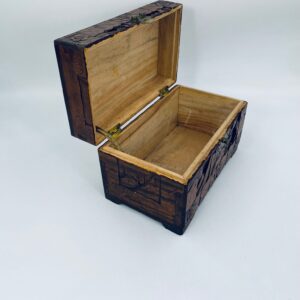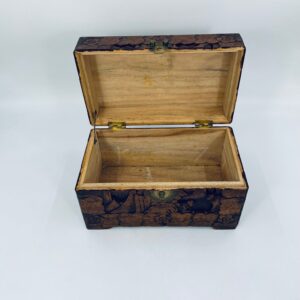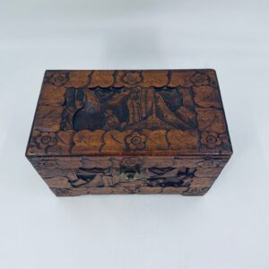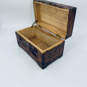 Chińska, ręcznie rzeźbiona szkatułka w kolorze brązu, wykonana z drewna kamforowego. Misterne wzory przedstawiają motywy chińskie. Antyczna szkatułka służy do przechowywania pamiątek, kwiatów, biżuterii oraz innych drobnych przedmiotów.