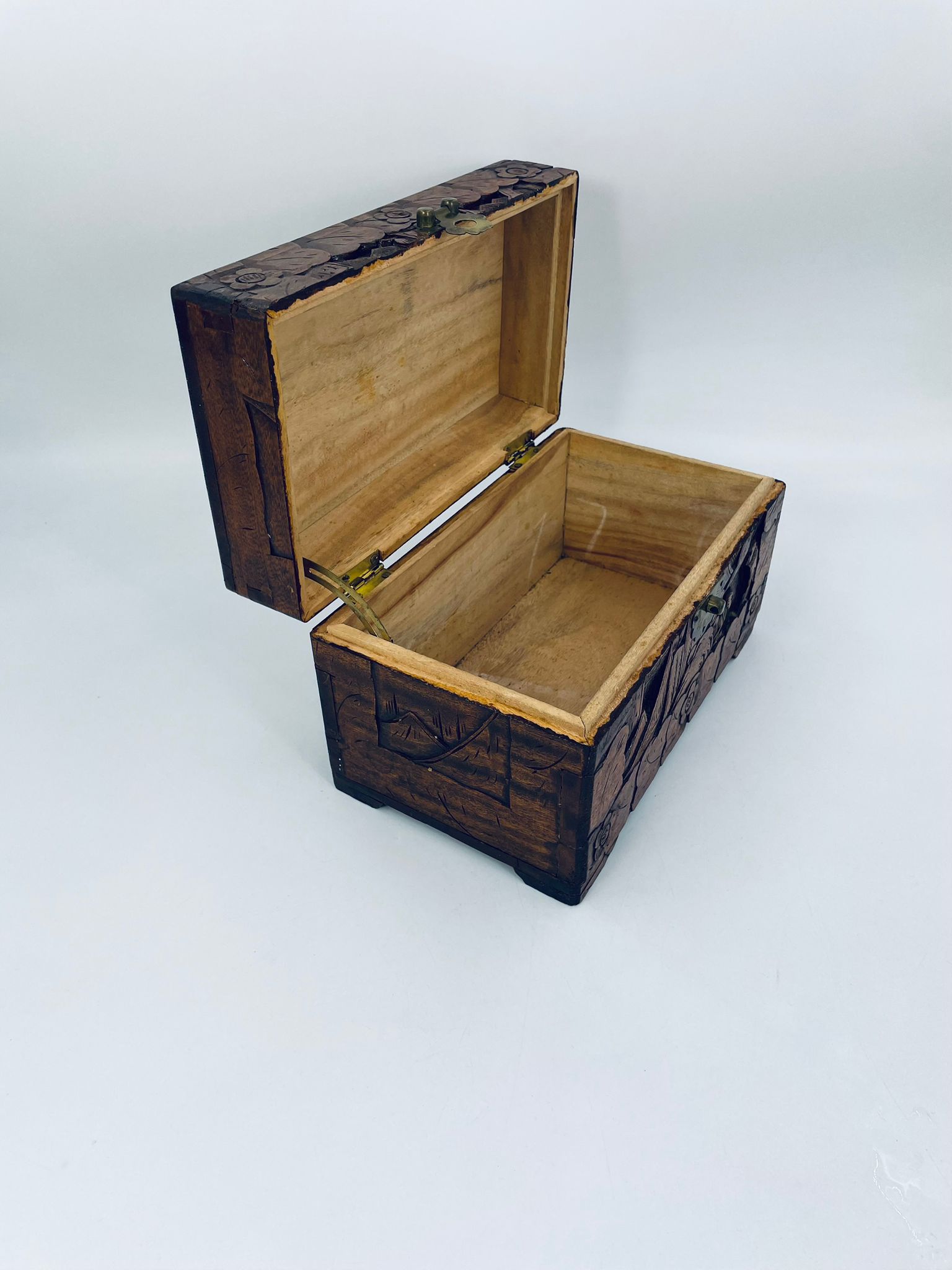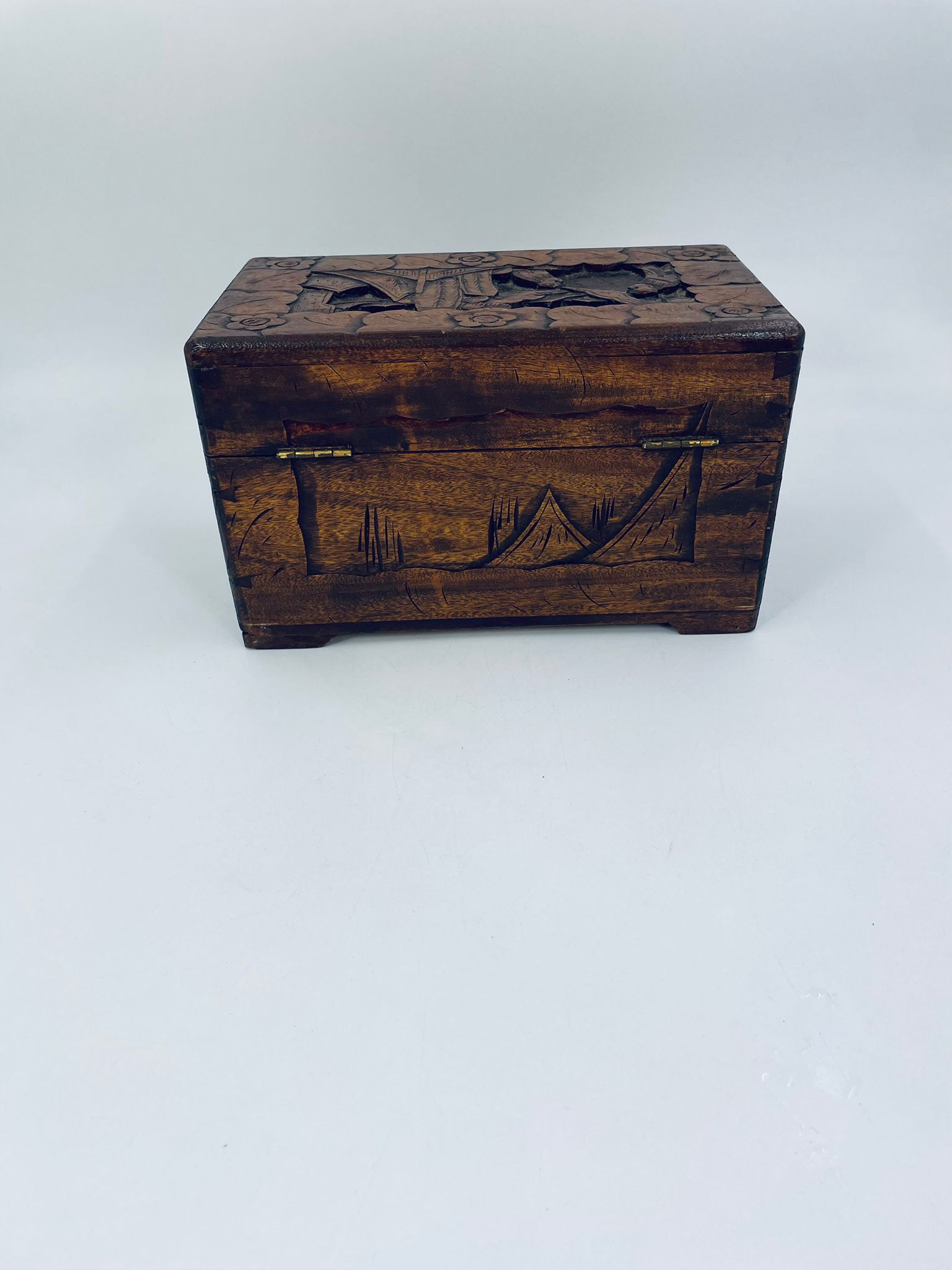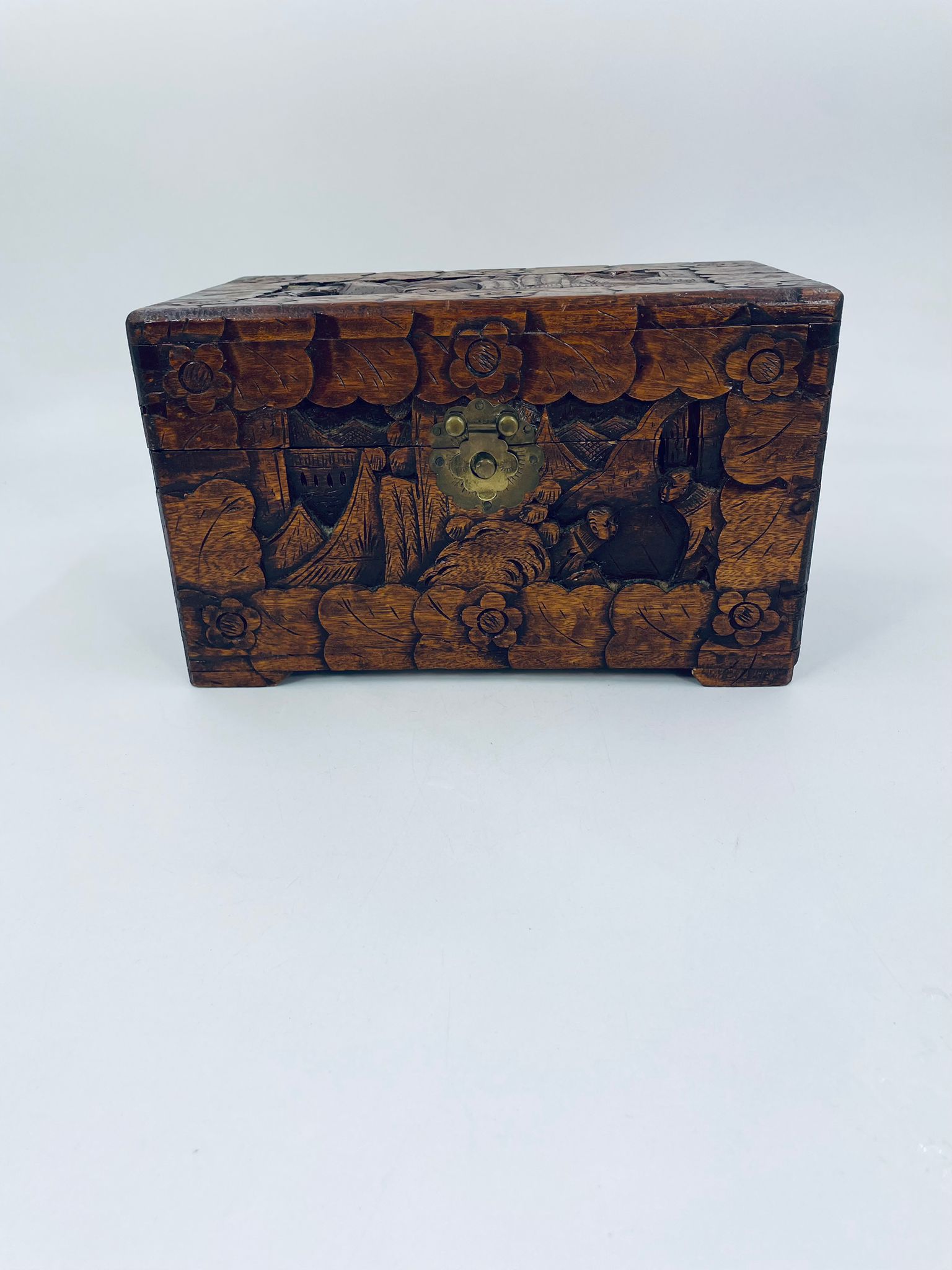 Chińska, ręcznie rzeźbiona szkatułka w kolorze brązu, wykonana z drewna kamforowego. Misterne wzory przedstawiają motywy chińskie. Antyczna szkatułka służy do przechowywania pamiątek, kwiatów, biżuterii oraz innych drobnych przedmiotów.
