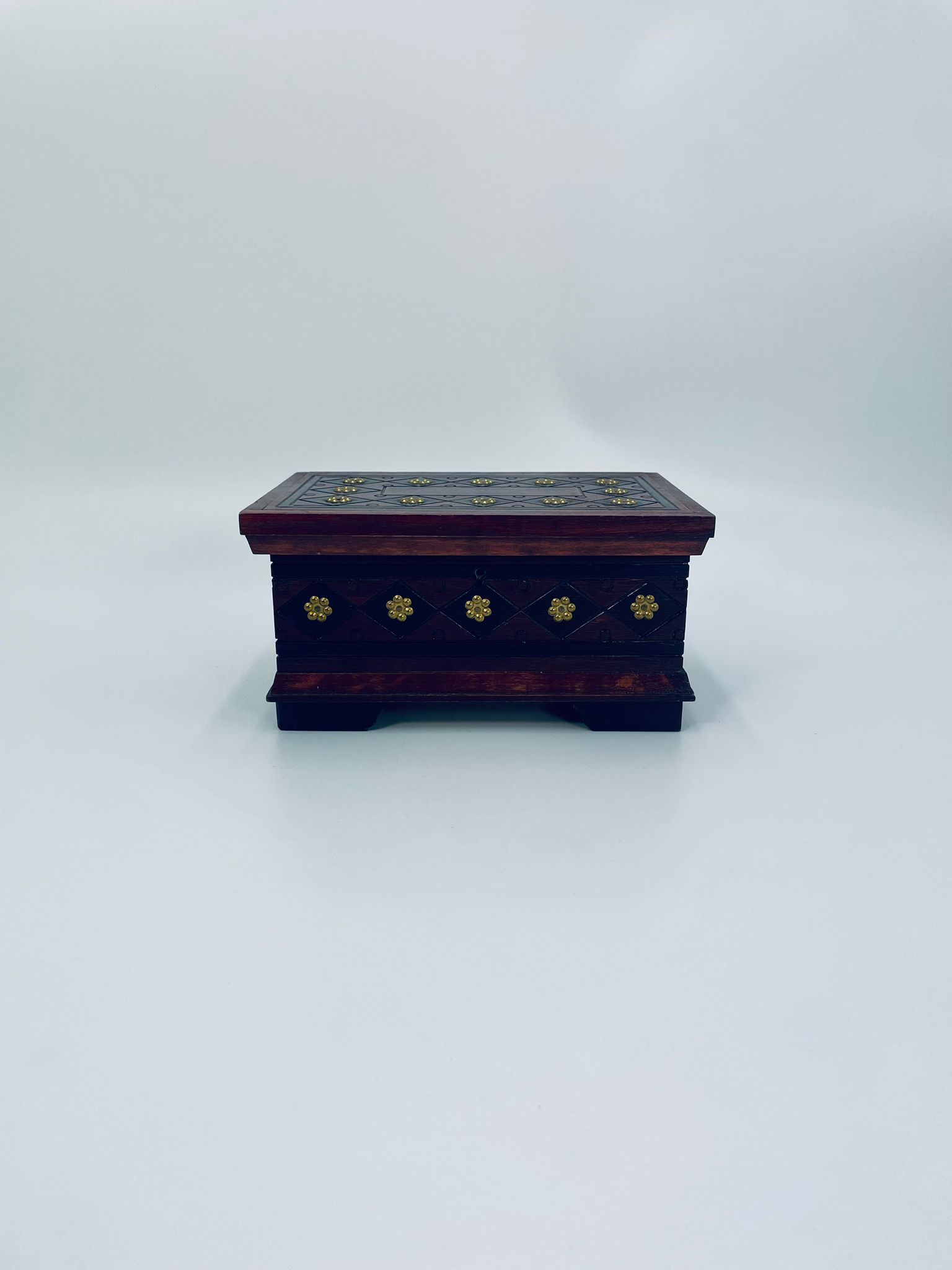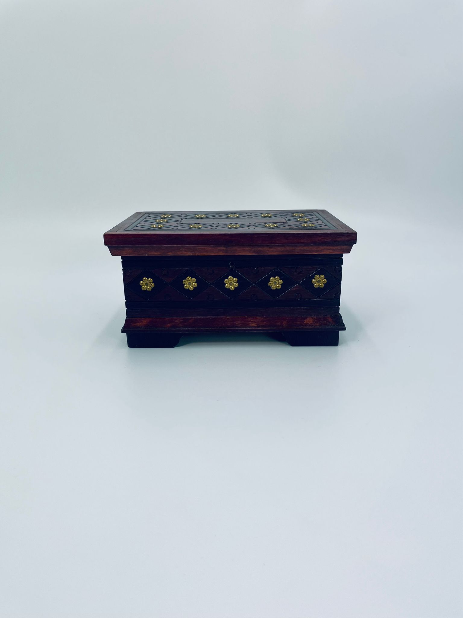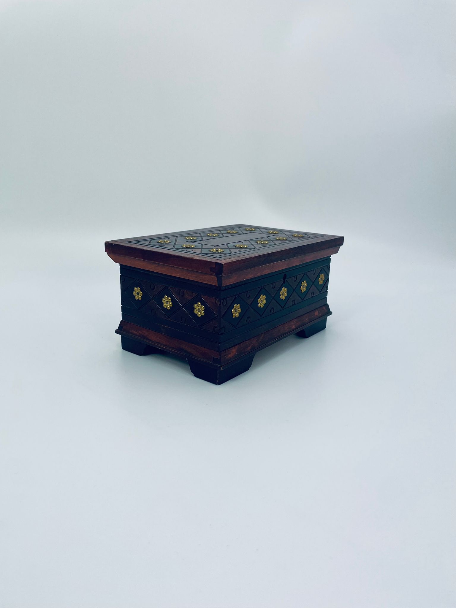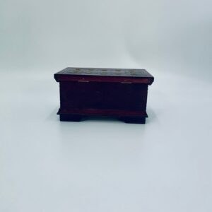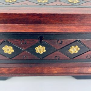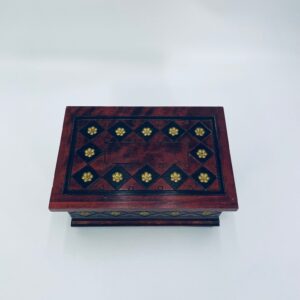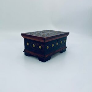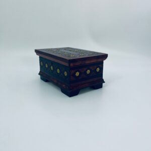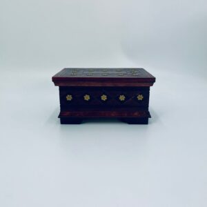 Szkatułka na biżuterię w stylu Indyjskim, wykonana z drewna w brązowym kolorze. Szkatułka na czterech nóżkach, charakteryzuje się bogatymi zdobieniami metalowymi, stylizowanymi na wzór kwiatów oraz rzeźbionymi wzorami geometrycznymi. Środek szkatułki wyłożony jest czerwonym materiałem.