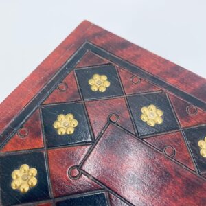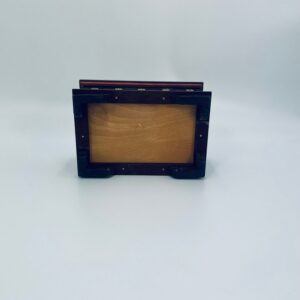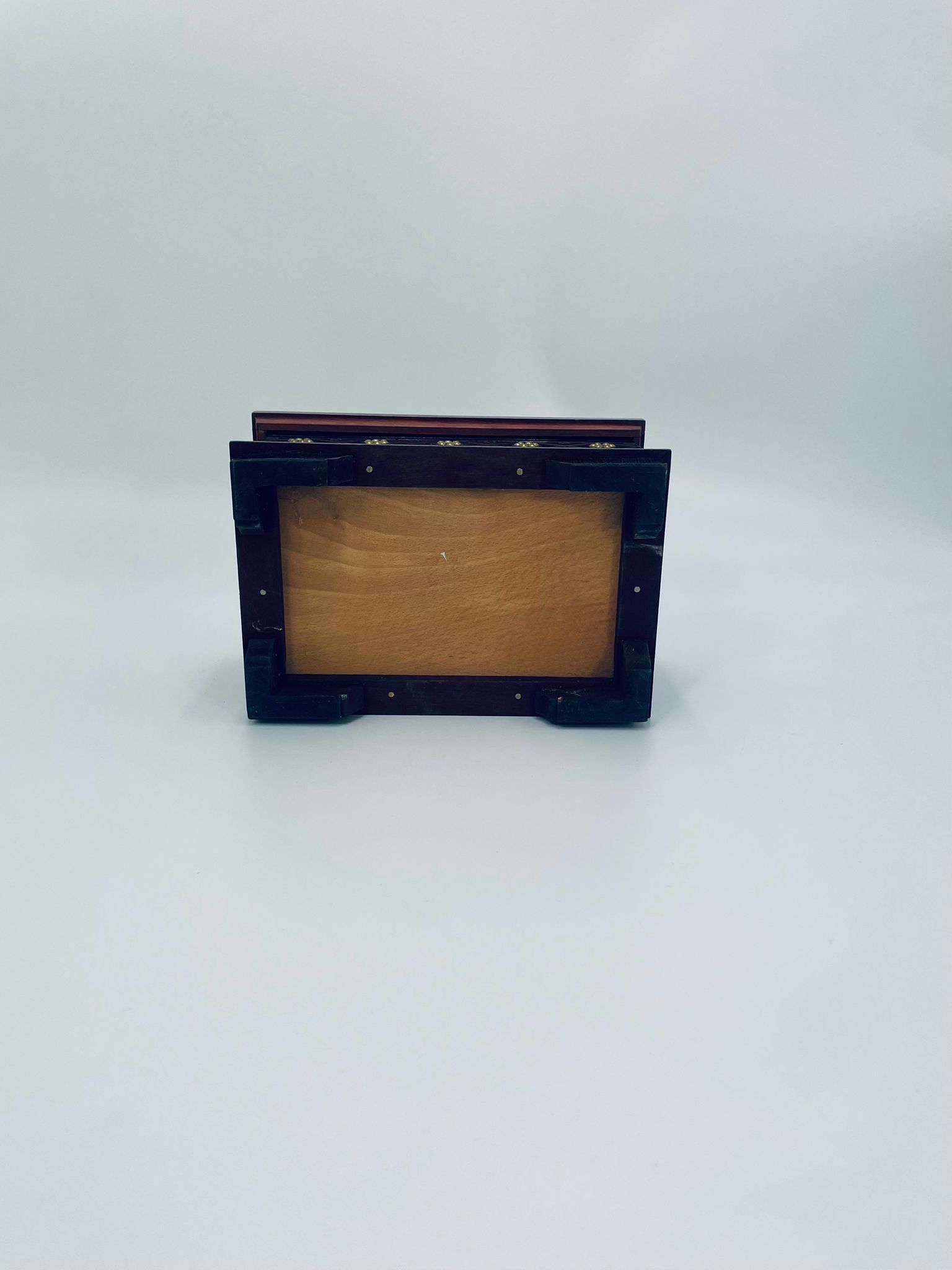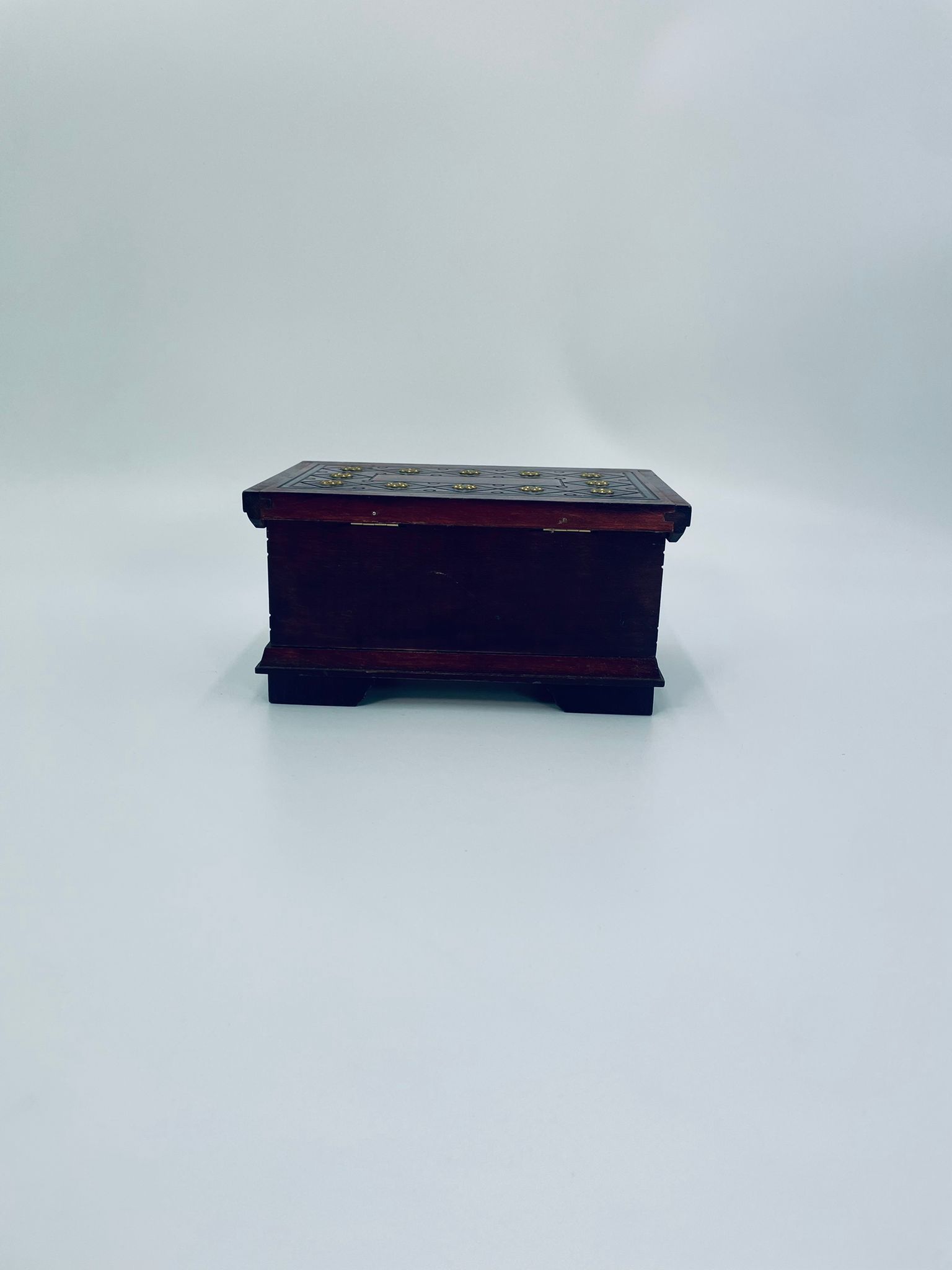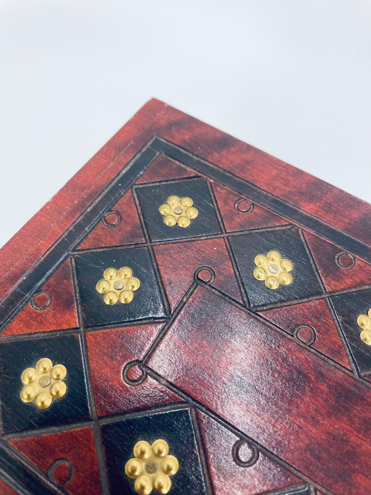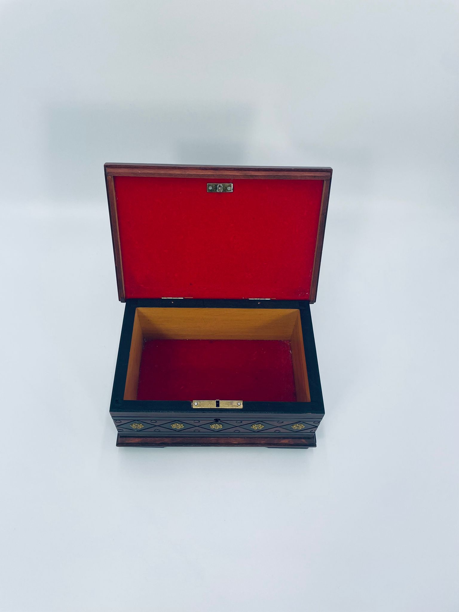 Szkatułka na biżuterię w stylu Indyjskim, wykonana z drewna w brązowym kolorze. Szkatułka na czterech nóżkach, charakteryzuje się bogatymi zdobieniami metalowymi, stylizowanymi na wzór kwiatów oraz rzeźbionymi wzorami geometrycznymi. Środek szkatułki wyłożony jest czerwonym materiałem.