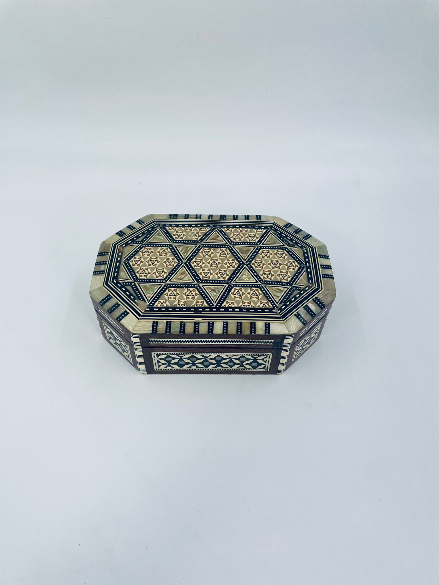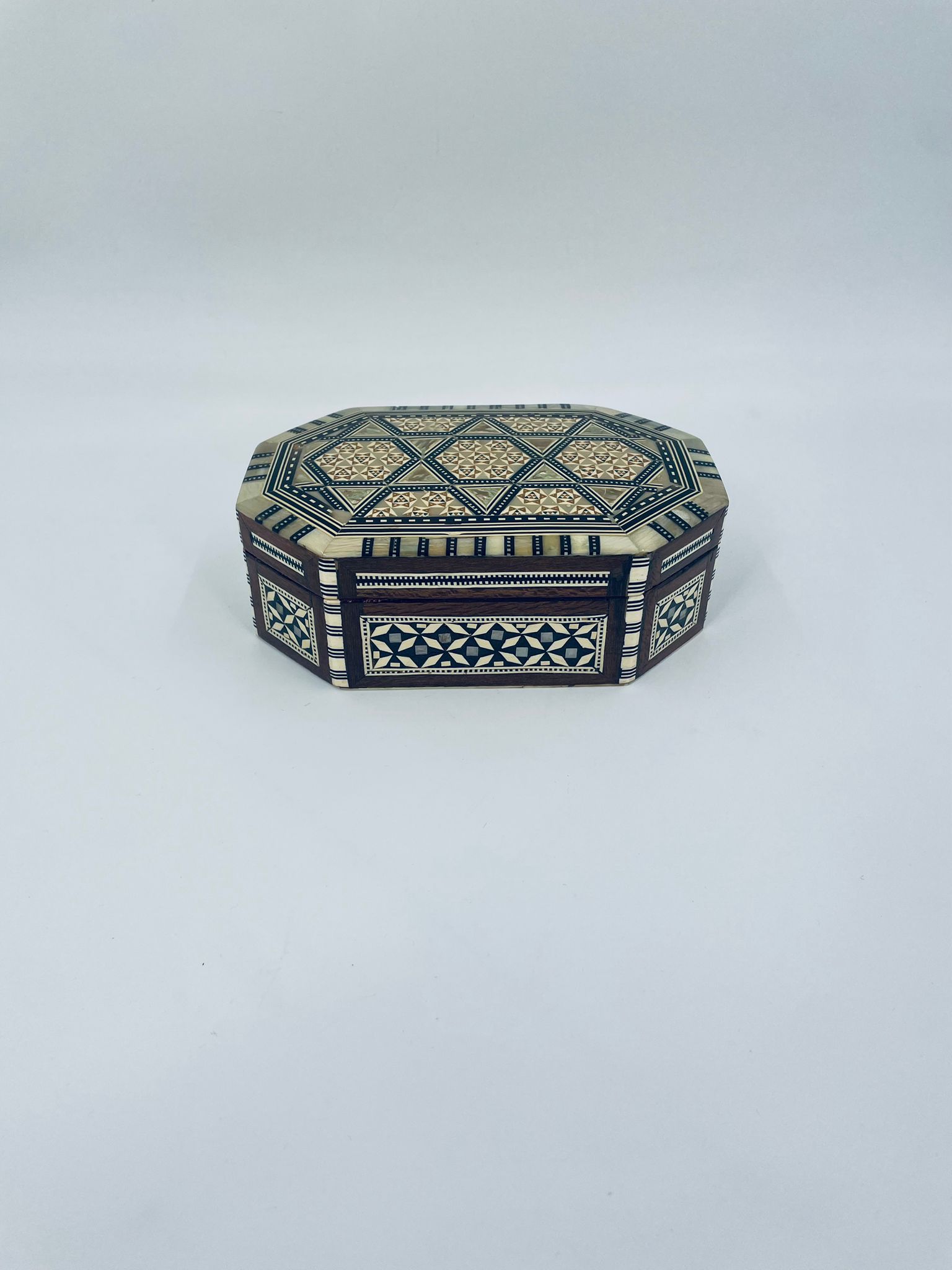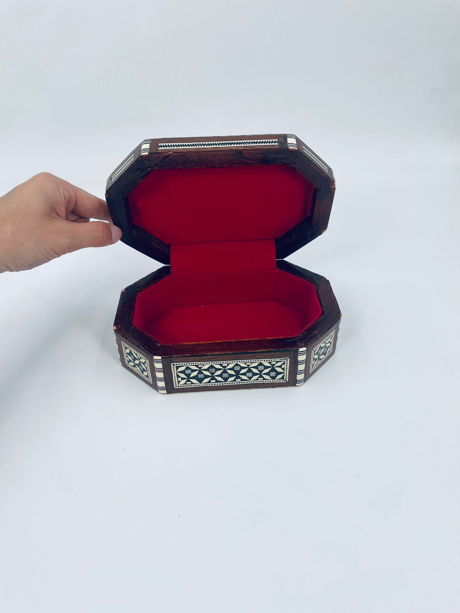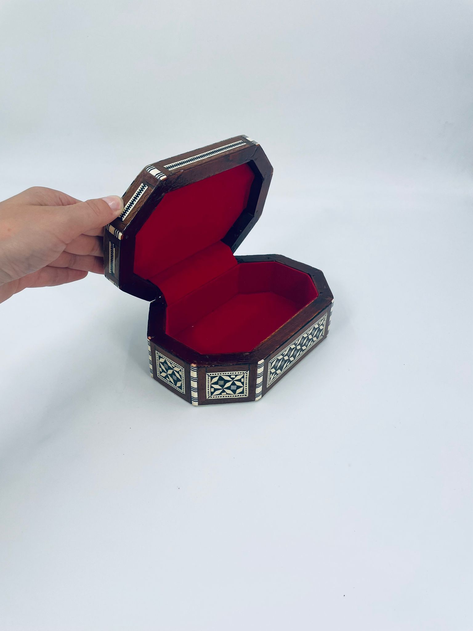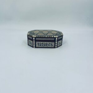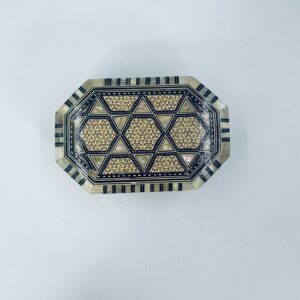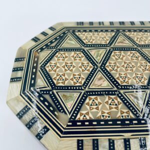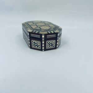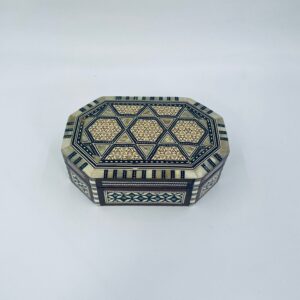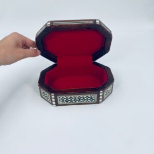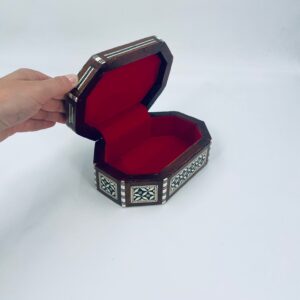 Zabytkowa szkatułka Egipska na biżuterię, wykonana z różnych rodzai drewna, inkrustowaną masą perłową. Charakteryzuje się arabeskowym wzorem. Wnętrze szkatułki wyłożone jest czarowanym aksamitem.