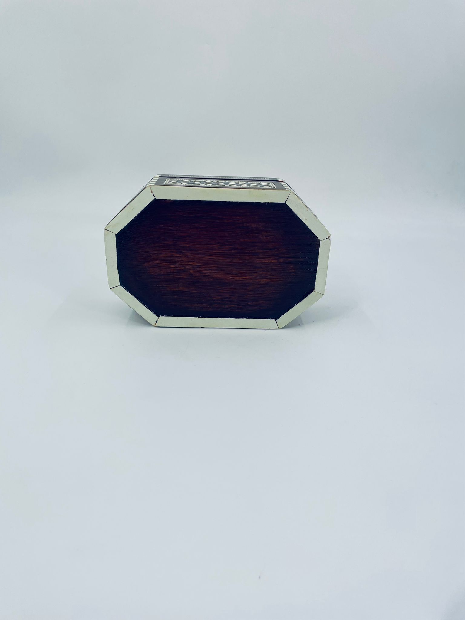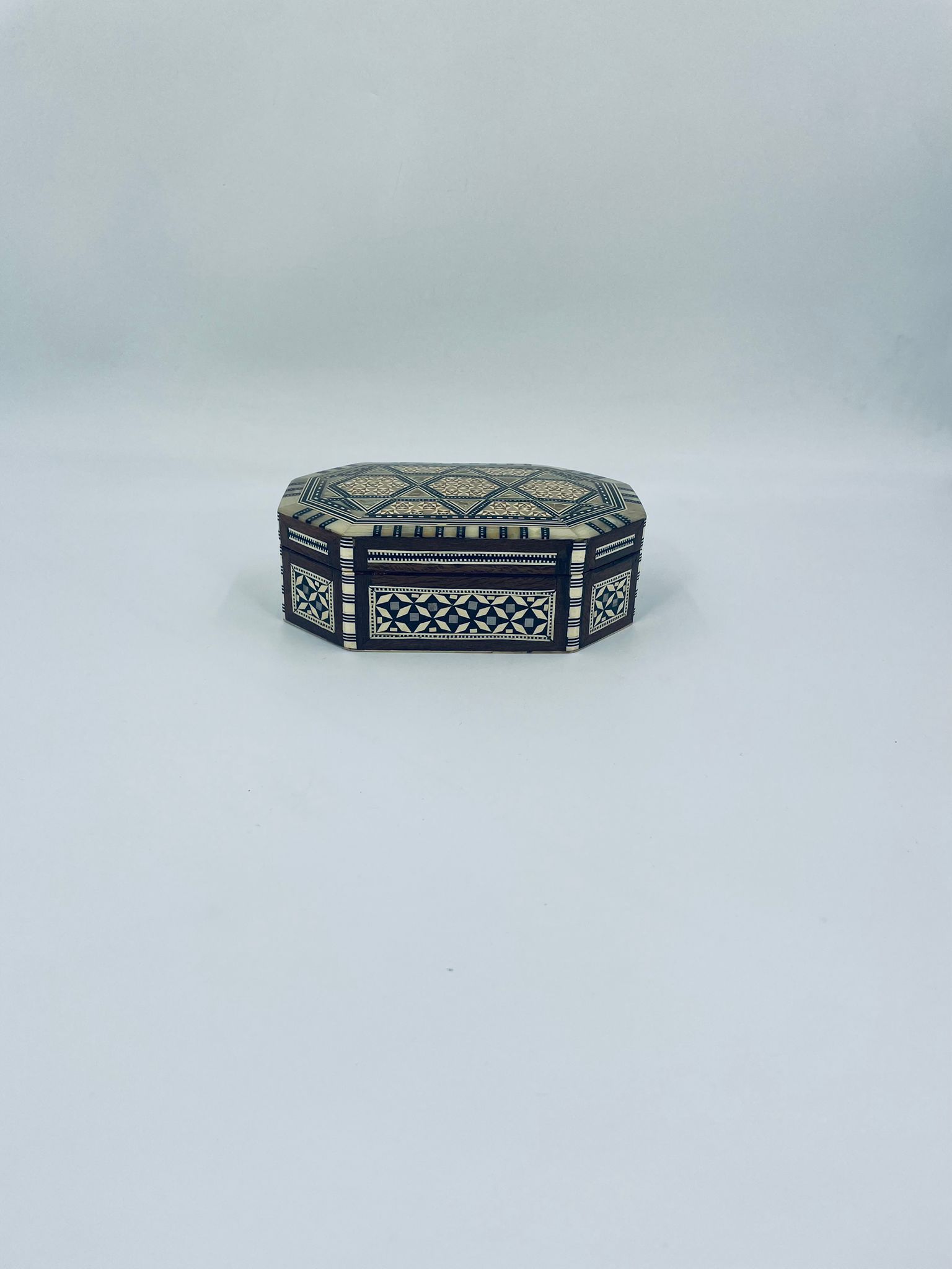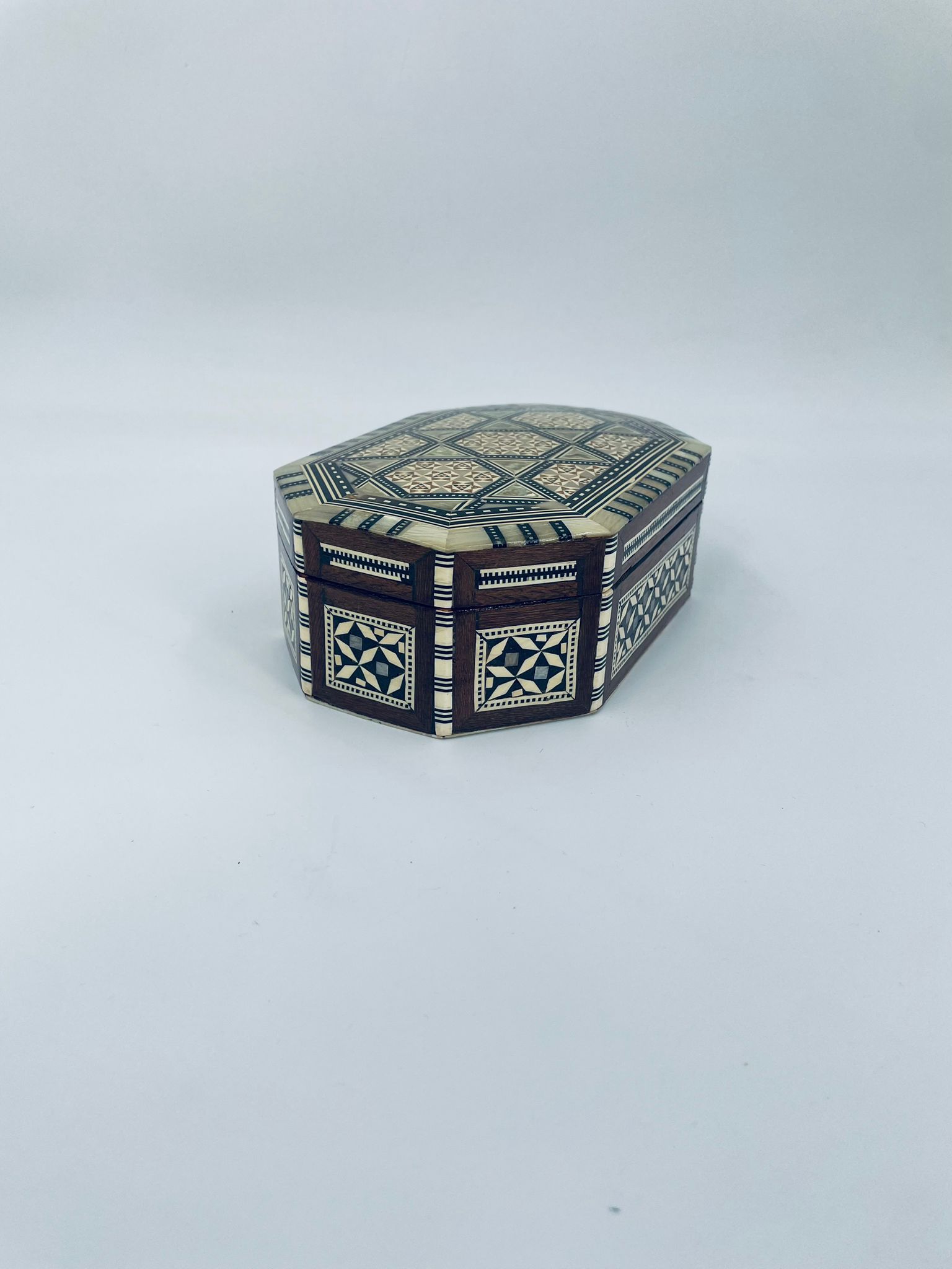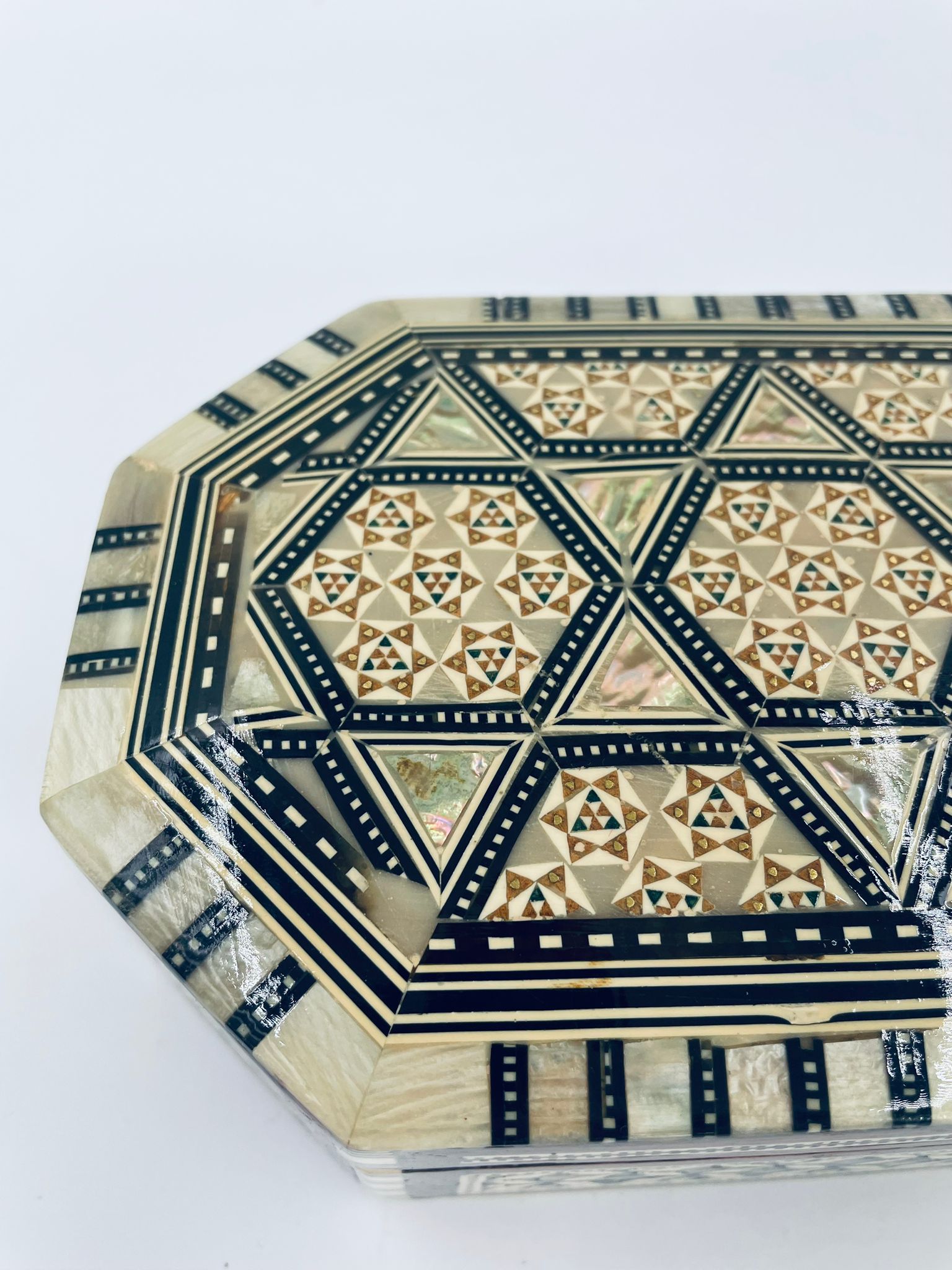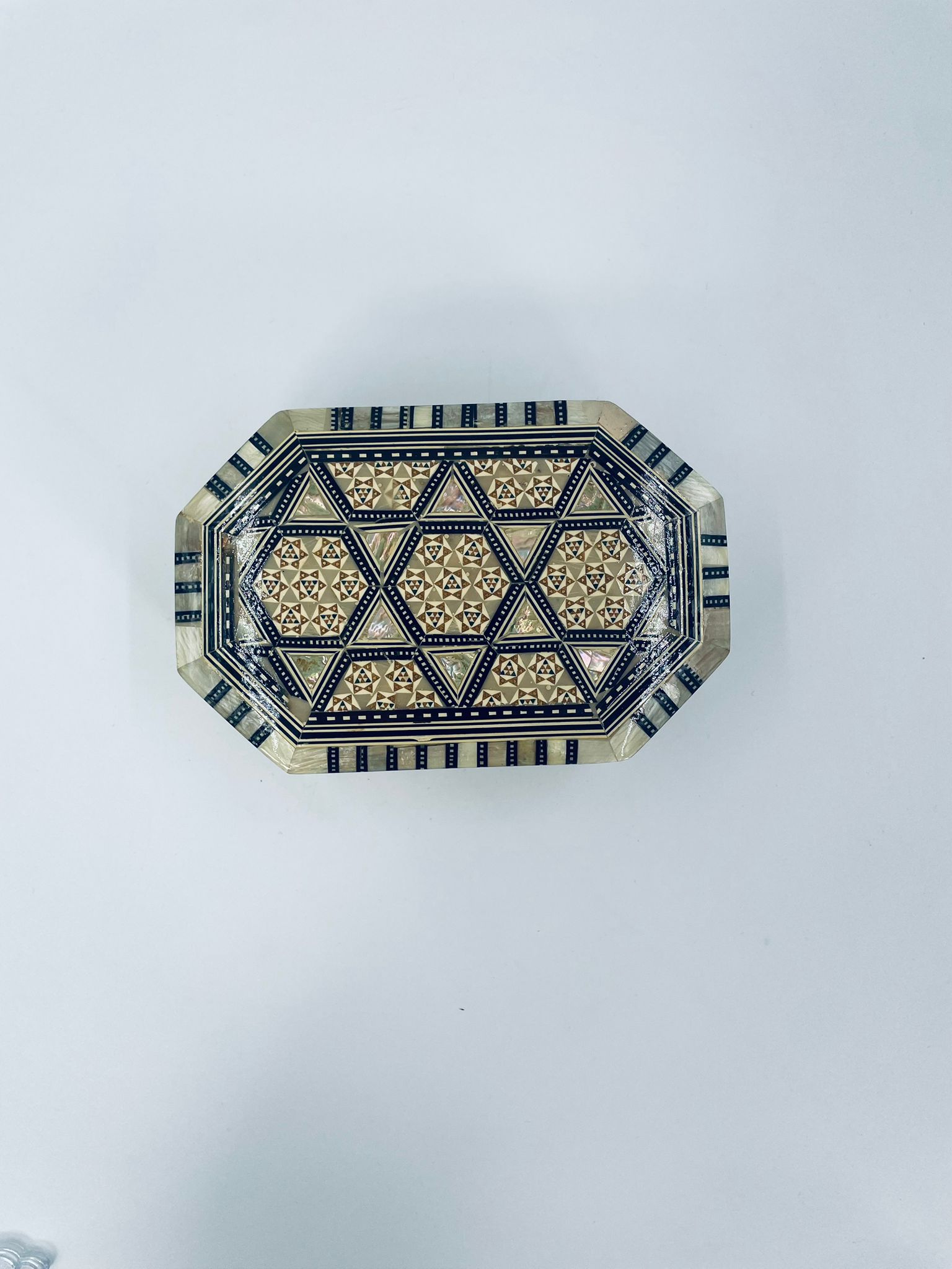 Zabytkowa szkatułka Egipska na biżuterię, wykonana z różnych rodzai drewna, inkrustowaną masą perłową. Charakteryzuje się arabeskowym wzorem. Wnętrze szkatułki wyłożone jest czarowanym aksamitem.