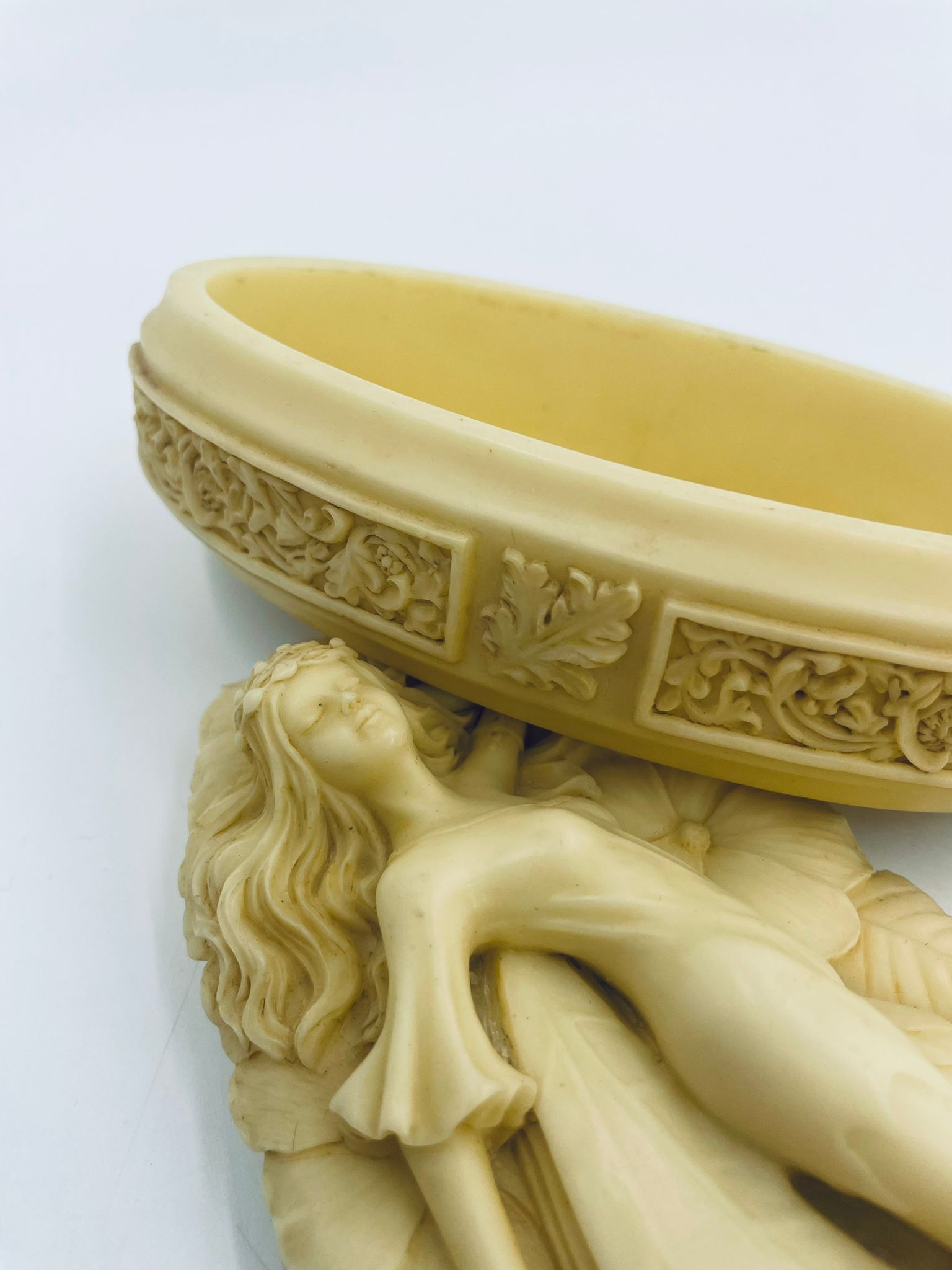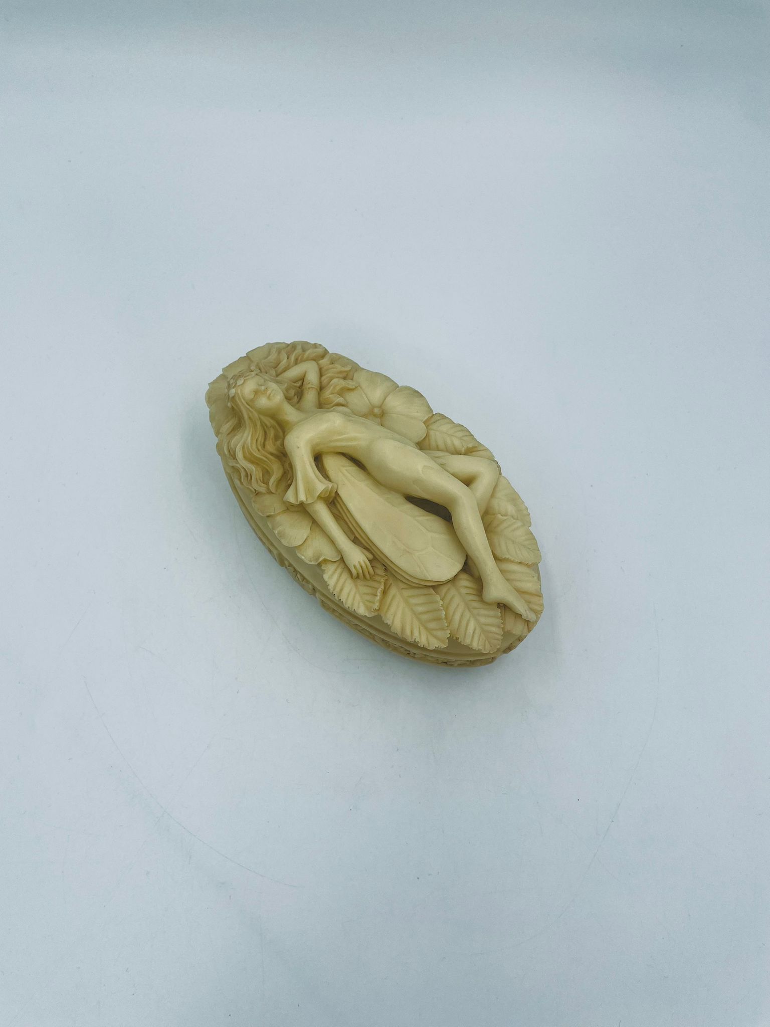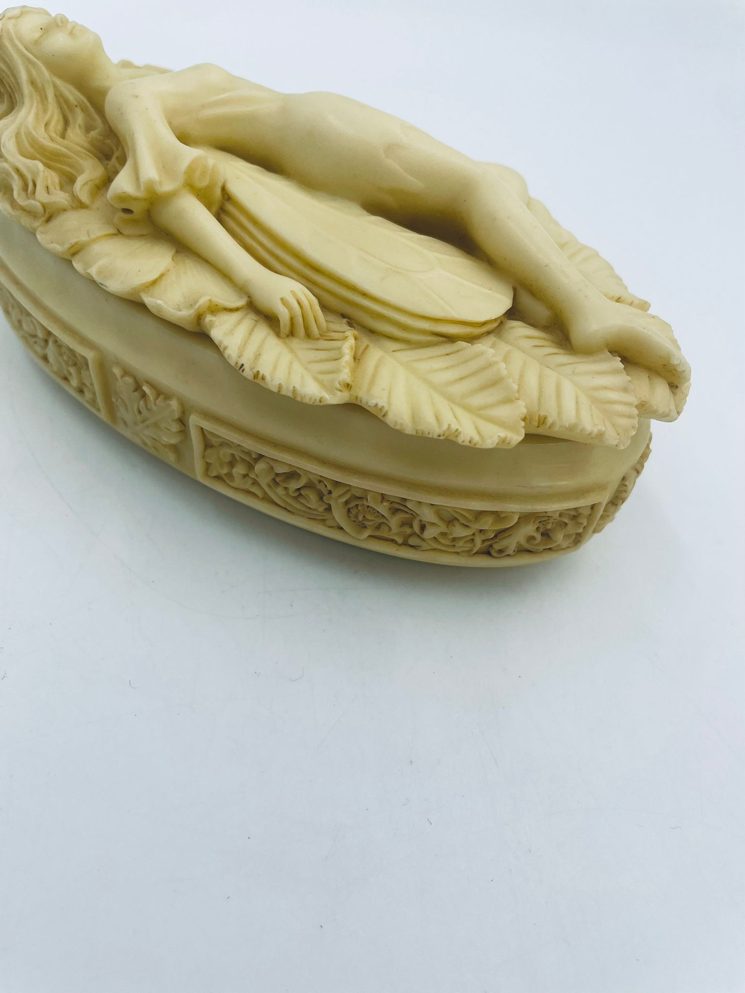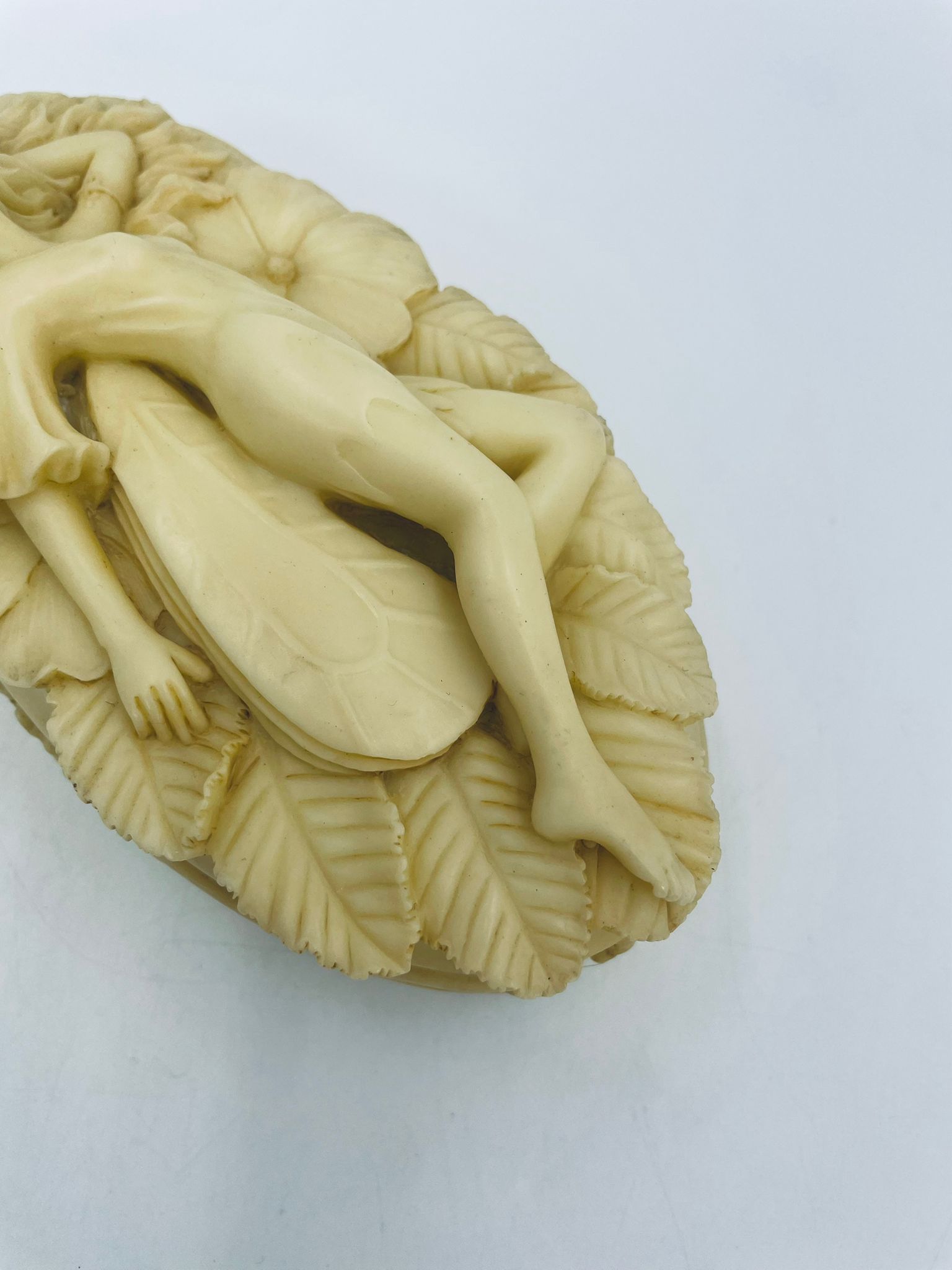 Szkatułka na drobiazgi w stylu Art Nouveau, wykonana prawdopodobnie z żywicy polimerowej imitującej kość słoniową. Szkatułka ozdobiona rzeźbionymi wzorami roślinnymi, posiada dekoracyjna pokrywę z postacią wróżki spoczywającej na listkach.