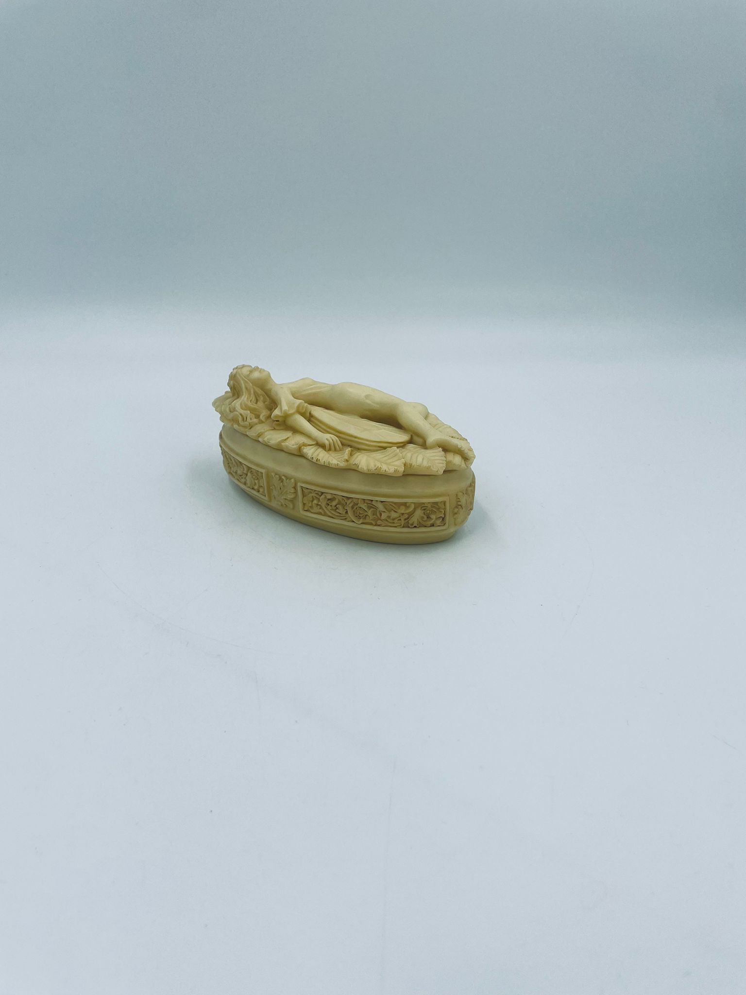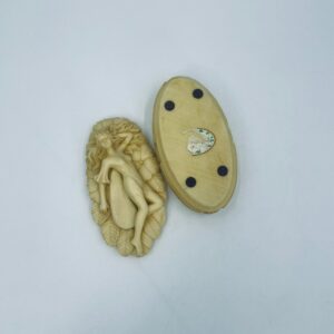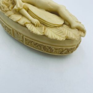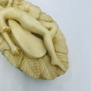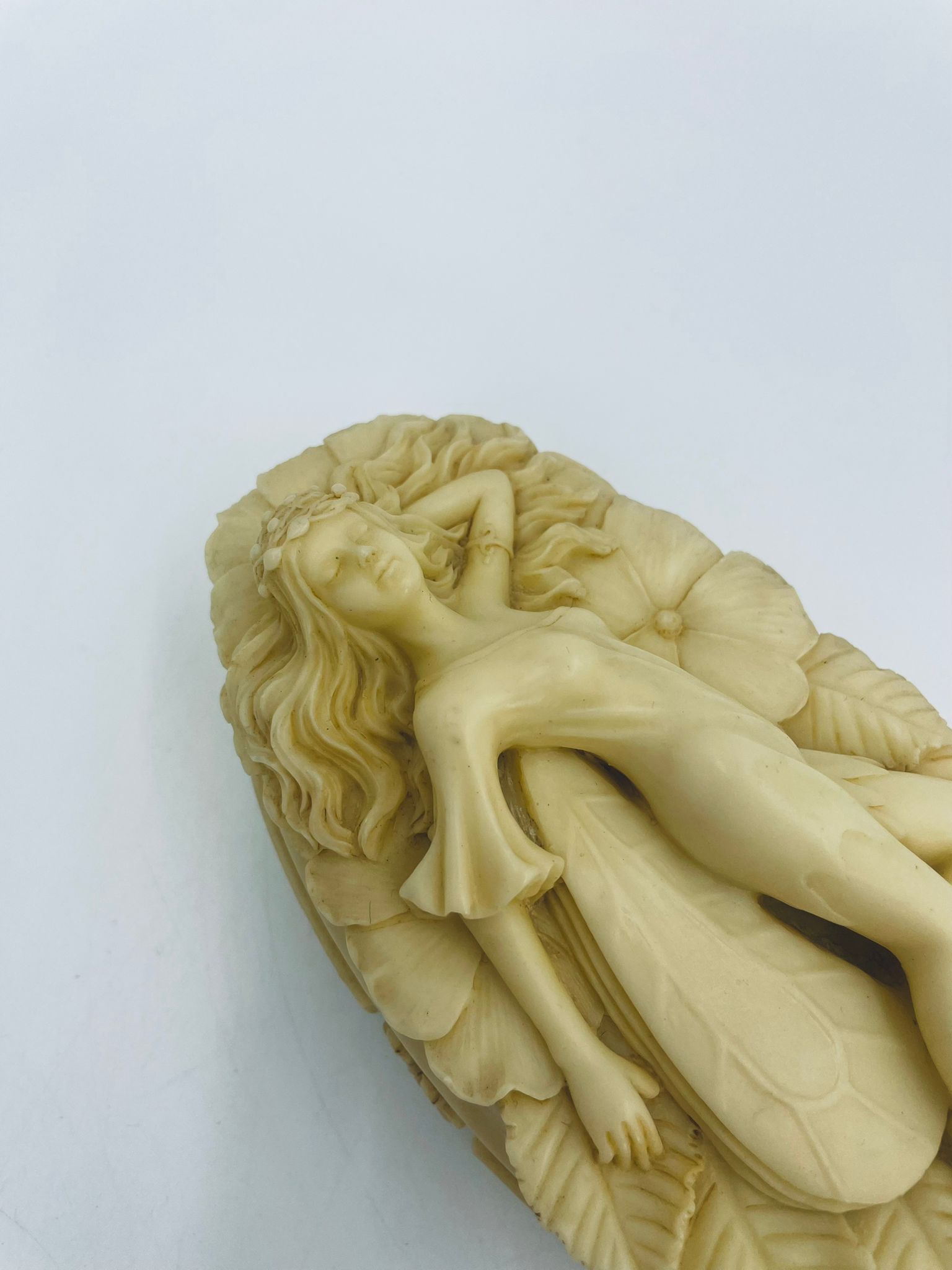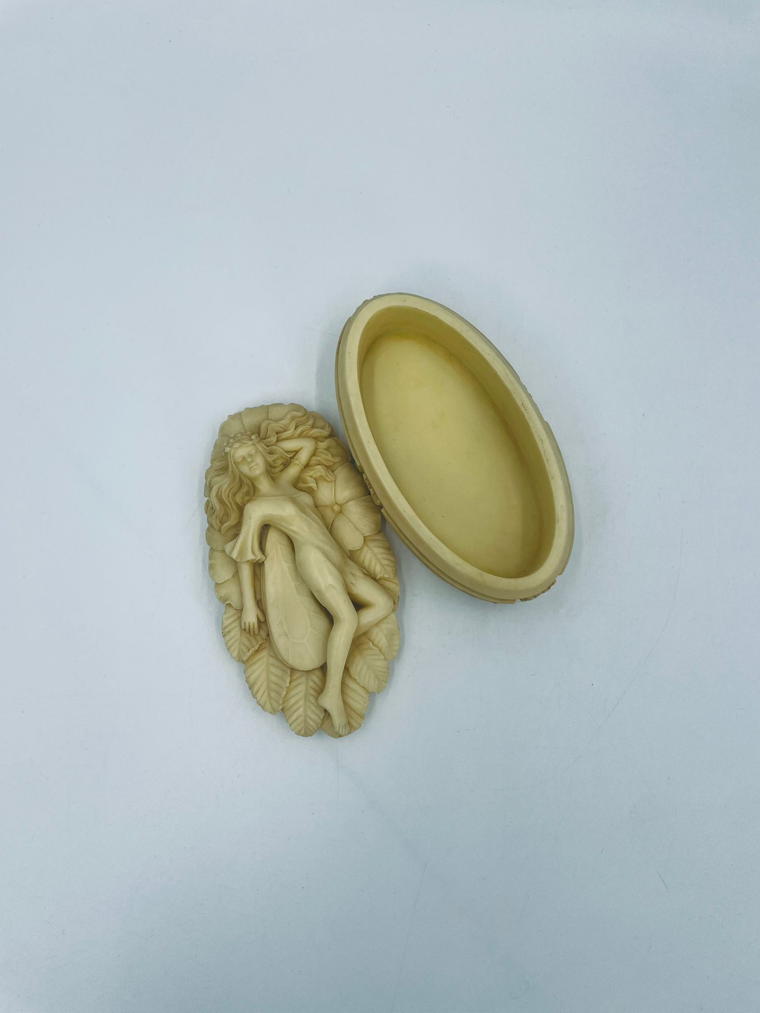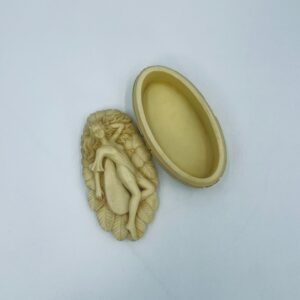 Szkatułka na drobiazgi w stylu Art Nouveau, wykonana prawdopodobnie z żywicy polimerowej imitującej kość słoniową. Szkatułka ozdobiona rzeźbionymi wzorami roślinnymi, posiada dekoracyjna pokrywę z postacią wróżki spoczywającej na listkach.