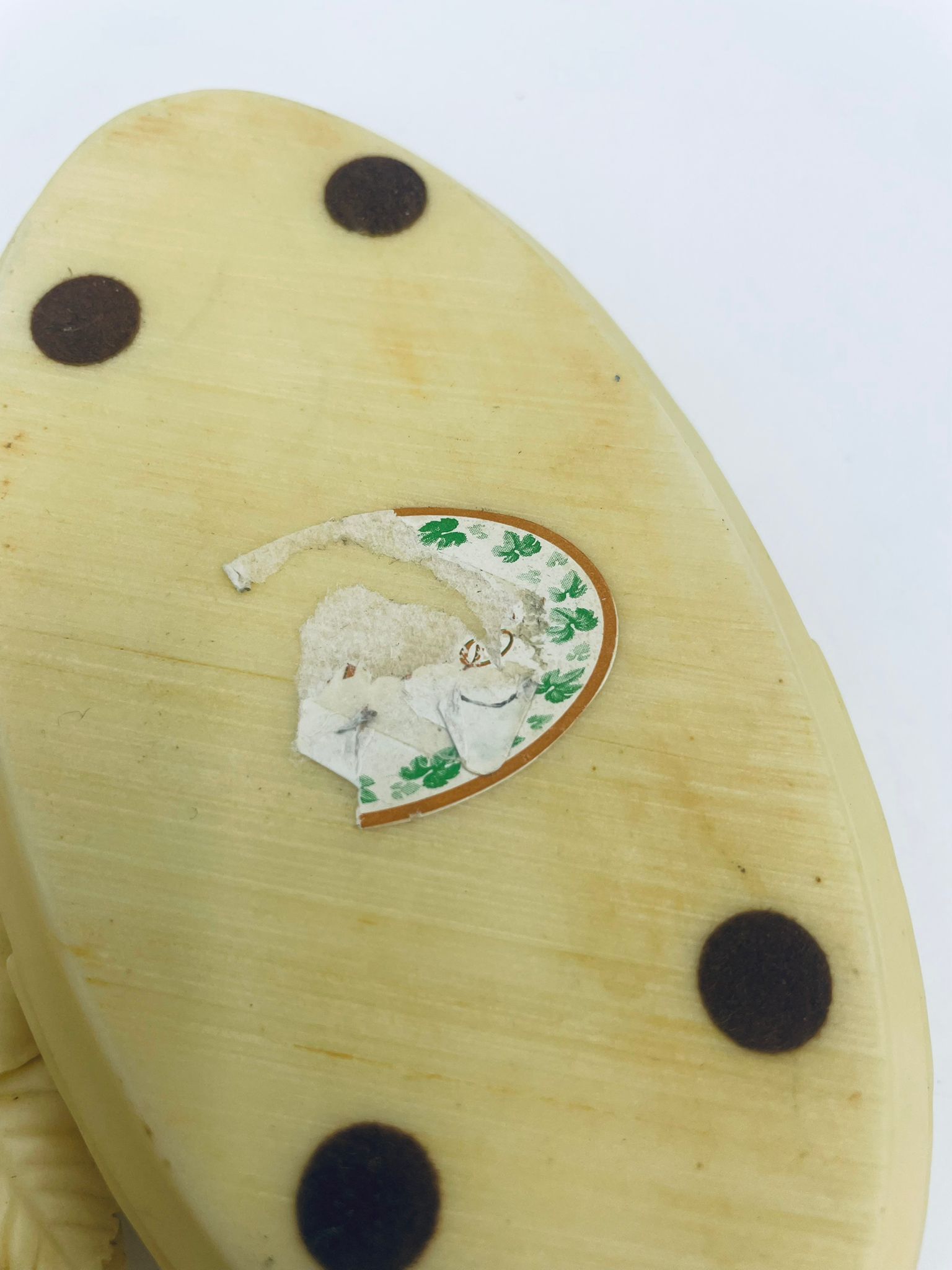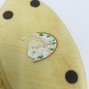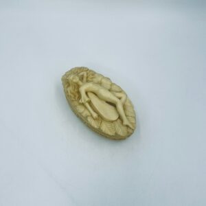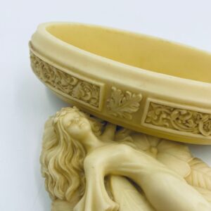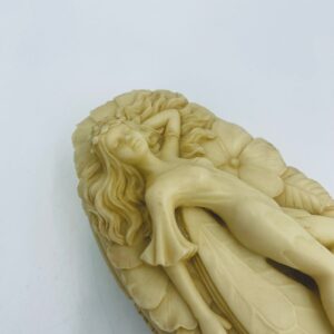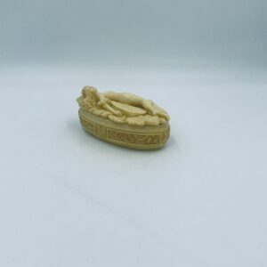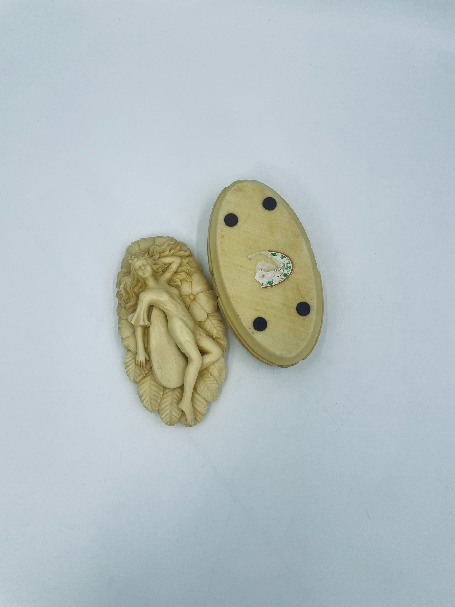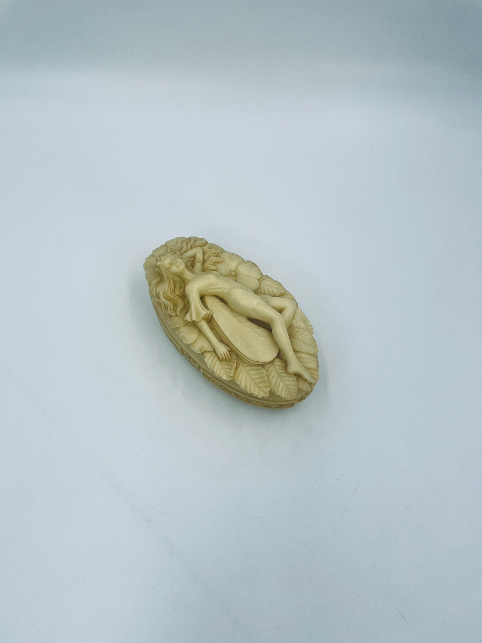 Szkatułka na drobiazgi w stylu Art Nouveau, wykonana prawdopodobnie z żywicy polimerowej imitującej kość słoniową. Szkatułka ozdobiona rzeźbionymi wzorami roślinnymi, posiada dekoracyjna pokrywę z postacią wróżki spoczywającej na listkach.