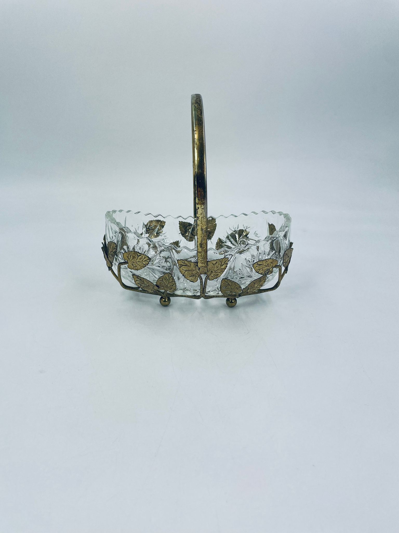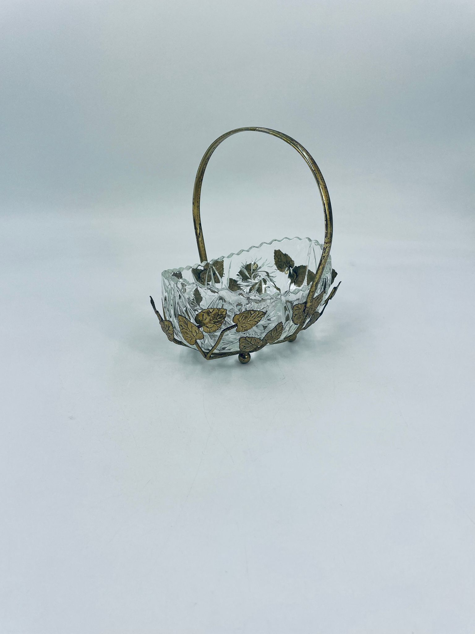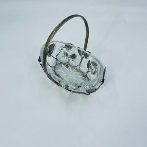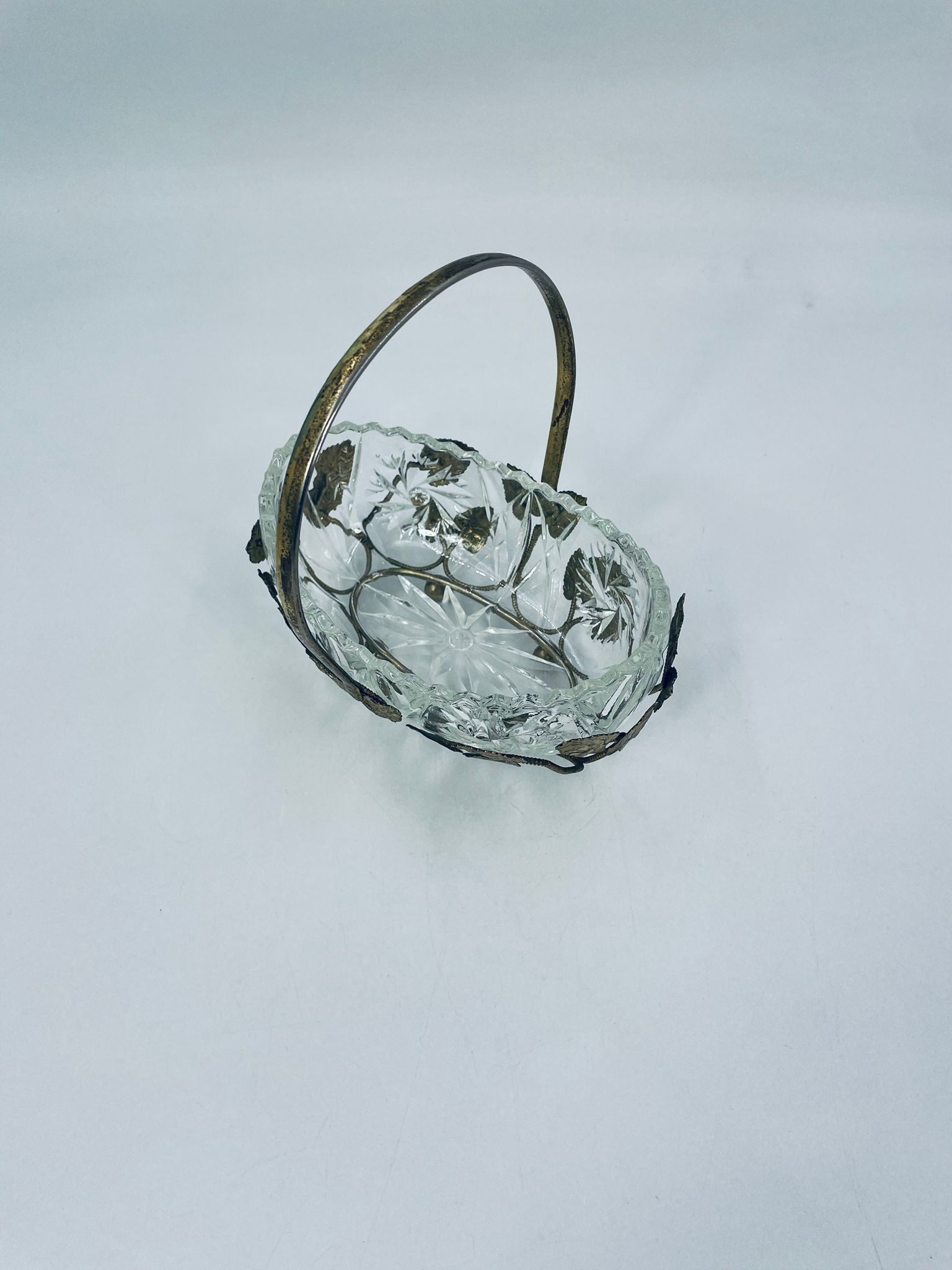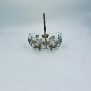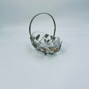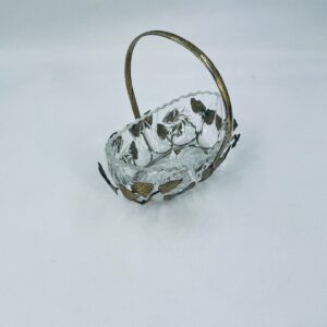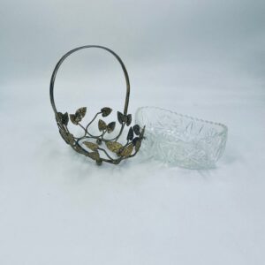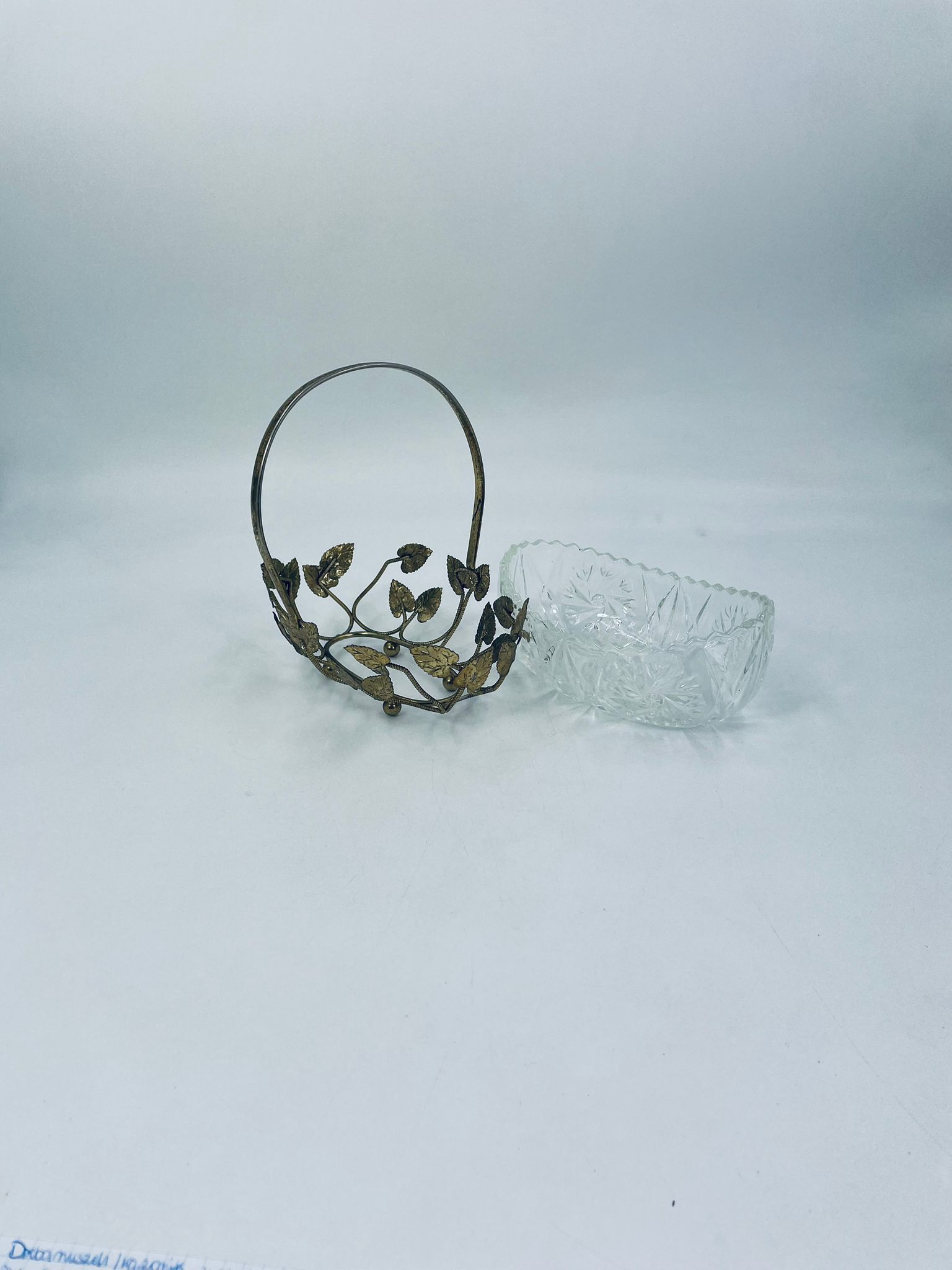 Misa ze szkła kryształowego, przezroczystego, z geometrycznymi wzorami i ząbkowaną krawędzią, osadzona w metalowej oprawie w kształcie liści wraz z uchwytem. Może służyć jako cukiernica, przedmiot do przechowywania słodyczy lub jakoś element dekoracyjny.