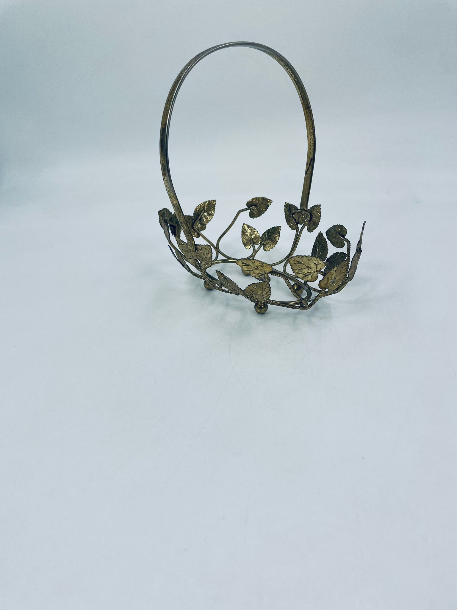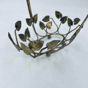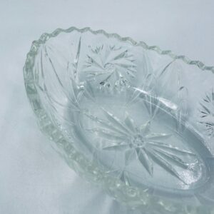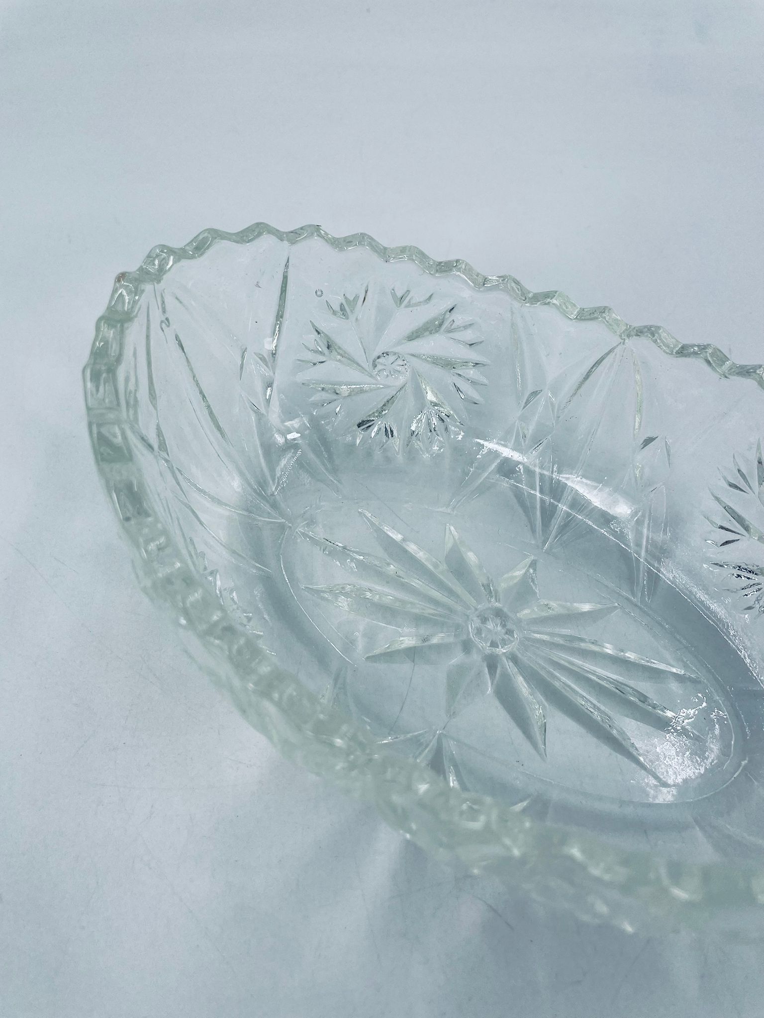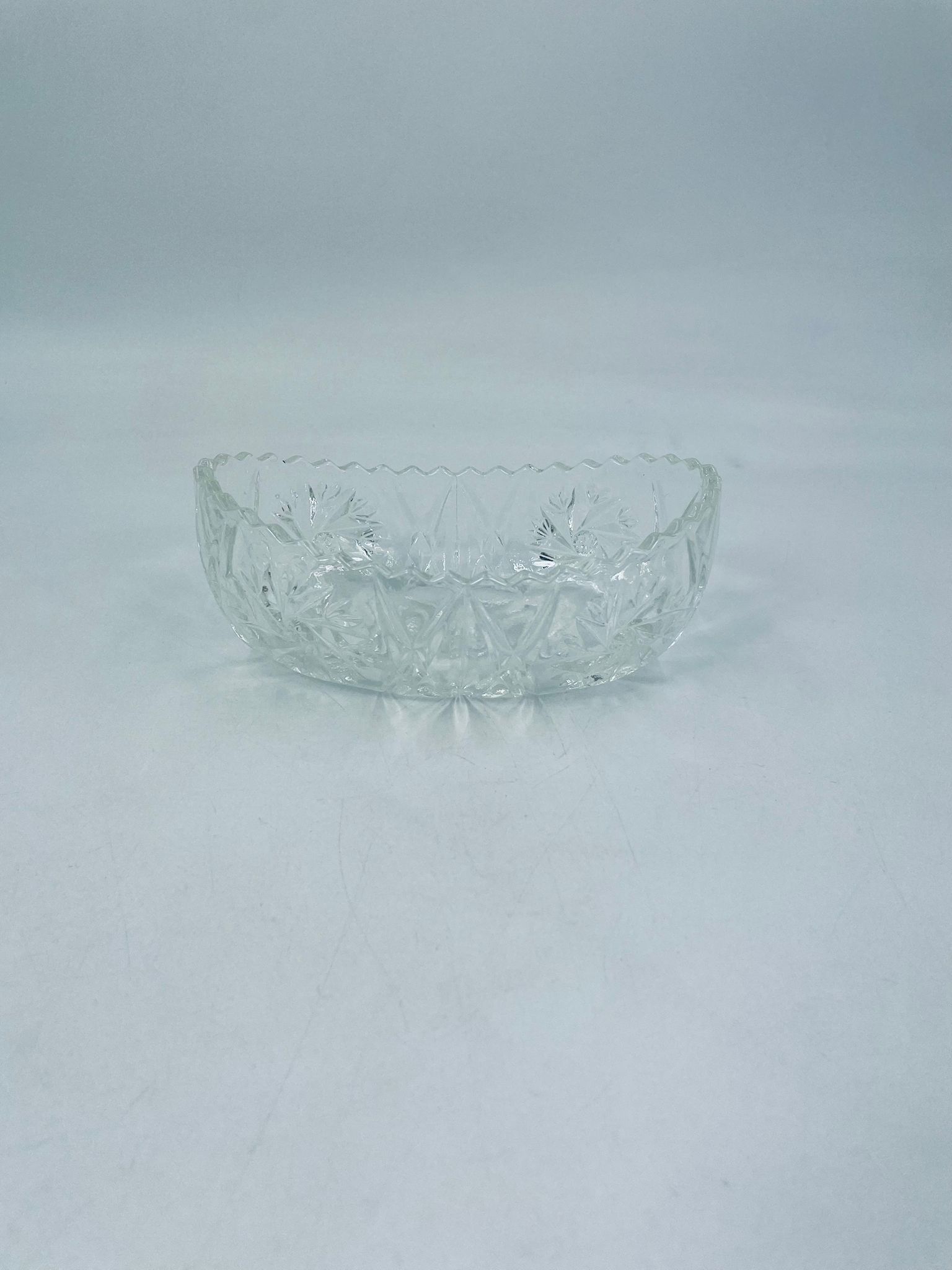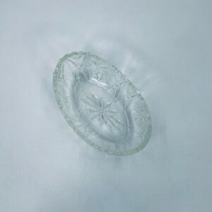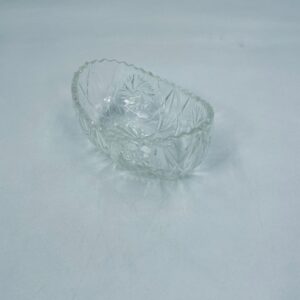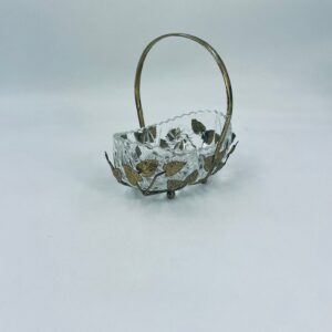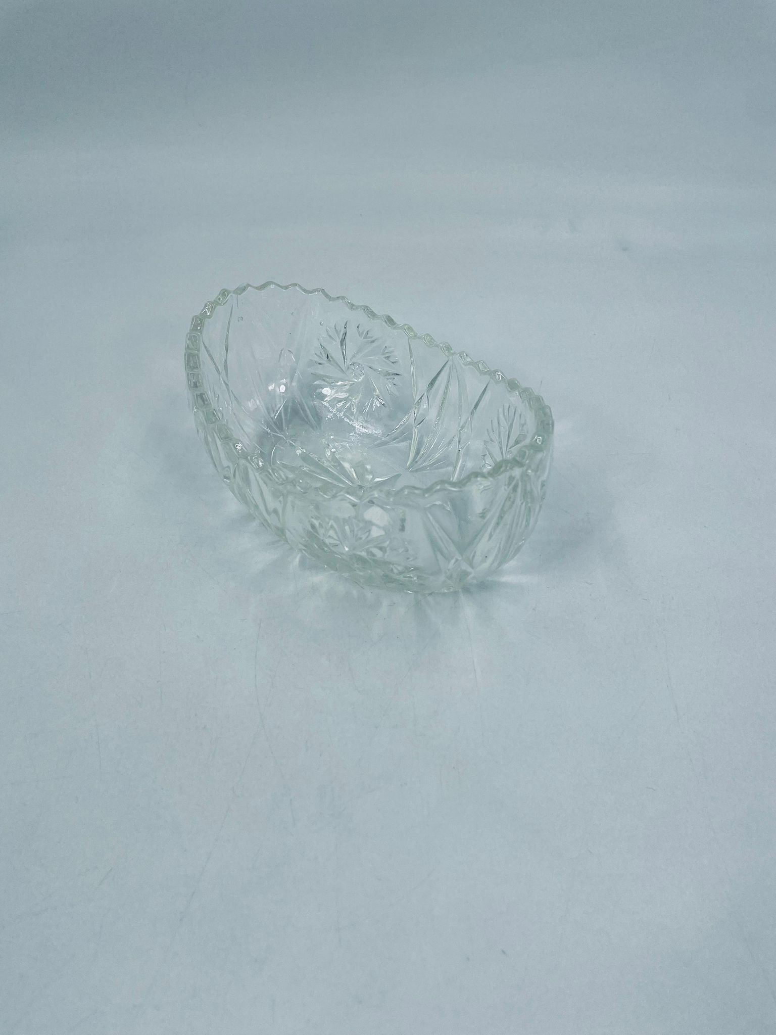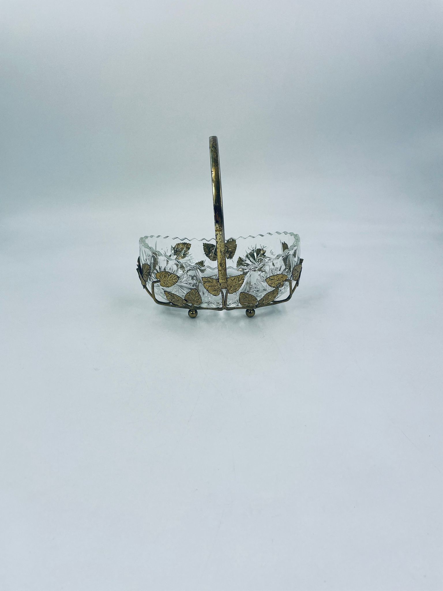 Misa ze szkła kryształowego, przezroczystego, z geometrycznymi wzorami i ząbkowaną krawędzią, osadzona w metalowej oprawie w kształcie liści wraz z uchwytem. Może służyć jako cukiernica, przedmiot do przechowywania słodyczy lub jakoś element dekoracyjny.