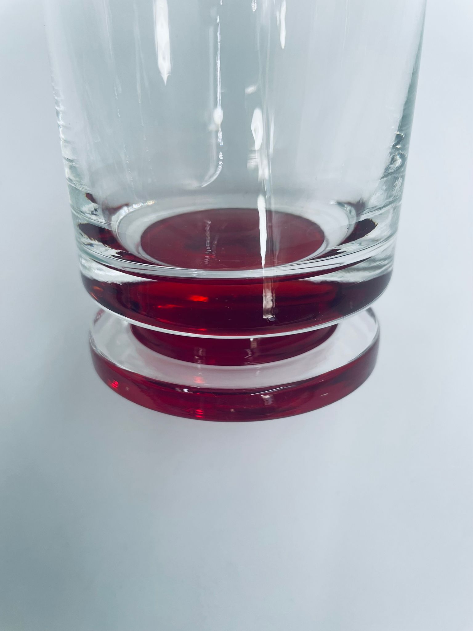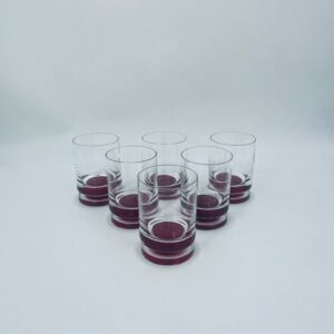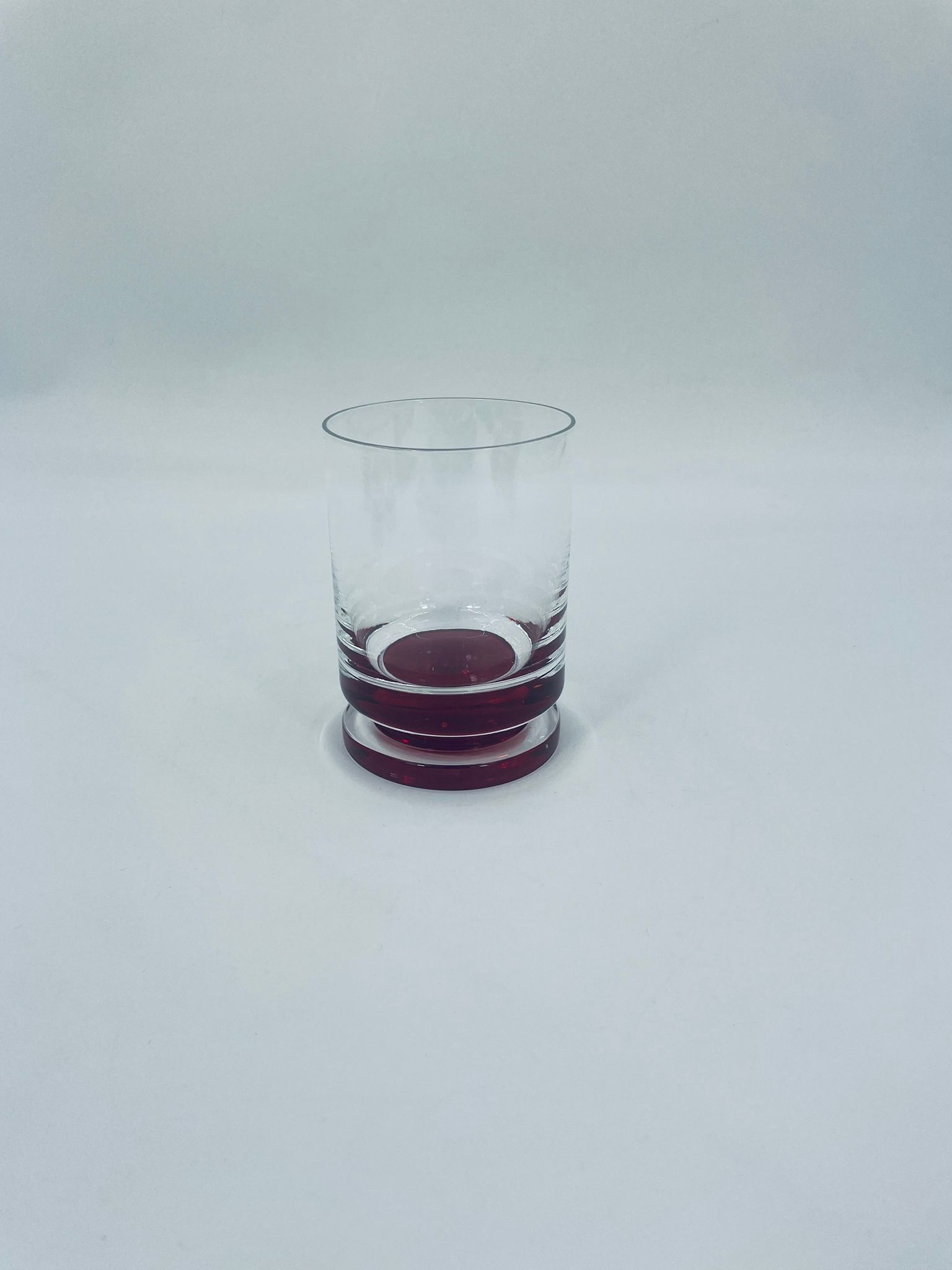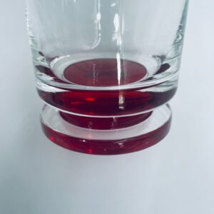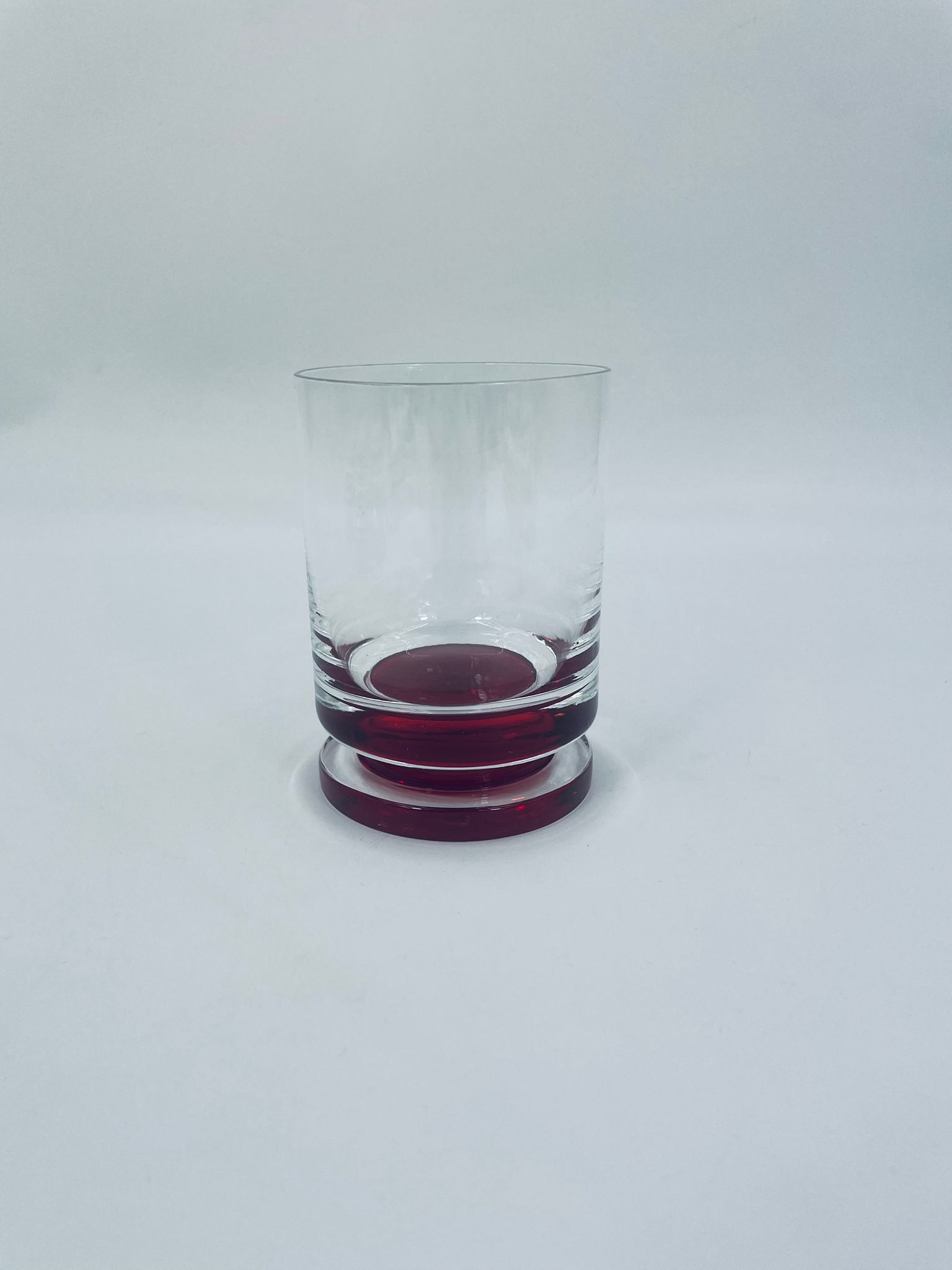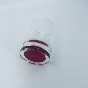 Szklanka typu Tumbler z serii Fritter Tumbler, wykonana z wysokiej jakości szkła kryształowego, borokrzemowego- trwałego. Szklaneczka jest przezroczysta z ozdobną, barwiona na kolor bordowy podstawą.
