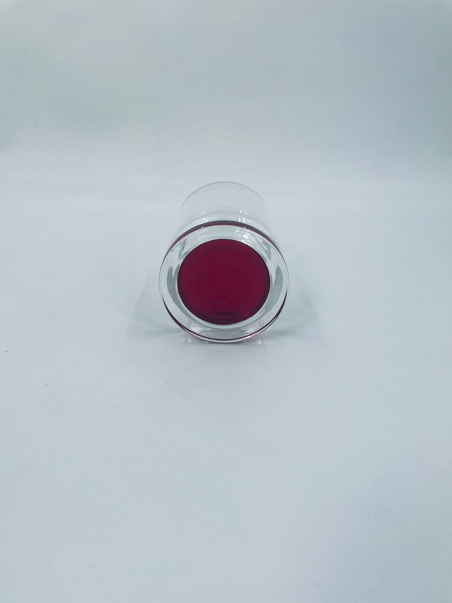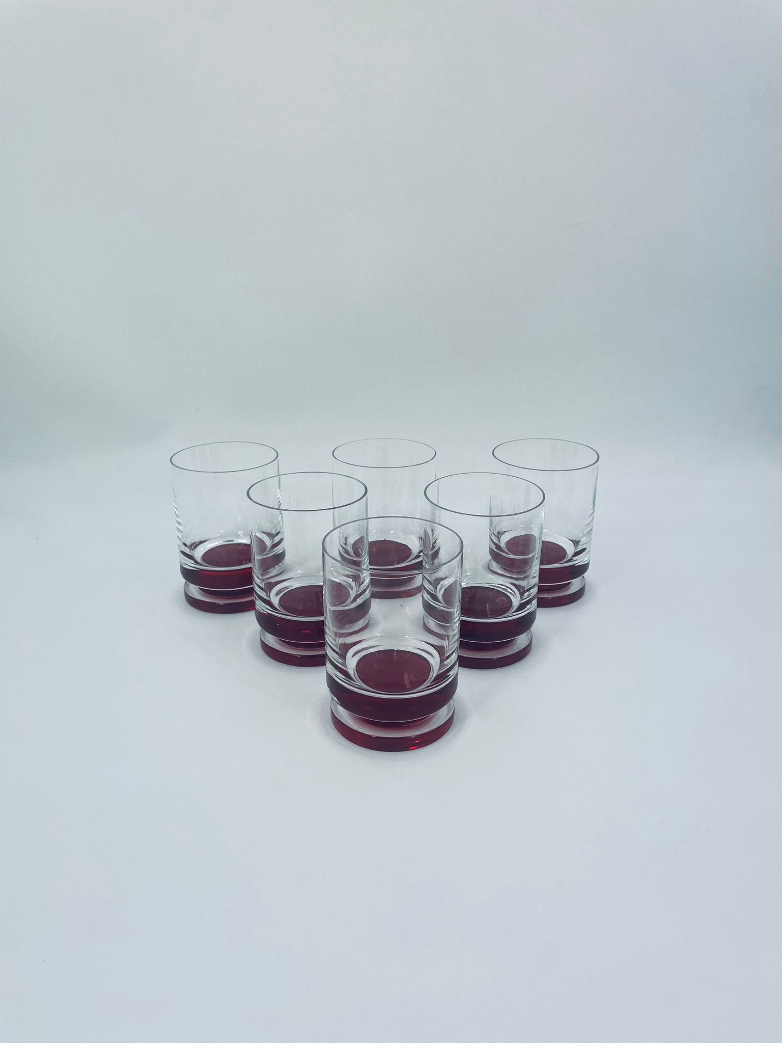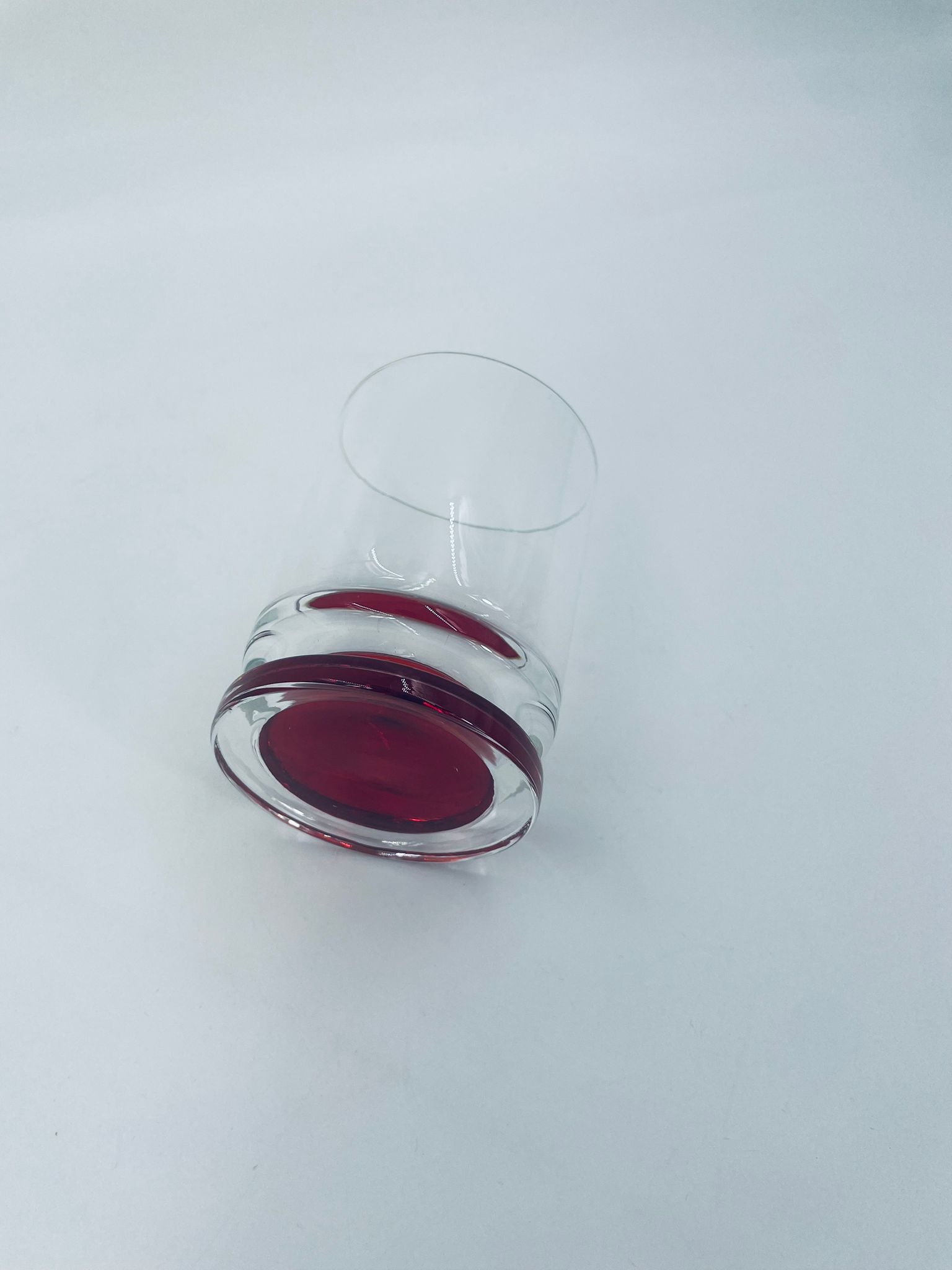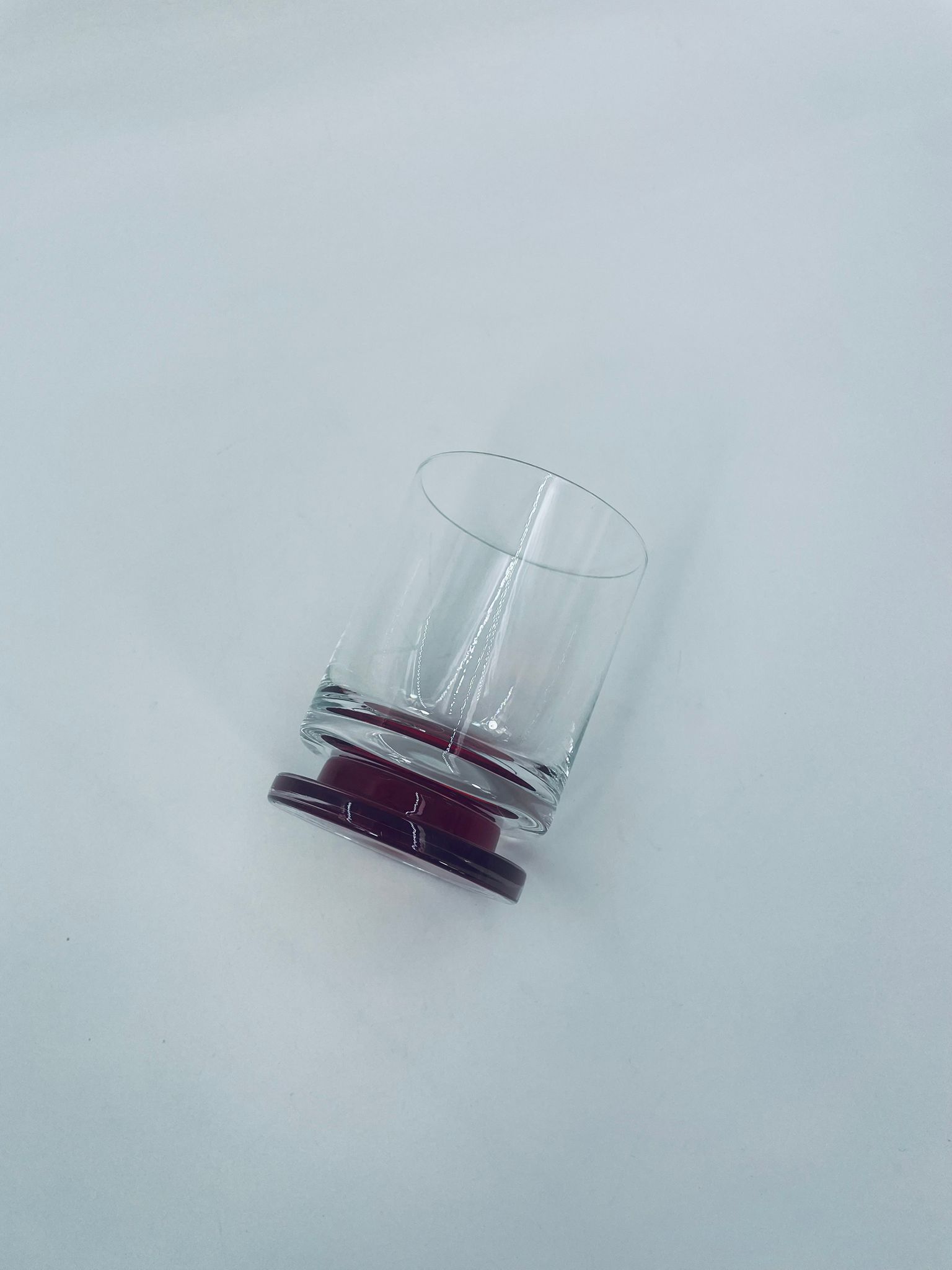 Szklanka typu Tumbler z serii Fritter Tumbler, wykonana z wysokiej jakości szkła kryształowego, borokrzemowego- trwałego. Szklaneczka jest przezroczysta z ozdobną, barwiona na kolor bordowy podstawą.