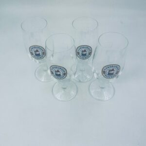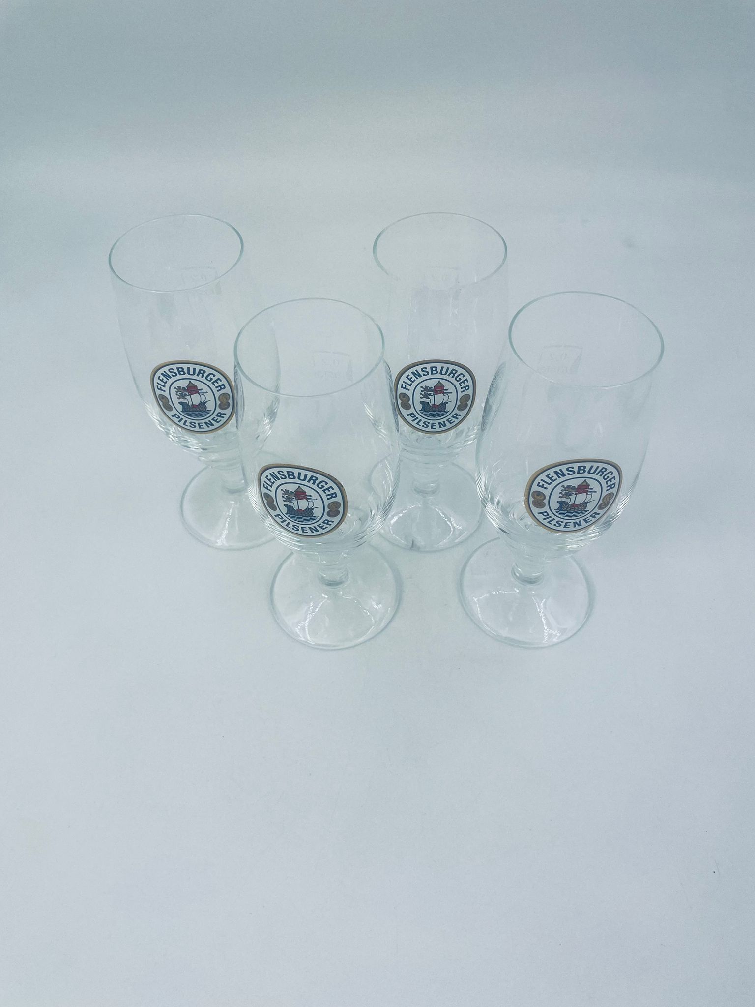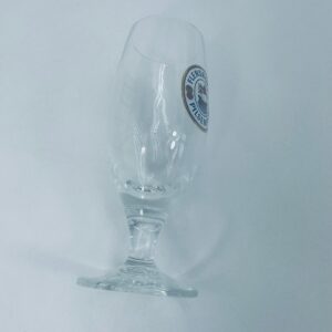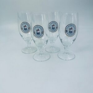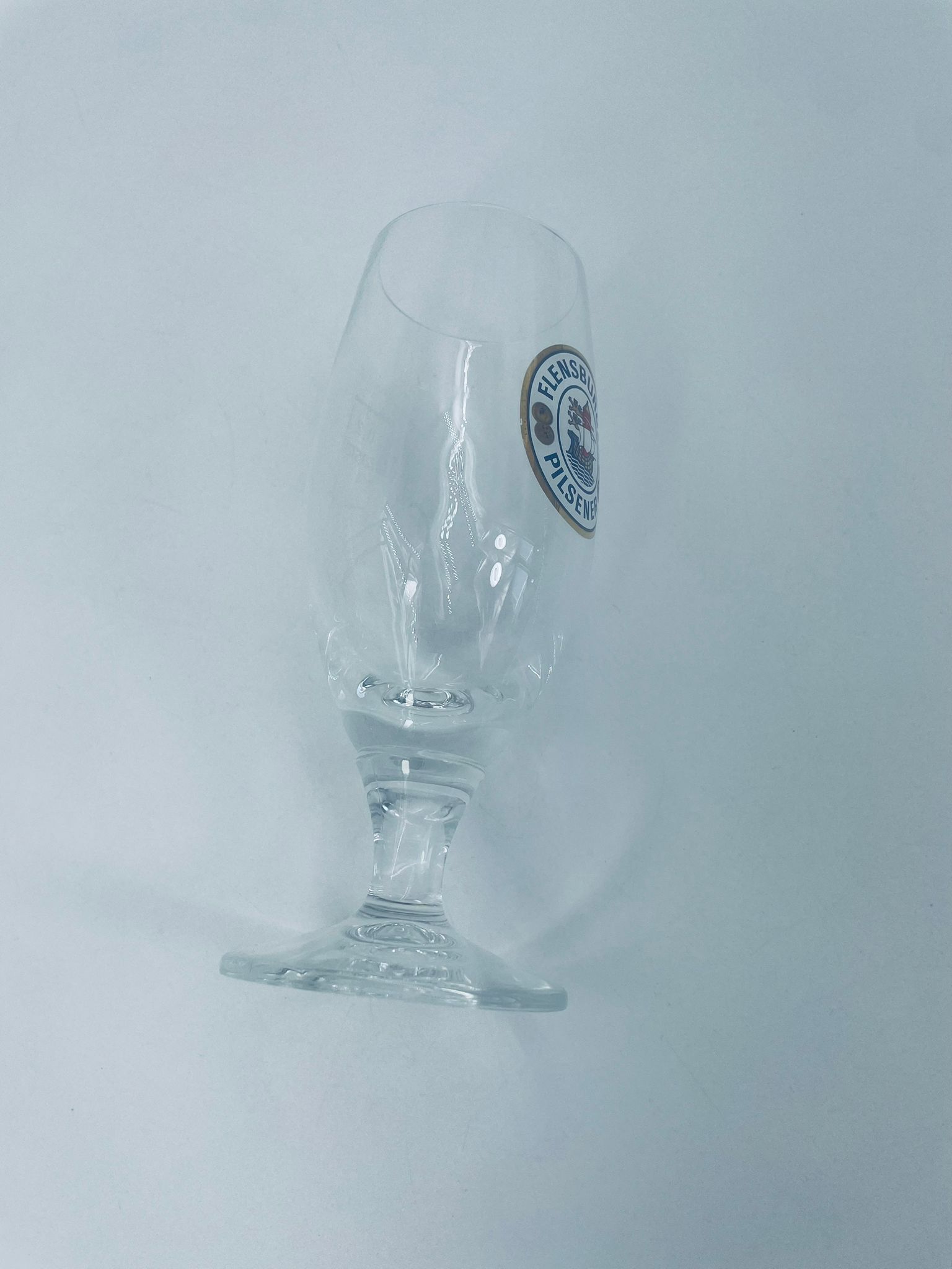 Szklanka,kufel do piwa wytwórni Flensburger Pilsener z przezroczystego szkła. Motywem przewodnim na szklance jest napis „Flensburger Pilsener” oraz rysunek statku. Kufel ma uszczerbek na podstawie.