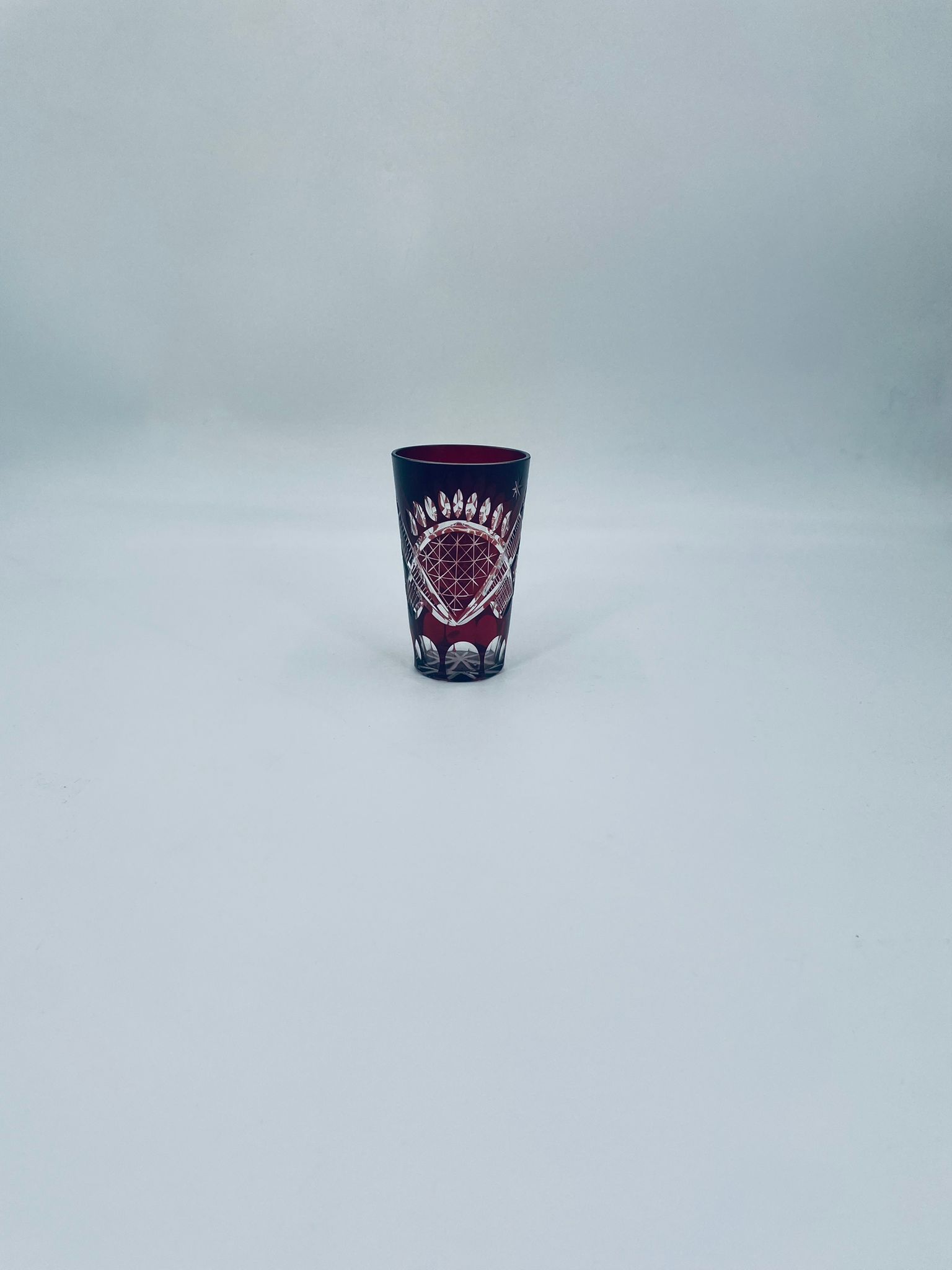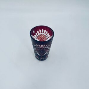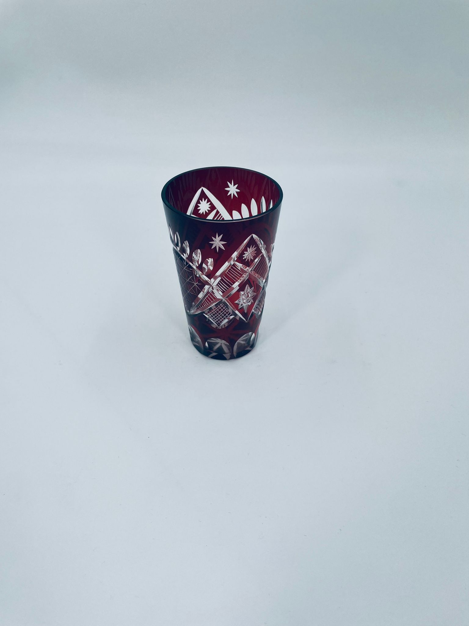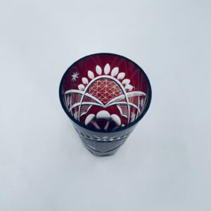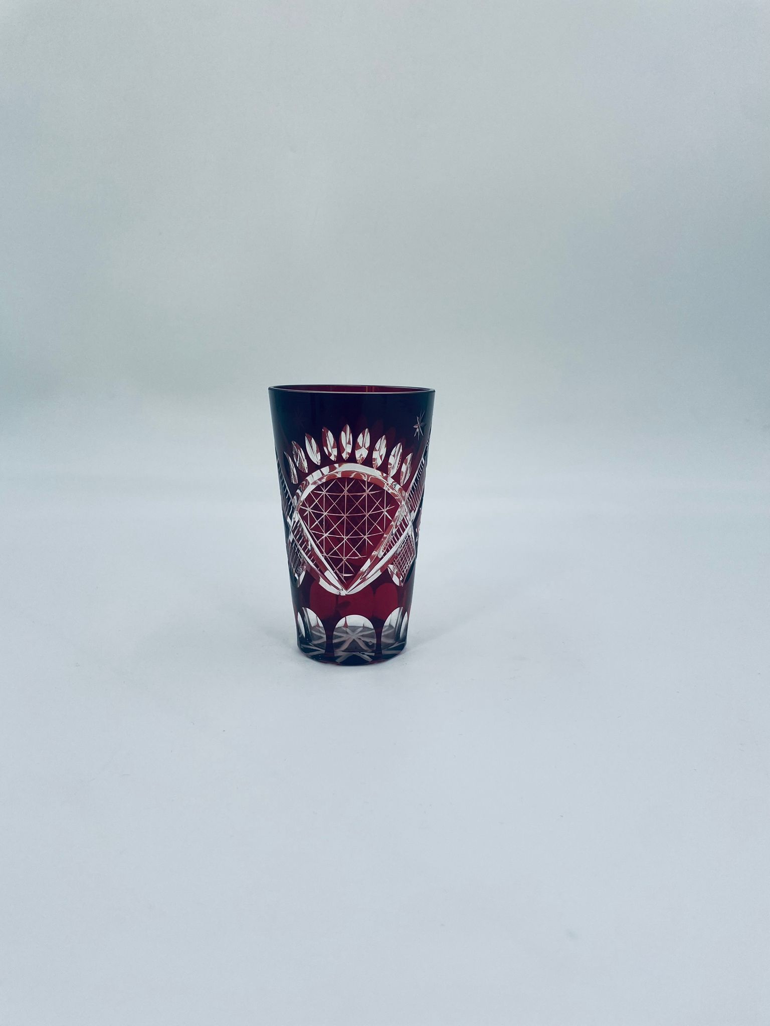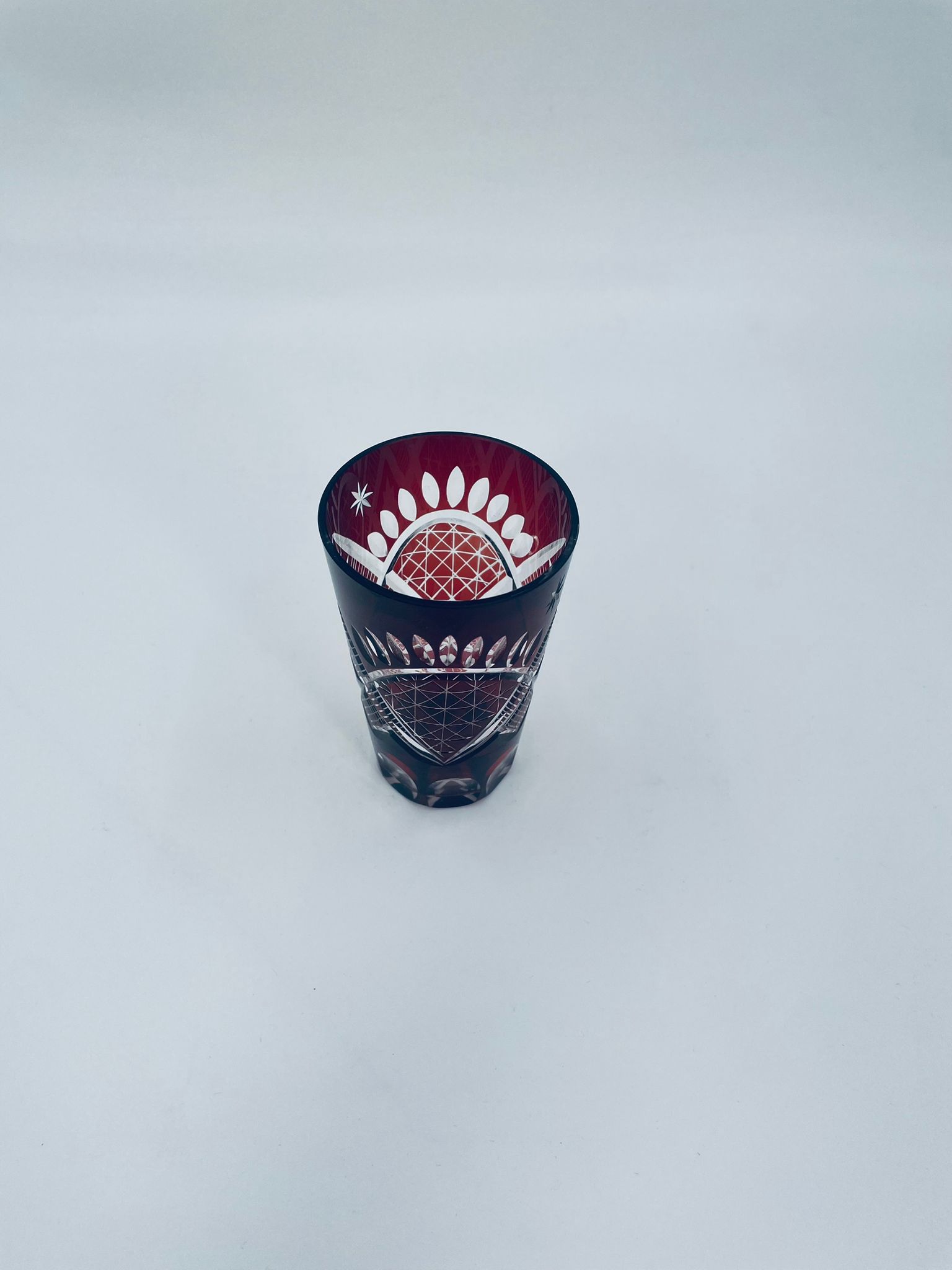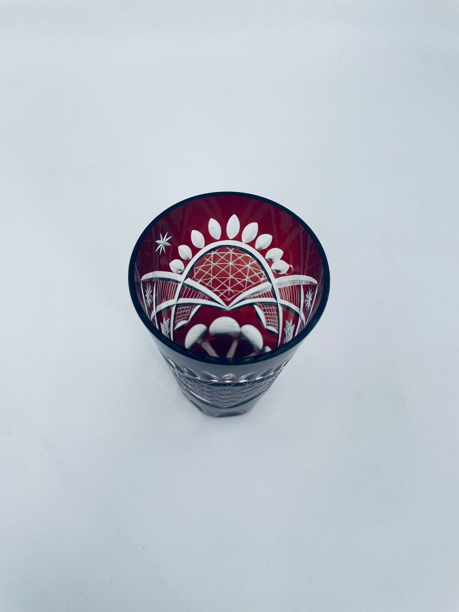 Szklanka Vintage Ruby z lat 60tych XXw., wykonana z wysokiej jakości szkła kryształowego, robiona techniką „cut-to-Clear”, w której czerwone szkło jest trawione, alby odsłonić piękny, ozdobny wzór geometryczny.