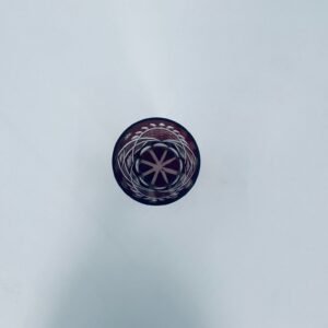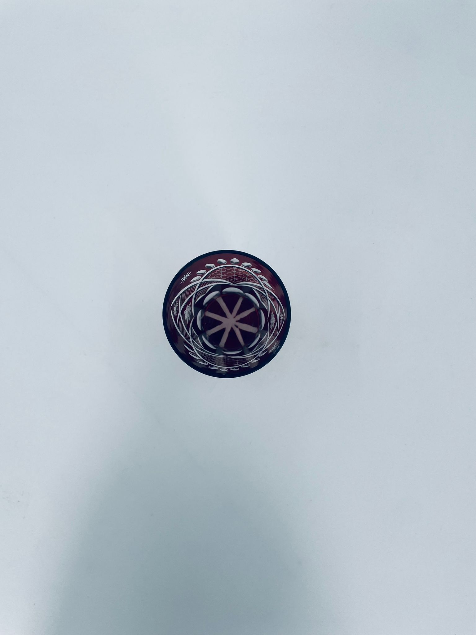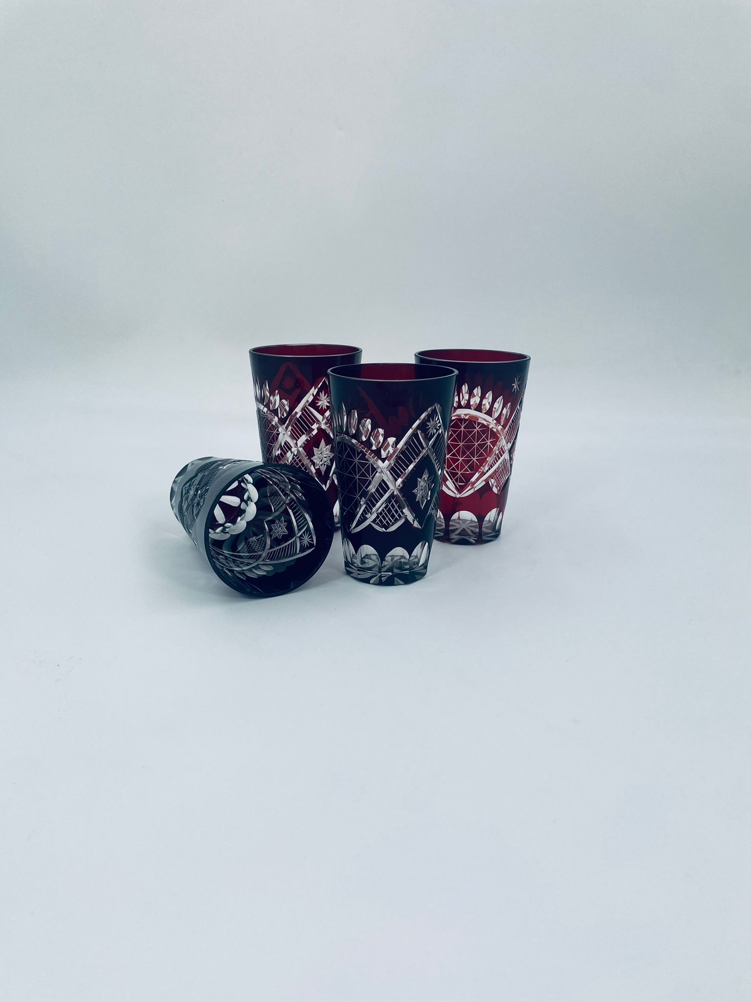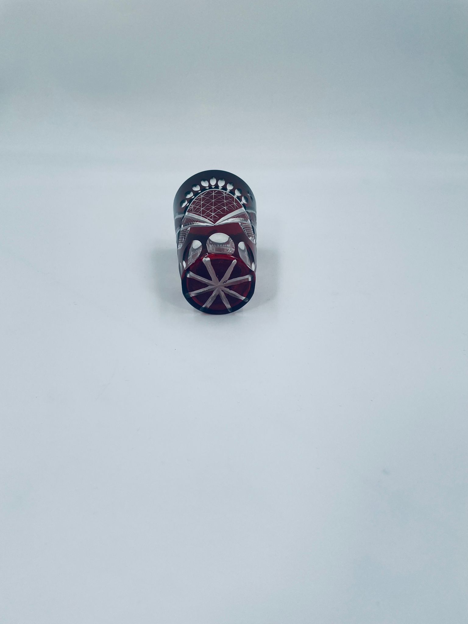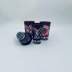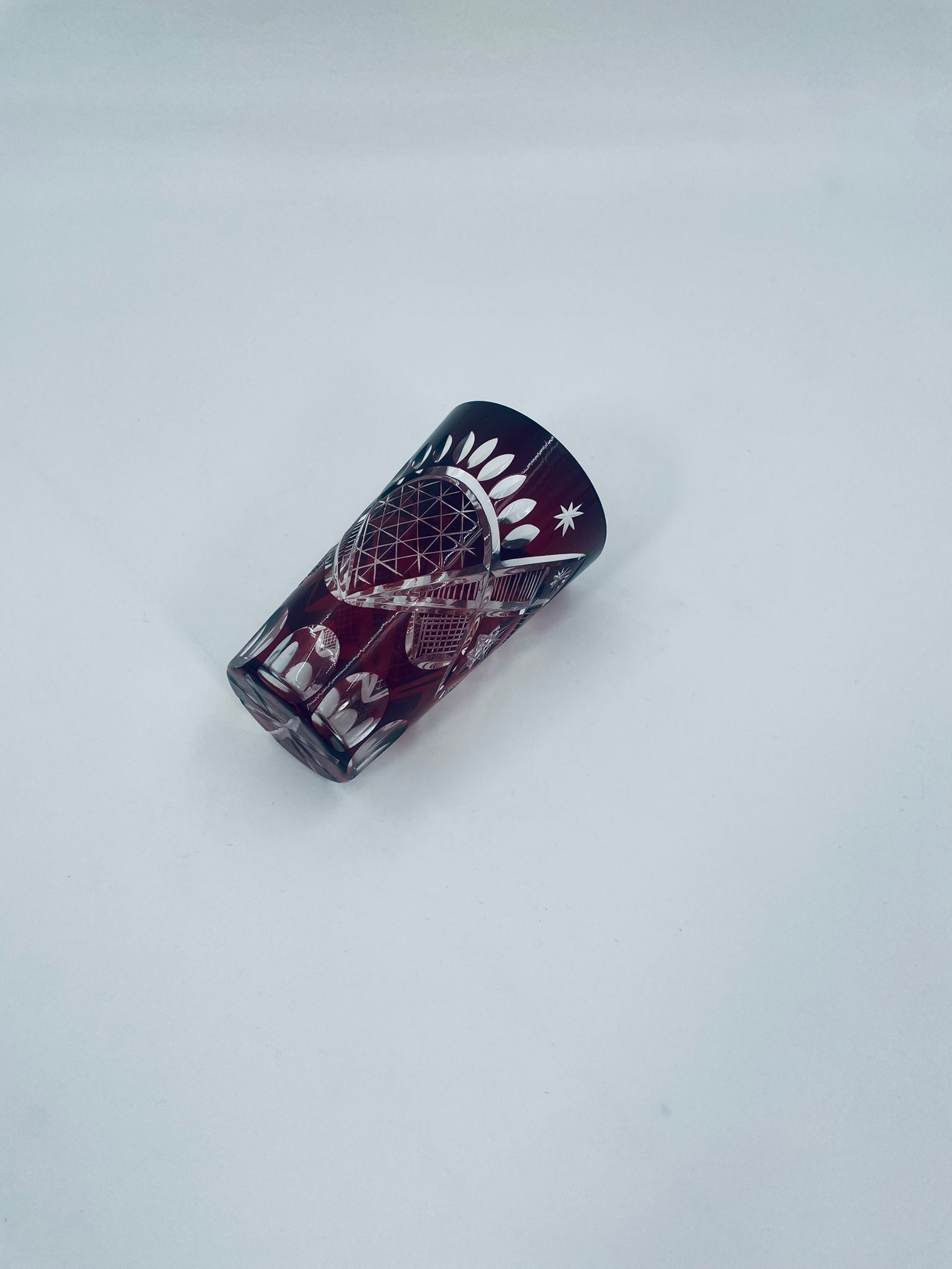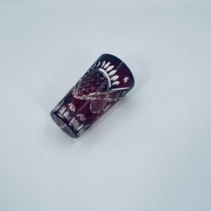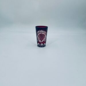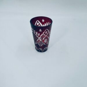 Szklanka Vintage Ruby z lat 60tych XXw., wykonana z wysokiej jakości szkła kryształowego, robiona techniką „cut-to-Clear”, w której czerwone szkło jest trawione, alby odsłonić piękny, ozdobny wzór geometryczny.