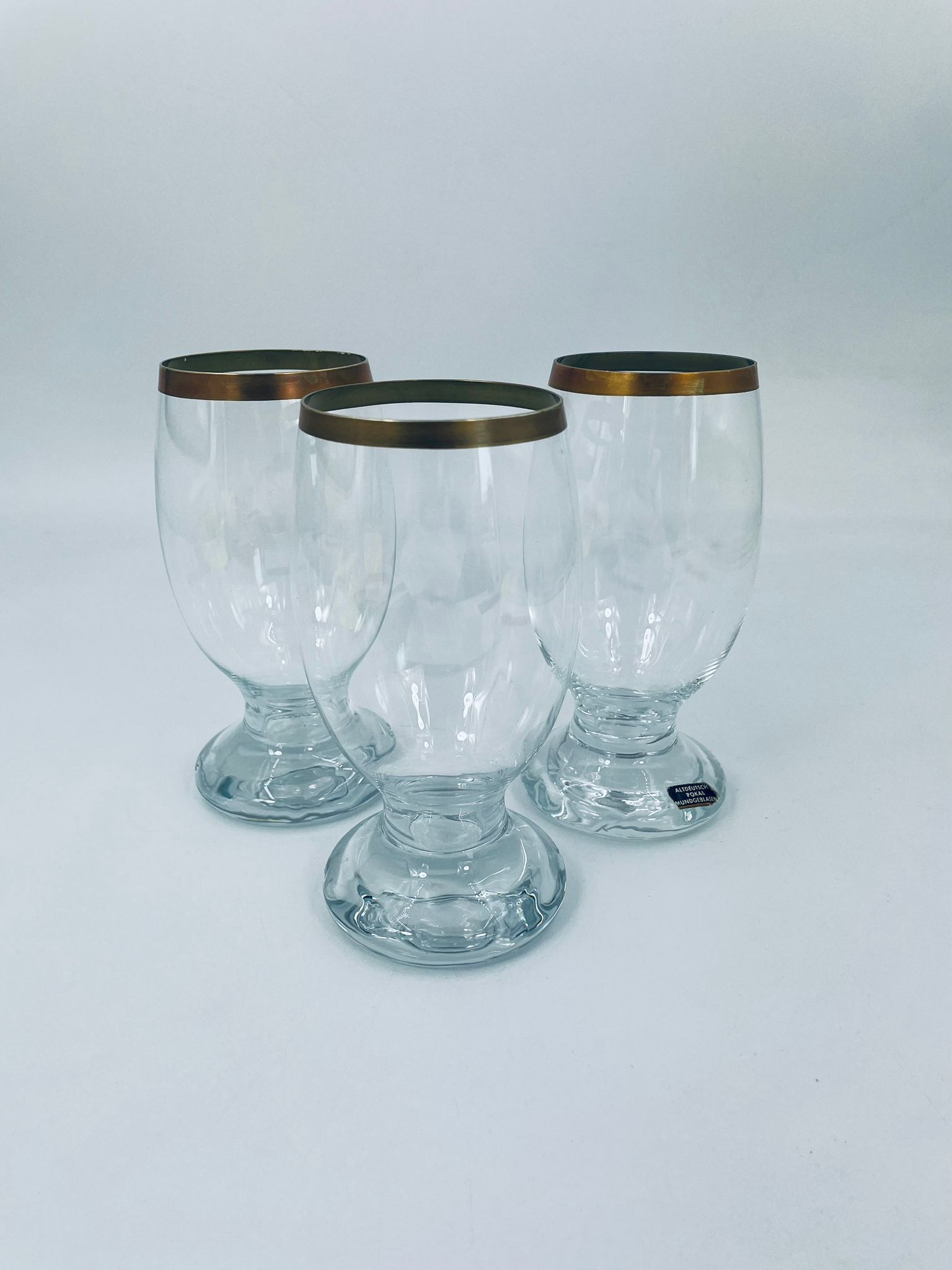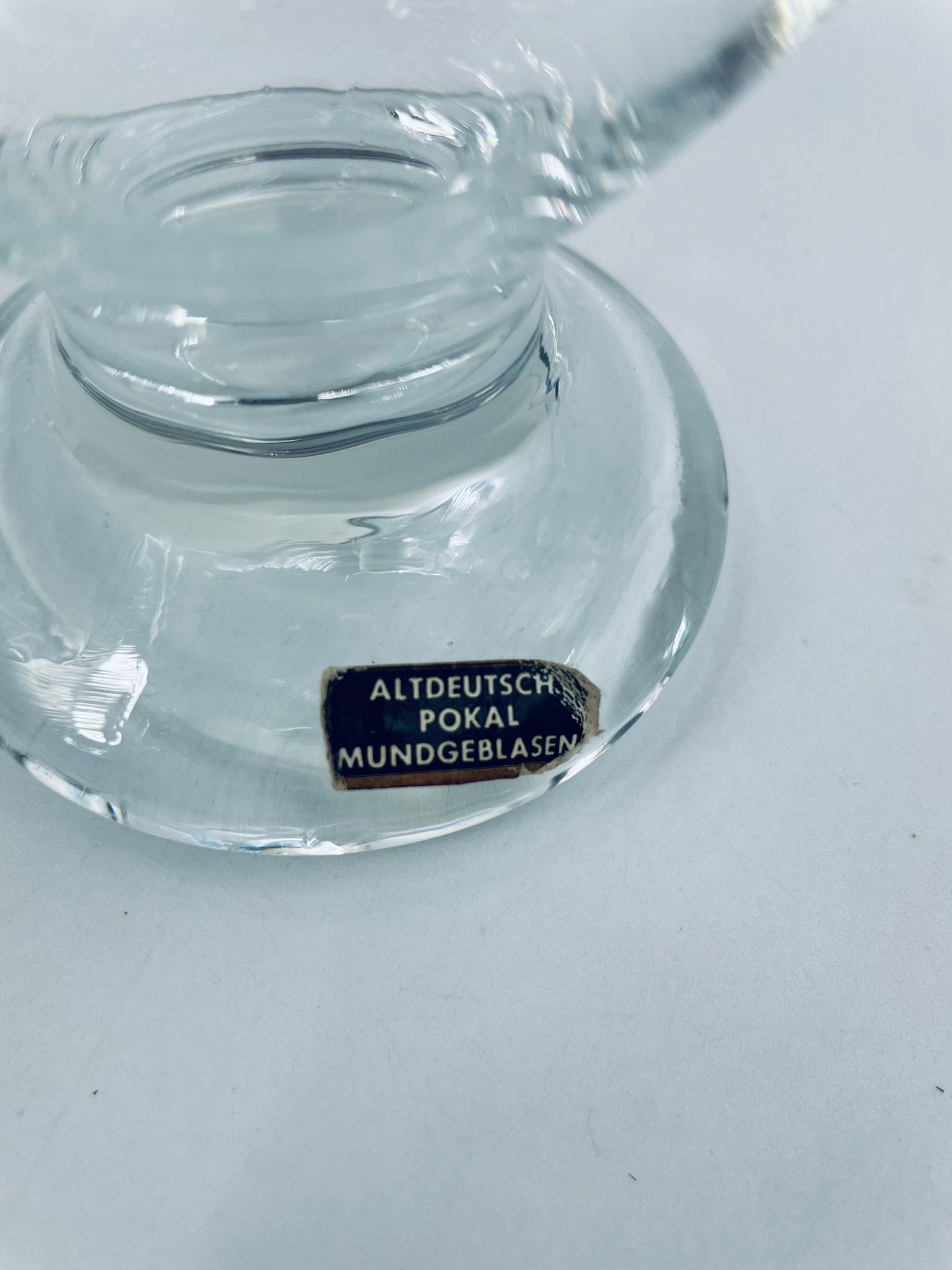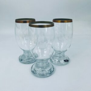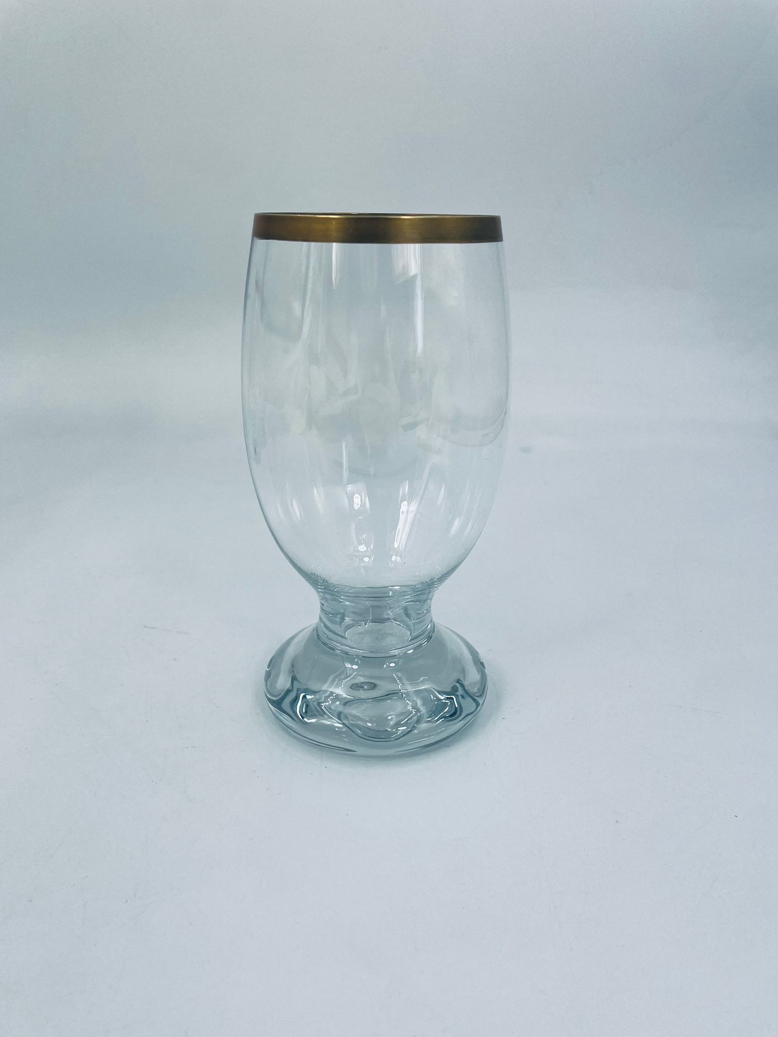 Szklany Niemiecki kielich/ kufel do piwa. Szkło dmuchane, bezbarwne, wykończone złoceniami na górnym rancie.