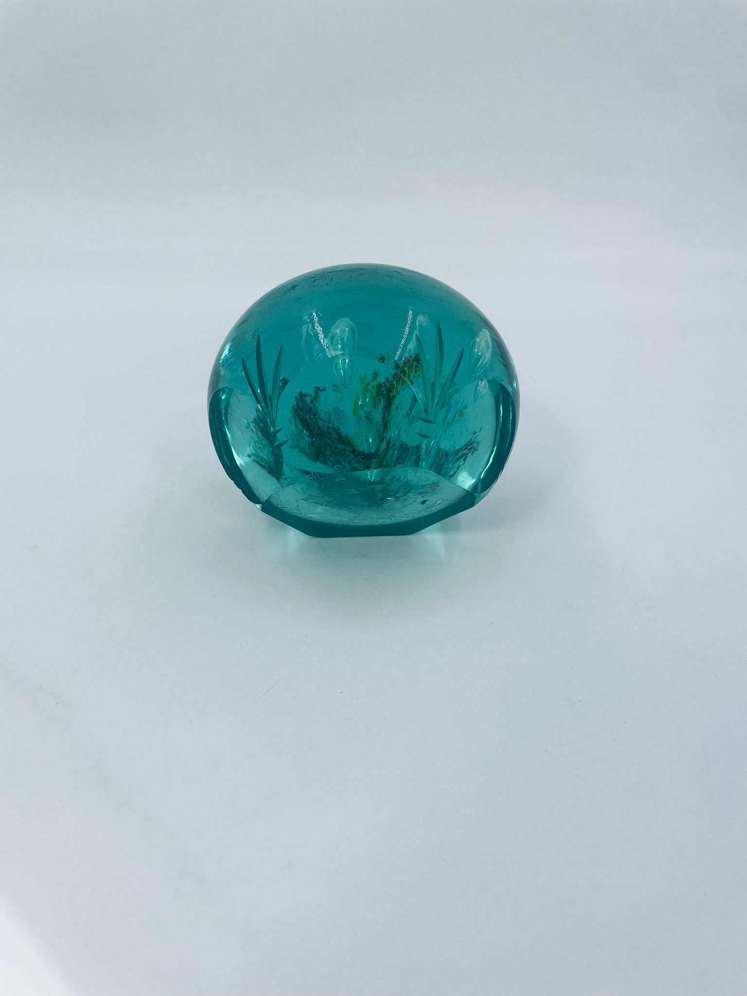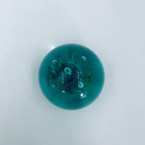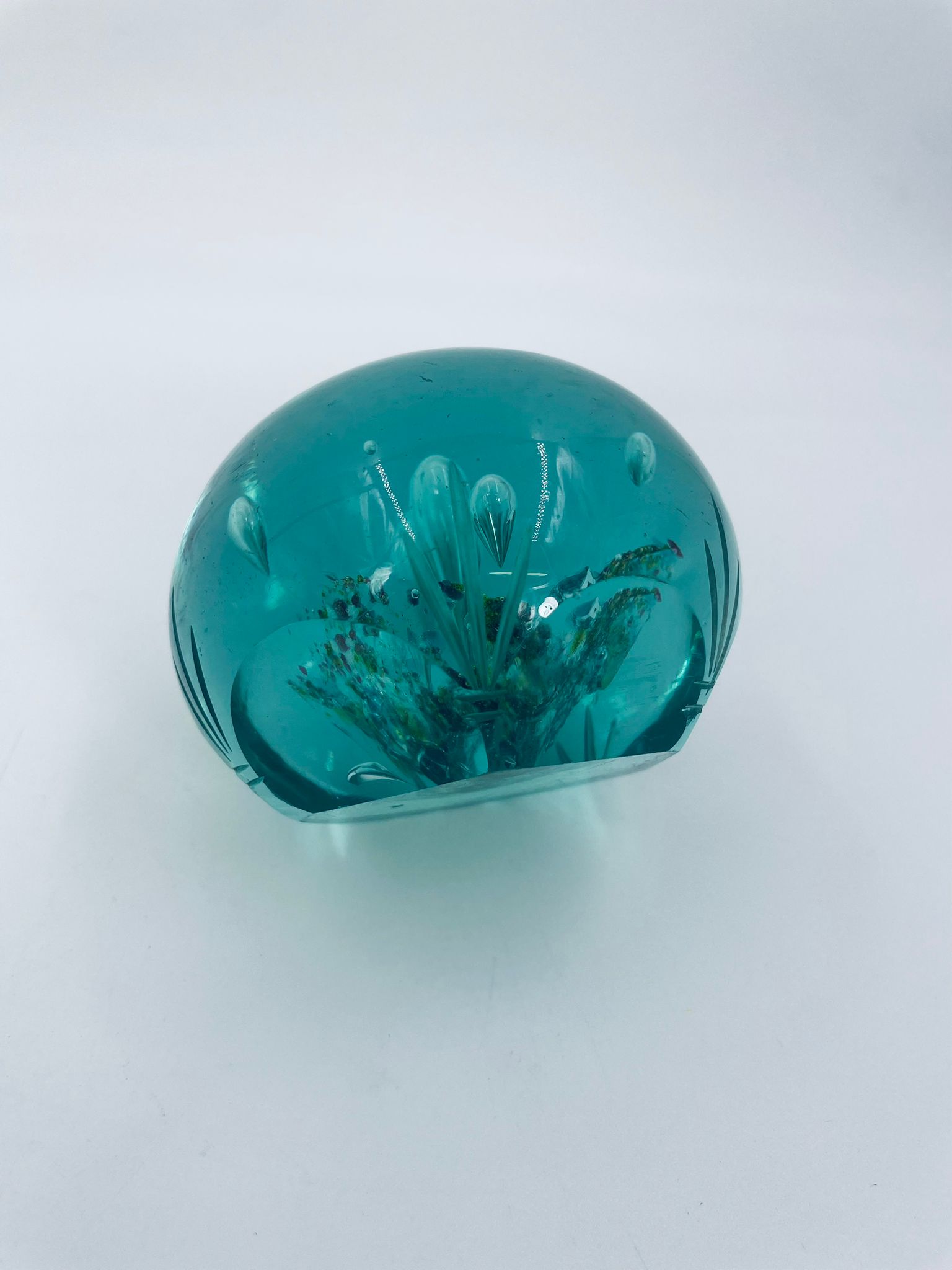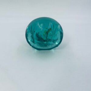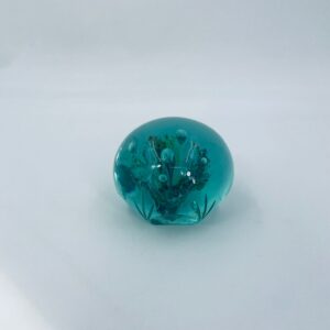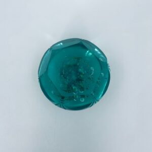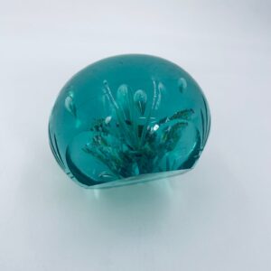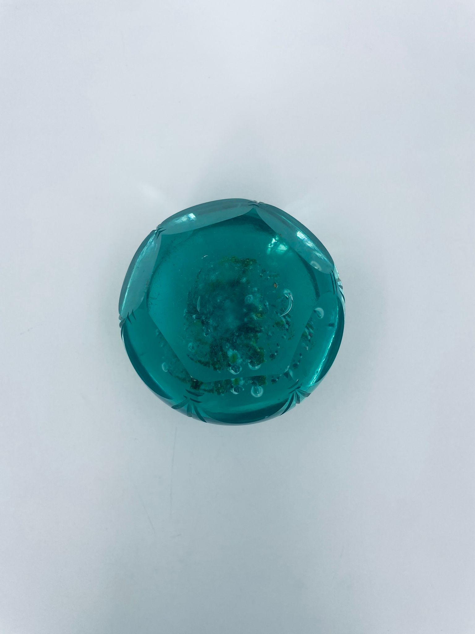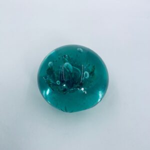 Przycisk do papieru w stylu Vintage, wykonany ze szkła, barwiony w kolorze turkusowym. Wewnątrz przycisku zatopiony jest element przypominający kwiata oraz bąbelki. Na krawędzi przycisku są szlifowane wzory.