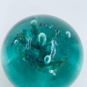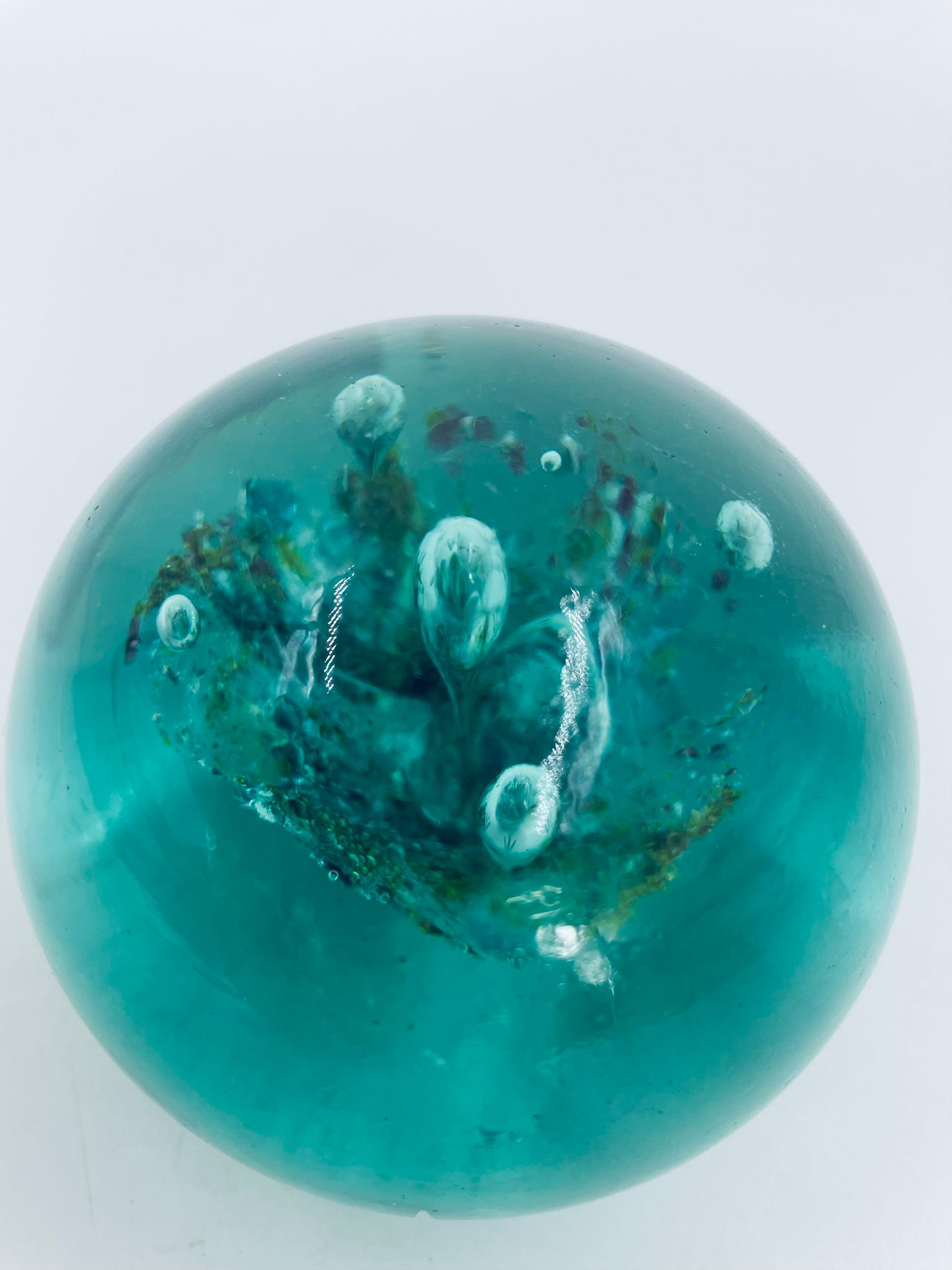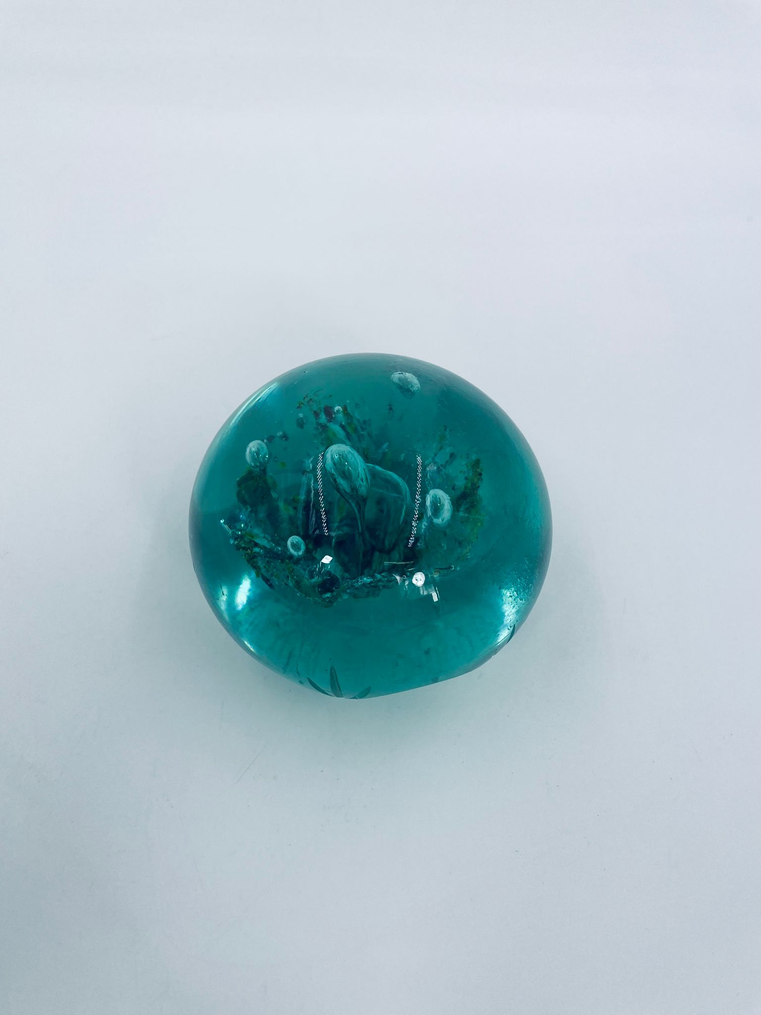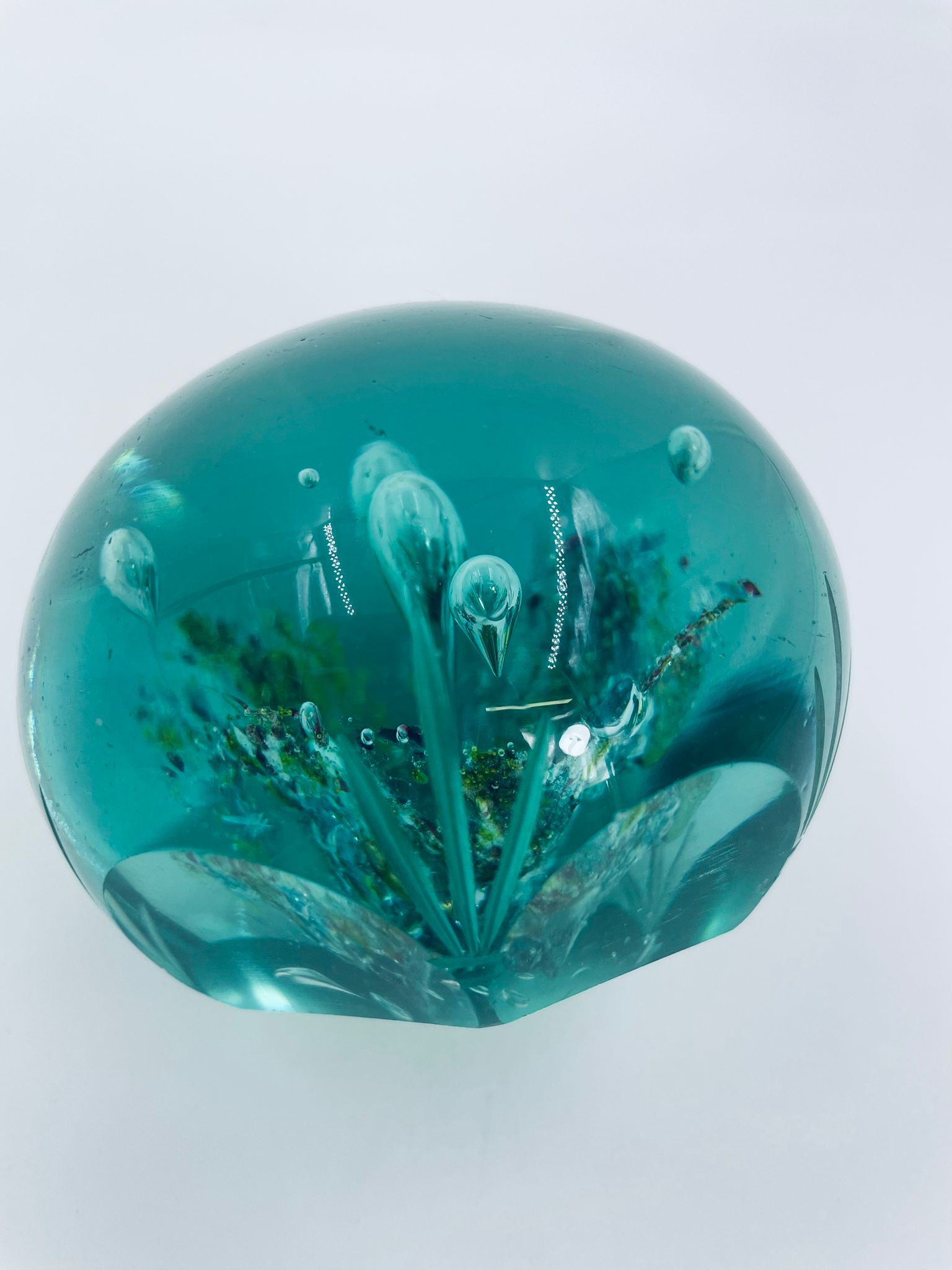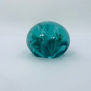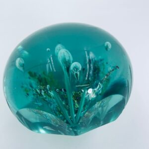 Przycisk do papieru w stylu Vintage, wykonany ze szkła, barwiony w kolorze turkusowym. Wewnątrz przycisku zatopiony jest element przypominający kwiata oraz bąbelki. Na krawędzi przycisku są szlifowane wzory.