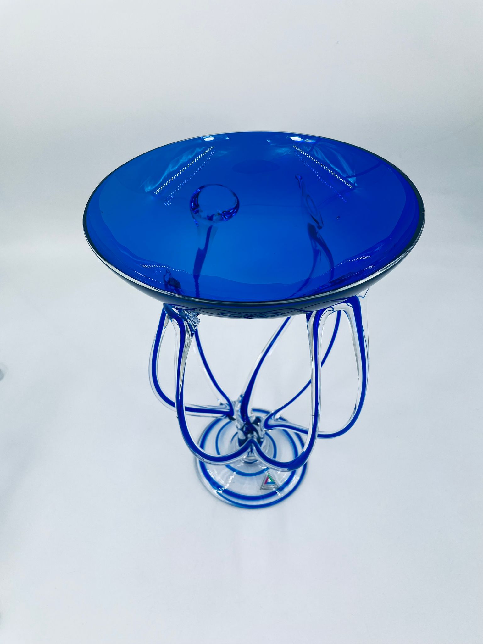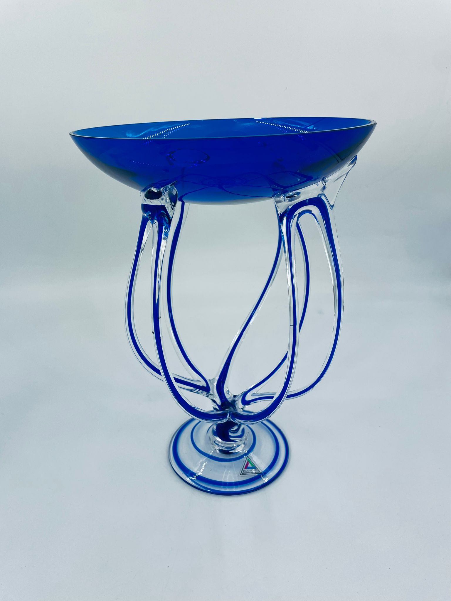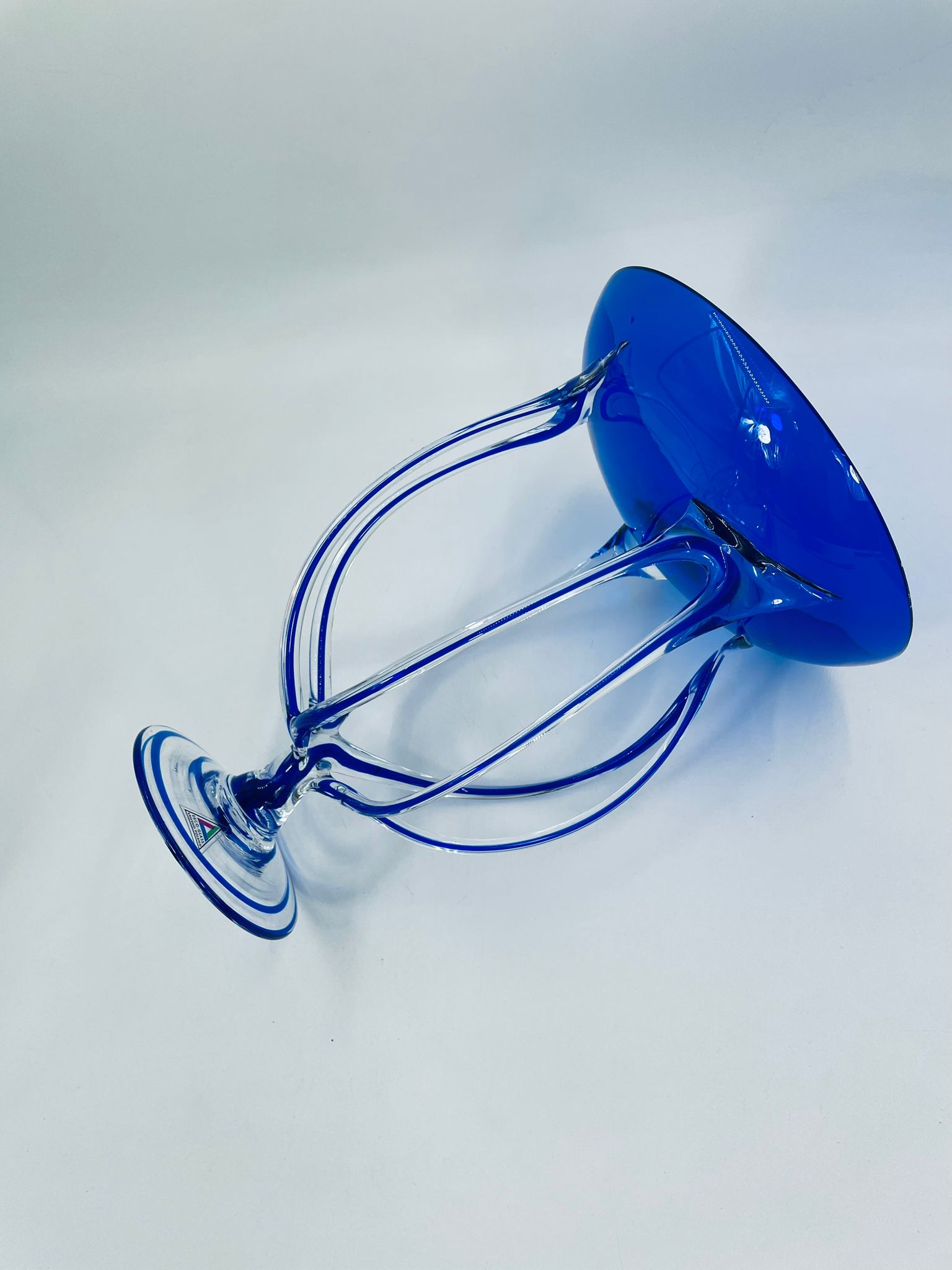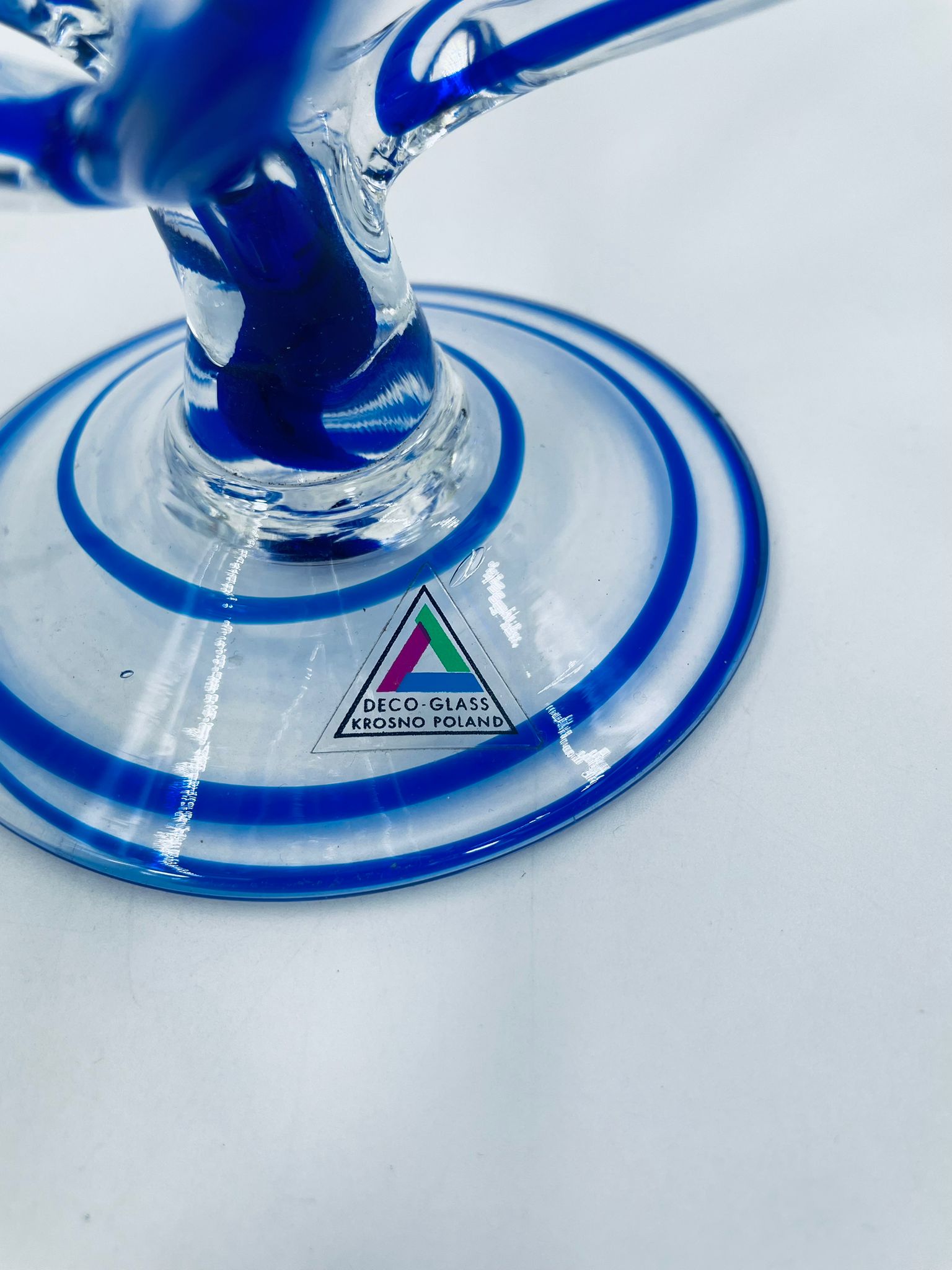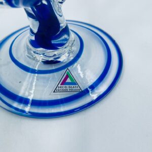 Wazon-świecznik krosno poland w stylu Vintage. Szkło artystyczne w kolorze granatowym z subtelnymi przejściami w kolorze bezbarwnym na wyjątkowych i eleganckich stopkach. Wazon ręcznie dmuchany, jest nie tylko funkcjonalnym elementem dekoracyjnym, ale również jest wyjątkowym dziełem sztuki szklarskiej.