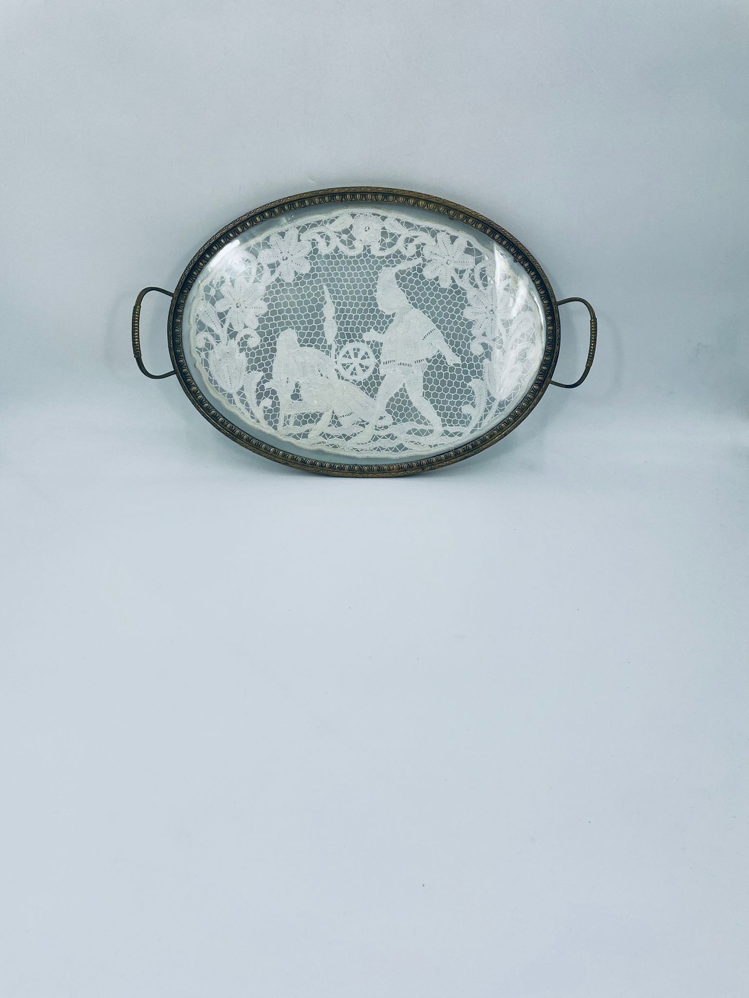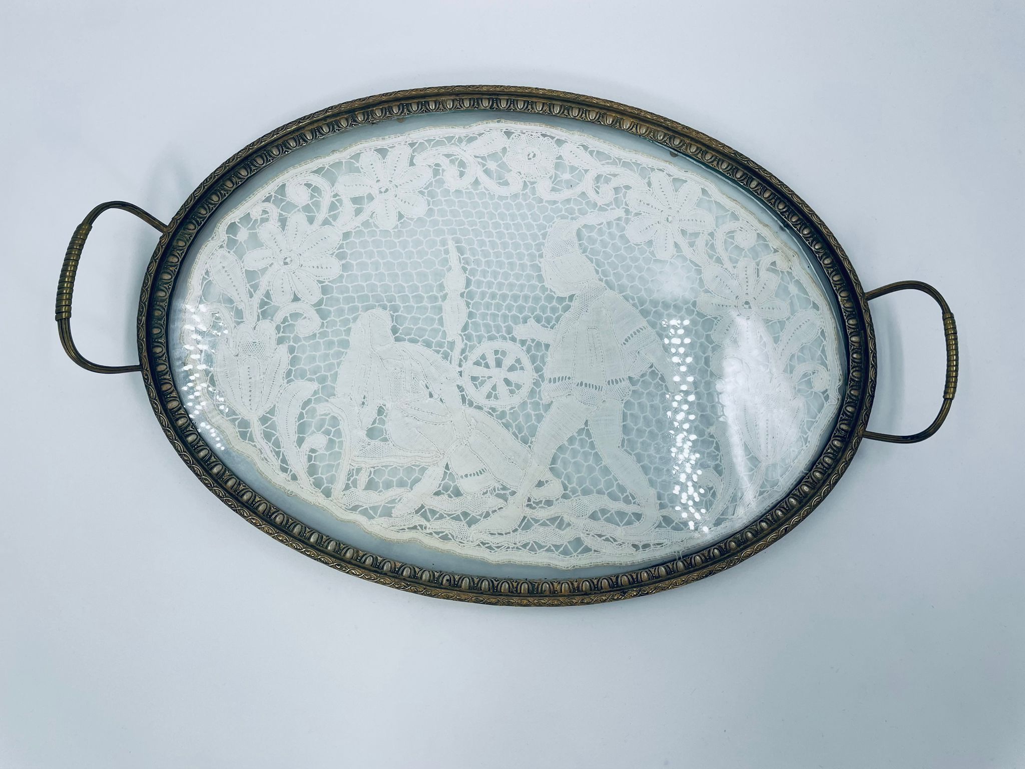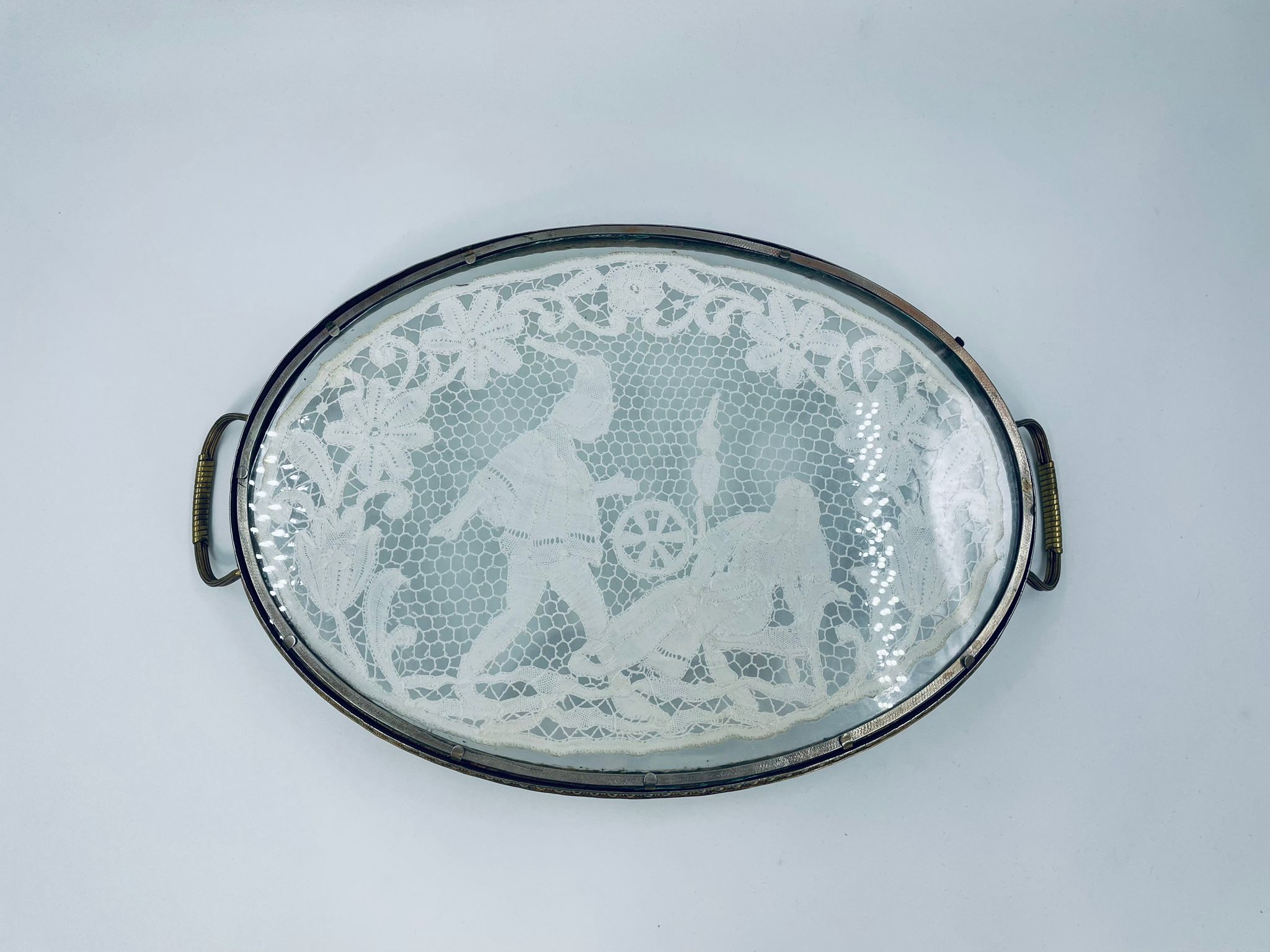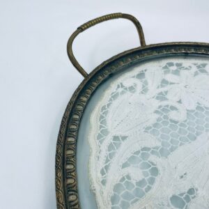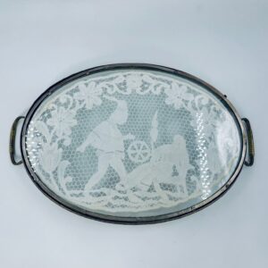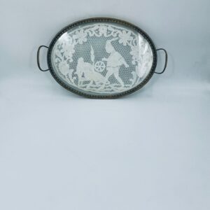 Taca toaletowa antyczna, wiktoriańska. Taca ma owalny kształt z metalowym obramowaniem i uchwytami, szklana powierzchnia oraz koronkowa wkładką w środku przedstawiającą scenę z postaciami oraz elementami roślinnymi.