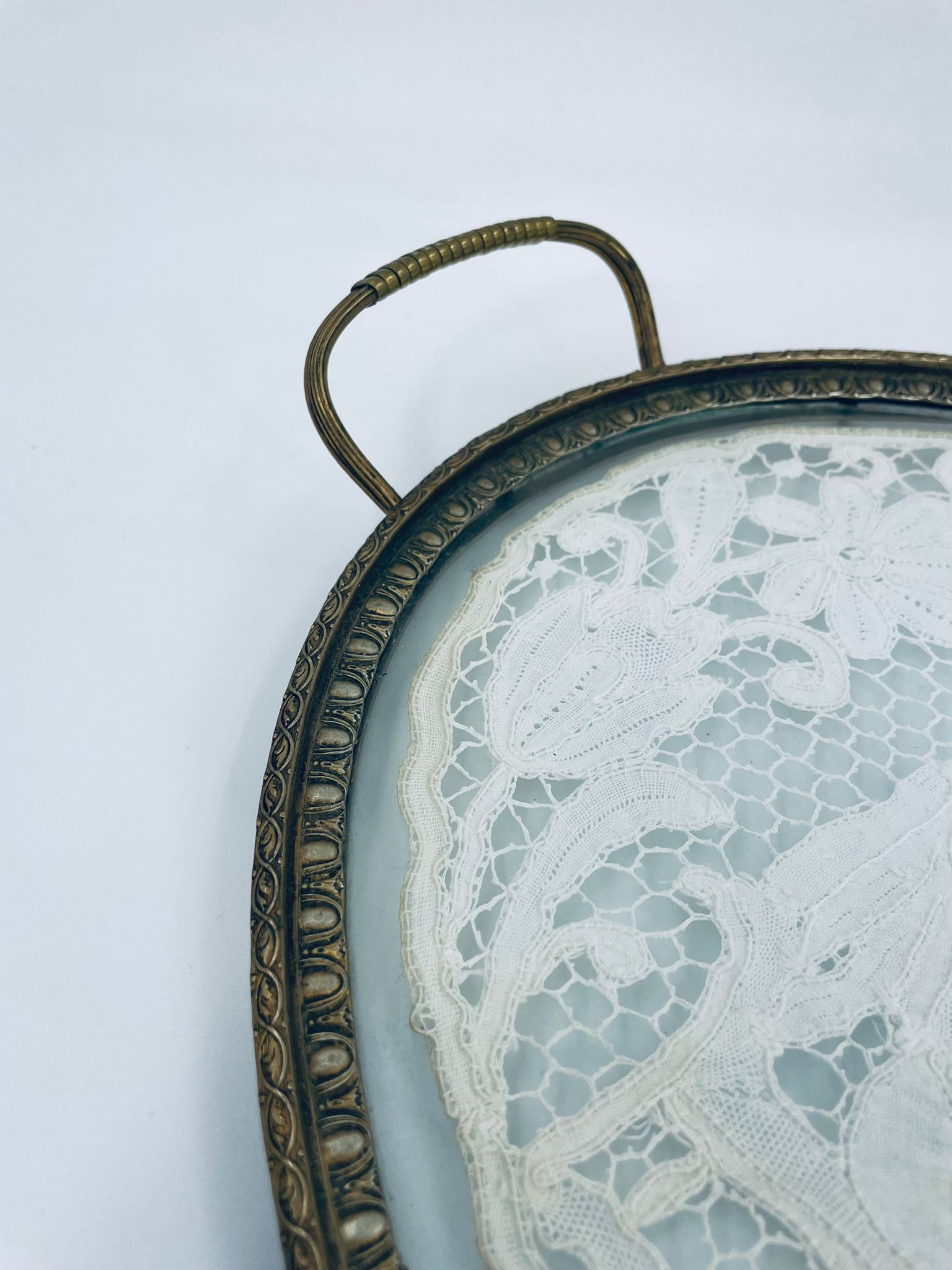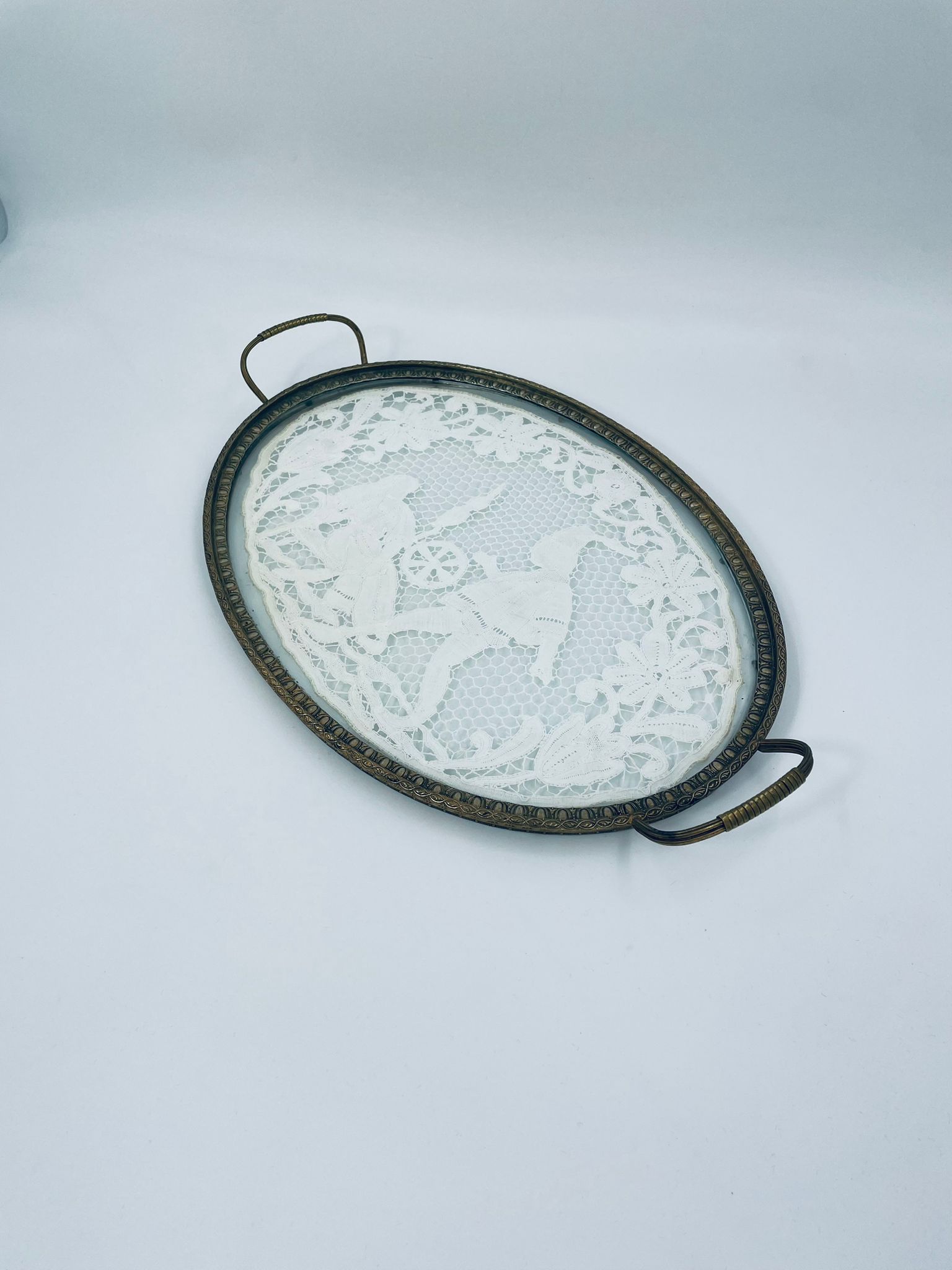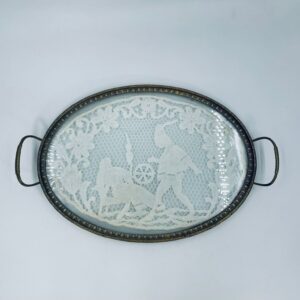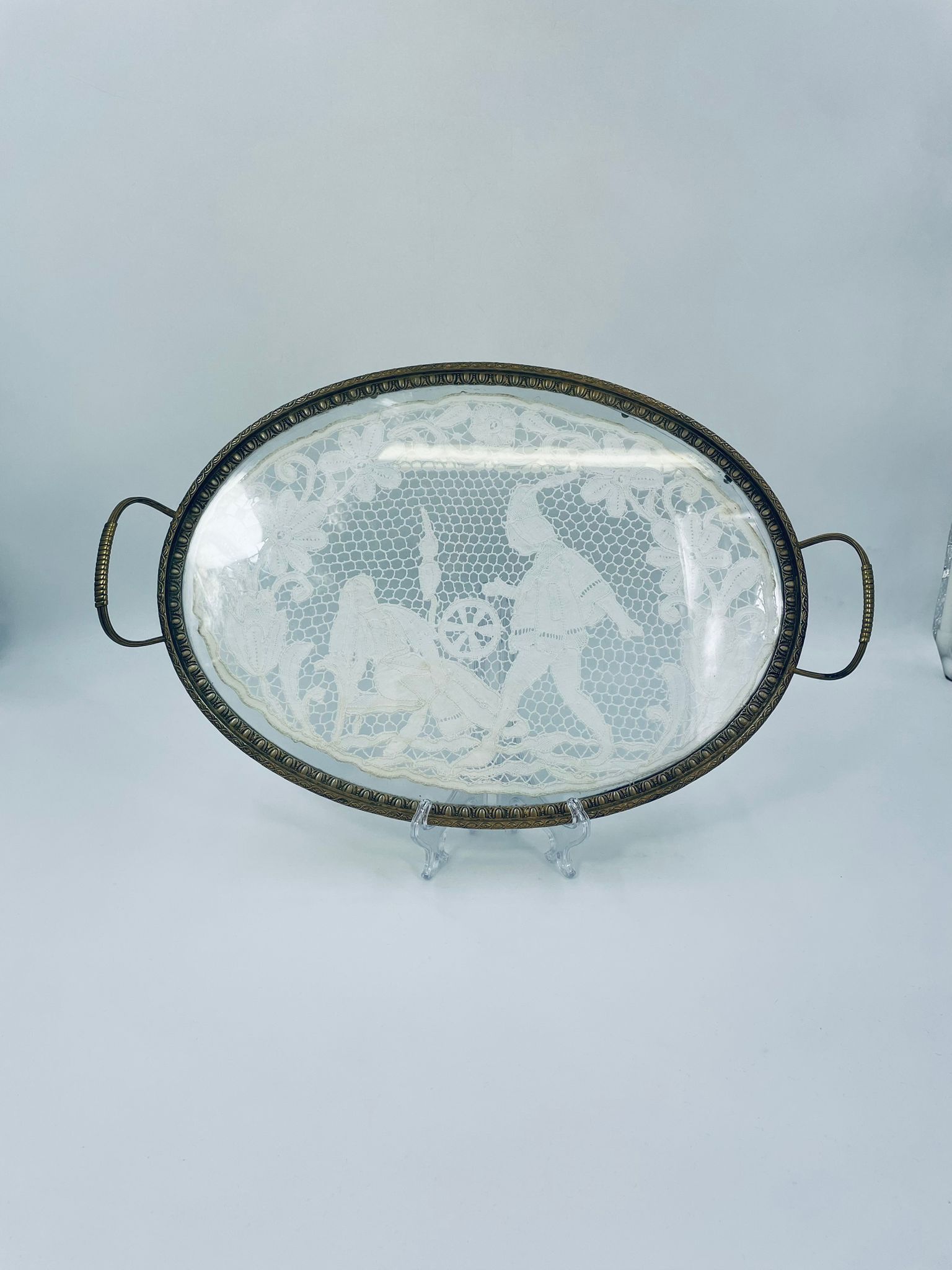 Taca toaletowa antyczna, wiktoriańska. Taca ma owalny kształt z metalowym obramowaniem i uchwytami, szklana powierzchnia oraz koronkowa wkładką w środku przedstawiającą scenę z postaciami oraz elementami roślinnymi.
