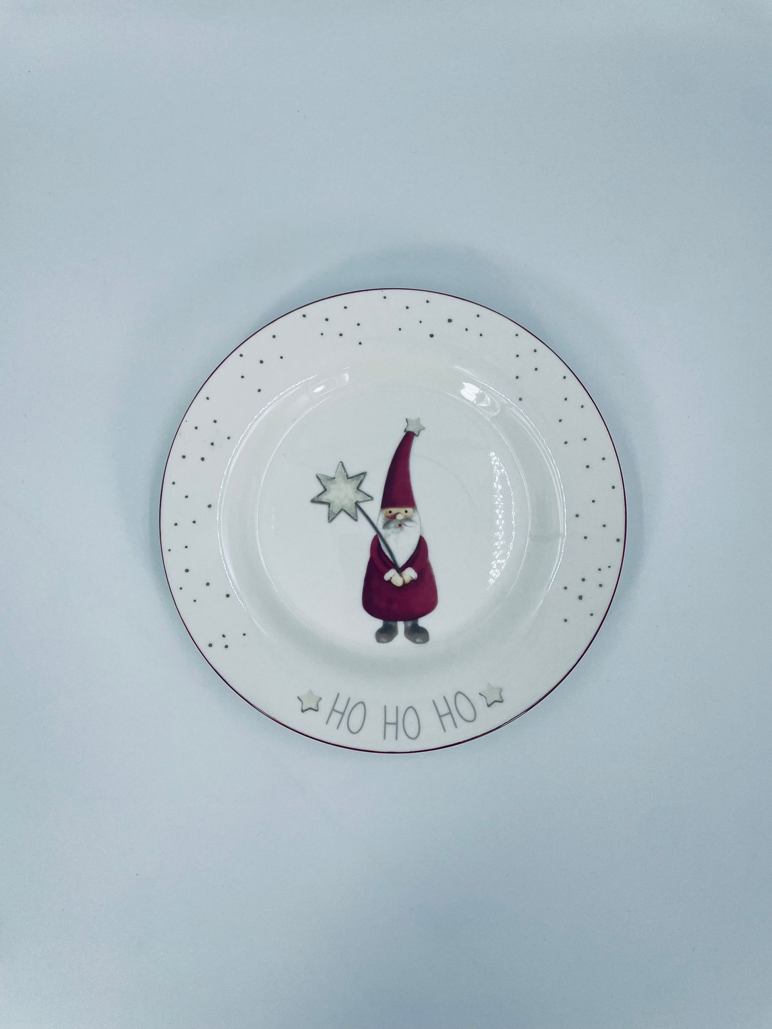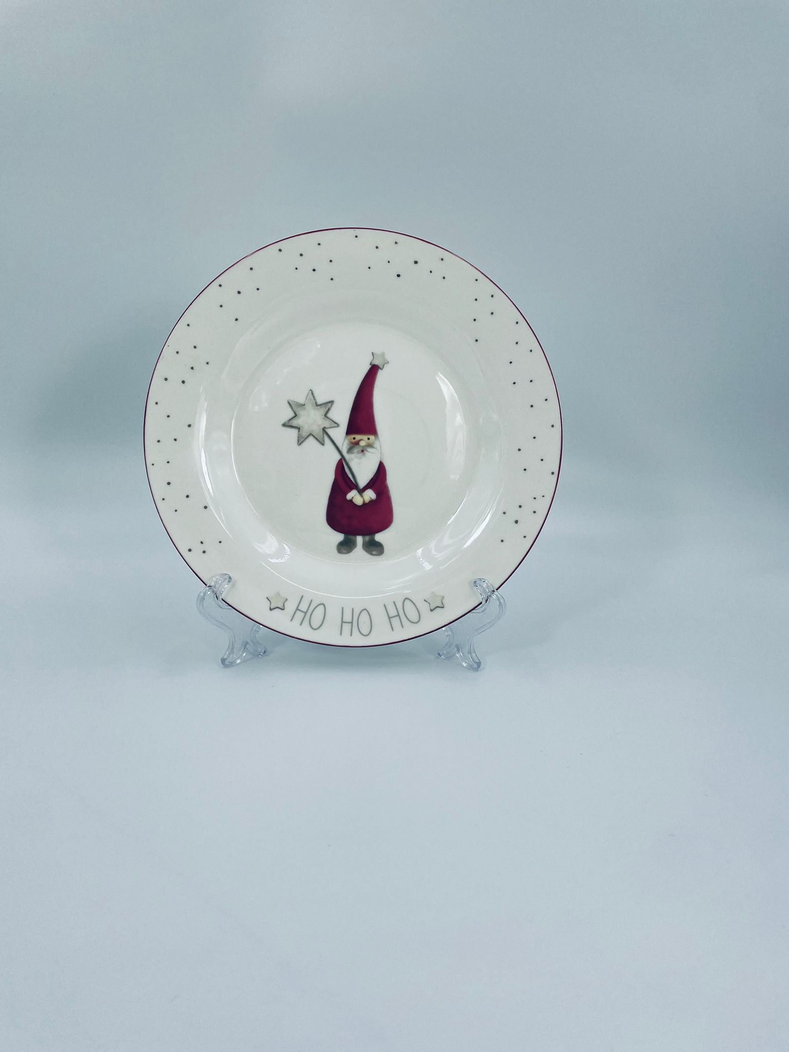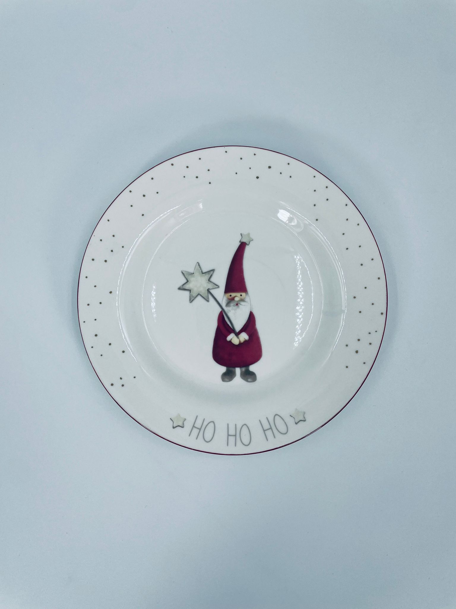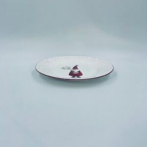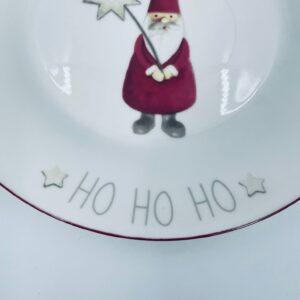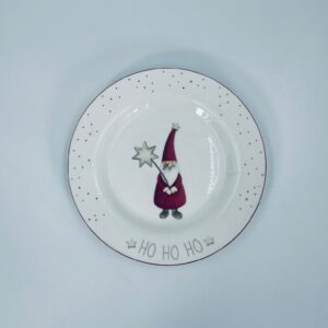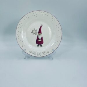 Talerz dekoracyjny, deserowy marki Depot, wykonany z bialej porcelany. Talerz ozdobiony wzorem małego krasnala w czerwonym stroju, trzymającego gwiazdę, napisem HO HO HO , ze złotymi akcentami kropek , wykończony czerwoną obwódką na rancie.