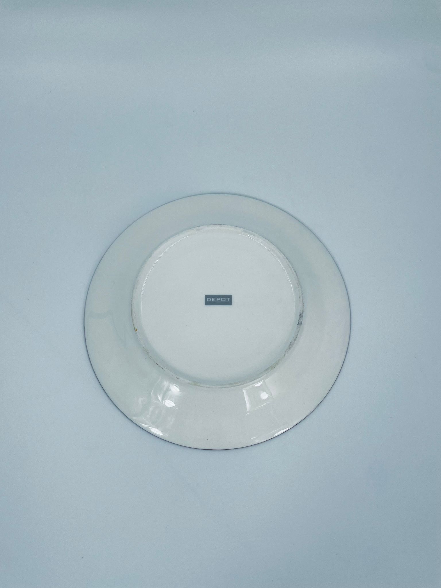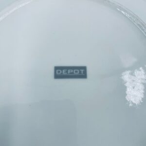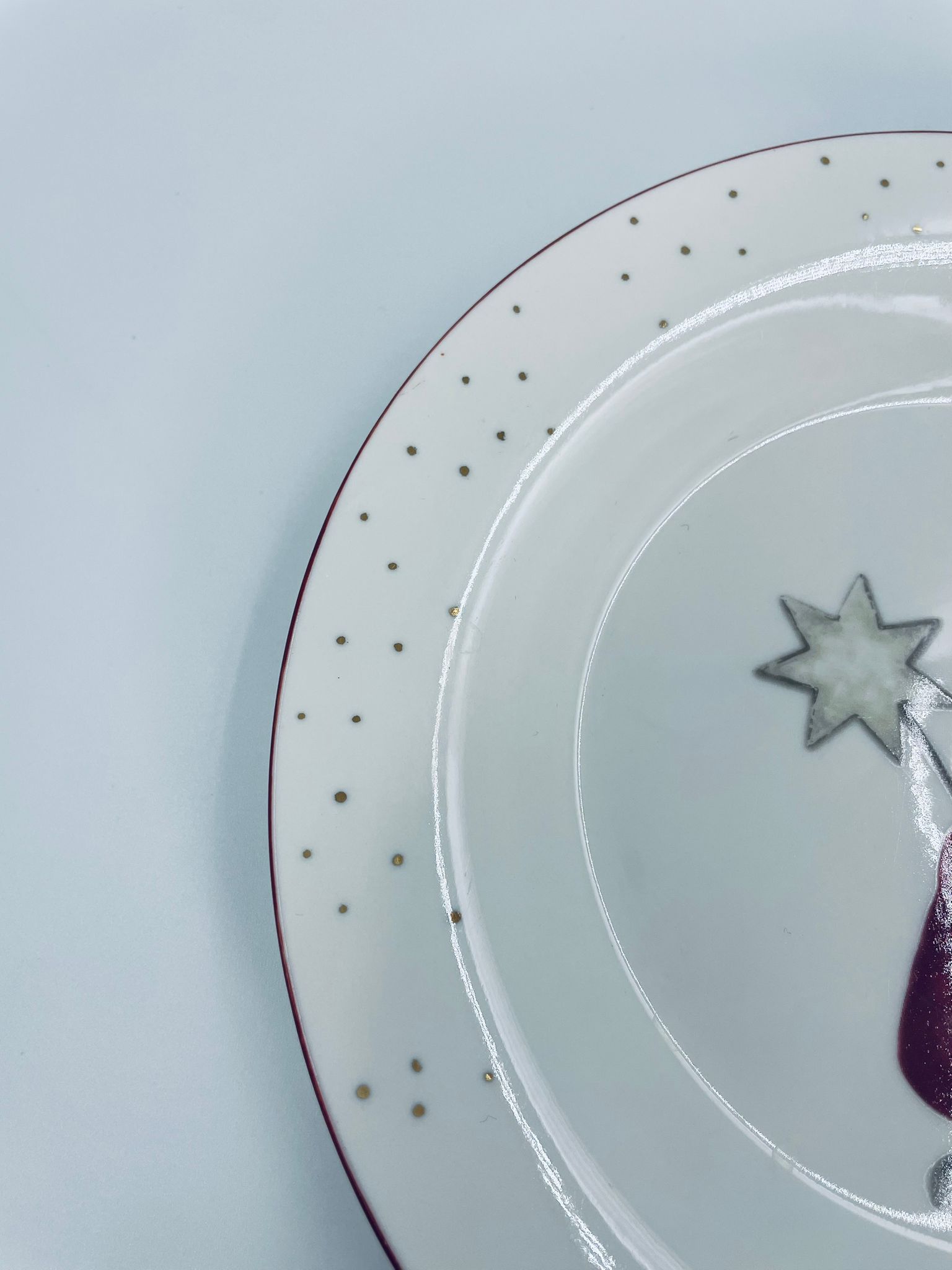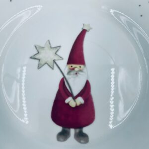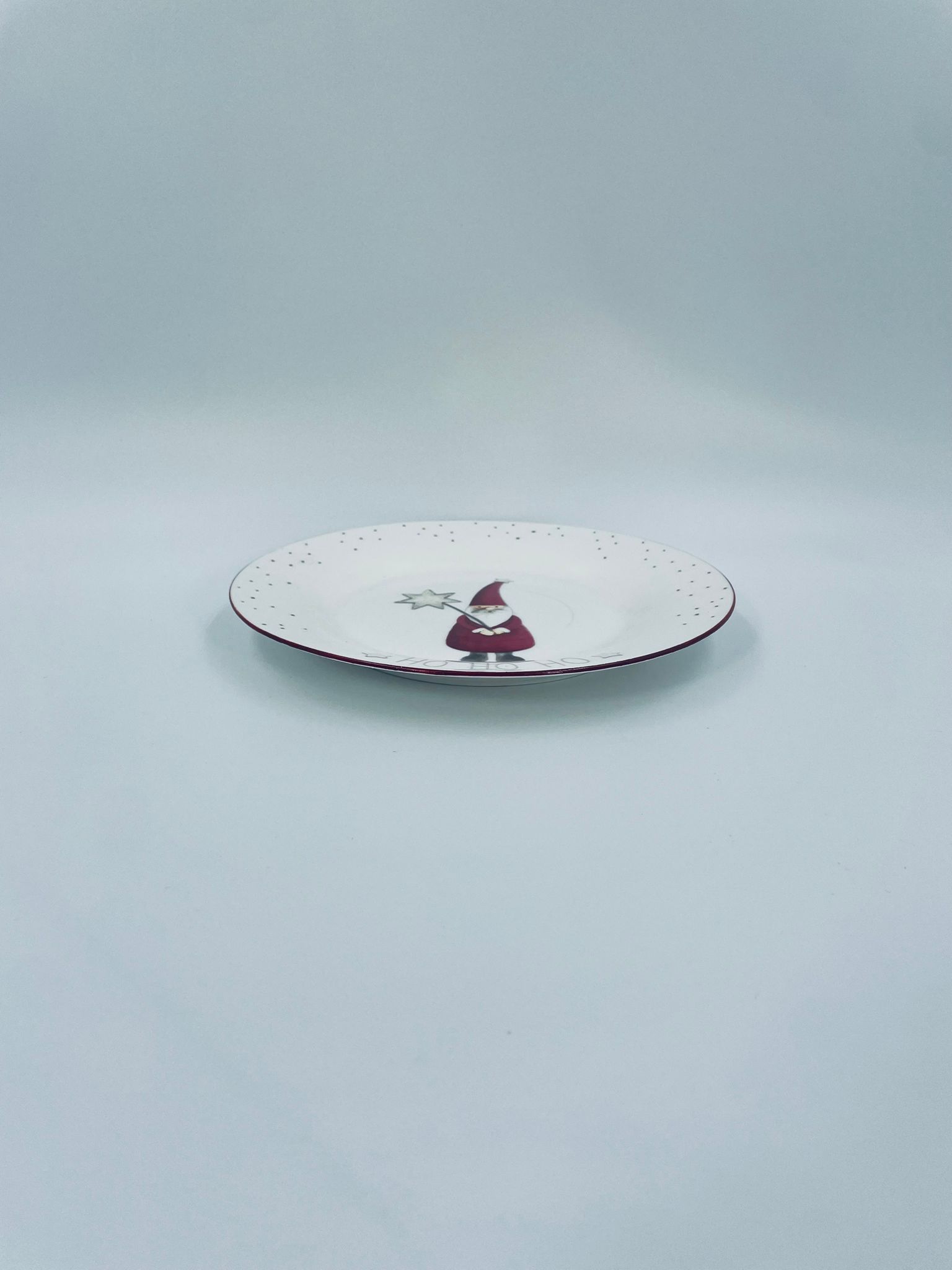 Talerz dekoracyjny, deserowy marki Depot, wykonany z bialej porcelany. Talerz ozdobiony wzorem małego krasnala w czerwonym stroju, trzymającego gwiazdę, napisem HO HO HO , ze złotymi akcentami kropek , wykończony czerwoną obwódką na rancie.