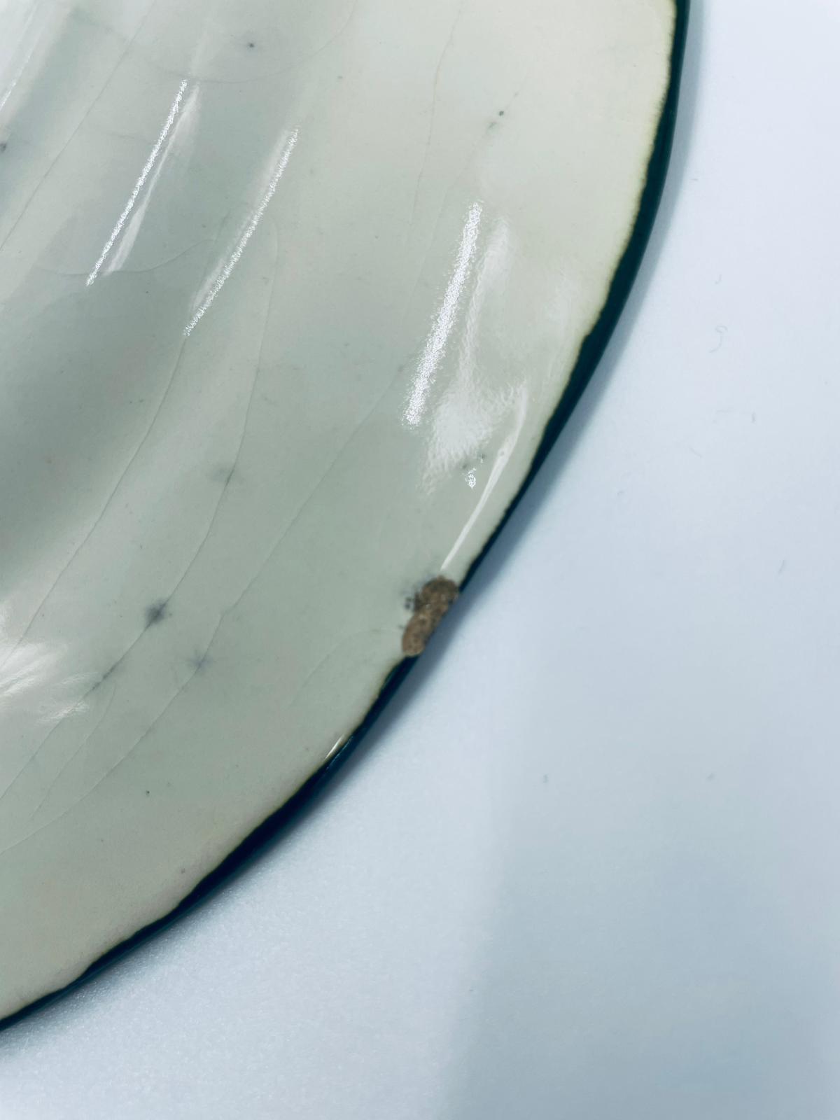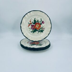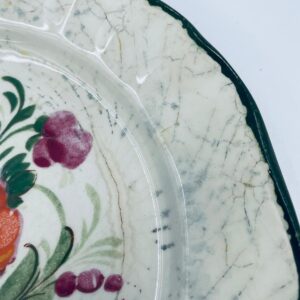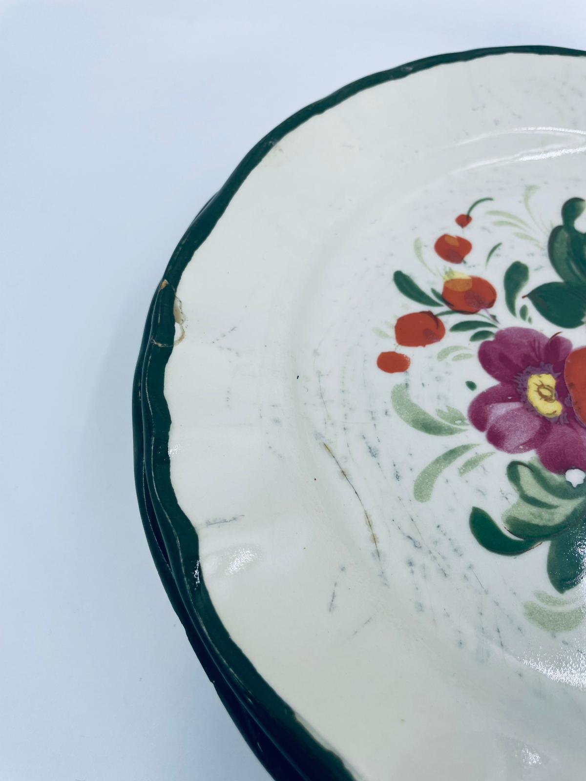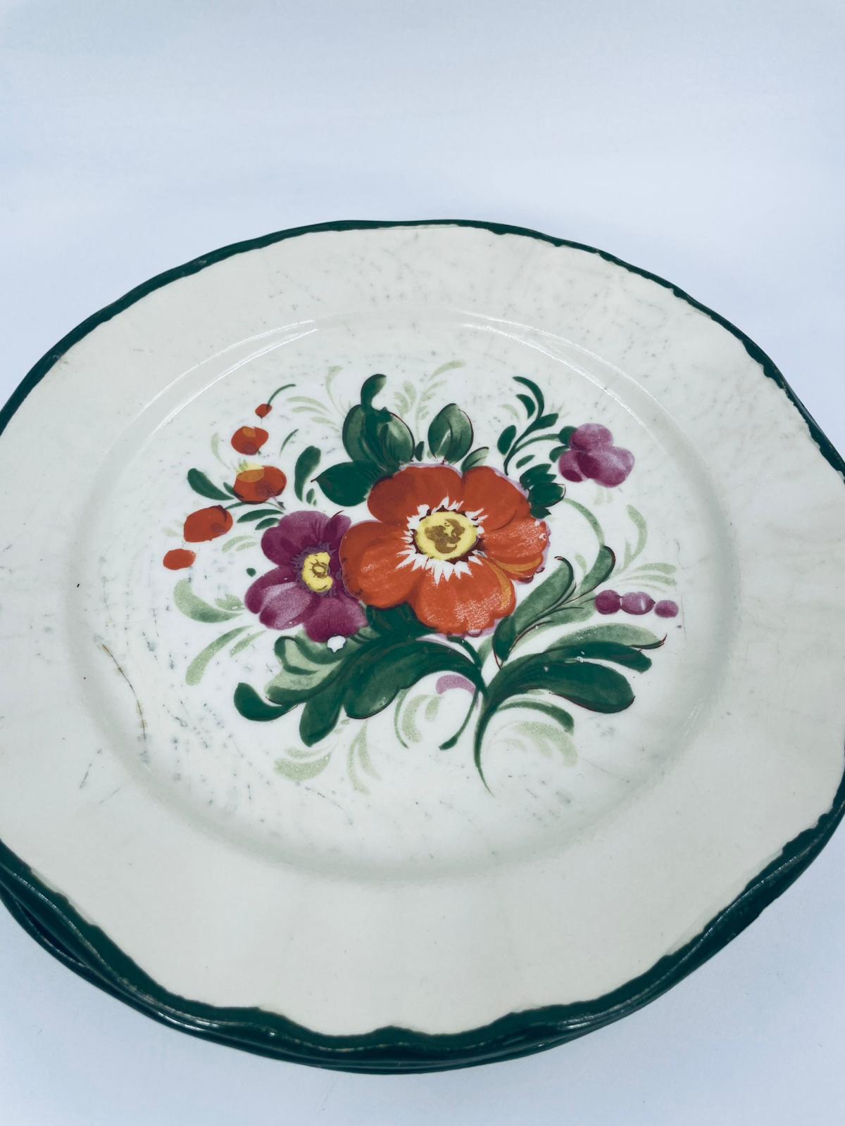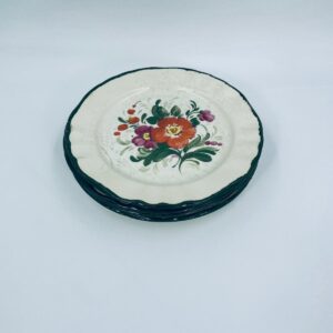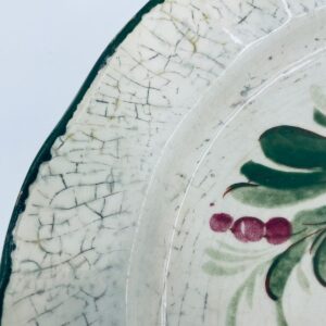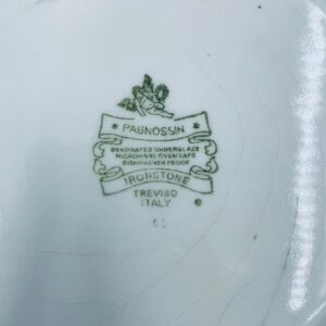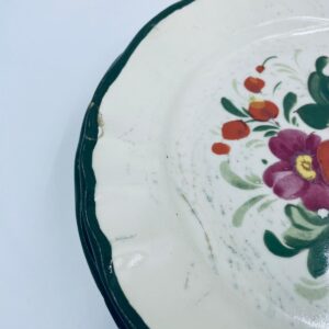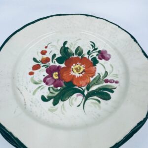 Talerz dekoracyjny Włoskiej wytwórni Pagnossin Treviso, wykonany z wysokiej jakości ceramiki. Talerz w kolorze ecru z ręcznie malowanym wzorem kwiatowym, oraz falistym brzegiem malowanym w kolorze zieleni. Talerz posiada pęknięcia szkliwa i uszczerbki.