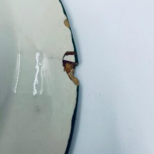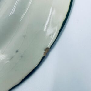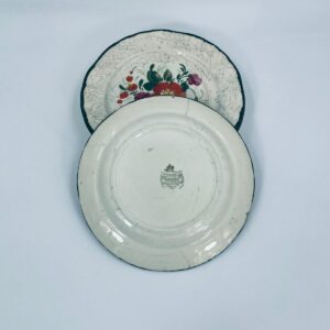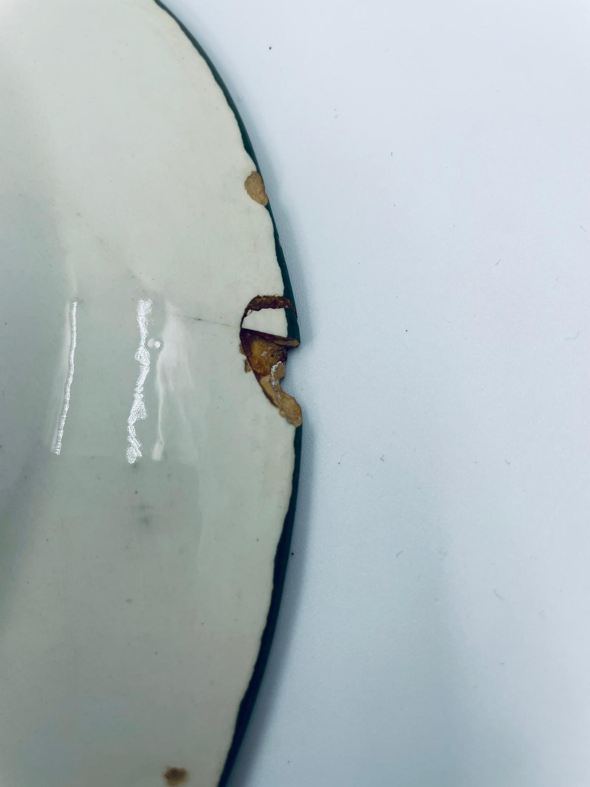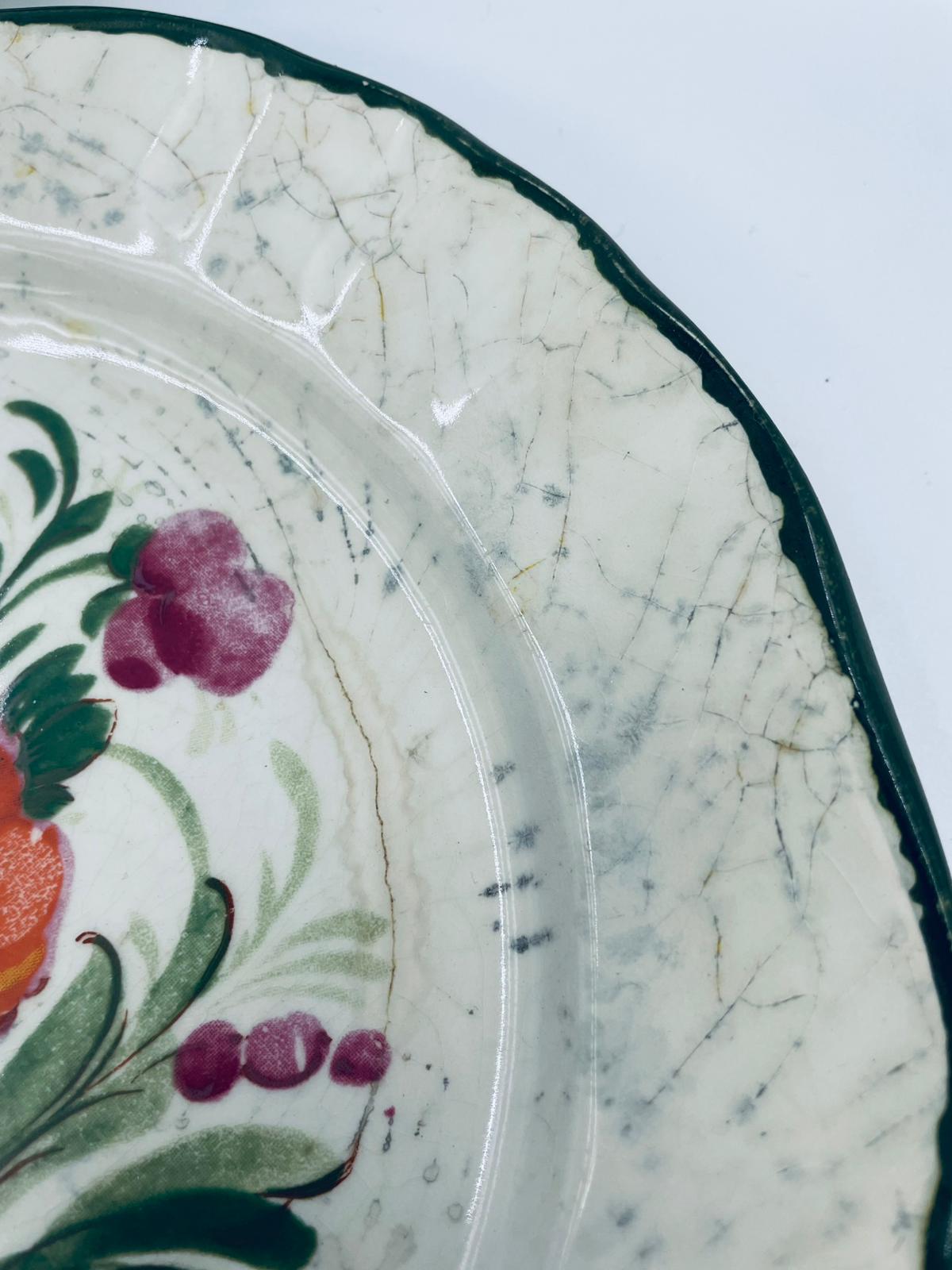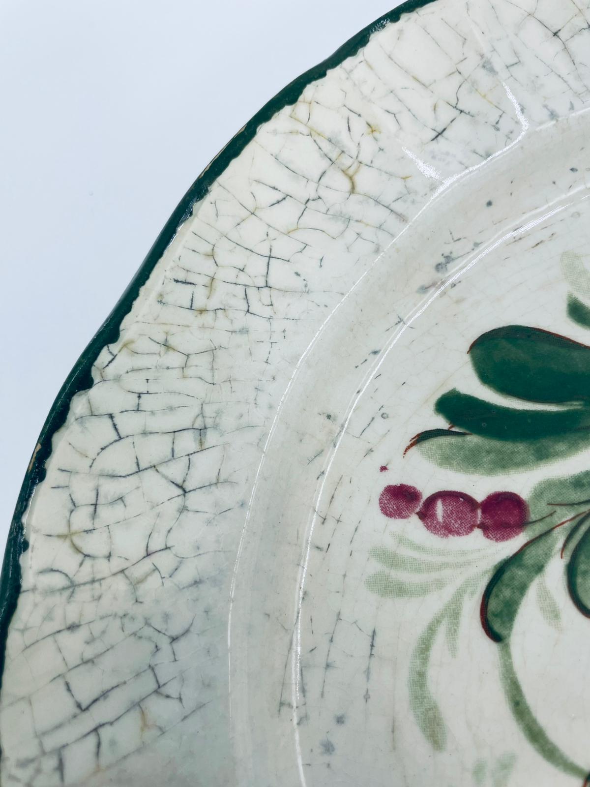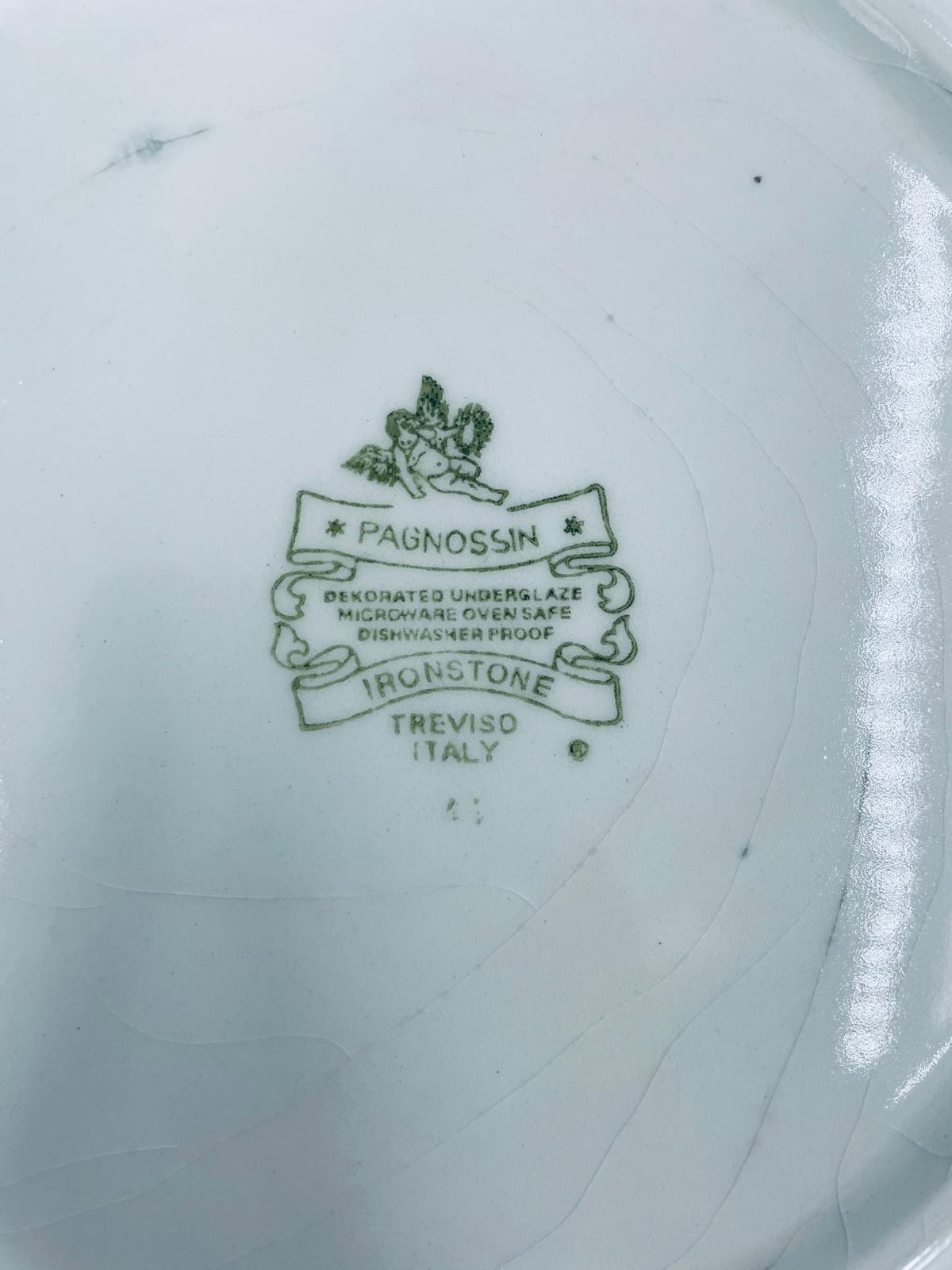 Talerz dekoracyjny Włoskiej wytwórni Pagnossin Treviso, wykonany z wysokiej jakości ceramiki. Talerz w kolorze ecru z ręcznie malowanym wzorem kwiatowym, oraz falistym brzegiem malowanym w kolorze zieleni. Talerz posiada pęknięcia szkliwa i uszczerbki.