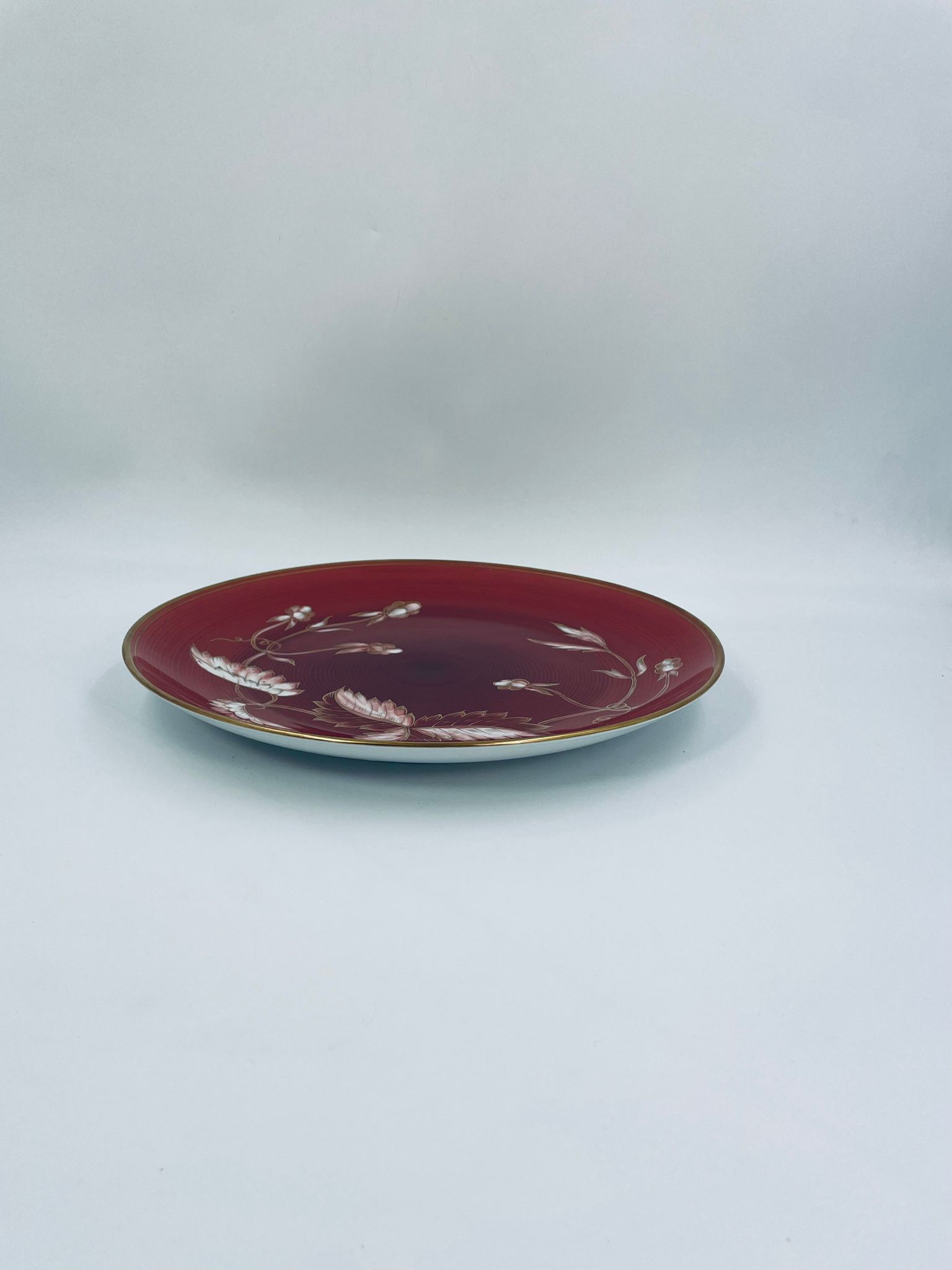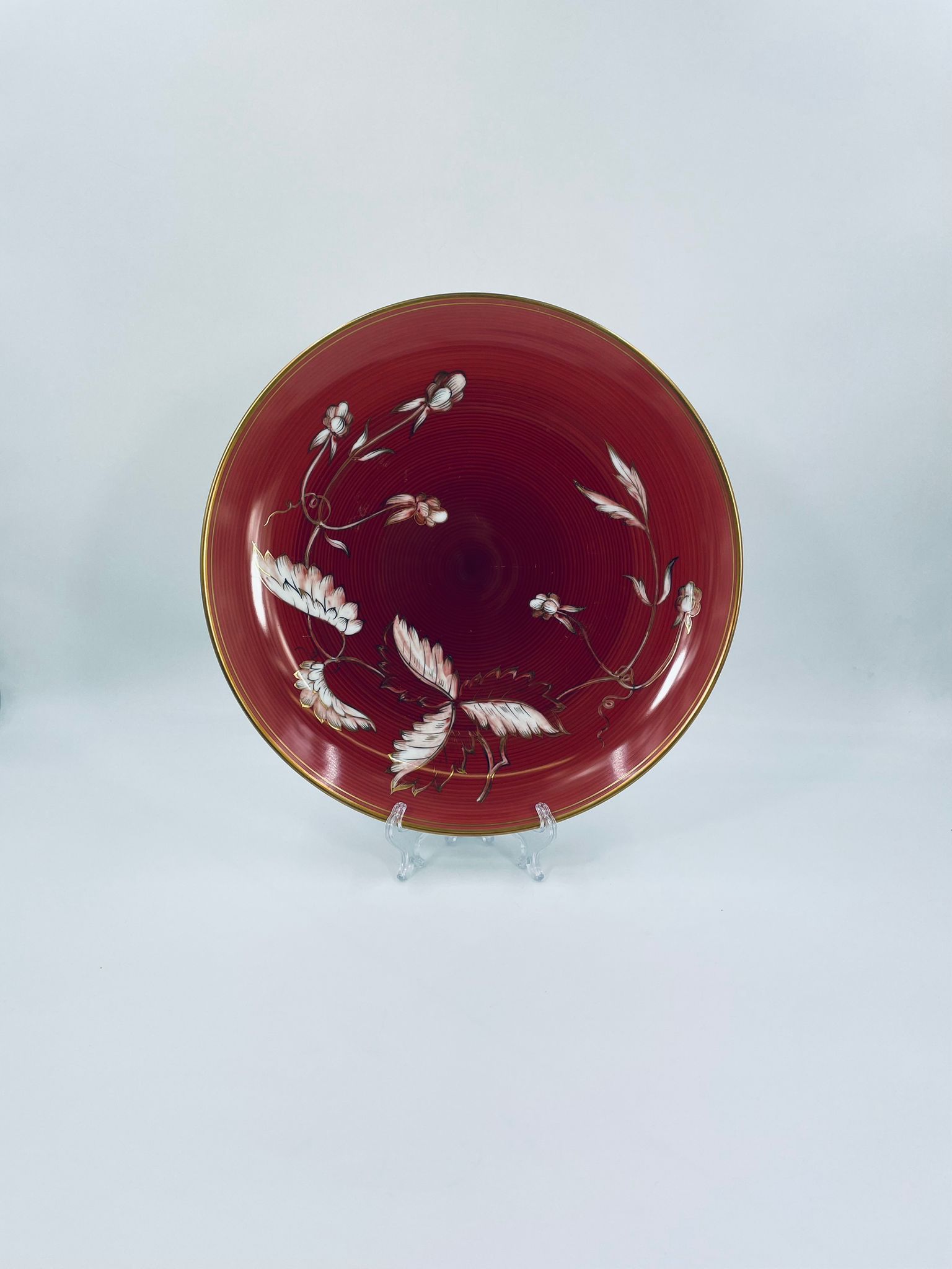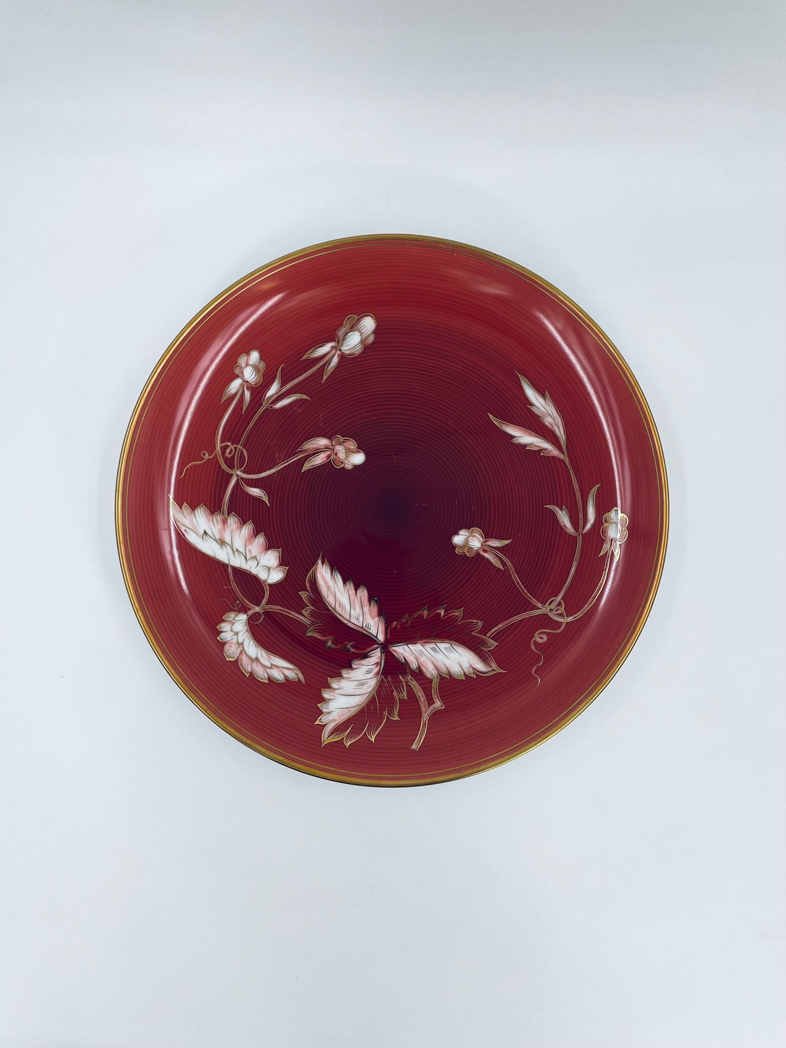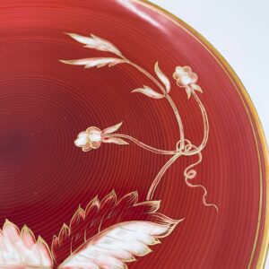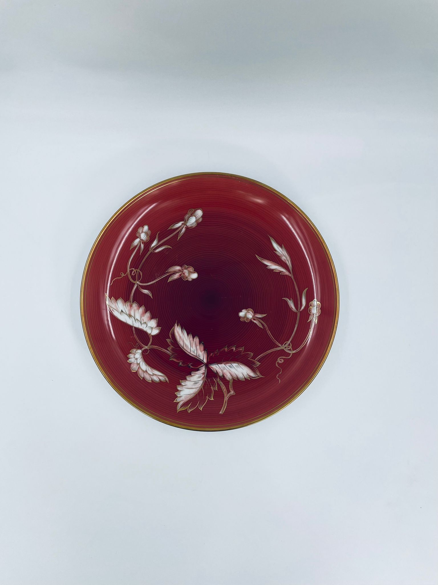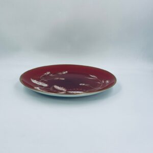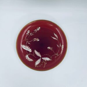 Talerz dekoracyjny wytwórni Furstenberg, wykonany z wysokiej jakości białej porcelany. Patera barwiona w kolorze bordowym, ozdobiona motywem roślinnymi, wykończona złoceniem na rancie. Posiada małe przetarcia w centralnej części.