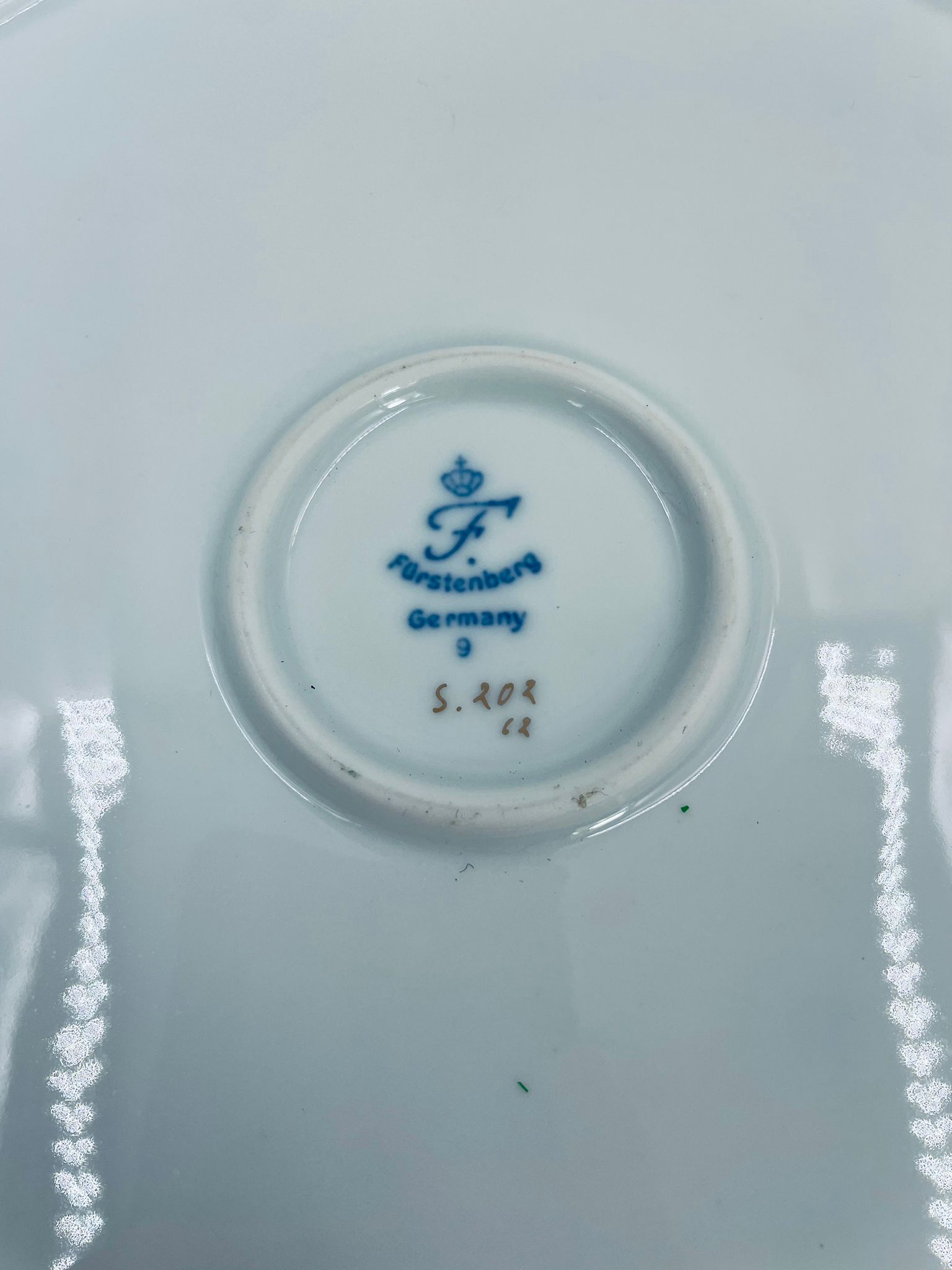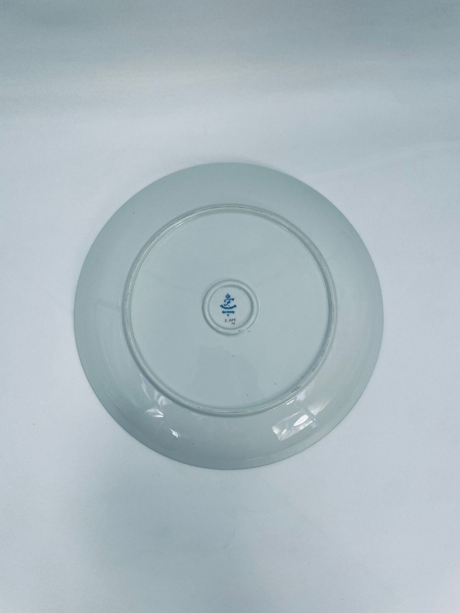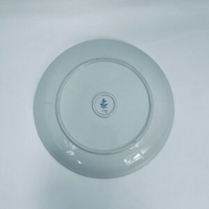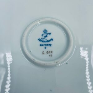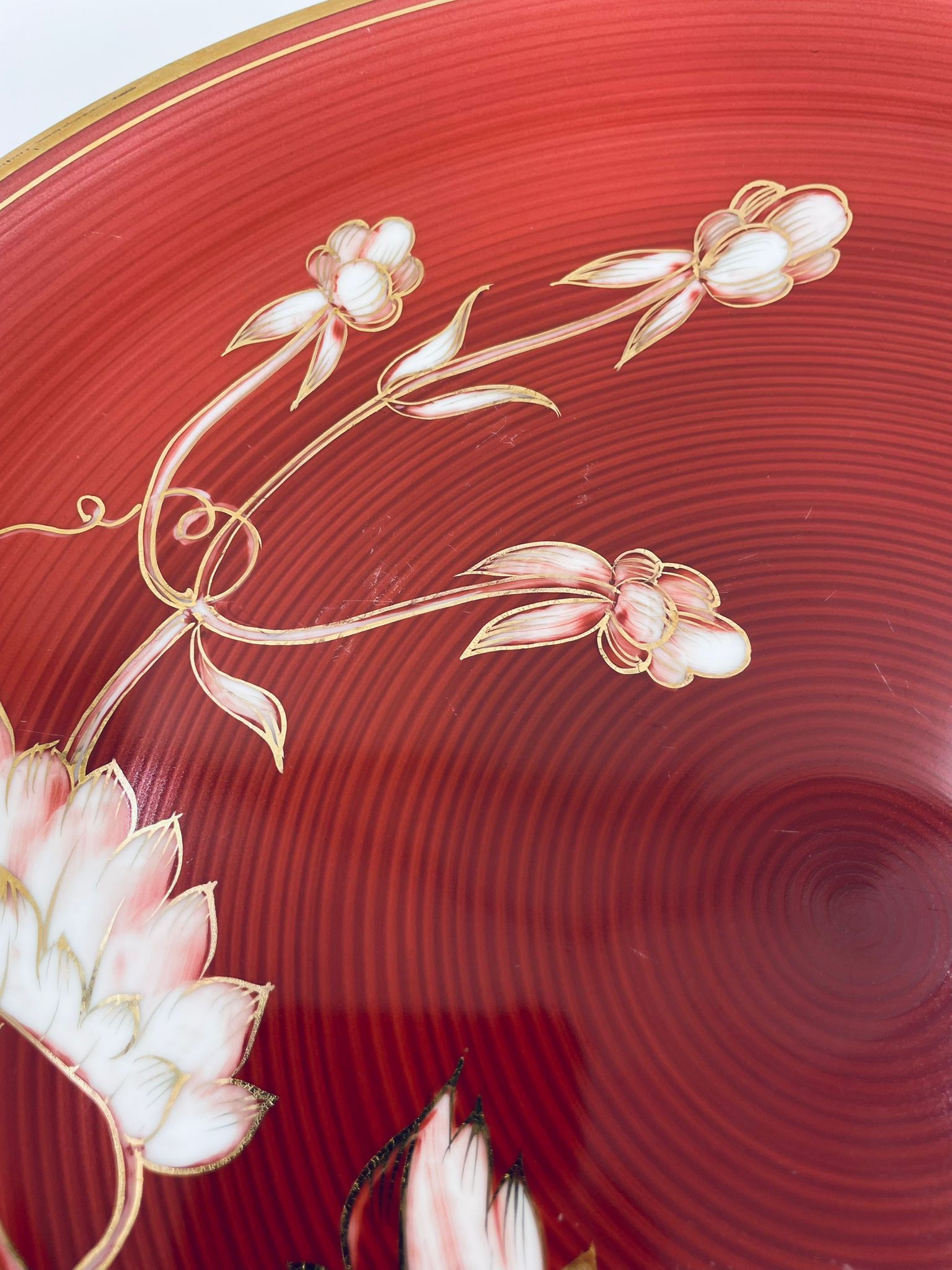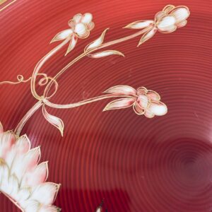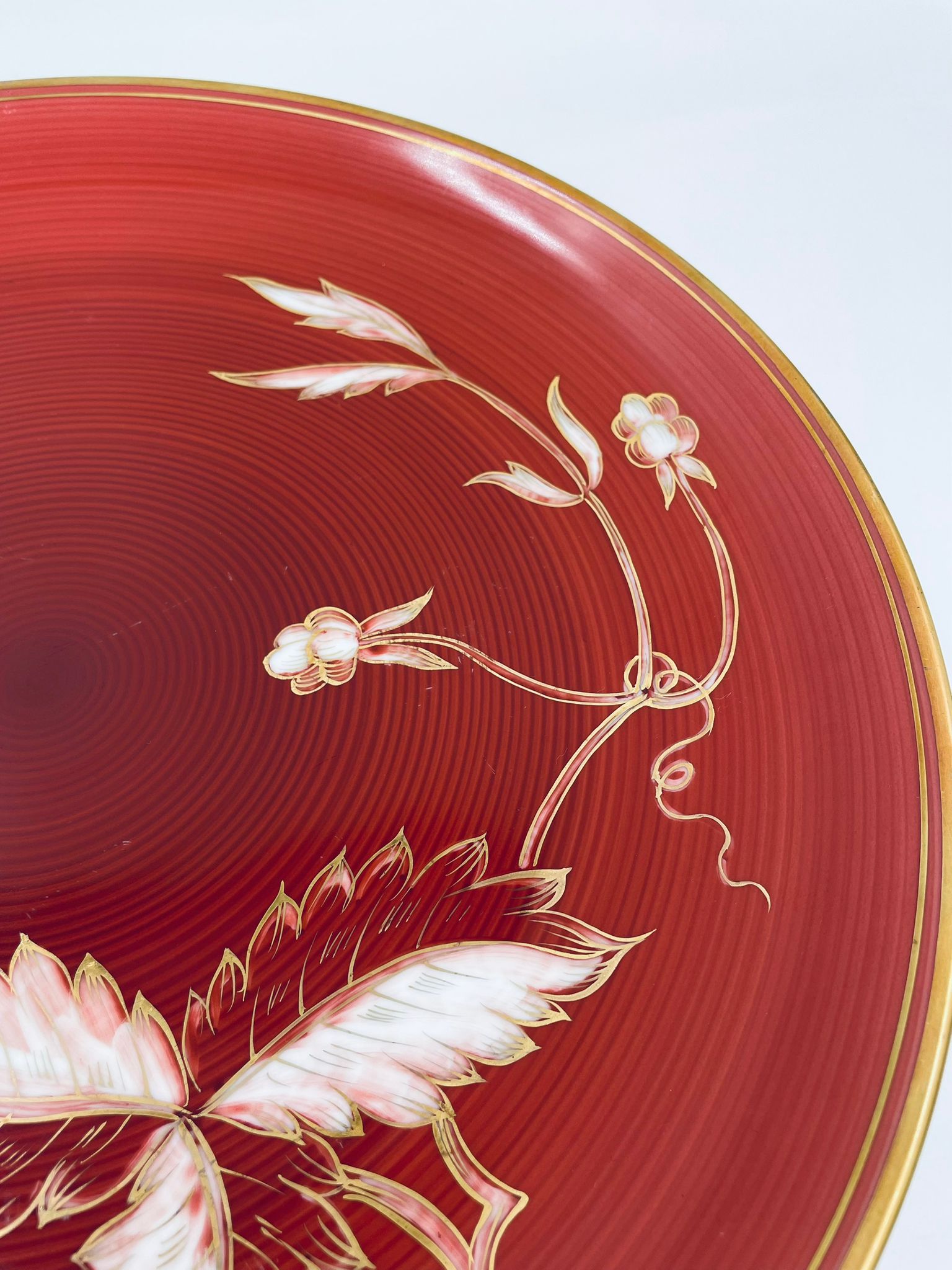 Talerz dekoracyjny wytwórni Furstenberg, wykonany z wysokiej jakości białej porcelany. Patera barwiona w kolorze bordowym, ozdobiona motywem roślinnymi, wykończona złoceniem na rancie. Posiada małe przetarcia w centralnej części.