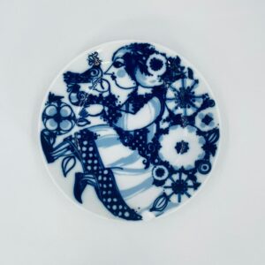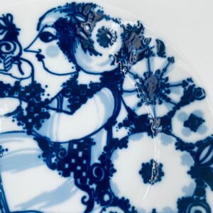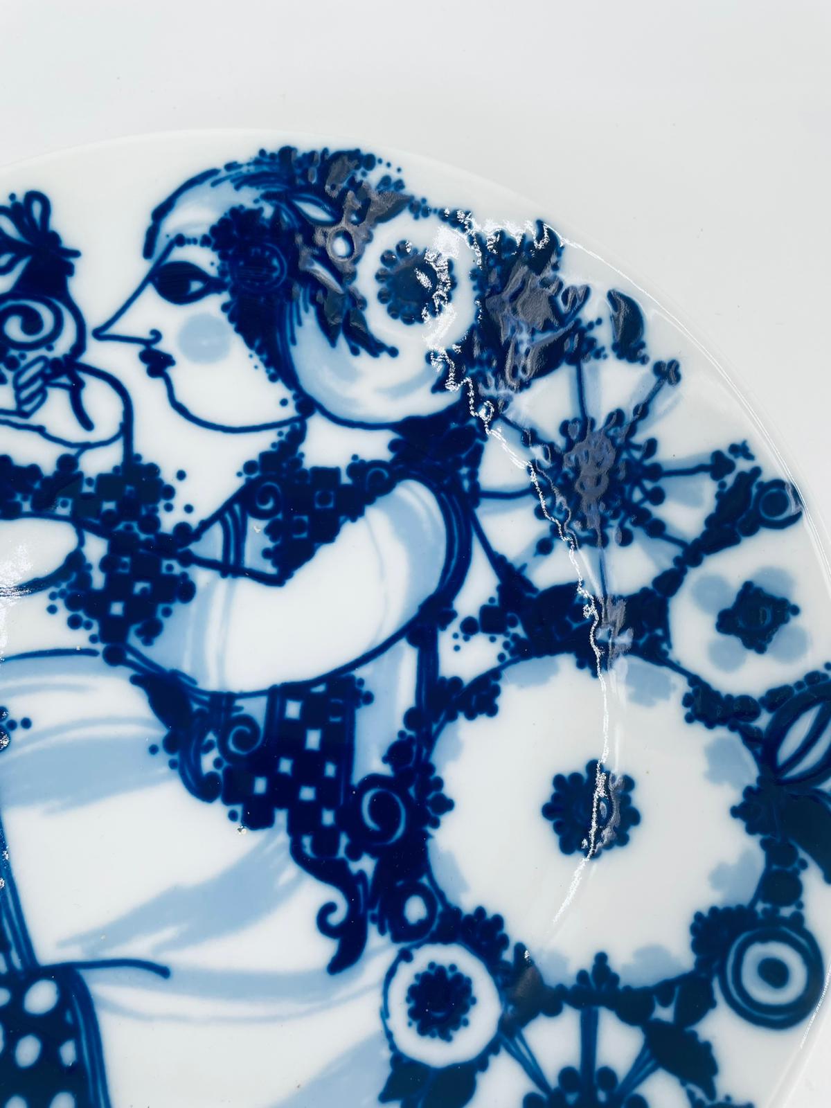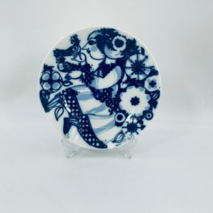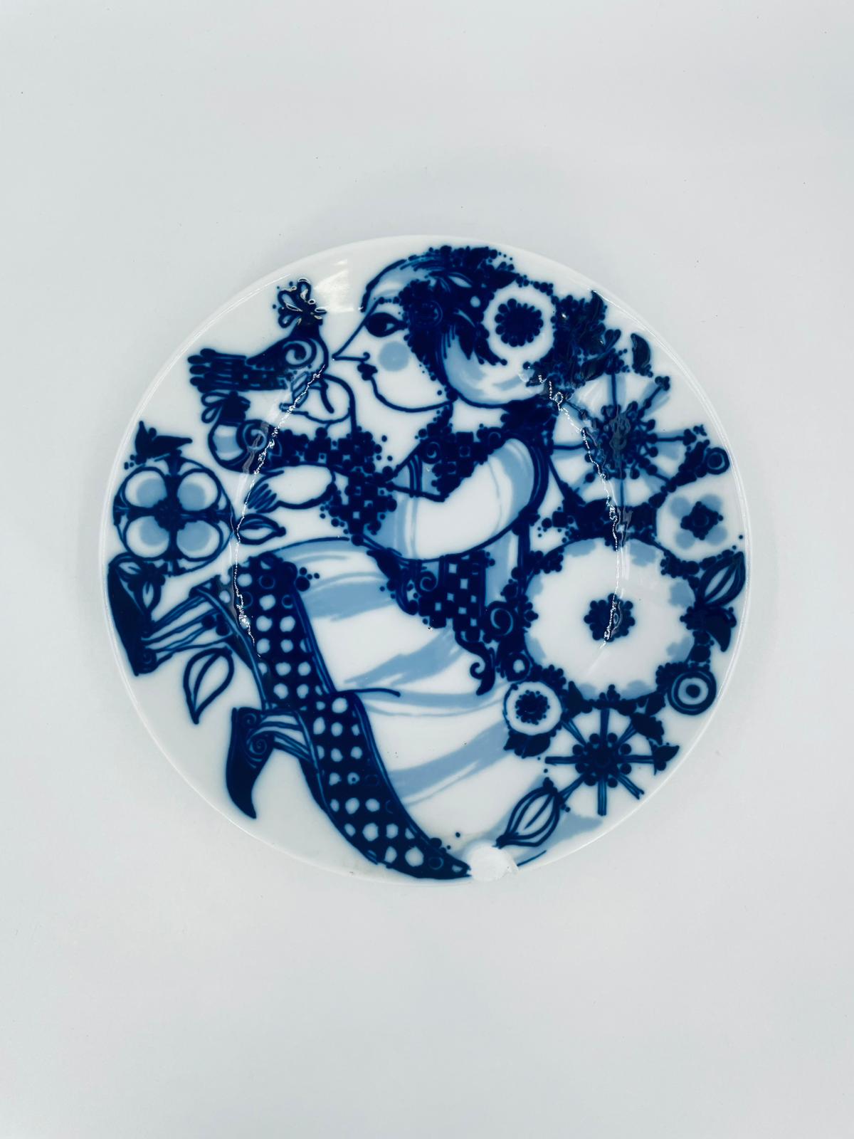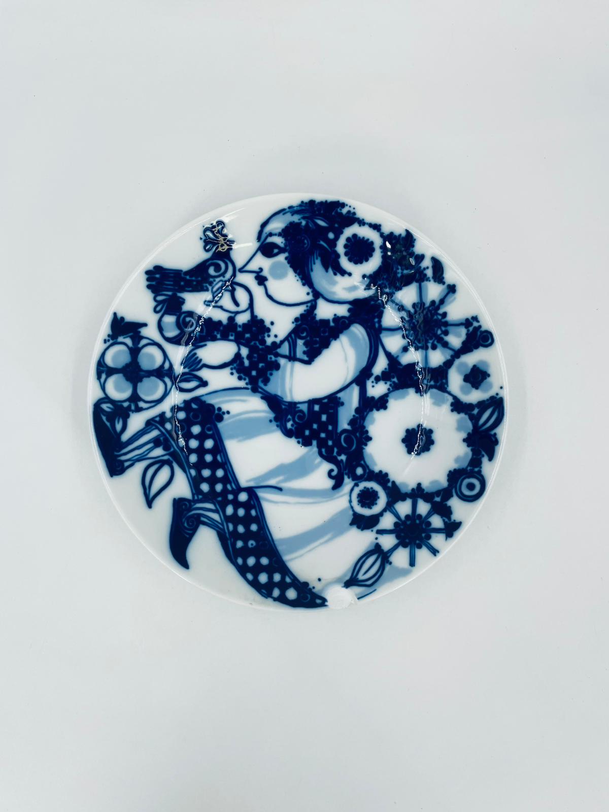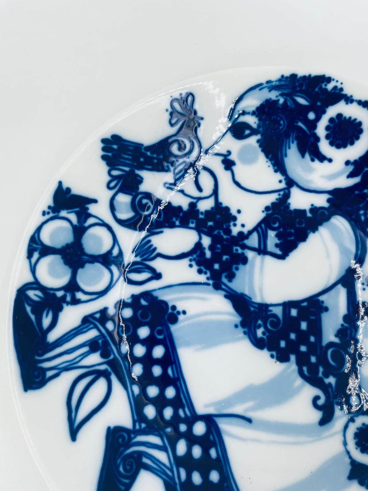 Talerz dekoracyjny renomowanej wytwórni Rosenthal Studio Line, zaprojektowany przez duńskiego artystę Bjorna Wiinblada, wykonany z najwyższej jakości białej porcelany. Talerz w kobaltowym kolorze, dekorowany przestawiający siedzącą kobietę w otoczeniu roślinności i ptaków. Posiada uszczerbek na rancie.