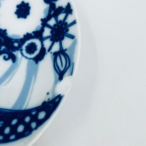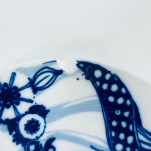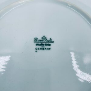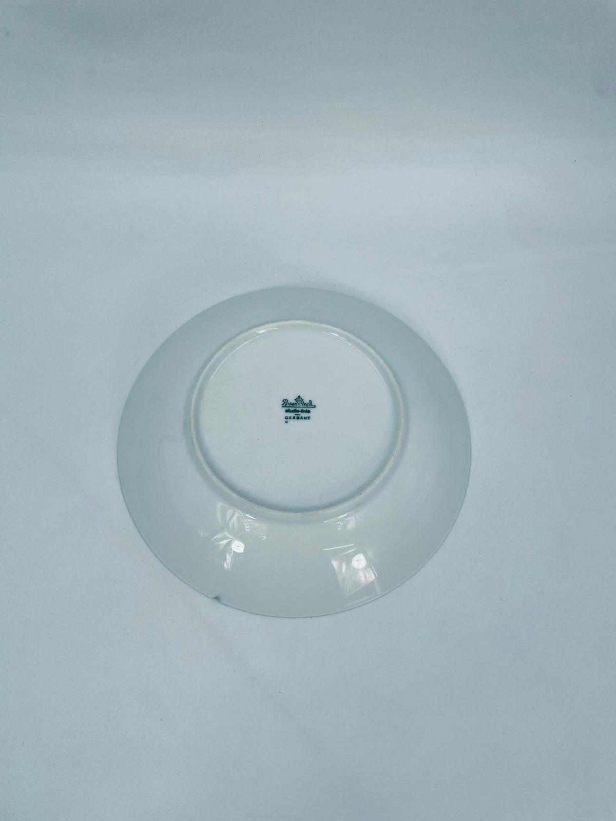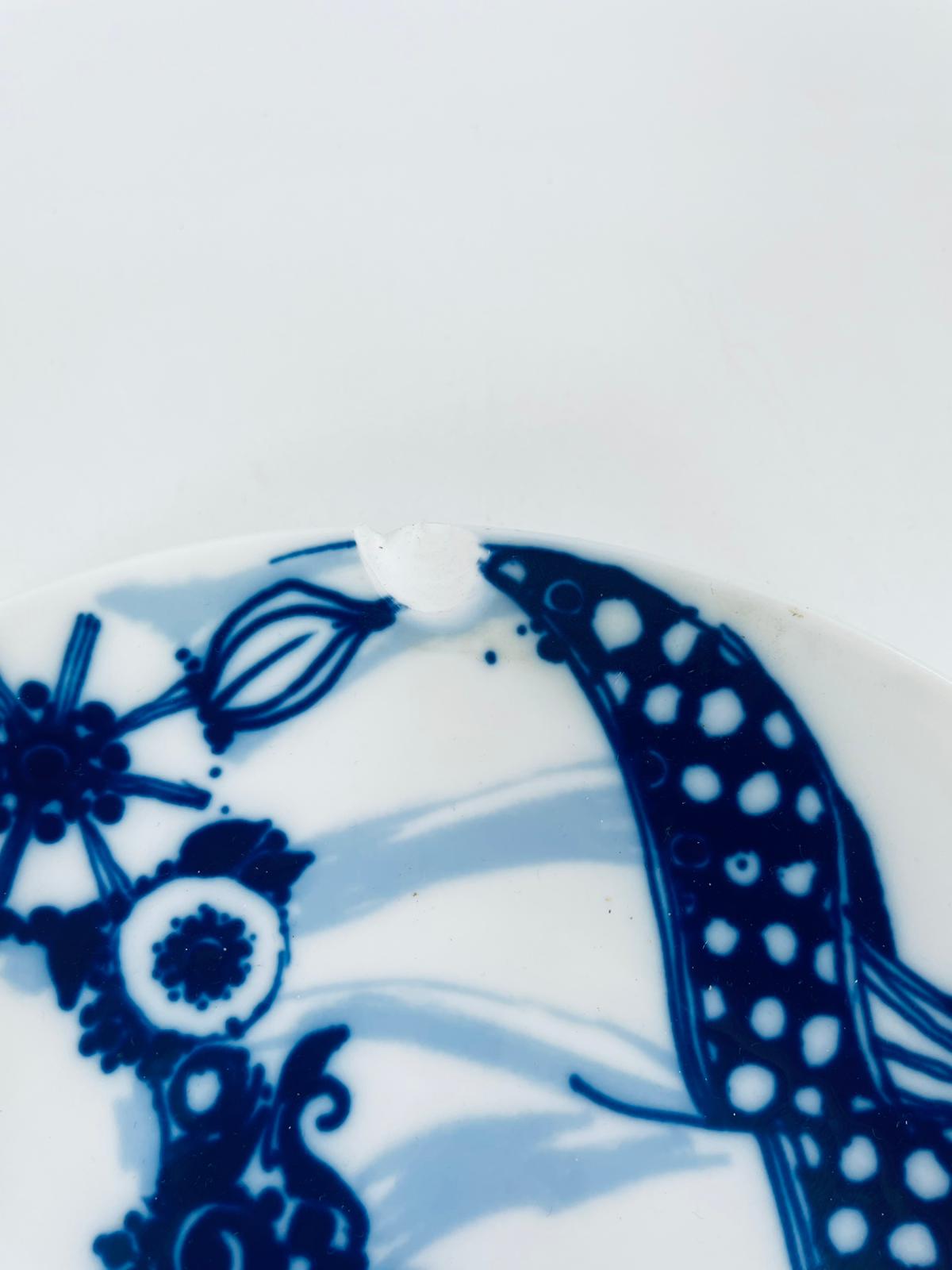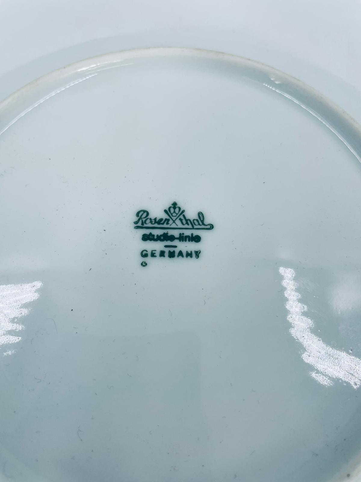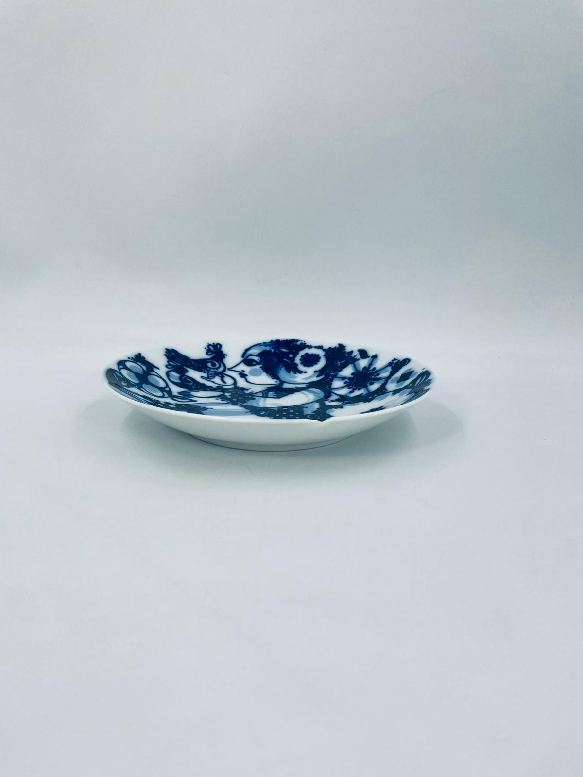 Talerz dekoracyjny renomowanej wytwórni Rosenthal Studio Line, zaprojektowany przez duńskiego artystę Bjorna Wiinblada, wykonany z najwyższej jakości białej porcelany. Talerz w kobaltowym kolorze, dekorowany przestawiający siedzącą kobietę w otoczeniu roślinności i ptaków. Posiada uszczerbek na rancie.