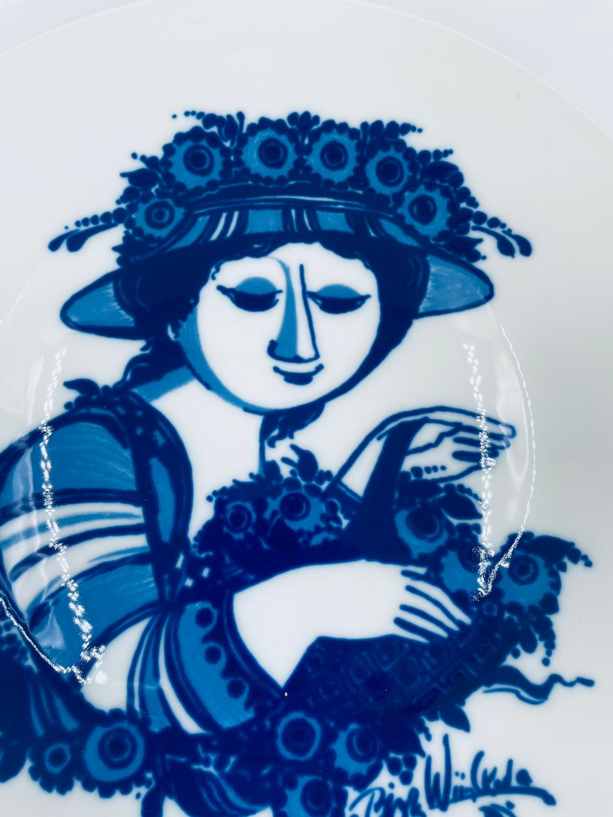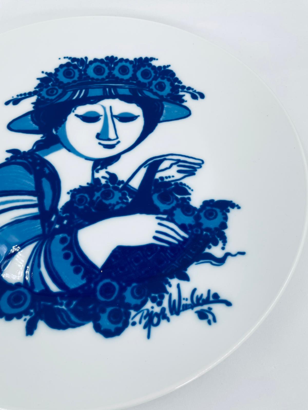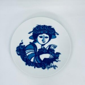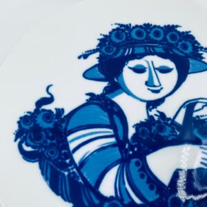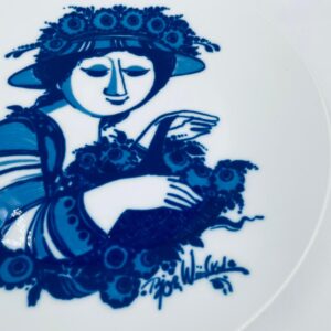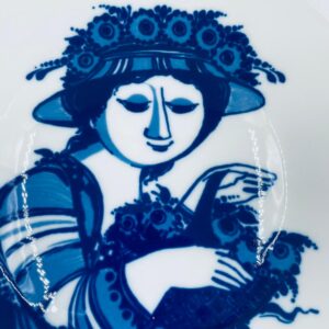 Talerz dekoracyjny renomowanej wytwórni Rosenthal Studio Line, zaprojektowany przez duńskiego artystę Bjorna Wiinblada, wykonany z najwyższej jakości białej porcelany w latach 60-70tych. Talerz zdobiony kobaltowym wzorem, przedstawiającym kobietę w kwiatowym kapeluszu, trzymającą kosz kwiatów. Talerz z możliwością zawieszenia.