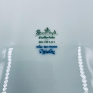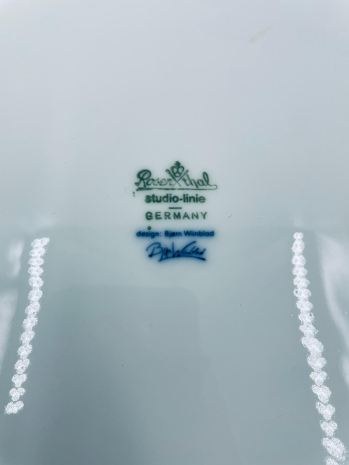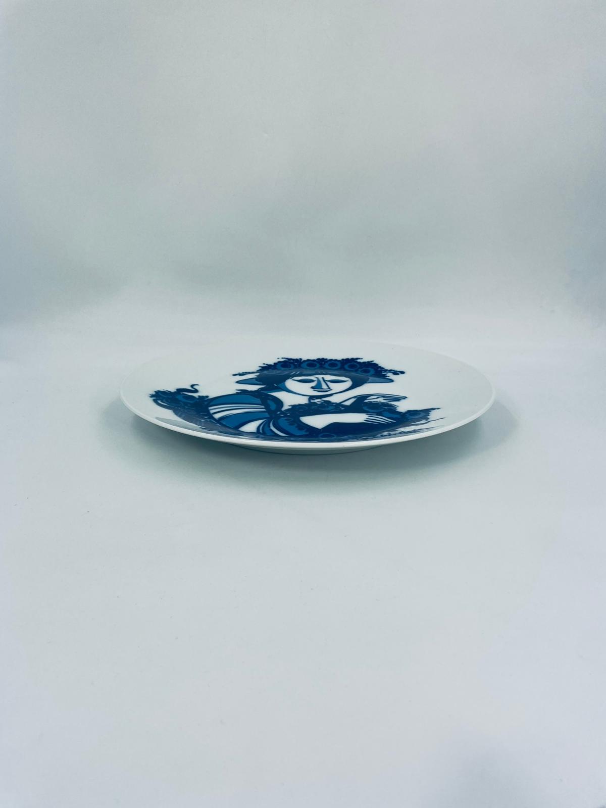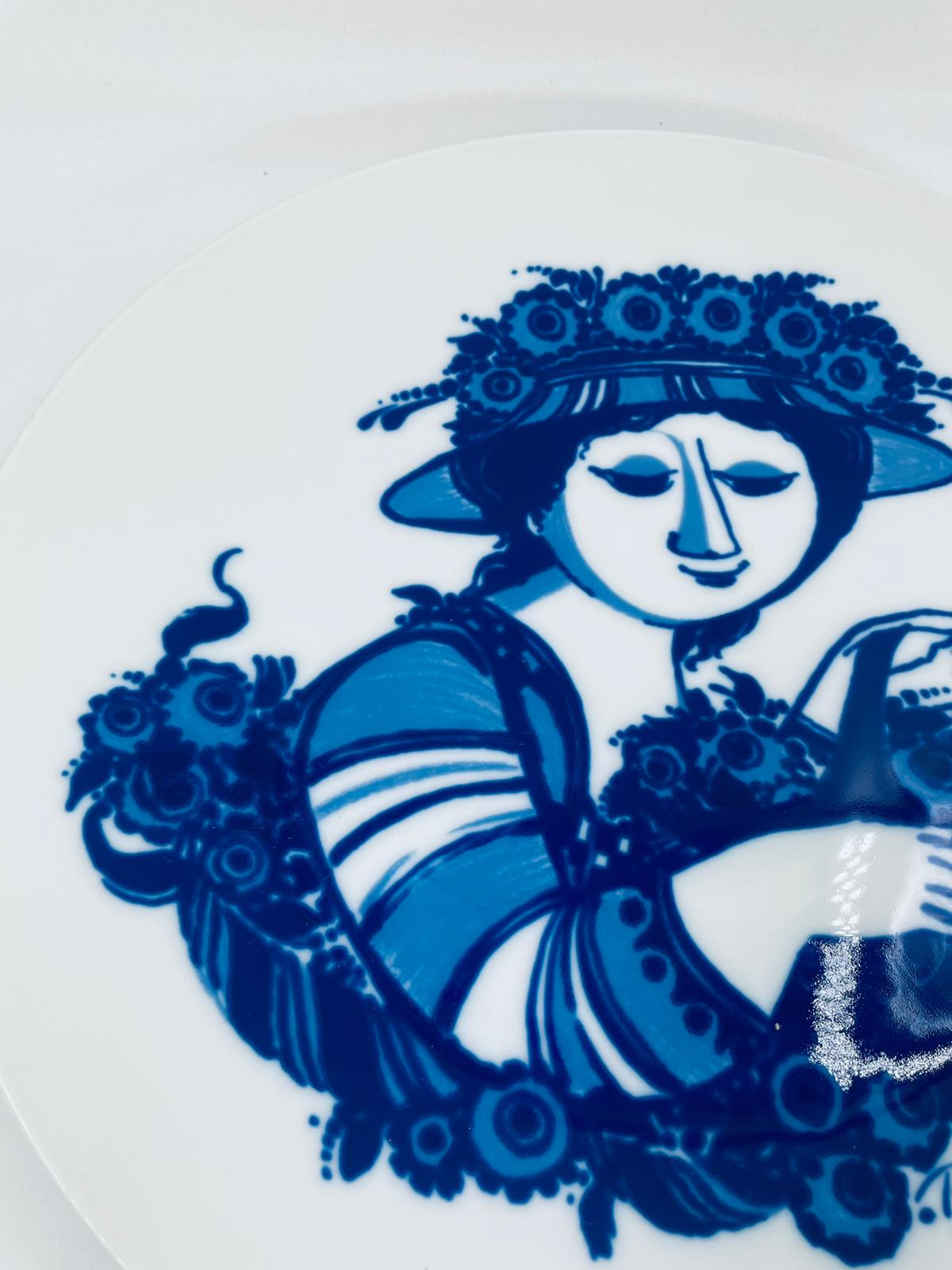 Talerz dekoracyjny renomowanej wytwórni Rosenthal Studio Line, zaprojektowany przez duńskiego artystę Bjorna Wiinblada, wykonany z najwyższej jakości białej porcelany w latach 60-70tych. Talerz zdobiony kobaltowym wzorem, przedstawiającym kobietę w kwiatowym kapeluszu, trzymającą kosz kwiatów. Talerz z możliwością zawieszenia.