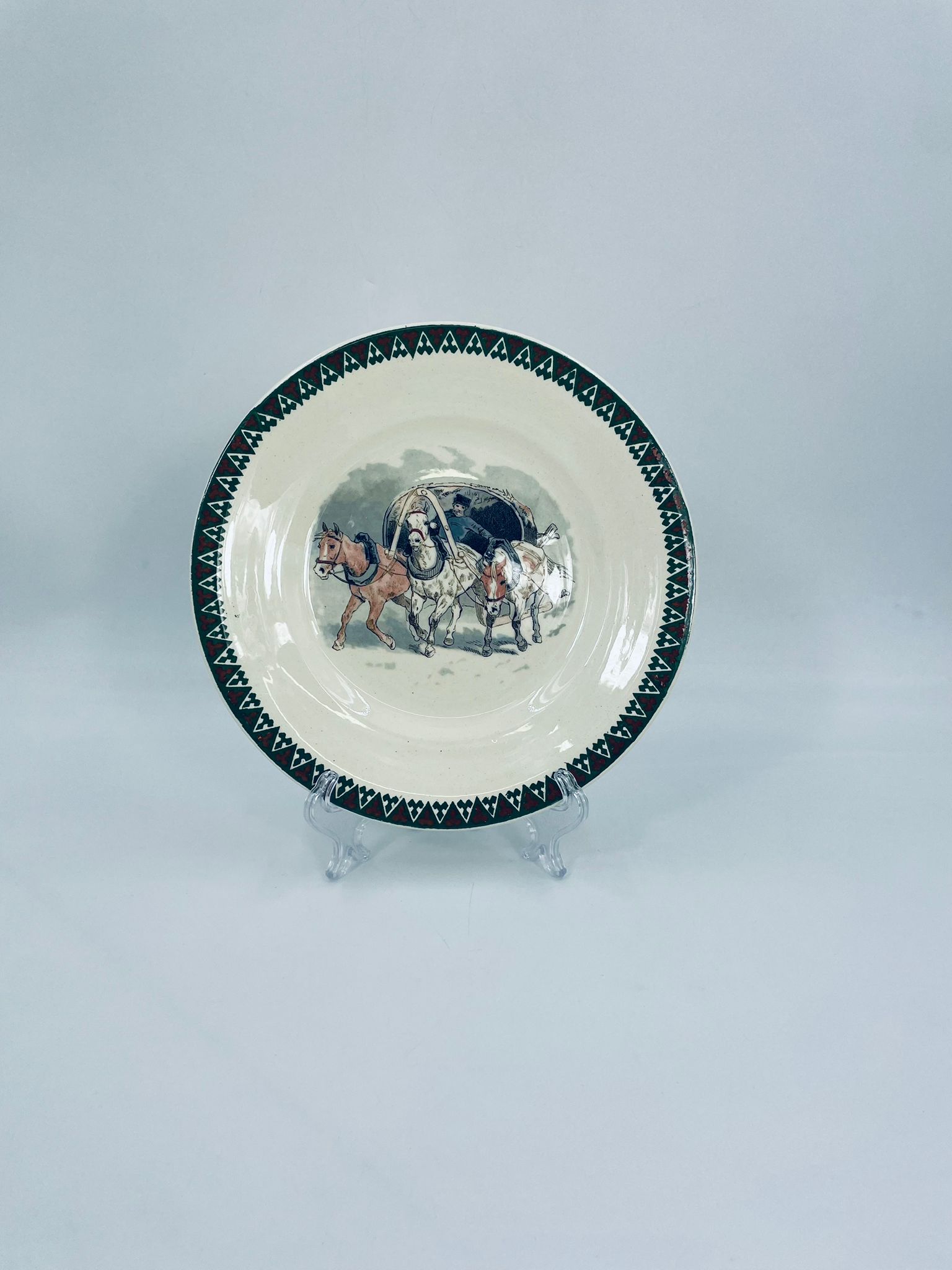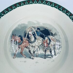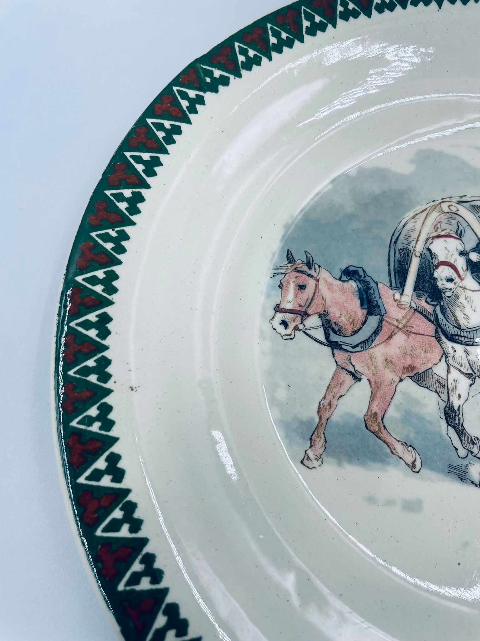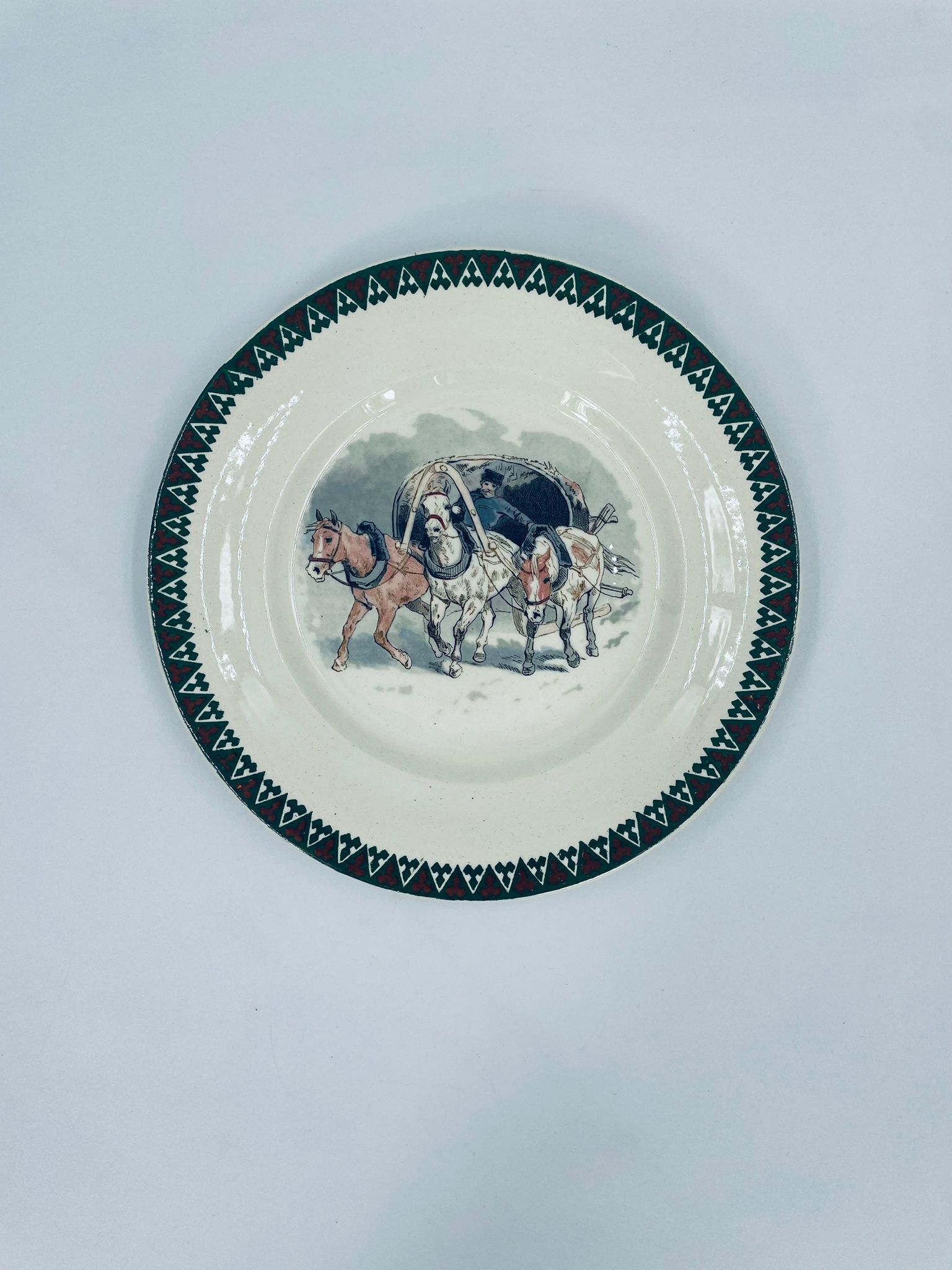 Talerz dekoracyjny wytwórni Sarreguemines, wykonany z porcelany w kolorze ecru. Talerz ze wzorem Fedora, ilustracja w centralnej części przedstawia trzy konie ciągnące wóz z woźnicą. Talerz wykończony jest wzorem geometryczny na obrzeżu. Posiada delikatne przetarcia.