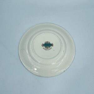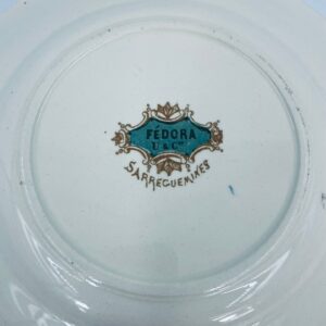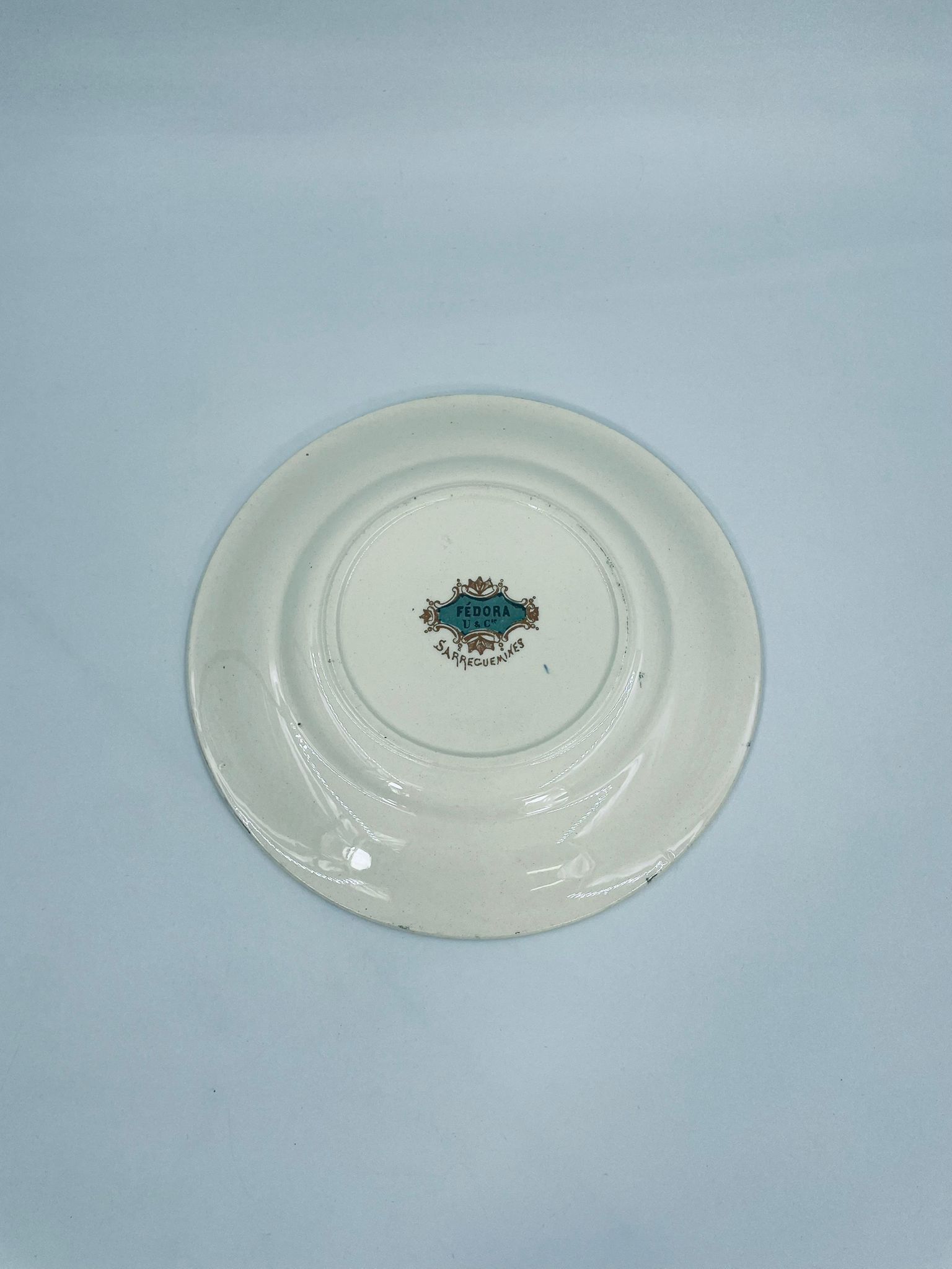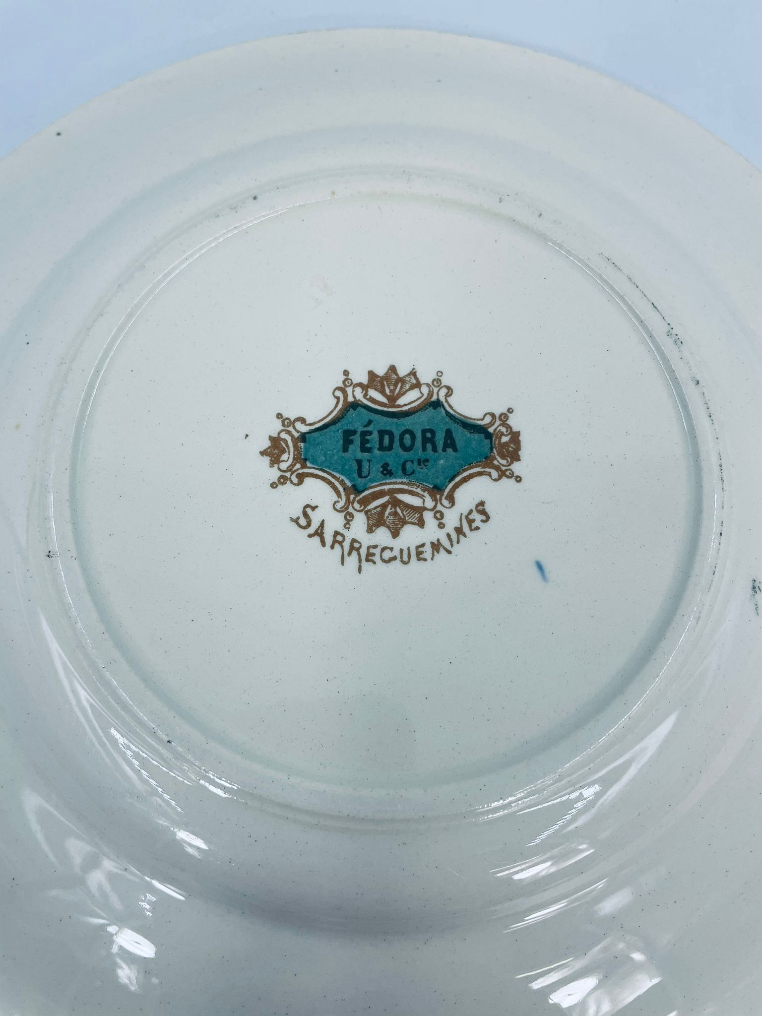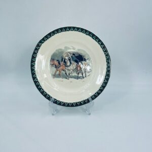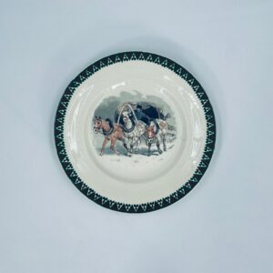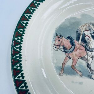 Talerz dekoracyjny wytwórni Sarreguemines, wykonany z porcelany w kolorze ecru. Talerz ze wzorem Fedora, ilustracja w centralnej części przedstawia trzy konie ciągnące wóz z woźnicą. Talerz wykończony jest wzorem geometryczny na obrzeżu. Posiada delikatne przetarcia.
