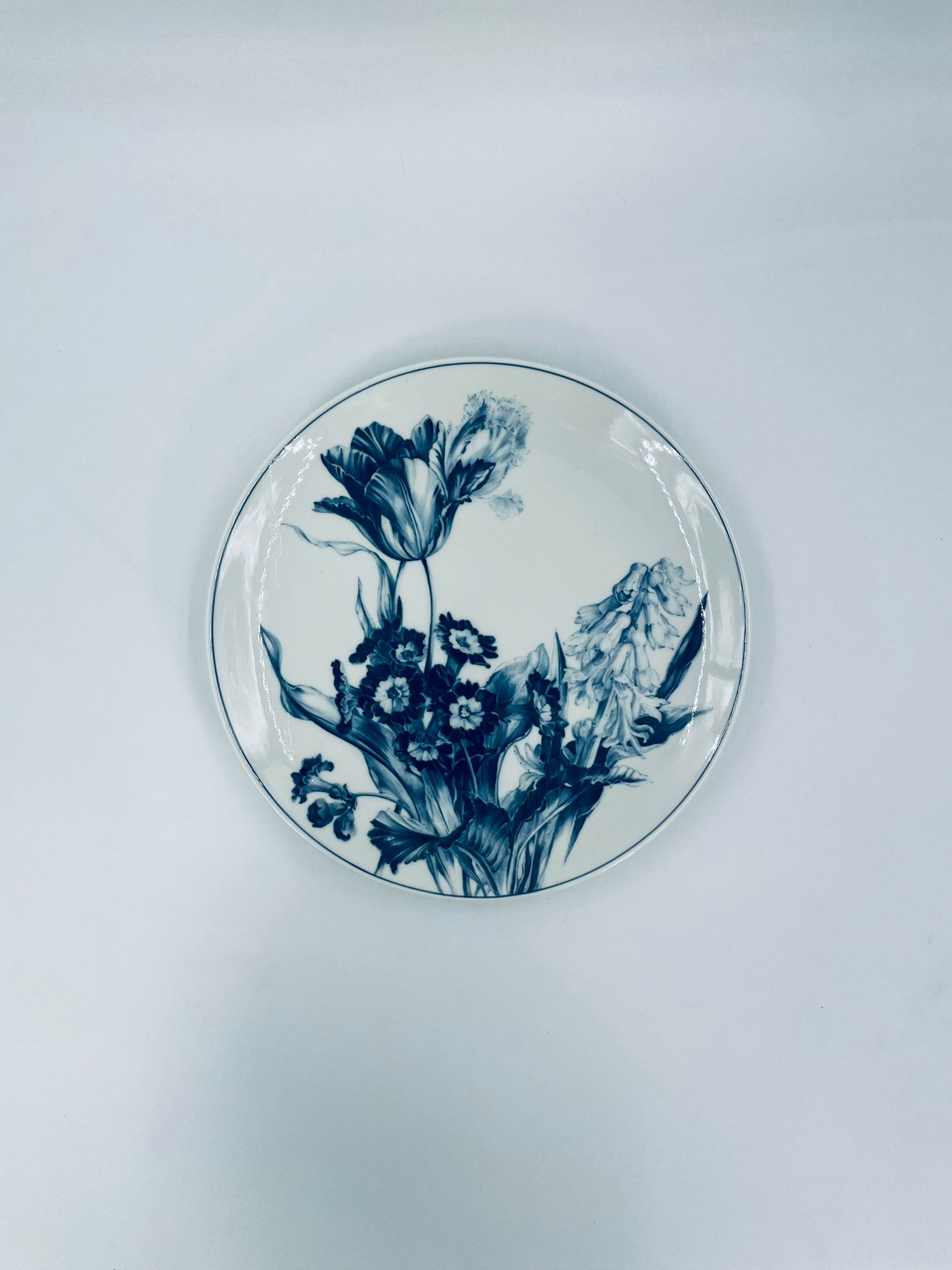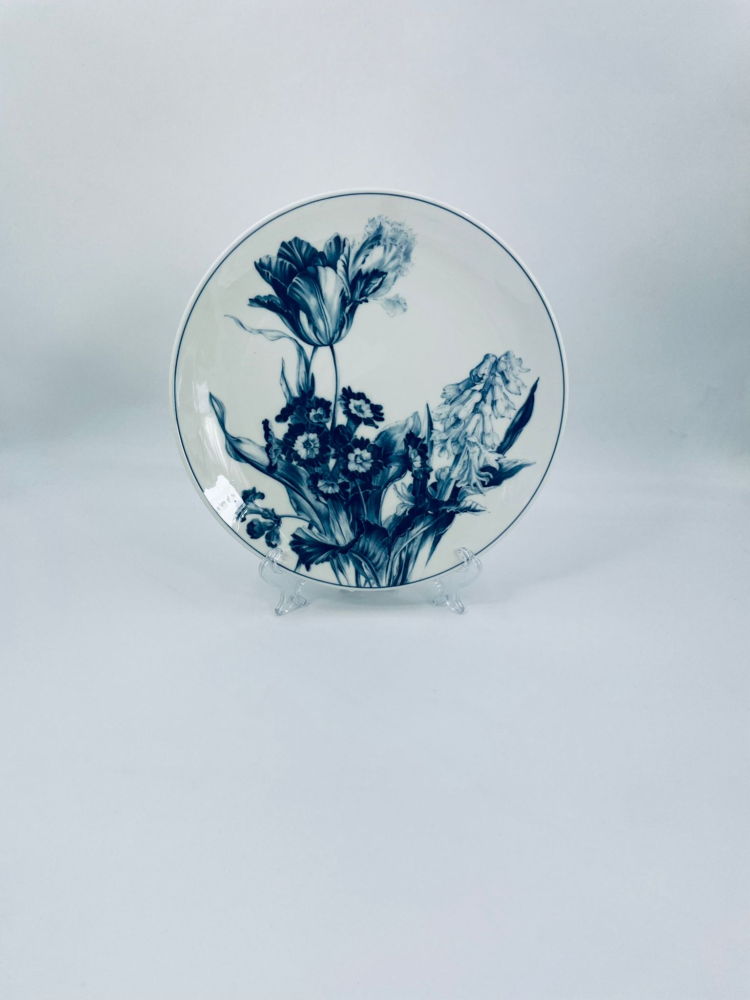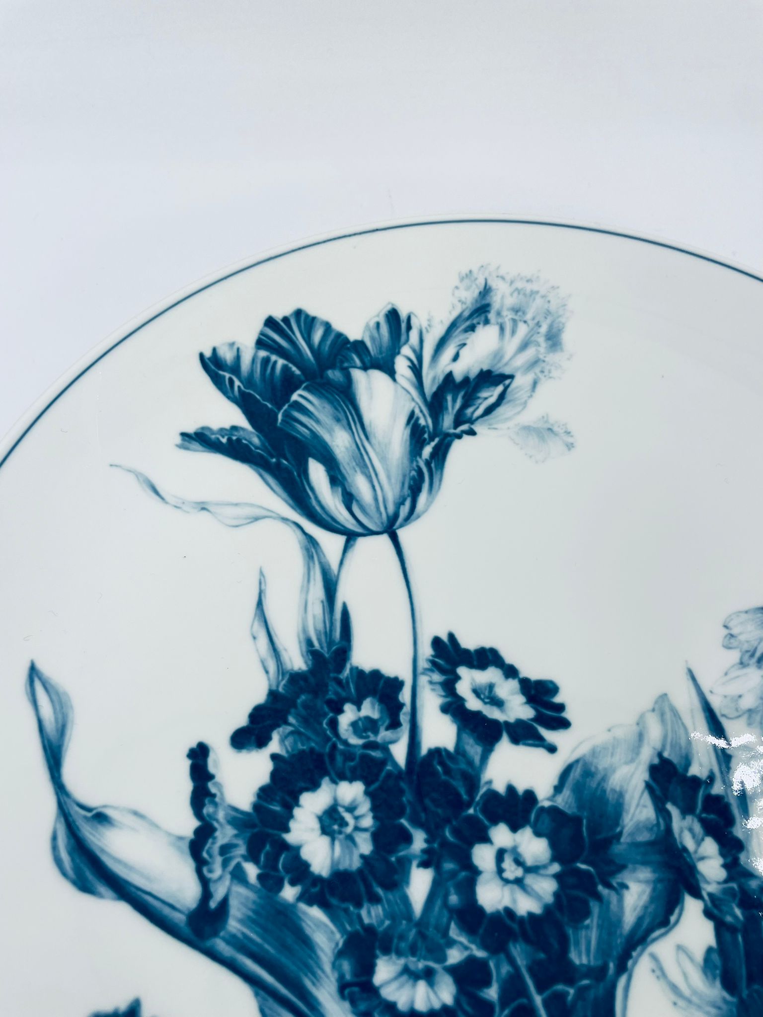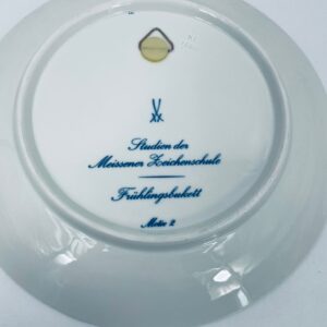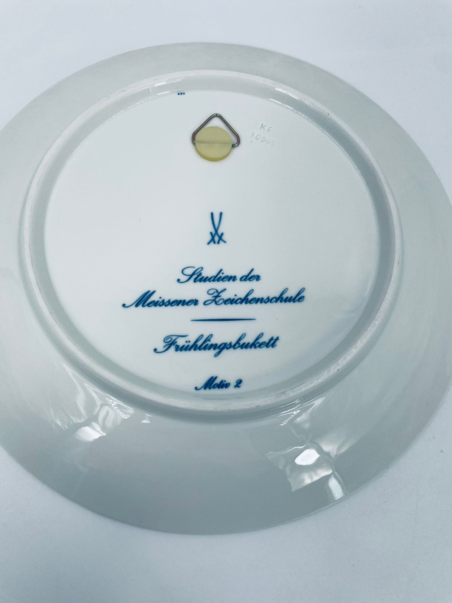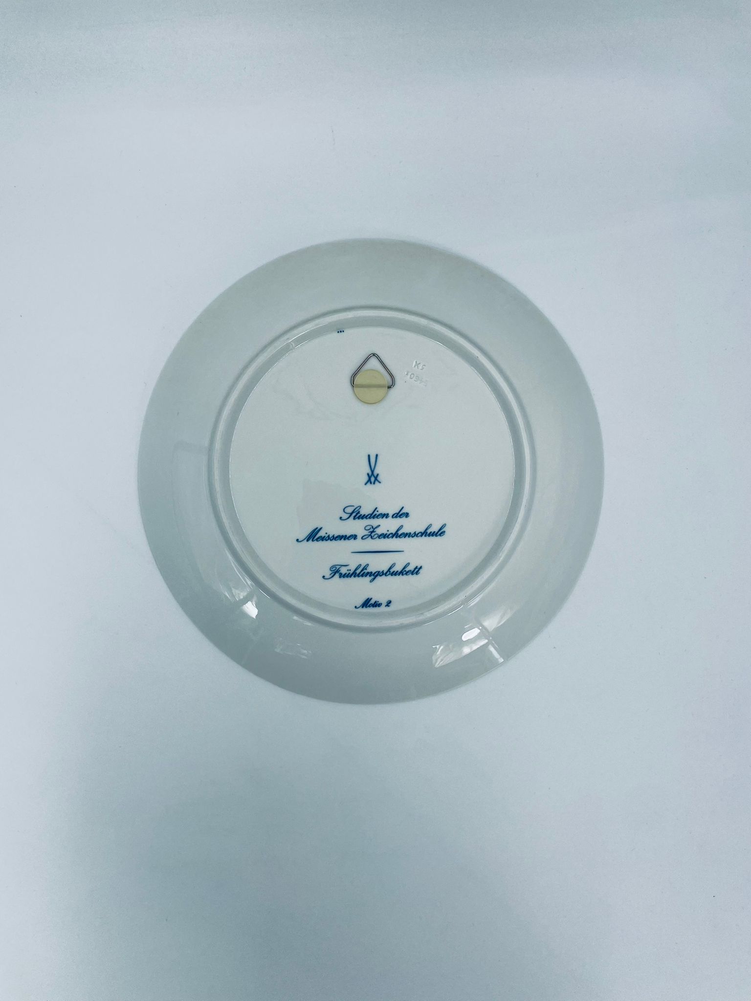 Talerz dekoracyjny ścienny wytwórni Meissen, wykonany z najwyższej jakości porcelany w kolorze ecru. Motywem na talerzu jest niebieski bukiet wiosennych kwiatów.