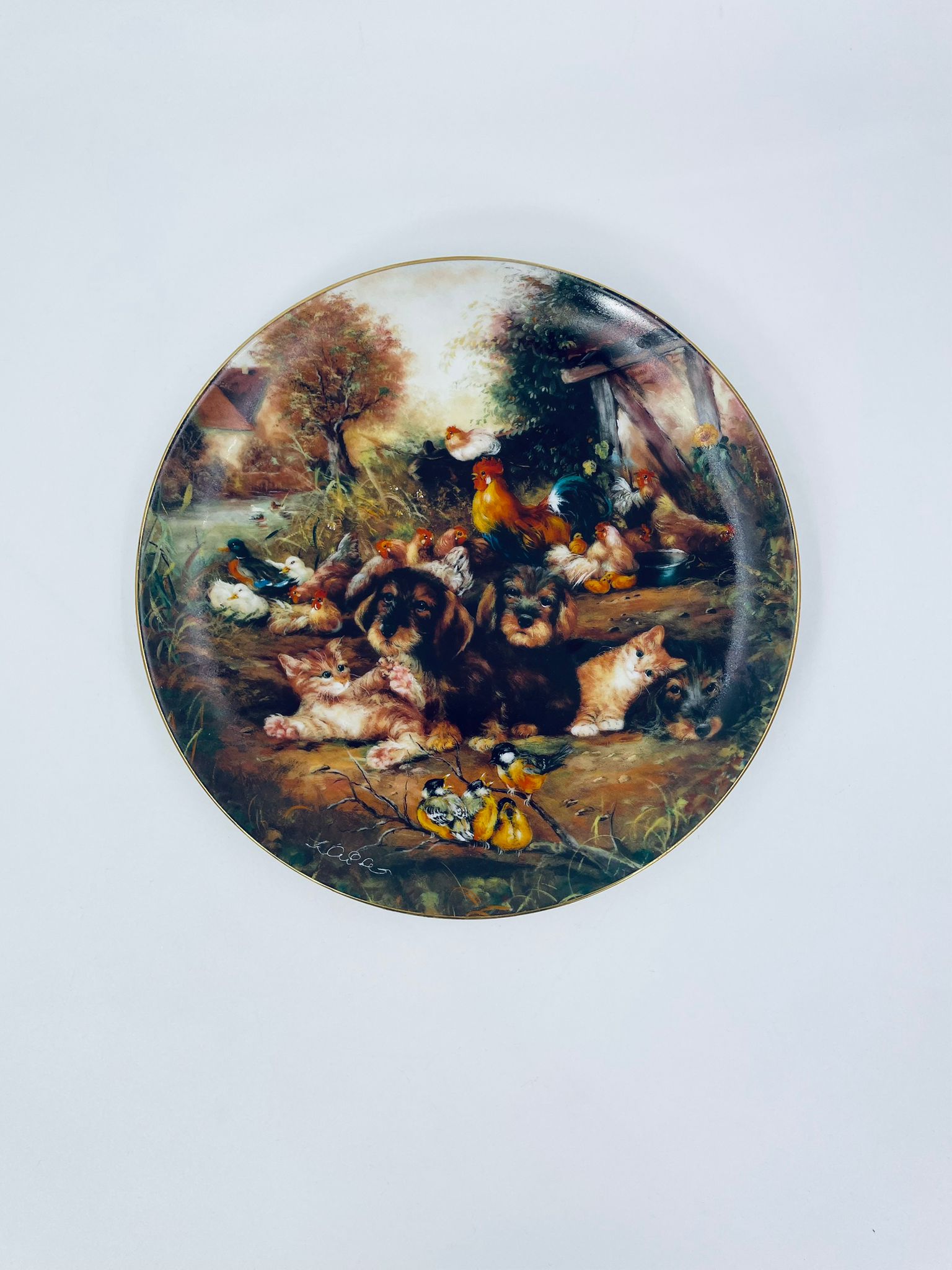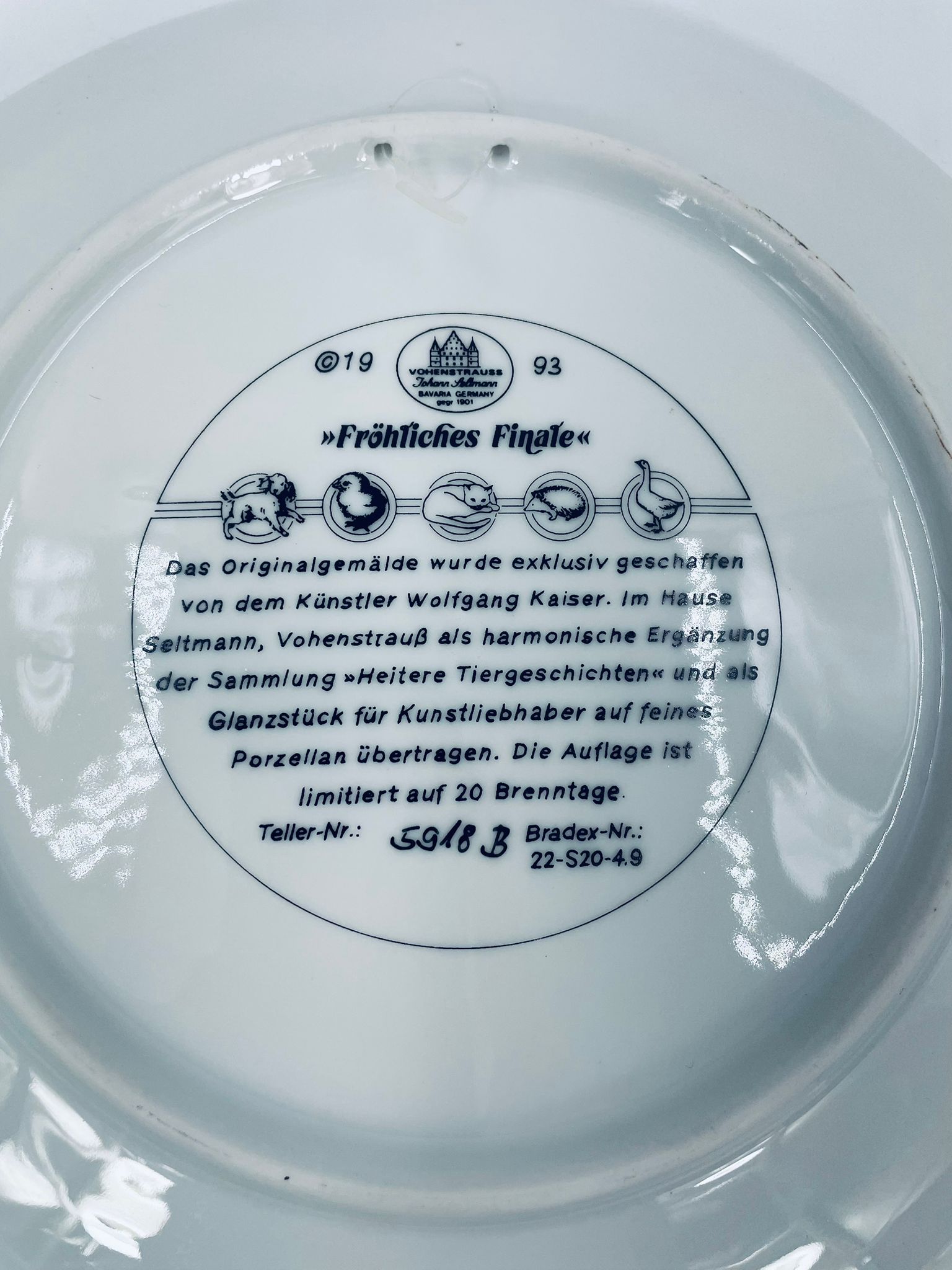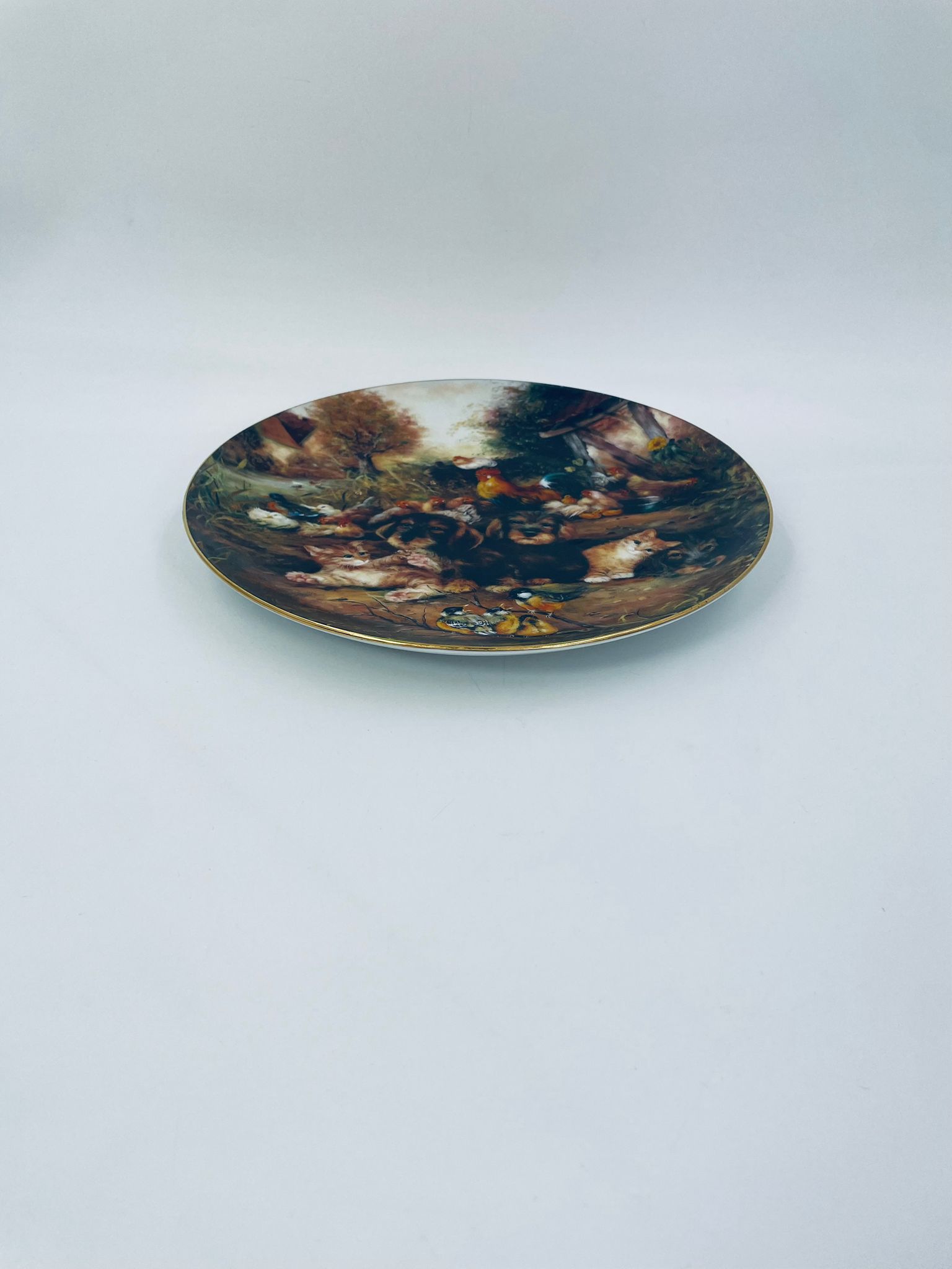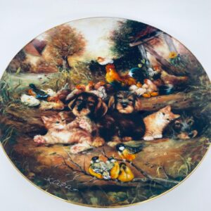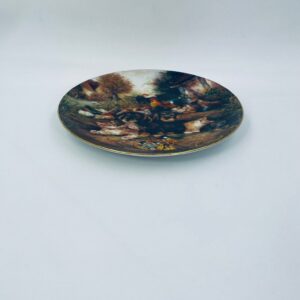 Talerz dekoracyjny wytwórni Vohenstrauss Johann Seltmann „Frohliches Finale”, wykonany z wysokiej jakości porcelany. Talerz ozdobiony, przedstawiający scenę wiejska ze zwierzątkami, wykończony złoceniem na rancie.