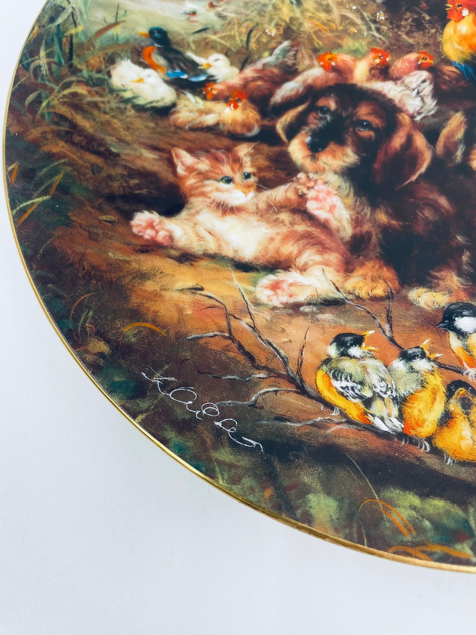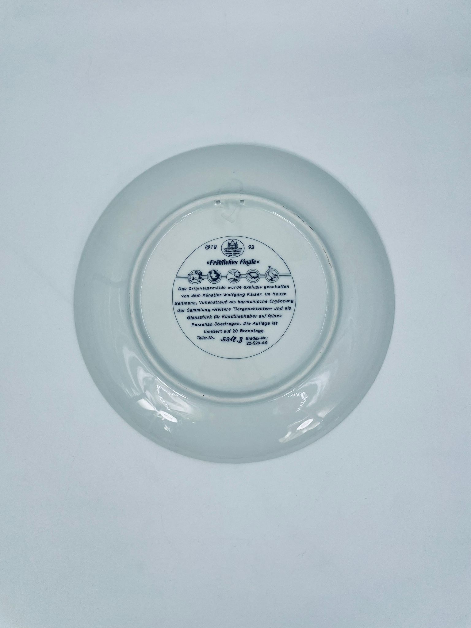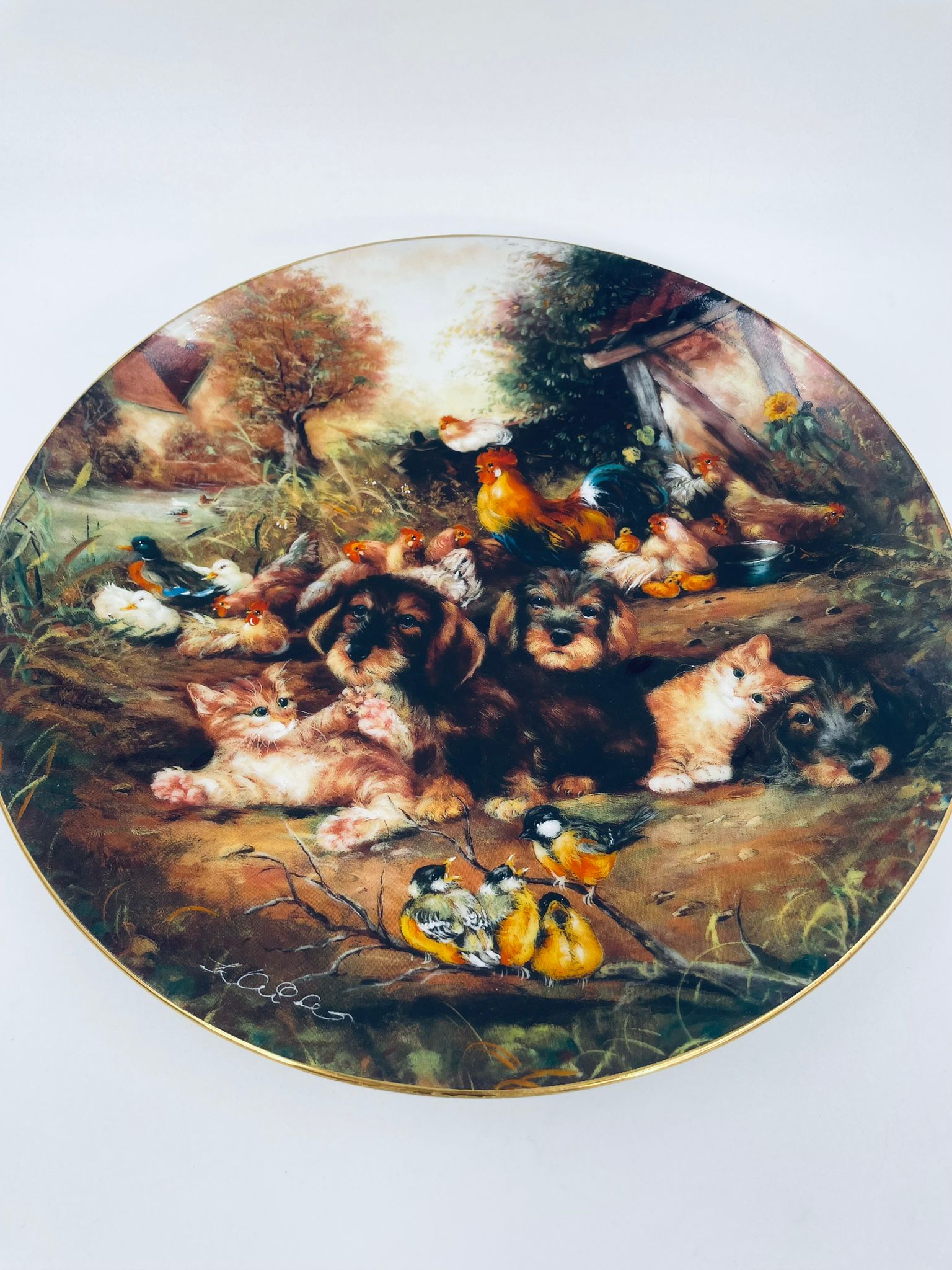 Talerz dekoracyjny wytwórni Vohenstrauss Johann Seltmann „Frohliches Finale”, wykonany z wysokiej jakości porcelany. Talerz ozdobiony, przedstawiający scenę wiejska ze zwierzątkami, wykończony złoceniem na rancie.
