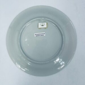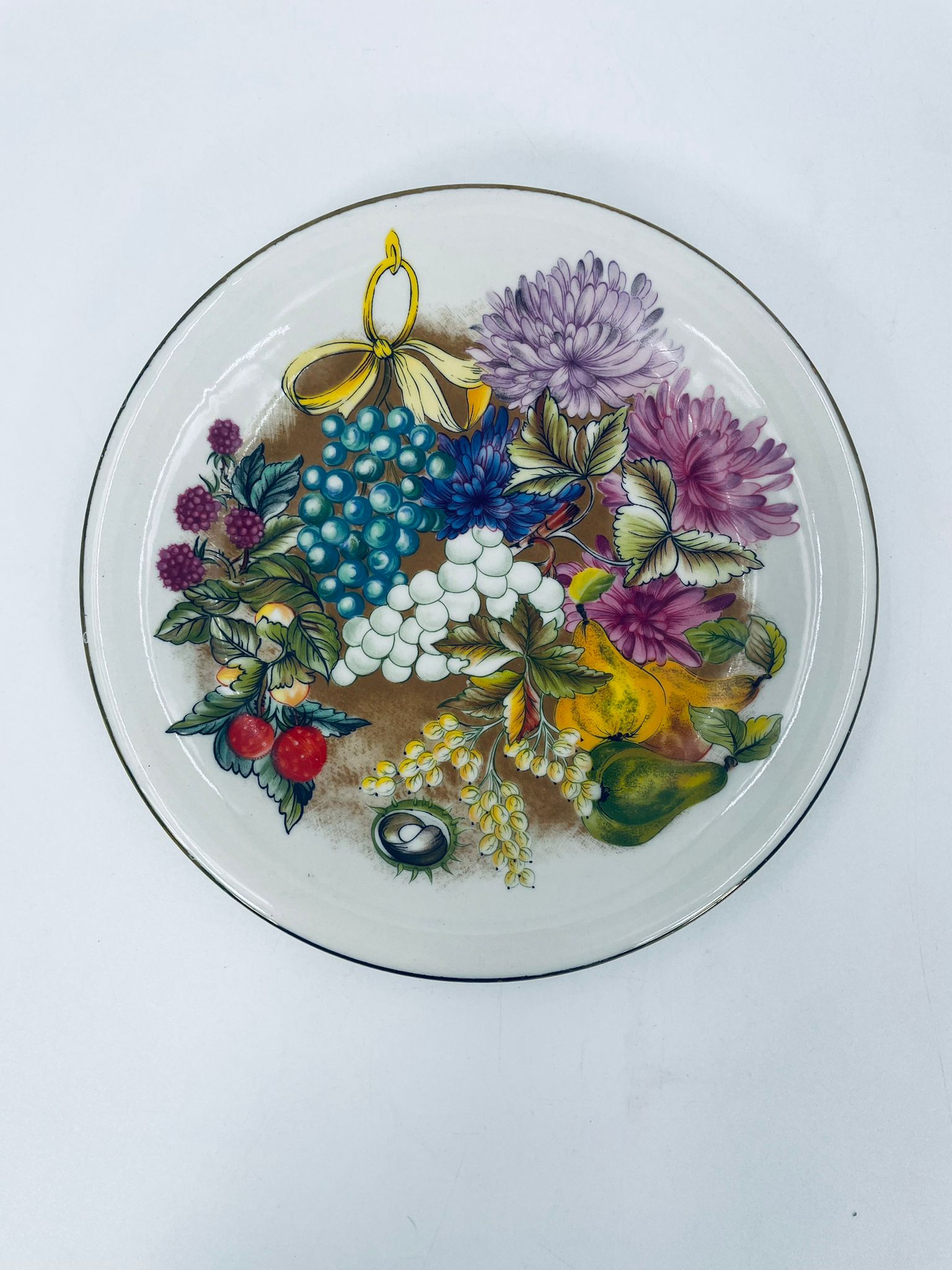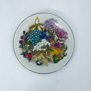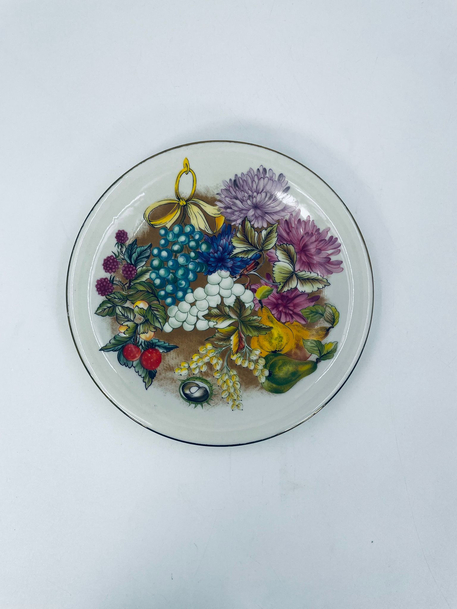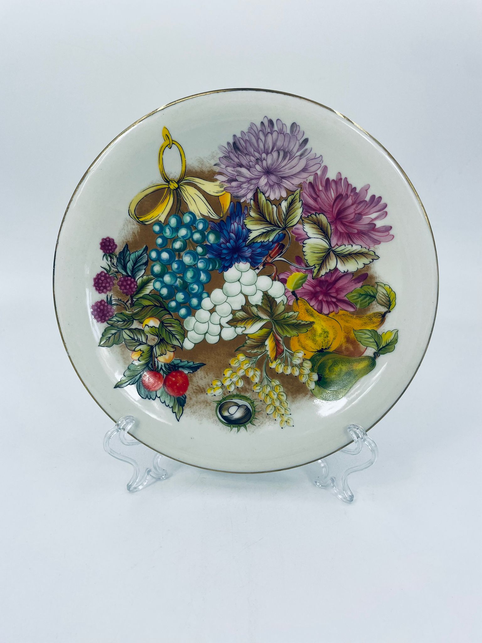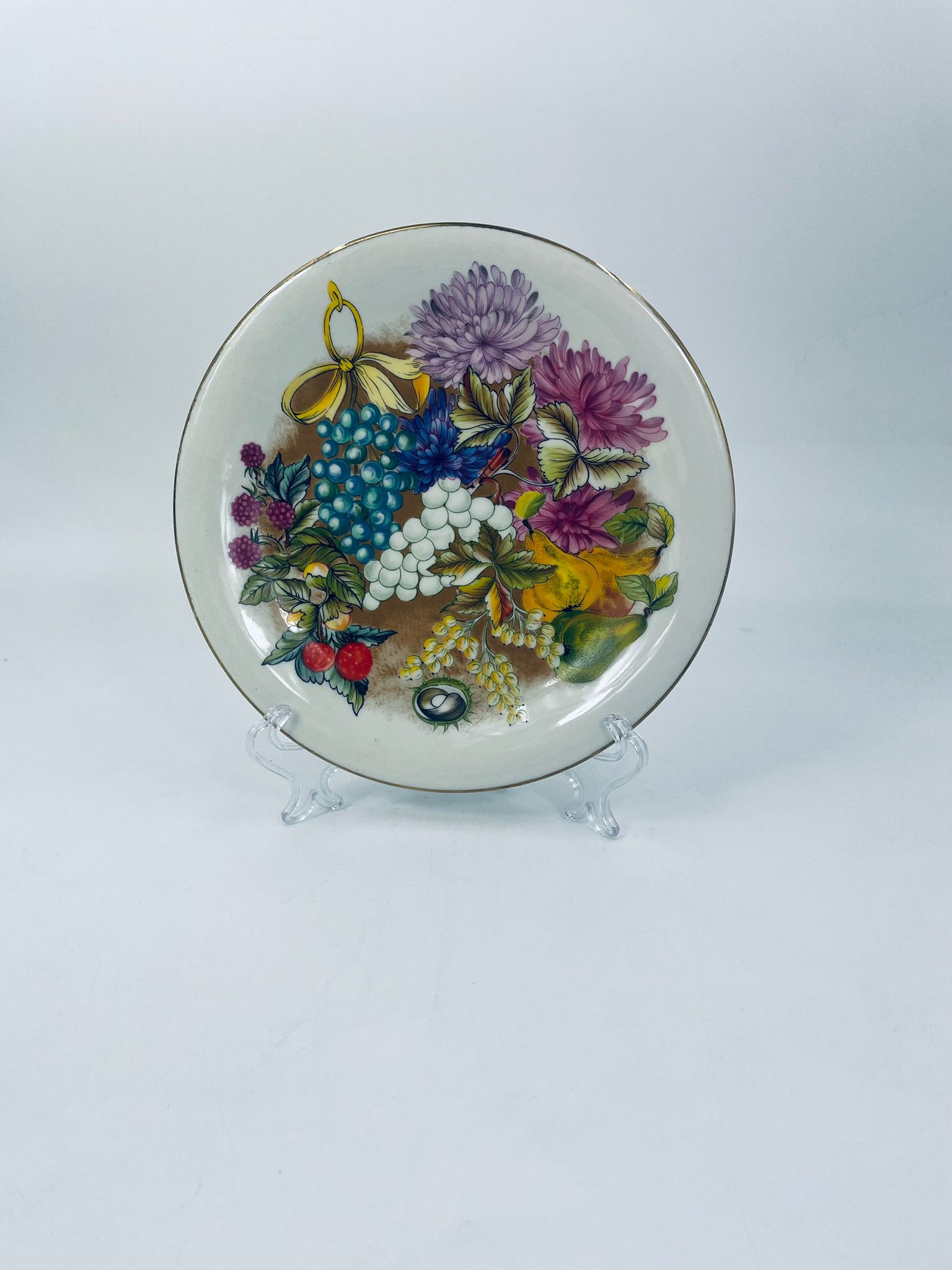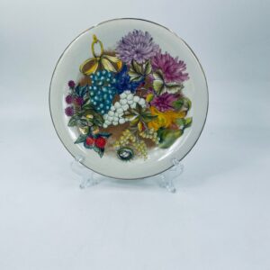 Przepiękny talerz został wykonany z wysokiej jakości białej porcelany. Na talerzu znajduje się motyw kolorowych kwiatów oraz różnych owoców. Wykończony jest złotą obramowka na rantach.