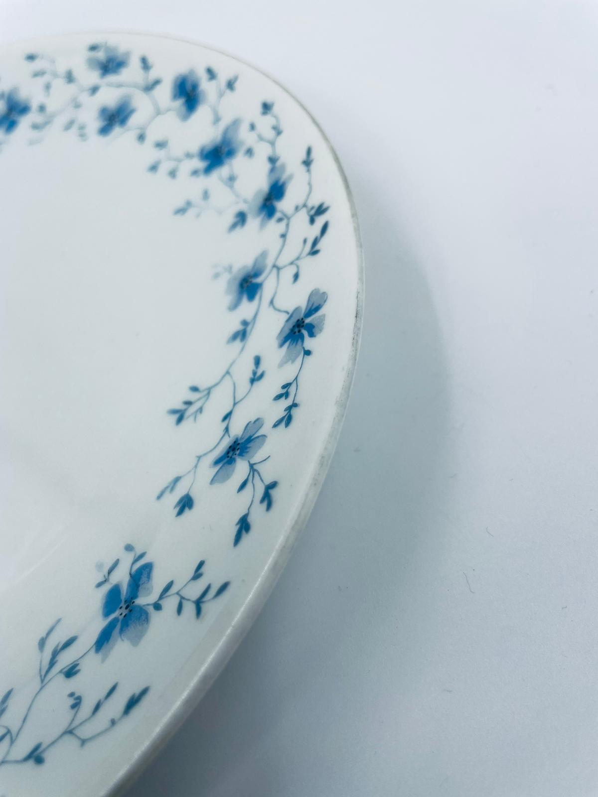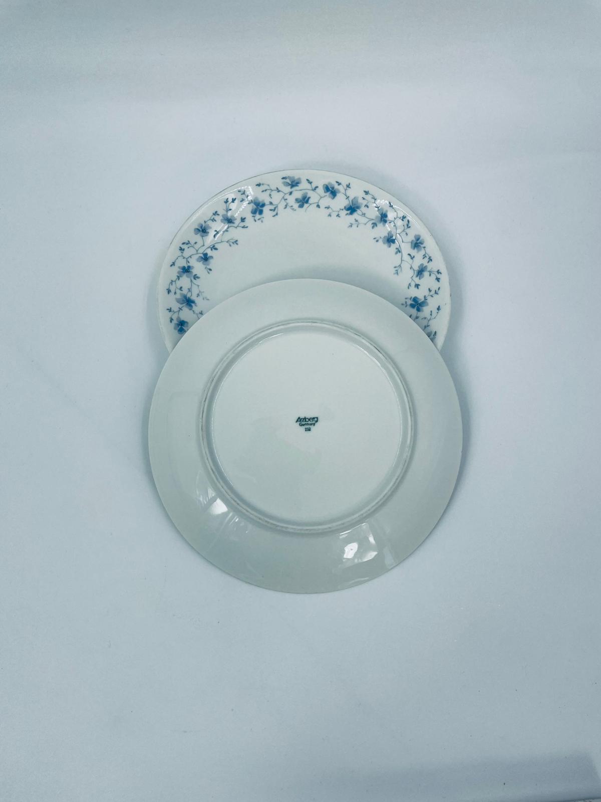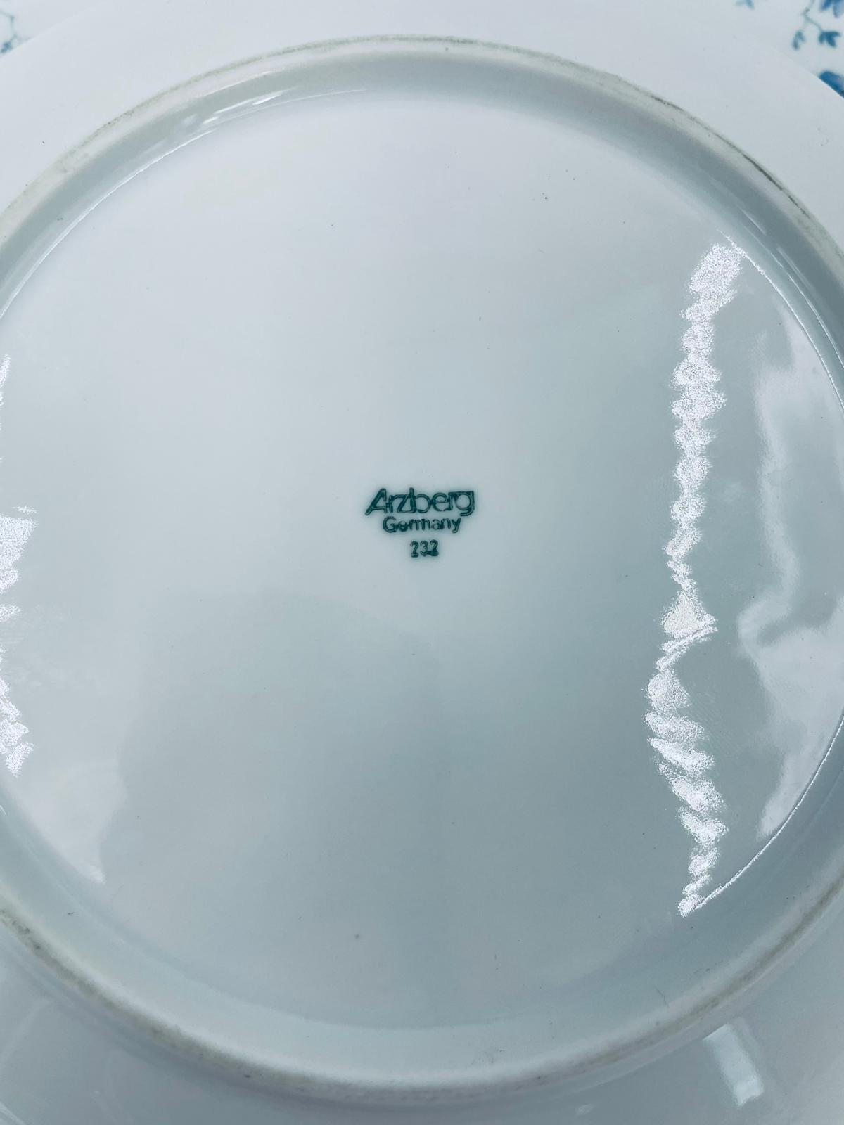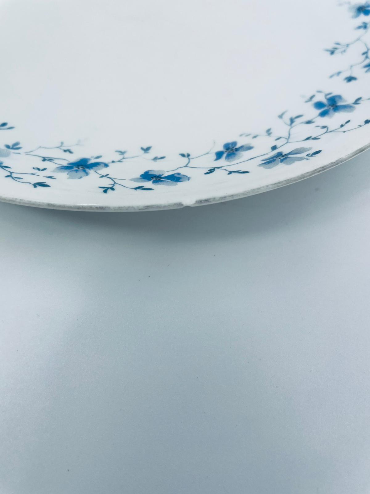 Talerz deserowy wytwórni Arzberg, wykonany z wysokiej jakości białej porcelany. Charakteryzuje się delikatnym wzorem niebieskich kwiatków. Posiada przetarcie na rancie oraz mały uszczerbek.