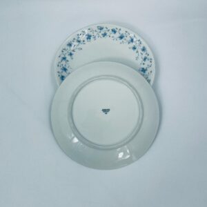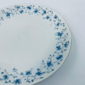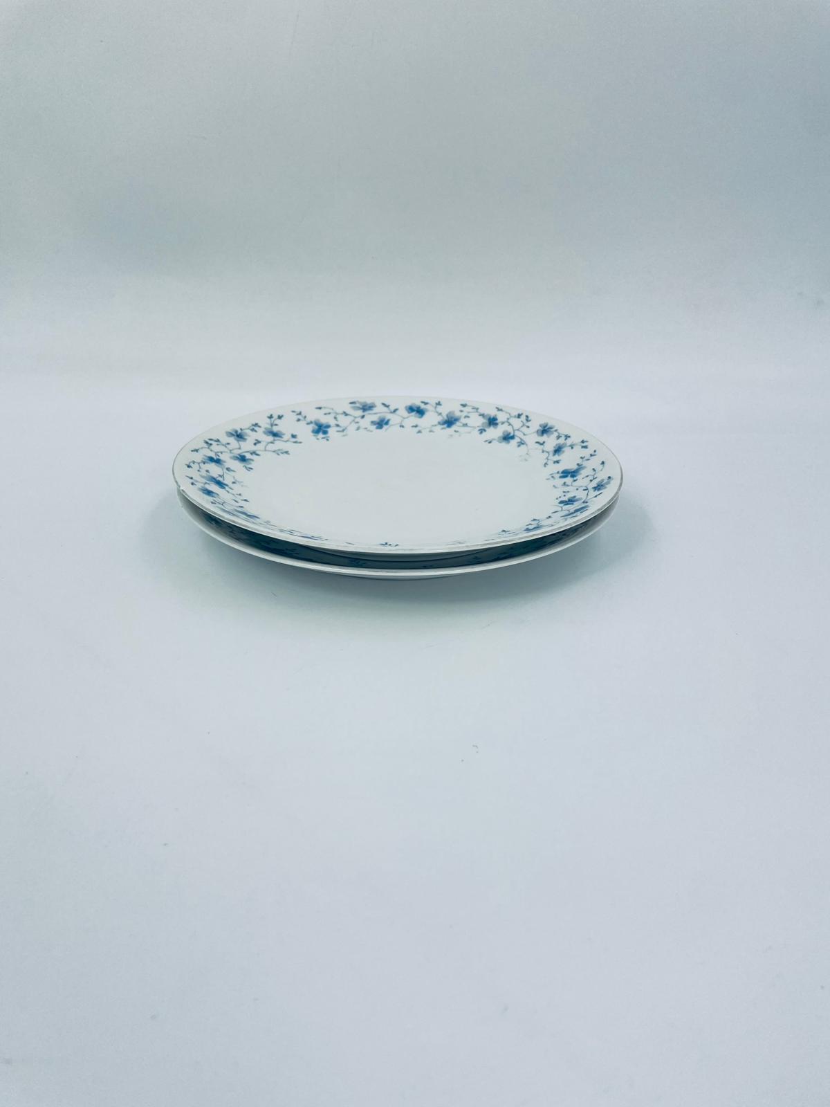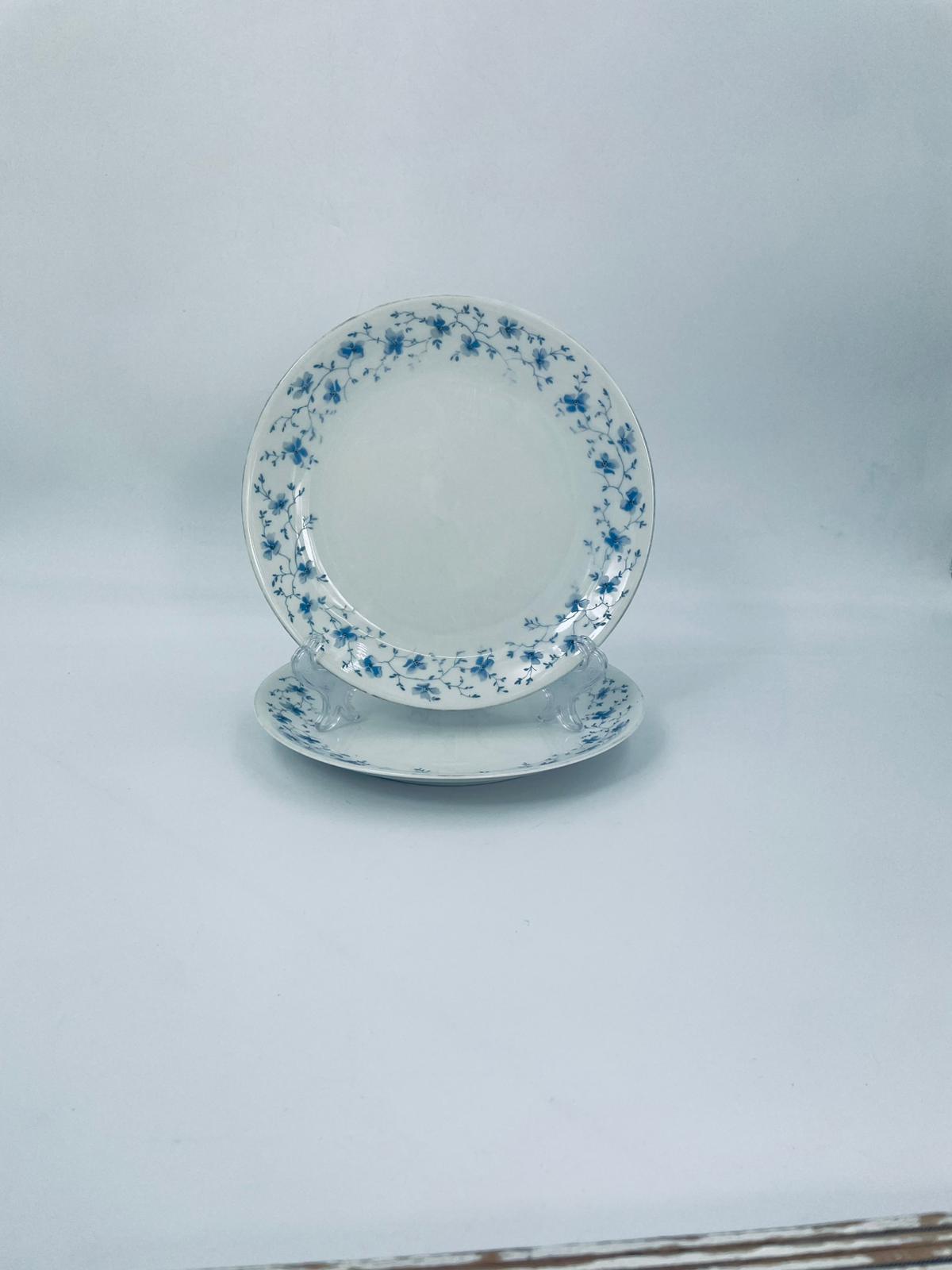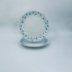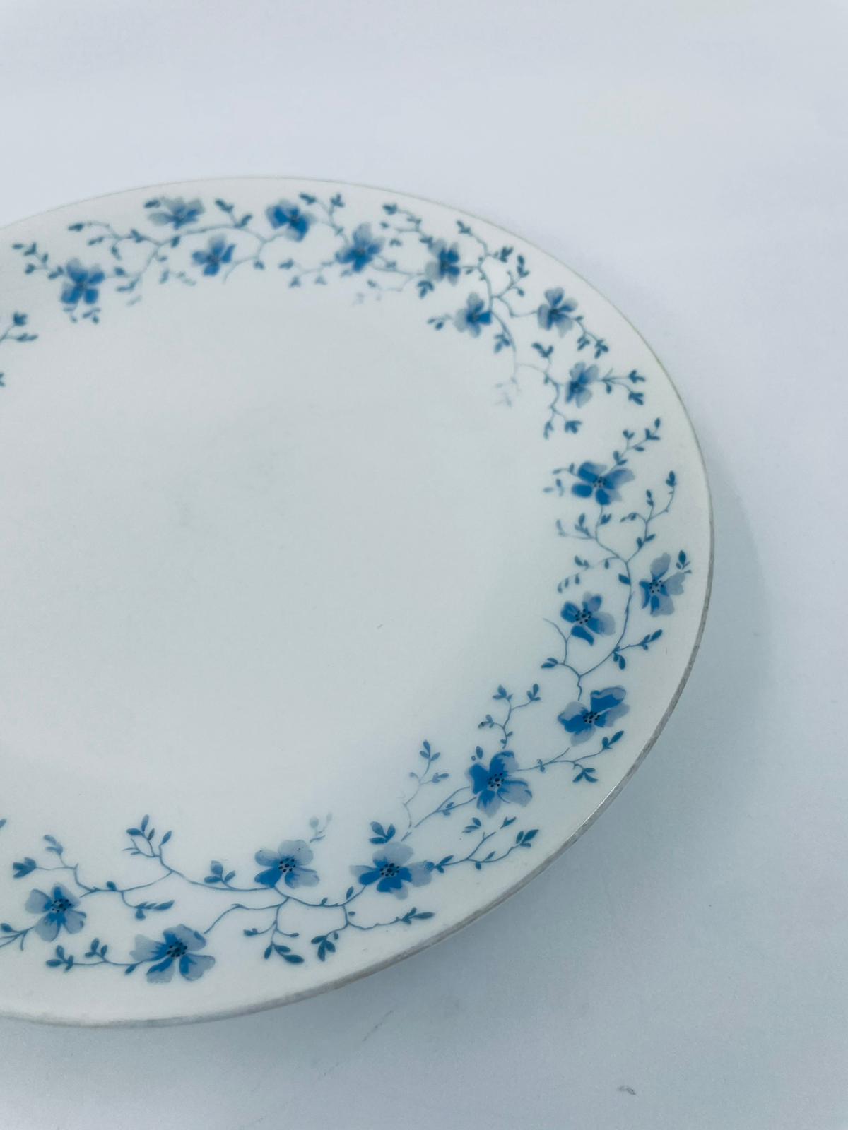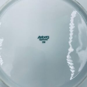 Talerz deserowy wytwórni Arzberg, wykonany z wysokiej jakości białej porcelany. Charakteryzuje się delikatnym wzorem niebieskich kwiatków. Posiada przetarcie na rancie oraz mały uszczerbek.