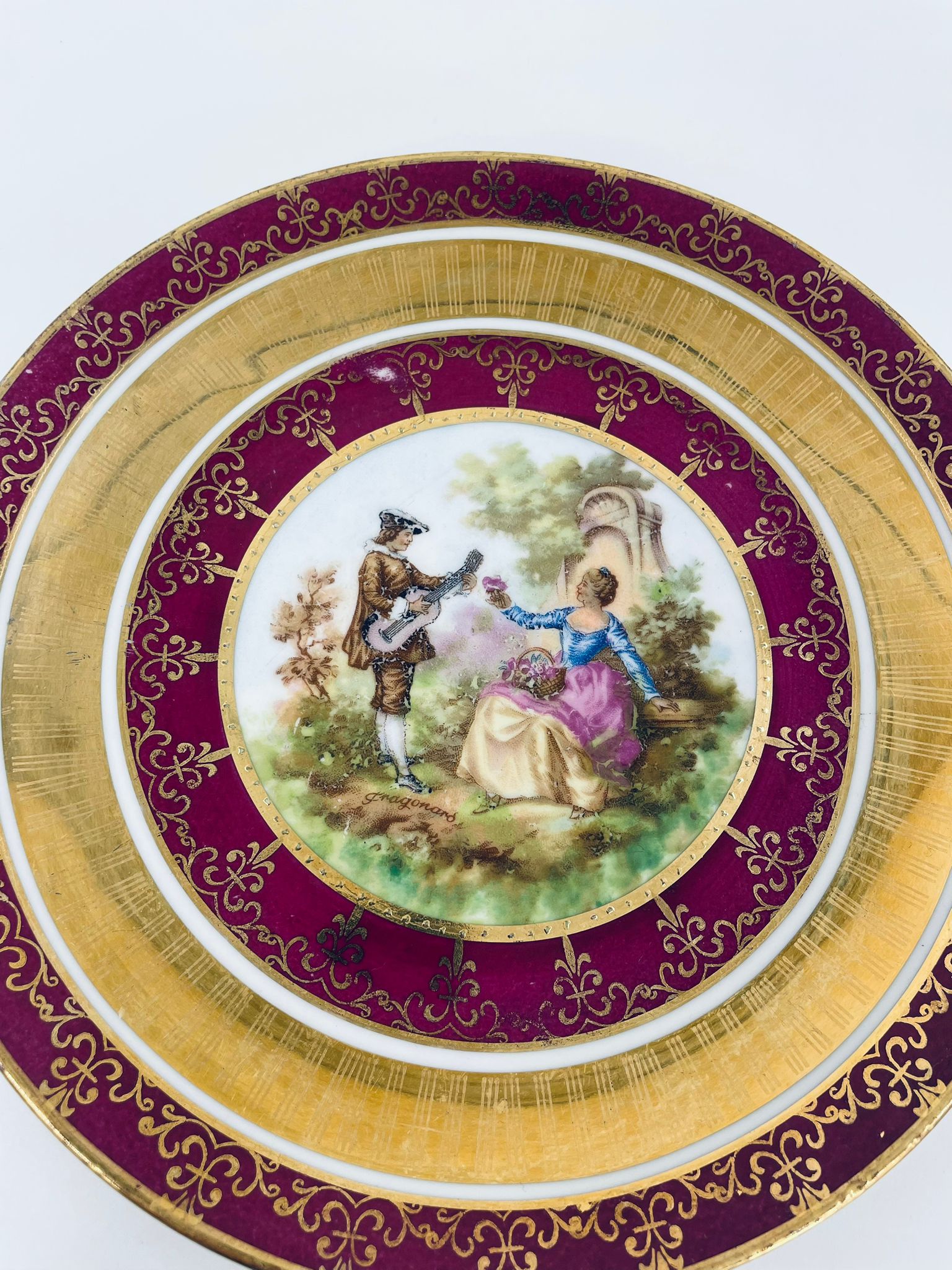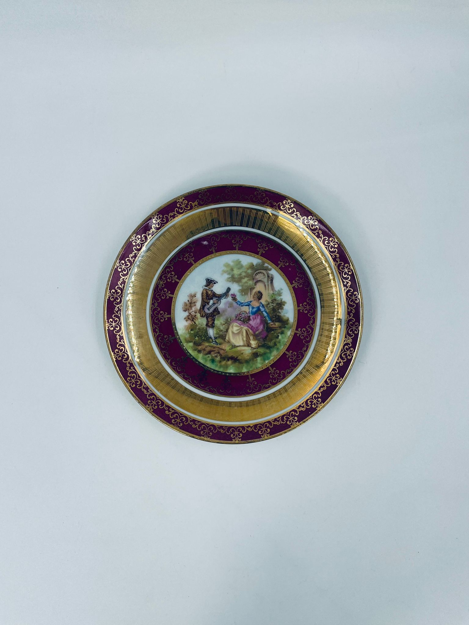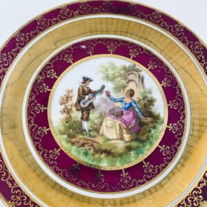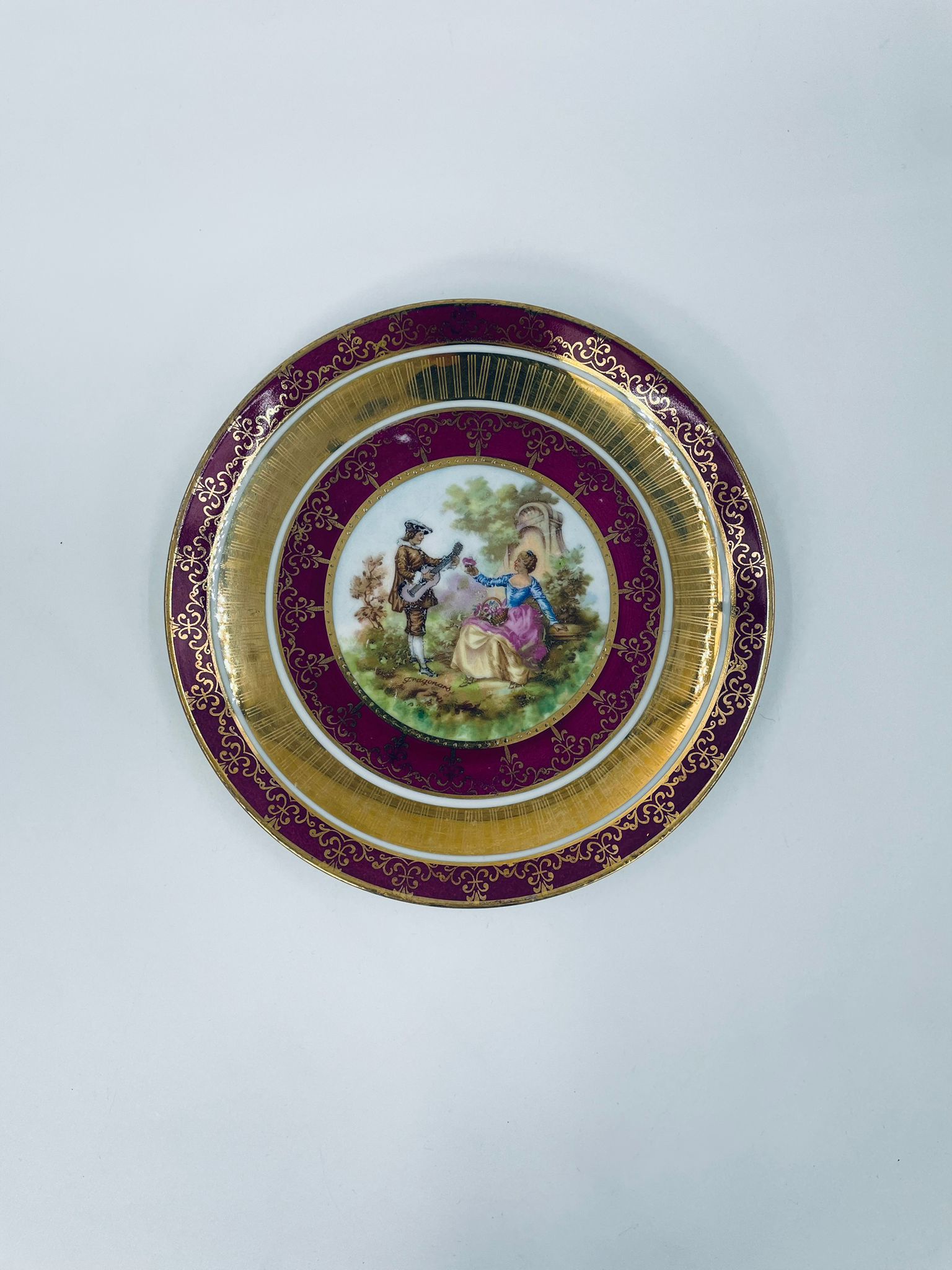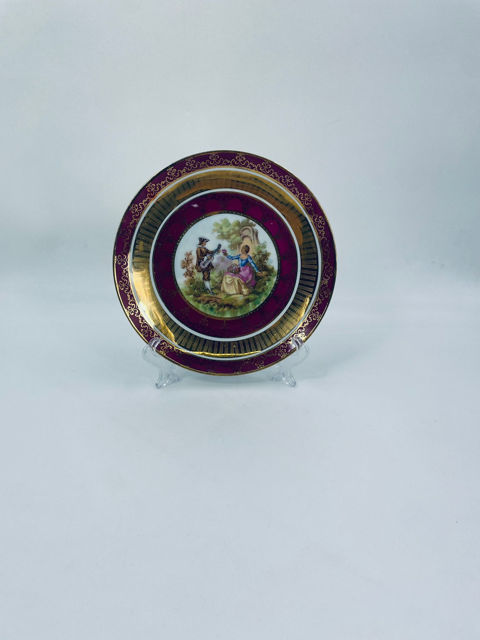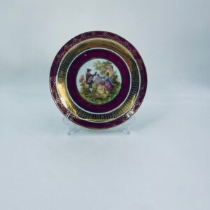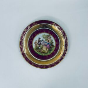 Antyczny talerzyk dekoracyjny, deserowy wytwórni Bareuther Waldsassen, wykonany z wysokiej jakości porcelany, ręcznie pozłacany. Talerzyk charakteryzuje się burgundowym kolorem z bogatymi zdobieniami z 22 karatowym złotem oraz romantyczną sceną przedstawiającą mężczyznę grającego na instrumencie i siedzącą kobietę. Posiada przetarcia na złoceniu.