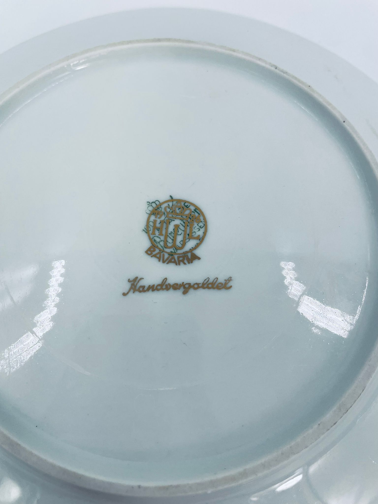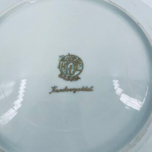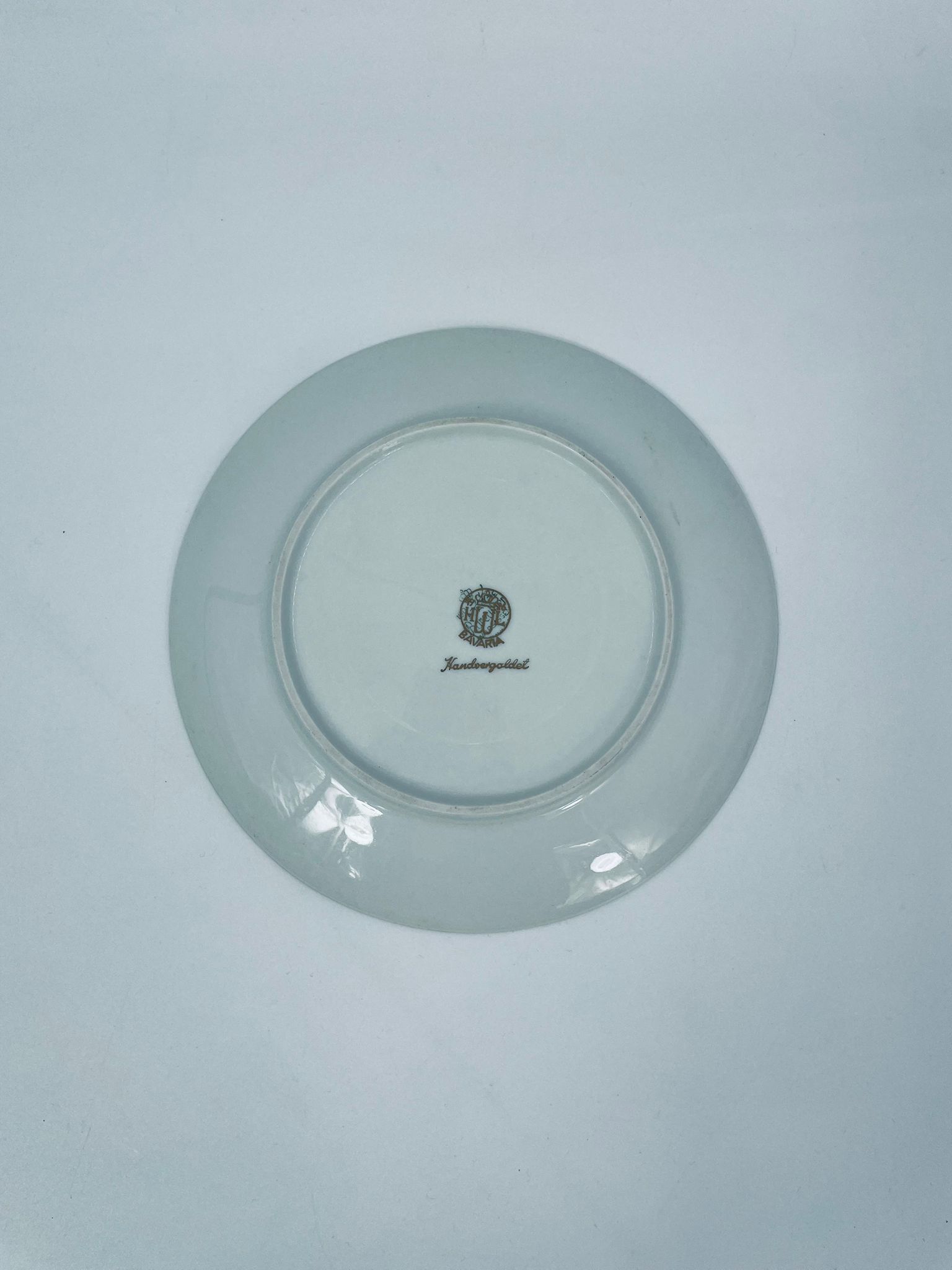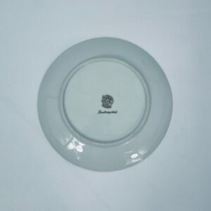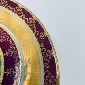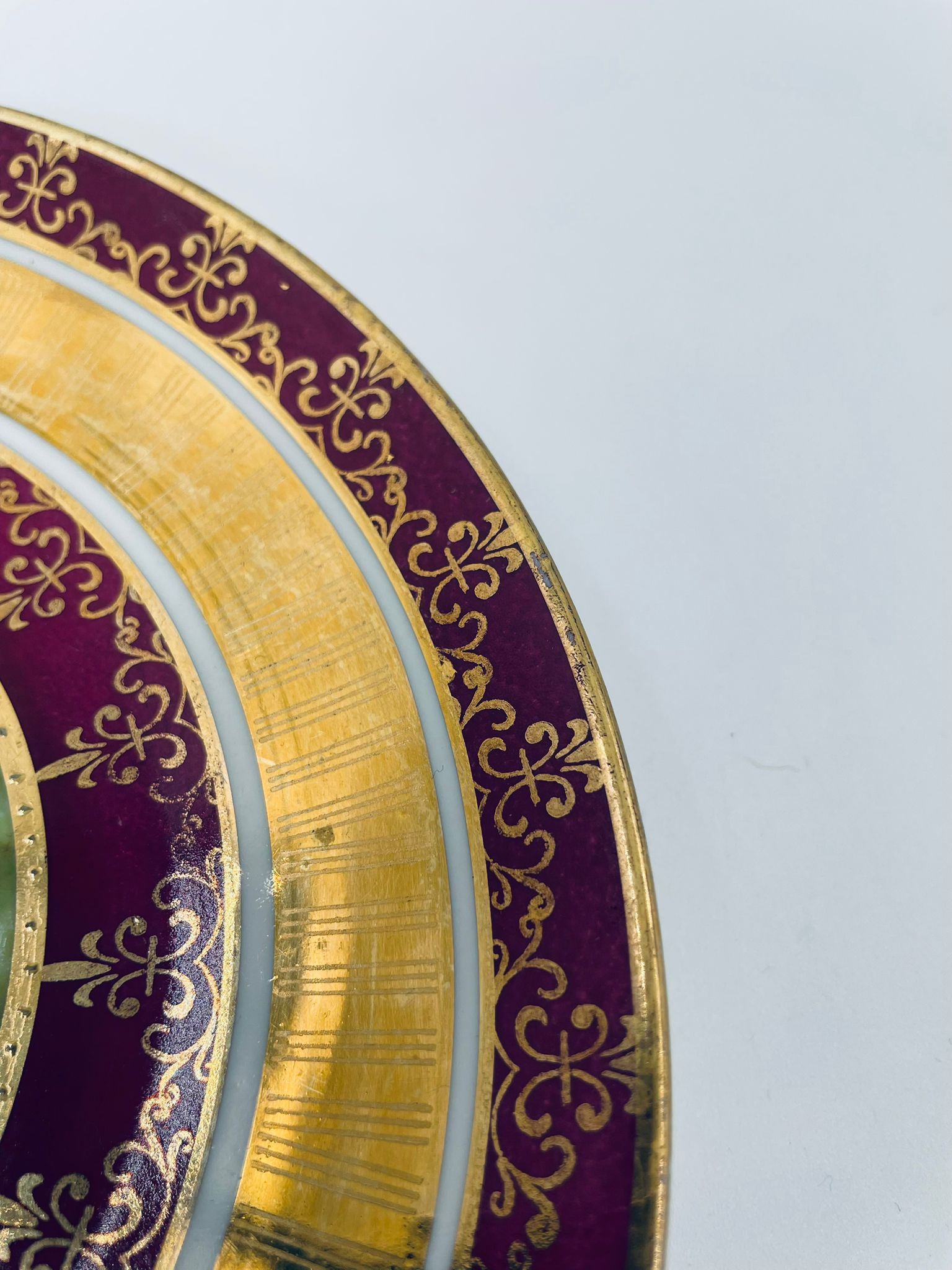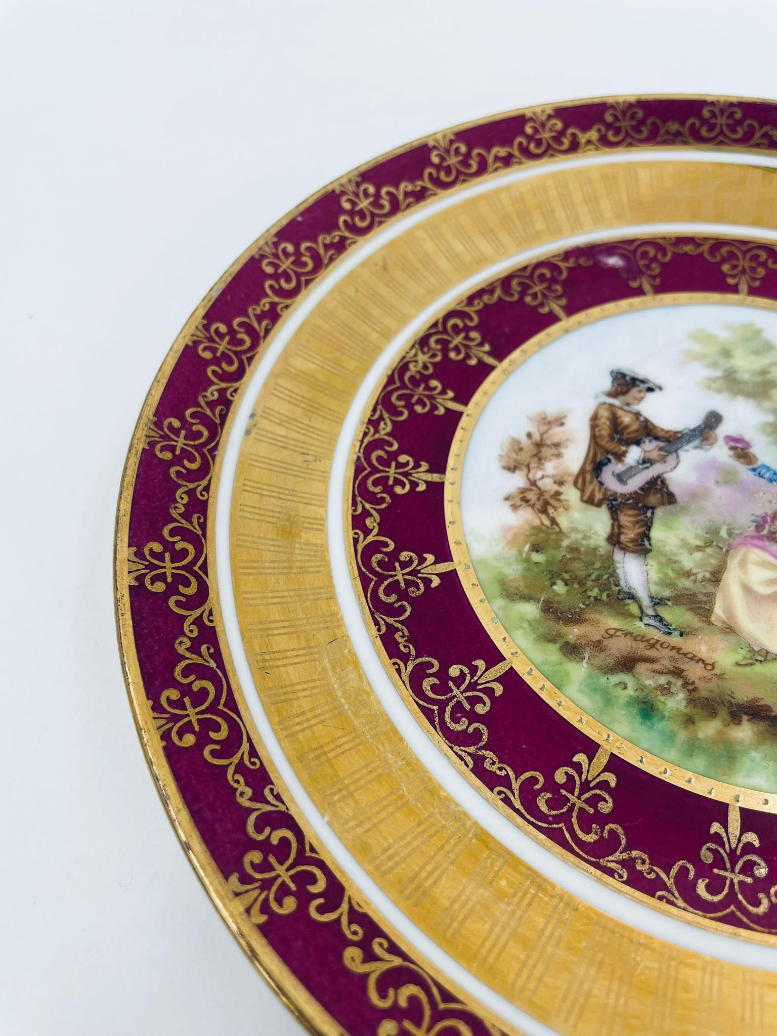 Antyczny talerzyk dekoracyjny, deserowy wytwórni Bareuther Waldsassen, wykonany z wysokiej jakości porcelany, ręcznie pozłacany. Talerzyk charakteryzuje się burgundowym kolorem z bogatymi zdobieniami z 22 karatowym złotem oraz romantyczną sceną przedstawiającą mężczyznę grającego na instrumencie i siedzącą kobietę. Posiada przetarcia na złoceniu.